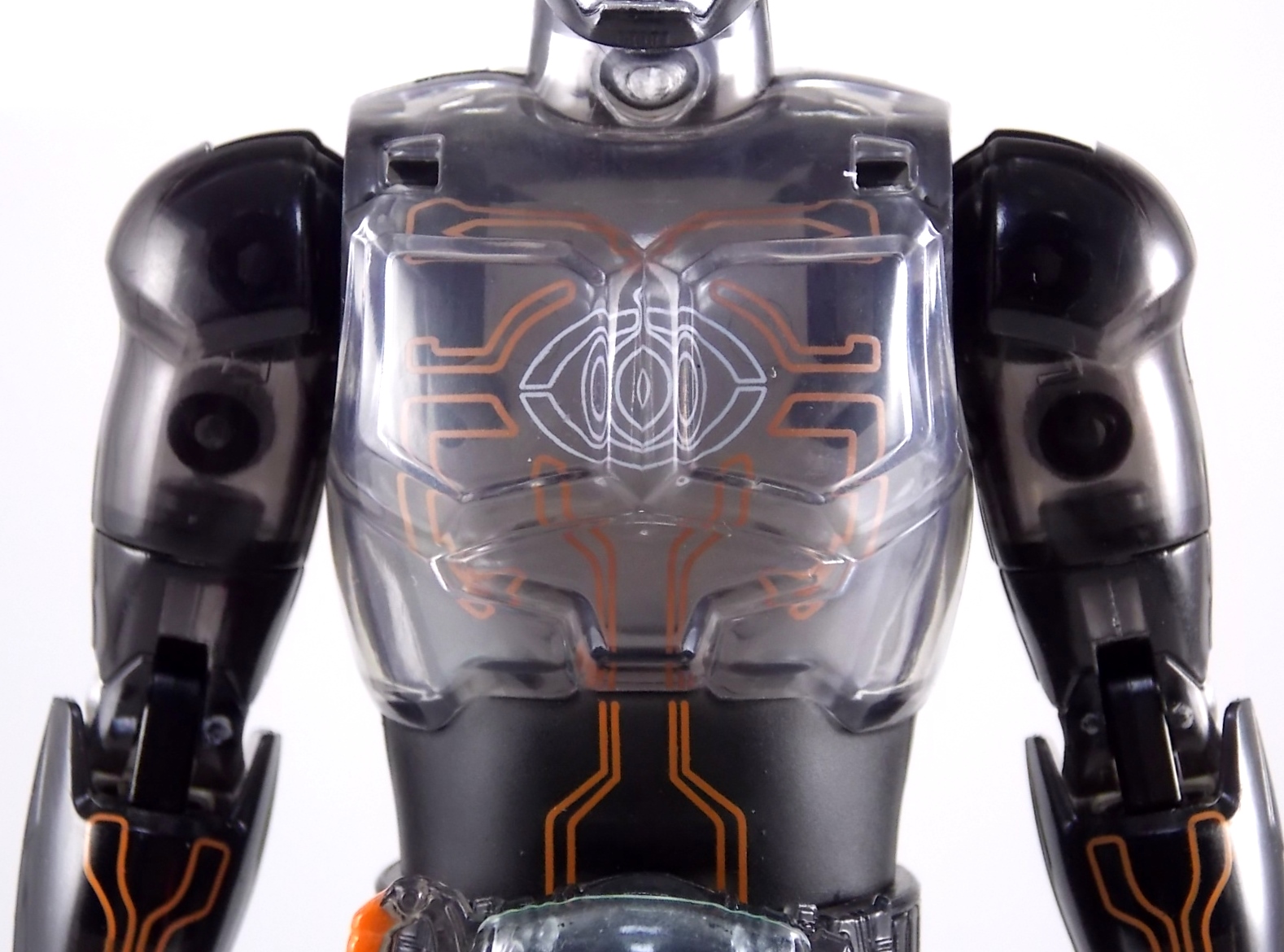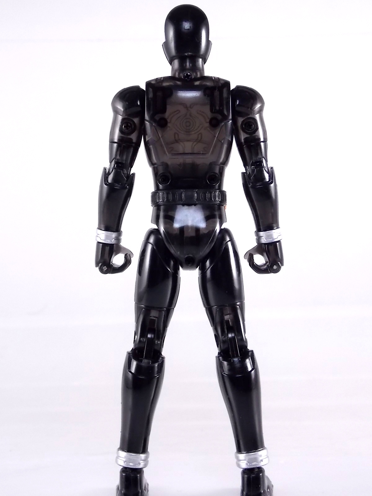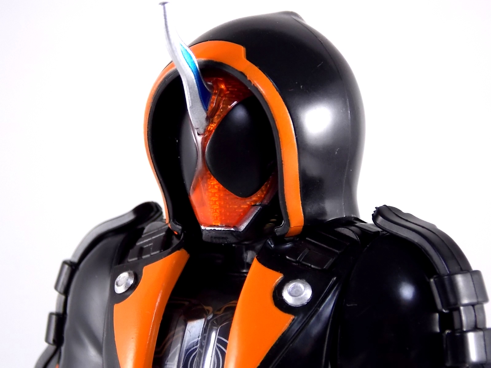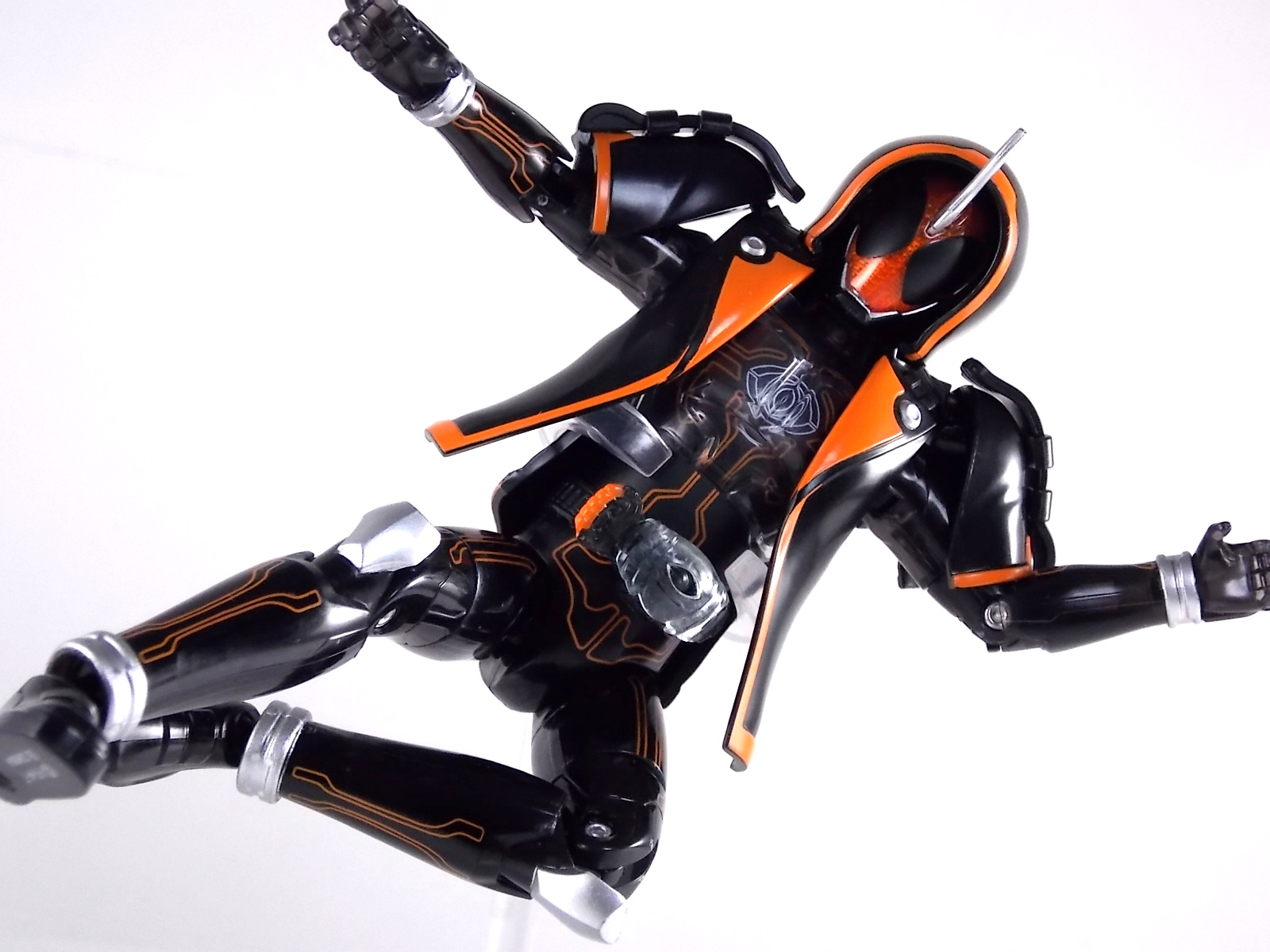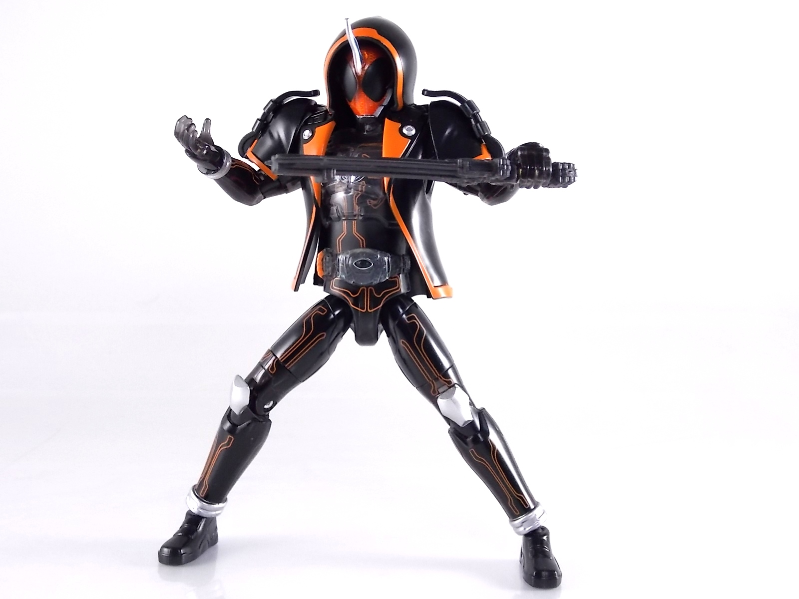The spooktacular new rider, Kamen Rider Ghost arrives with the first of many gimmick line figures! Today we take a look at that initial release with Ghost Change GC-01 Kamen Rider Ghost Ore Damashii! ** This gallery was made possible thanks to the generosity of my good friend Baltmatrix, who let me borrow his Ghost so I didn't have to purchase one myself. Thanks Matt! Packaging As we've seen over the years the packaging for the mass retail rider gimmick lines is actually pretty nice, though for consistencies sake they usually share the same basic packaging type. Which is a smart move for a series that's on annually. Similar packaging for figures like this through out the years has got to make it easier on Japanese retailers. In any case Kamen Rider Ghost's packing deviates a bit with the two halves of his plastic inner shell forming over the figure like normal, but the box itself doesn't have a plastic window. My guess would be cost cutting as it is really unnecessary since the plastic shell fully encapsulates the toy anyway. There are good shots of the Ghost suit on the package and call outs to other merch as well as a large Ghost symbol printed on card back in the box. All in all pretty nice. Main Figure Ghost Change Kamen Rider Ghost is a rather bland figure on it's own. In his basic form with no Damashii's attached he's known as Kamen Rider Ghost Transient. This very basic form is akin to past years' pre-forms like Kuuga Growing or Den-O Plat Form. While basic it does look rather interesting. An all black suit, the majority of the figure is cast in a translucent gray/green plastic to give it a ghostly ethereal feel. The body lines are painted in a nice bright orange to contrast this and the chest detail in particular is very nice. The Ghost Driver is a little plain but that's to be expected on a gimmick style toy like this. Though as many fans have pointed out in the show, the Ghost Driver sticks rather far out off of Ghosts' waist. Here it's the same. It's non-functioning but it gets the job done well enough. The helmet details in this form actually deviate a bit from the show. The silver face plate is sort of studded with bumps to replicate the features of traditional Kamen Rider Compound Eyes. This is to help the figure pull the look of each different Damashii off, without having to tool that detail into each Damashii. So while it's a bit off from the smooth show face plate, it's smart. The figure has a fairly basic range of movement with swivel/ball jointed feet. Swivels thighs, knee bends, rotating hips, a partially rotating waist, poseable fingers, elbows, rotating shoulders, and a neck that can swivel side to side and back. It's capable of some fairly decent poses thanks to this, but as you'll see in images & read below, the Parka Ghosts/Damashiis greatly hinder this. Accessories Ghost Change Kamen Rider Ghost is pretty standard as far as retail figures of this nature are concerned. He comes with only the essential accessories: 1 - Gan Gun Saber. A totally unpainted scaled down version of his signature weapon. It's a nicely scaled weapon that indeed is sculpted faithfully to the real thing. But is totally unpainted. And cast in the same kind of translucent gray plastic as Ghost himself. Again this is probably a cost cutting measure. Like the body parts cast in this color and this weapon are probably on the same parts runner at the factory. But gimmick accessories like this rarely have many paint apps as is. 1 - Ore Damashii Parka Ghost/jacket. The series and toylines' signature gimmick. Ore Damashii is the personification of Takeru/Ghosts own soul or damashii. An interesting accessory, this gimmick very clearly appears like a spiritual (forgive the pun) successor to Arms Change. However don't be fooled. It's far sub-standard to that gimmick. While as a floating Parka Ghost on it's own this piece is fun. It's combination with the Ghost figure pretty much kills anything you could have done with the figure. Rotate the face mask on the Parka Ghost up to reveal the Ghost Ore face plate, rotate the small strappy arms on the sleeves up over the shoulders. Then slide the the whole contraption over Ghost. There are slits in the jacket part to clear the shoulders. But getting the face plugged in is I've found frustratingly difficult. But once you do, you've basically killed all the neck articulation the figure has. You can just barely angle the head side to side by pulling down on the mask and locking it in, but it's minimal at best. But not in any meaningful way that I've found. And the jacket now limits the upper body and waist movement you had before. The shoulder pads are hinged to move somewhat with the arms but they only give you minimal outward movement before they impact the arms and kill that too. Frankly it's the most obtrusive gimmick Bandai could have come up with. Final Thoughts After several years of solid gimmick toy lines with Gaim & Drive I'm sad to report that Ghost Change is kind of a flop in my book. The basic Transient Ghost figure is very nicely detailed albeit a bit boring. But the Damashii gimmick itself is terribly intrusive to the figure, limiting almost all aspects of it. Even in static poses the way the jacket forces the figure into a more rigid stance makes it look lifeless. I'm sorry to say that GC-01 Ghost Change Kamen Rider Ghost Ore Damashii is not a great toy. Buy this one on the cheap, or better yet wait for the S.H. Figuart that's being fully revealed this weekend.