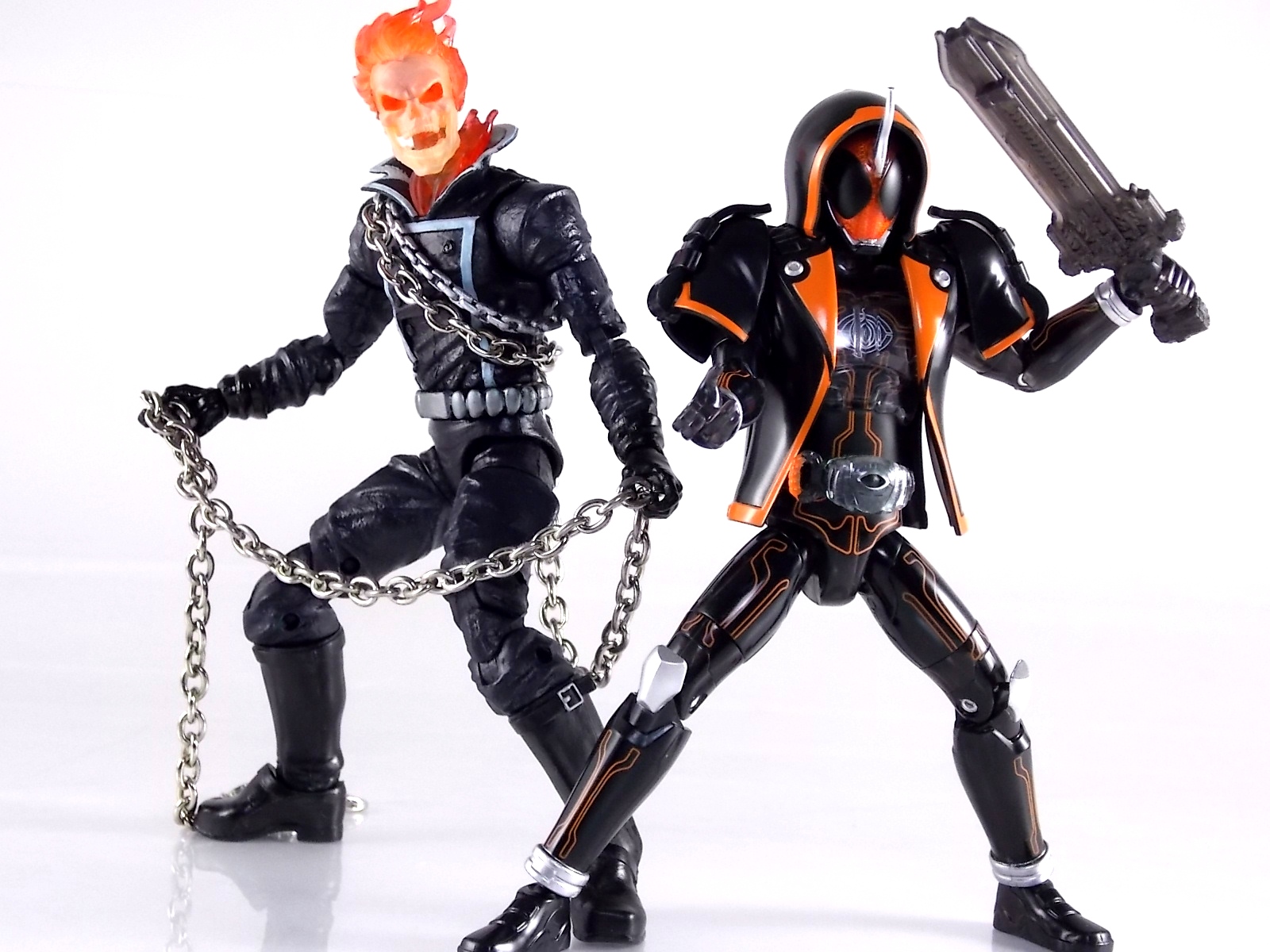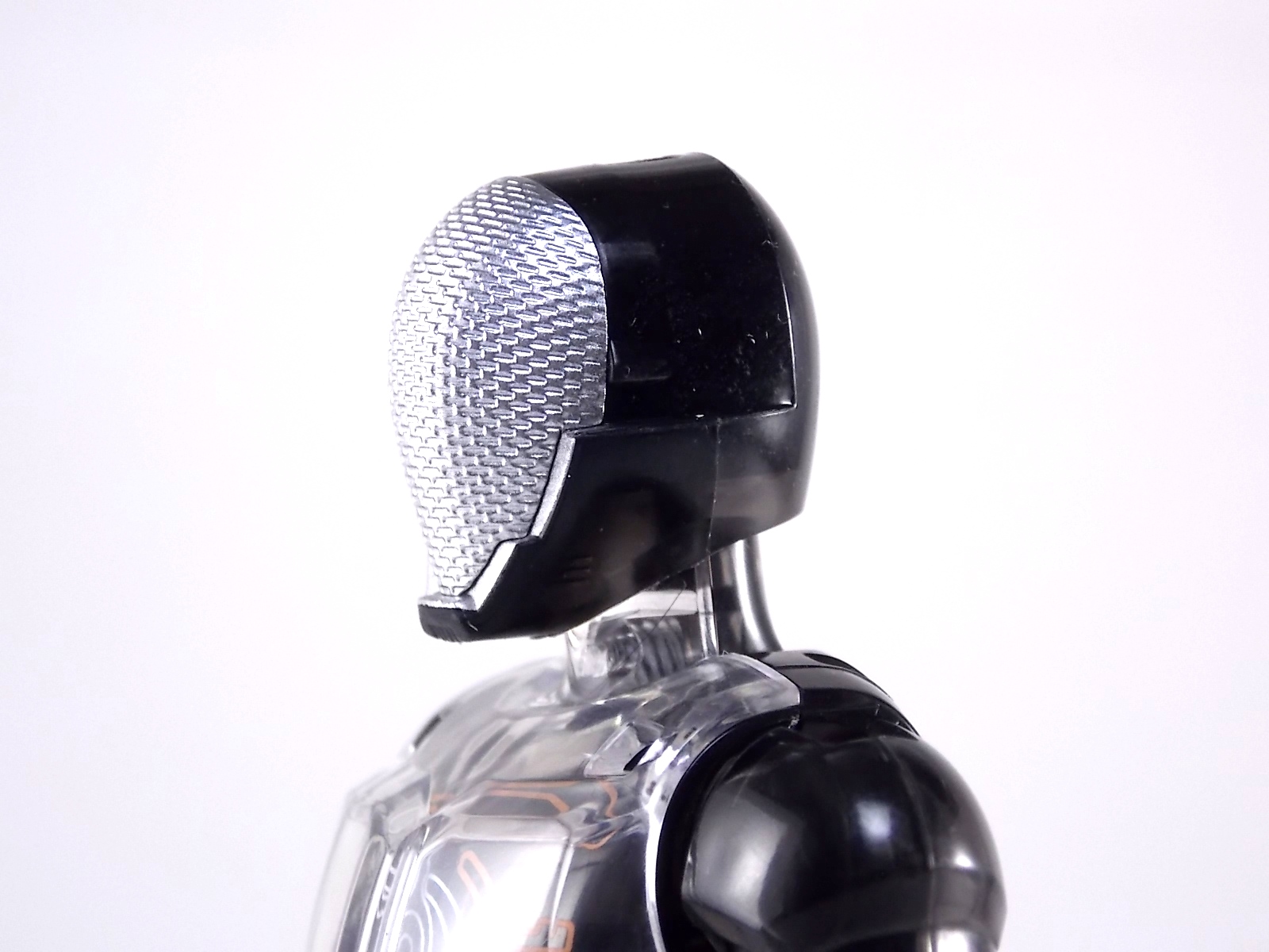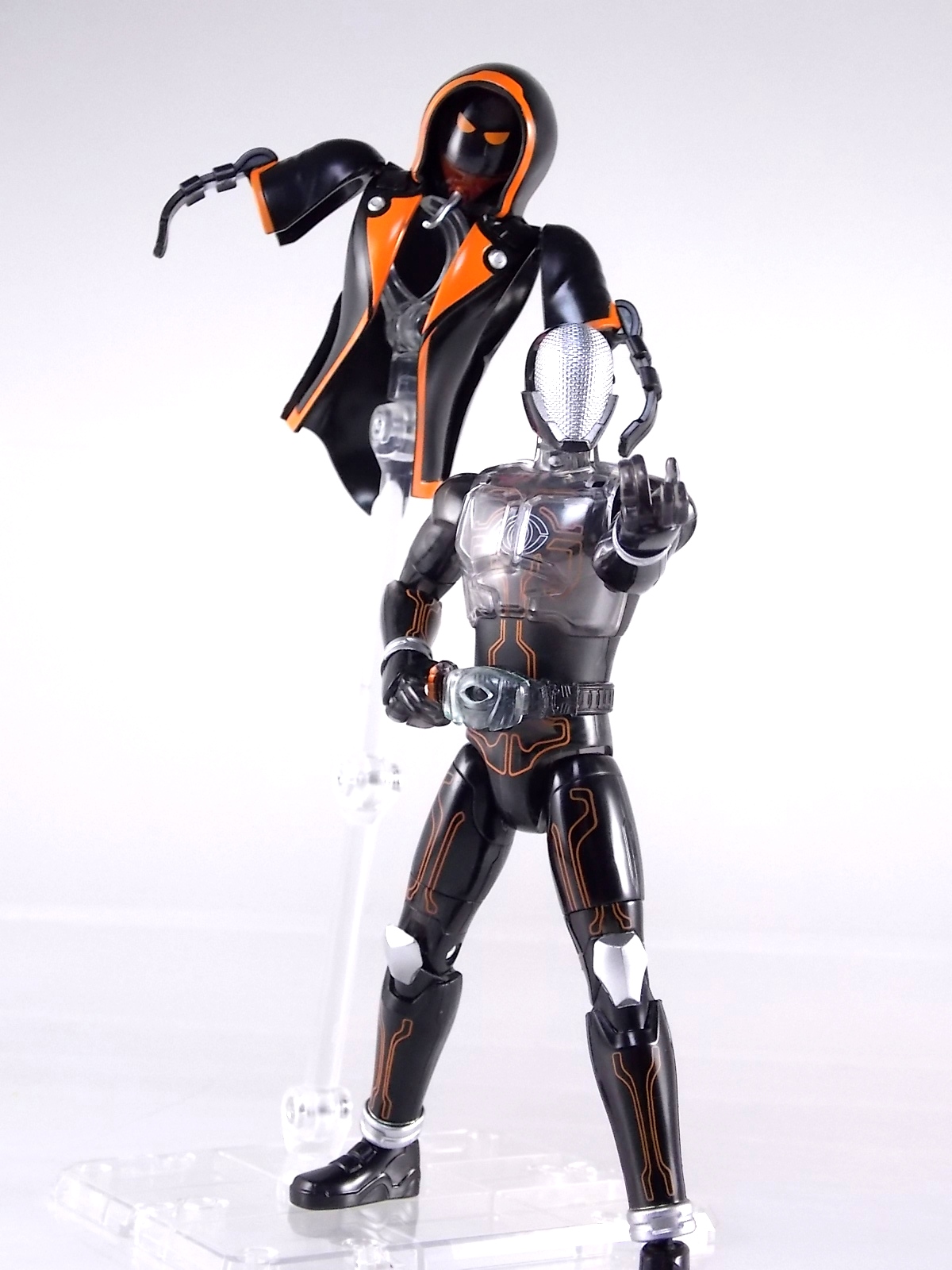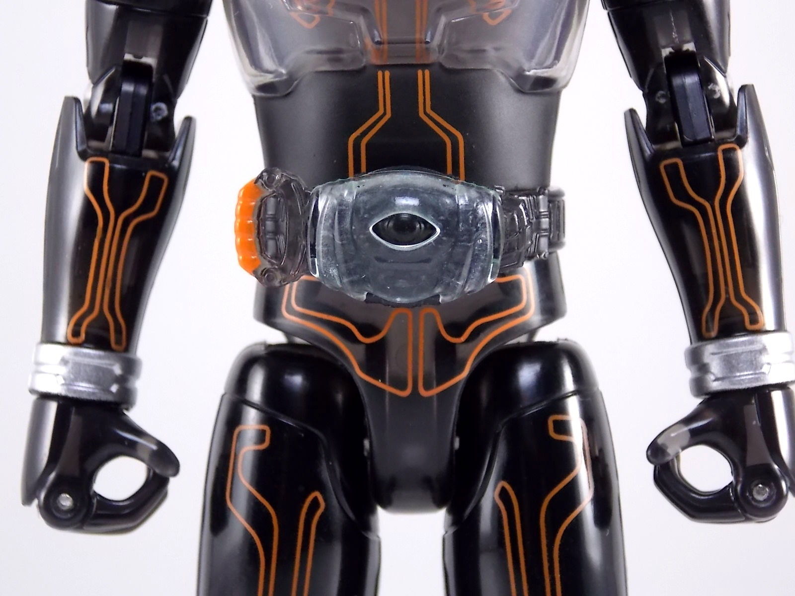 The spooktacular new rider, Kamen Rider Ghost arrives with the first of many gimmick line figures! Today we take a look at that initial release with Ghost Change GC-01 Kamen Rider Ghost Ore Damashii! ** This gallery was made possible thanks to the generosity of my good friend Baltmatrix, who let me borrow his Ghost so I didn't have to purchase one myself. Thanks Matt! Packaging As we've seen over the years the packaging for the mass retail rider gimmick lines is actually pretty nice, though for consistencies sake they usually share the same basic packaging type. Which is a smart move for a series that's on annually. Similar packaging for figures like this through out the years has got to make it easier on Japanese retailers. In any case Kamen Rider Ghost's packing deviates a bit with the two halves of his plastic inner shell forming over the figure like normal, but the box itself doesn't have a plastic window. My guess would be cost cutting as it is really unnecessary since the plastic shell fully encapsulates the toy anyway. There are good shots of the Ghost suit on the package and call outs to other merch as well as a large Ghost symbol printed on card back in the box. All in all pretty nice. Main Figure Ghost Change Kamen Rider Ghost is a rather bland figure on it's own. In his basic form with no Damashii's attached he's known as Kamen Rider Ghost Transient. This very basic form is akin to past years' pre-forms like Kuuga Growing or Den-O Plat Form. While basic it does look rather interesting. An all black suit, the majority of the figure is cast in a translucent gray/green plastic to give it a ghostly ethereal feel. The body lines are painted in a nice bright orange to contrast this and the chest detail in particular is very nice. The Ghost Driver is a little plain but that's to be expected on a gimmick style toy like this. Though as many fans have pointed out in the show, the Ghost Driver sticks rather far out off of Ghosts' waist. Here it's the same. It's non-functioning but it gets the job done well enough. The helmet details in this form actually deviate a bit from the show. The silver face plate is sort of studded with bumps to replicate the features of traditional Kamen Rider Compound Eyes. This is to help the figure pull the look of each different Damashii off, without having to tool that detail into each Damashii. So while it's a bit off from the smooth show face plate, it's smart. The figure has a fairly basic range of movement with swivel/ball jointed feet. Swivels thighs, knee bends, rotating hips, a partially rotating waist, poseable fingers, elbows, rotating shoulders, and a neck that can swivel side to side and back. It's capable of some fairly decent poses thanks to this, but as you'll see in images & read below, the Parka Ghosts/Damashiis greatly hinder this. Accessories Ghost Change Kamen Rider Ghost is pretty standard as far as retail figures of this nature are concerned. He comes with only the essential accessories: 1 - Gan Gun Saber. A totally unpainted scaled down version of his signature weapon. It's a nicely scaled weapon that indeed is sculpted faithfully to the real thing. But is totally unpainted. And cast in the same kind of translucent gray plastic as Ghost himself. Again this is probably a cost cutting measure. Like the body parts cast in this color and this weapon are probably on the same parts runner at the factory. But gimmick accessories like this rarely have many paint apps as is. 1 - Ore Damashii Parka Ghost/jacket. The series and toylines' signature gimmick. Ore Damashii is the personification of Takeru/Ghosts own soul or damashii. An interesting accessory, this gimmick very clearly appears like a spiritual (forgive the pun) successor to Arms Change. However don't be fooled. It's far sub-standard to that gimmick. While as a floating Parka Ghost on it's own this piece is fun. It's combination with the Ghost figure pretty much kills anything you could have done with the figure. Rotate the face mask on the Parka Ghost up to reveal the Ghost Ore face plate, rotate the small strappy arms on the sleeves up over the shoulders. Then slide the the whole contraption over Ghost. There are slits in the jacket part to clear the shoulders. But getting the face plugged in is I've found frustratingly difficult. But once you do, you've basically killed all the neck articulation the figure has. You can just barely angle the head side to side by pulling down on the mask and locking it in, but it's minimal at best. But not in any meaningful way that I've found. And the jacket now limits the upper body and waist movement you had before. The shoulder pads are hinged to move somewhat with the arms but they only give you minimal outward movement before they impact the arms and kill that too. Frankly it's the most obtrusive gimmick Bandai could have come up with. Final Thoughts After several years of solid gimmick toy lines with Gaim & Drive I'm sad to report that Ghost Change is kind of a flop in my book. The basic Transient Ghost figure is very nicely detailed albeit a bit boring. But the Damashii gimmick itself is terribly intrusive to the figure, limiting almost all aspects of it. Even in static poses the way the jacket forces the figure into a more rigid stance makes it look lifeless. I'm sorry to say that GC-01 Ghost Change Kamen Rider Ghost Ore Damashii is not a great toy. Buy this one on the cheap, or better yet wait for the S.H. Figuart that's being fully revealed this weekend.