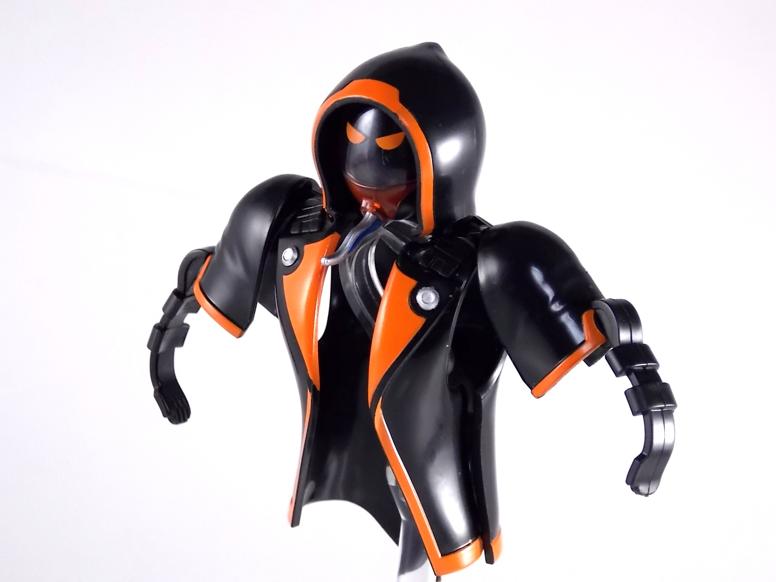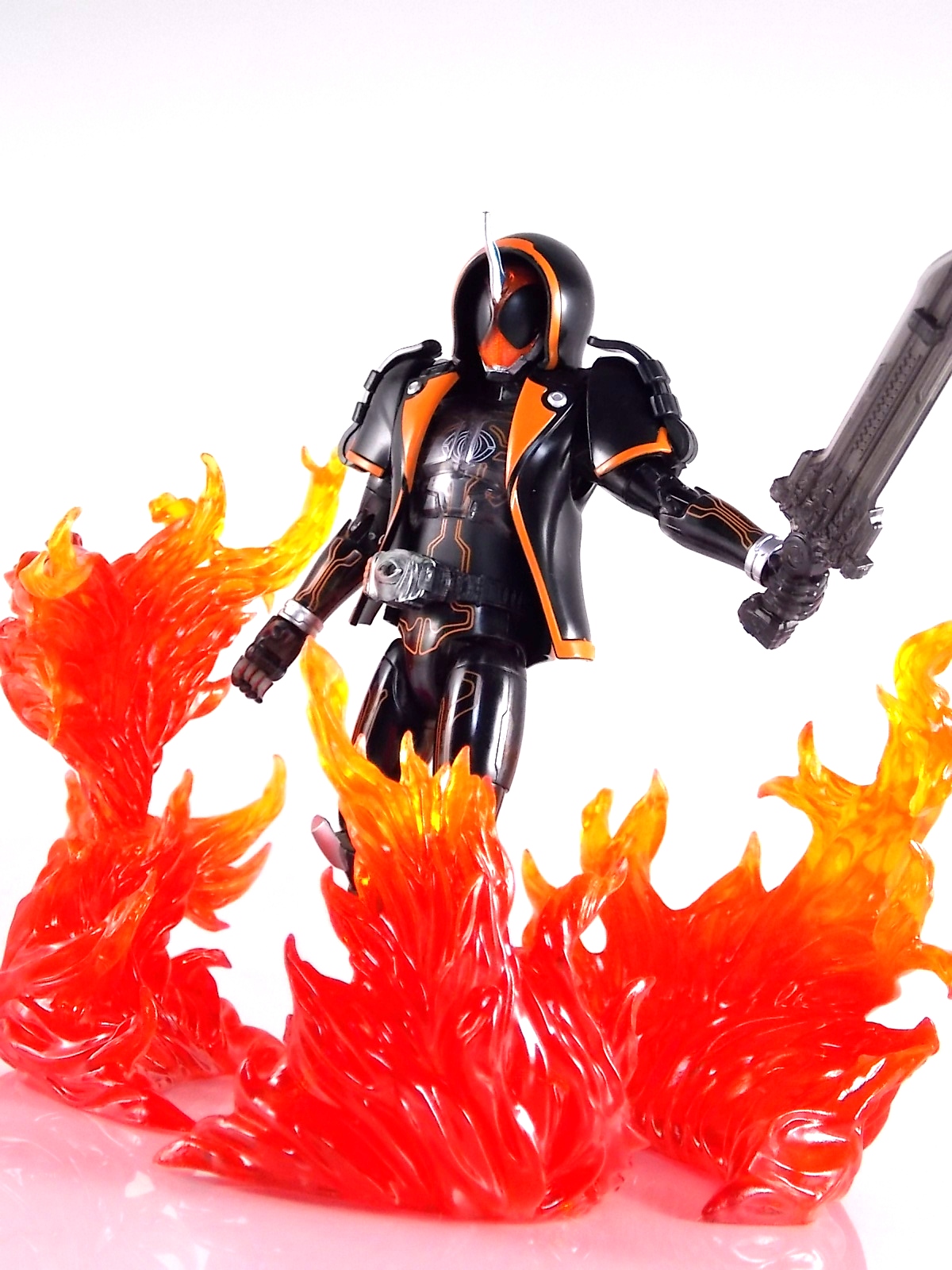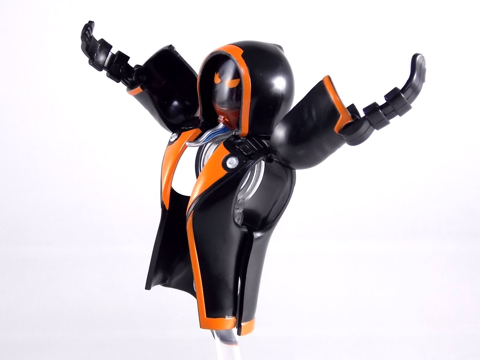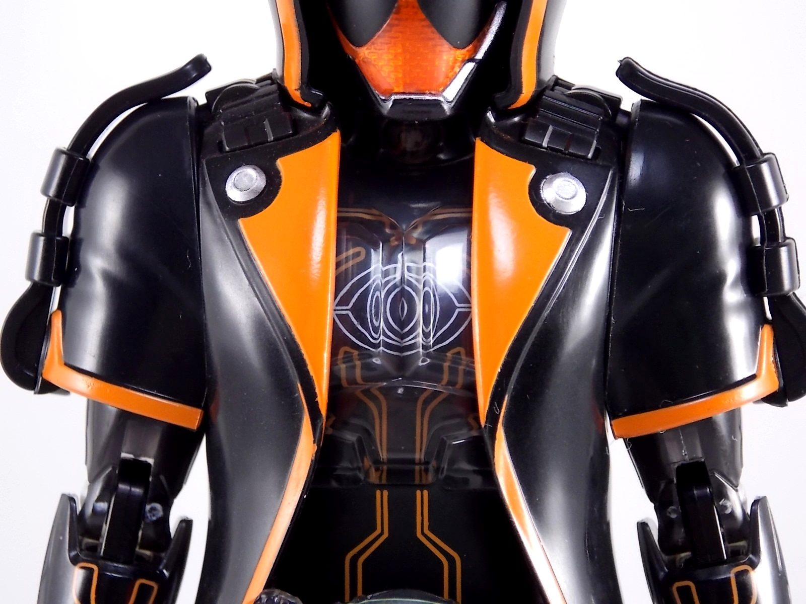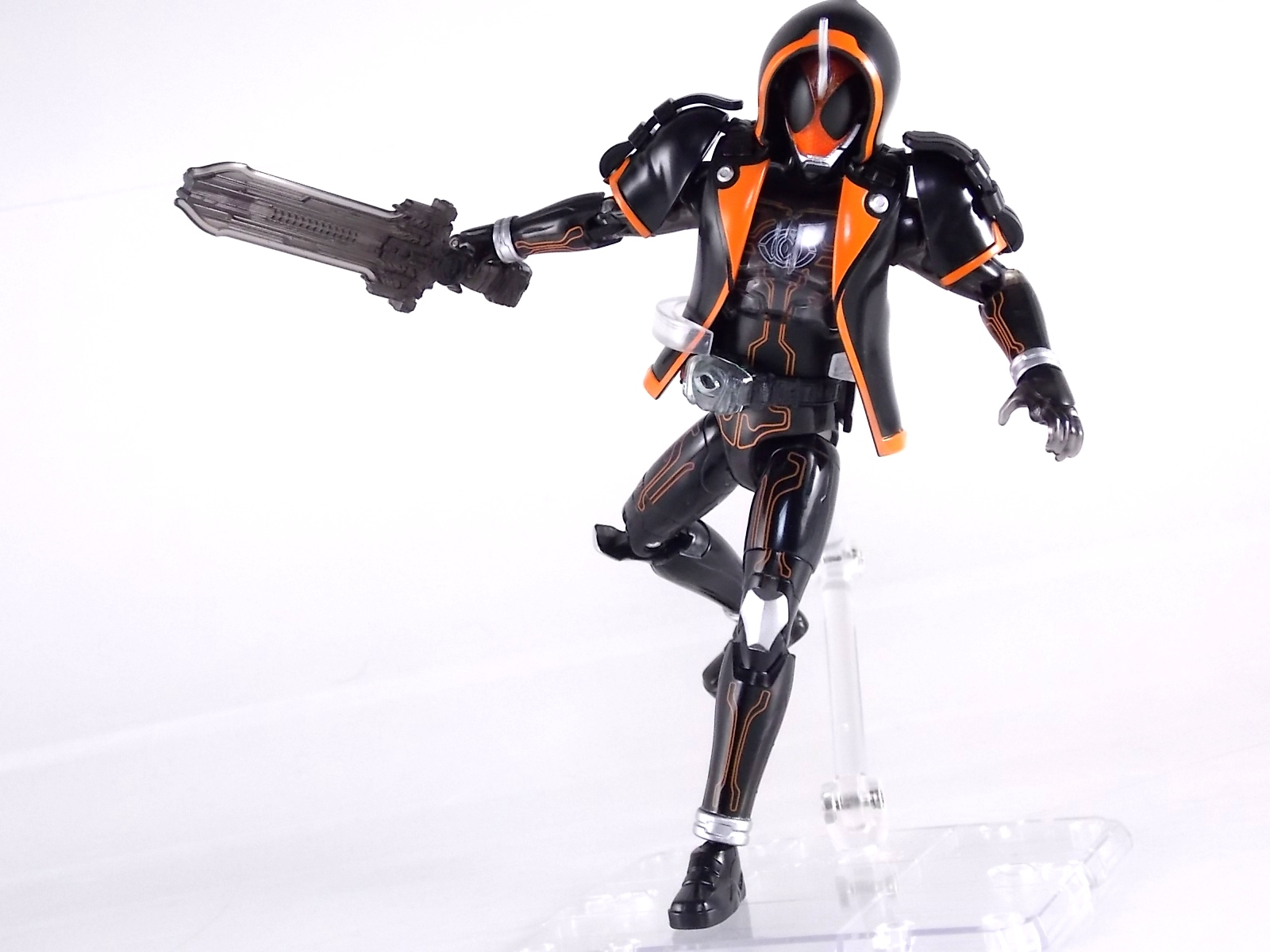 The spooktacular new rider, Kamen Rider Ghost arrives with the first of many gimmick line figures! Today we take a look at that initial release with Ghost Change GC-01 Kamen Rider Ghost Ore Damashii! ** This gallery was made possible thanks to the generosity of my good friend Baltmatrix, who let me borrow his Ghost so I didn't have to purchase one myself. Thanks Matt! Packaging As we've seen over the years the packaging for the mass retail rider gimmick lines is actually pretty nice, though for consistencies sake they usually share the same basic packaging type. Which is a smart move for a series that's on annually. Similar packaging for figures like this through out the years has got to make it easier on Japanese retailers. In any case Kamen Rider Ghost's packing deviates a bit with the two halves of his plastic inner shell forming over the figure like normal, but the box itself doesn't have a plastic window. My guess would be cost cutting as it is really unnecessary since the plastic shell fully encapsulates the toy anyway. There are good shots of the Ghost suit on the package and call outs to other merch as well as a large Ghost symbol printed on card back in the box. All in all pretty nice. Main Figure Ghost Change Kamen Rider Ghost is a rather bland figure on it's own. In his basic form with no Damashii's attached he's known as Kamen Rider Ghost Transient. This very basic form is akin to past years' pre-forms like Kuuga Growing or Den-O Plat Form. While basic it does look rather interesting. An all black suit, the majority of the figure is cast in a translucent gray/green plastic to give it a ghostly ethereal feel. The body lines are painted in a nice bright orange to contrast this and the chest detail in particular is very nice. The Ghost Driver is a little plain but that's to be expected on a gimmick style toy like this. Though as many fans have pointed out in the show, the Ghost Driver sticks rather far out off of Ghosts' waist. Here it's the same. It's non-functioning but it gets the job done well enough. The helmet details in this form actually deviate a bit from the show. The silver face plate is sort of studded with bumps to replicate the features of traditional Kamen Rider Compound Eyes. This is to help the figure pull the look of each different Damashii off, without having to tool that detail into each Damashii. So while it's a bit off from the smooth show face plate, it's smart. The figure has a fairly basic range of movement with swivel/ball jointed feet. Swivels thighs, knee bends, rotating hips, a partially rotating waist, poseable fingers, elbows, rotating shoulders, and a neck that can swivel side to side and back. It's capable of some fairly decent poses thanks to this, but as you'll see in images & read below, the Parka Ghosts/Damashiis greatly hinder this. Accessories Ghost Change Kamen Rider Ghost is pretty standard as far as retail figures of this nature are concerned. He comes with only the essential accessories: 1 - Gan Gun Saber. A totally unpainted scaled down version of his signature weapon. It's a nicely scaled weapon that indeed is sculpted faithfully to the real thing. But is totally unpainted. And cast in the same kind of translucent gray plastic as Ghost himself. Again this is probably a cost cutting measure. Like the body parts cast in this color and this weapon are probably on the same parts runner at the factory. But gimmick accessories like this rarely have many paint apps as is. 1 - Ore Damashii Parka Ghost/jacket. The series and toylines' signature gimmick. Ore Damashii is the personification of Takeru/Ghosts own soul or damashii. An interesting accessory, this gimmick very clearly appears like a spiritual (forgive the pun) successor to Arms Change. However don't be fooled. It's far sub-standard to that gimmick. While as a floating Parka Ghost on it's own this piece is fun. It's combination with the Ghost figure pretty much kills anything you could have done with the figure. Rotate the face mask on the Parka Ghost up to reveal the Ghost Ore face plate, rotate the small strappy arms on the sleeves up over the shoulders. Then slide the the whole contraption over Ghost. There are slits in the jacket part to clear the shoulders. But getting the face plugged in is I've found frustratingly difficult. But once you do, you've basically killed all the neck articulation the figure has. You can just barely angle the head side to side by pulling down on the mask and locking it in, but it's minimal at best. But not in any meaningful way that I've found. And the jacket now limits the upper body and waist movement you had before. The shoulder pads are hinged to move somewhat with the arms but they only give you minimal outward movement before they impact the arms and kill that too. Frankly it's the most obtrusive gimmick Bandai could have come up with. Final Thoughts After several years of solid gimmick toy lines with Gaim & Drive I'm sad to report that Ghost Change is kind of a flop in my book. The basic Transient Ghost figure is very nicely detailed albeit a bit boring. But the Damashii gimmick itself is terribly intrusive to the figure, limiting almost all aspects of it. Even in static poses the way the jacket forces the figure into a more rigid stance makes it look lifeless. I'm sorry to say that GC-01 Ghost Change Kamen Rider Ghost Ore Damashii is not a great toy. Buy this one on the cheap, or better yet wait for the S.H. Figuart that's being fully revealed this weekend.