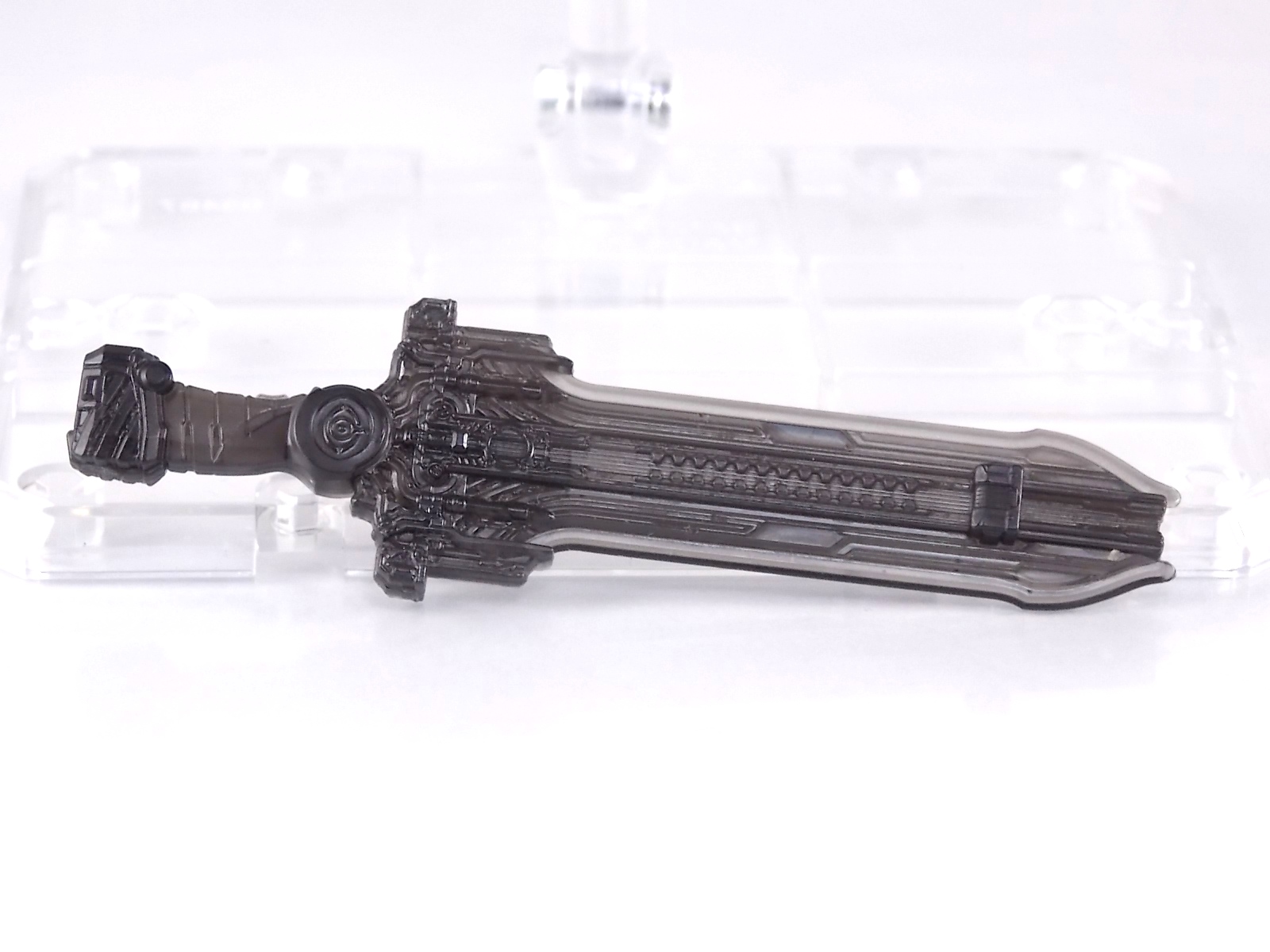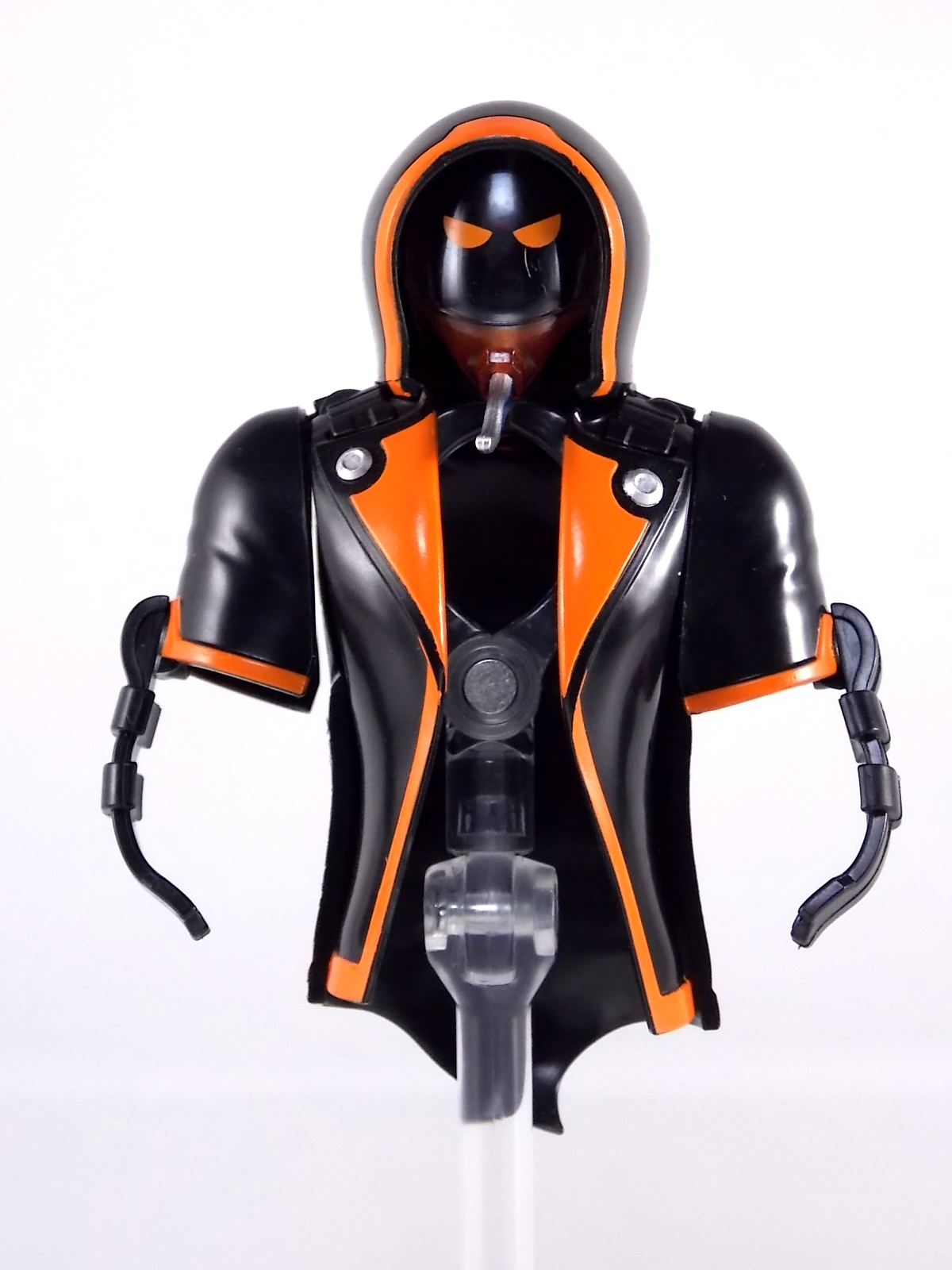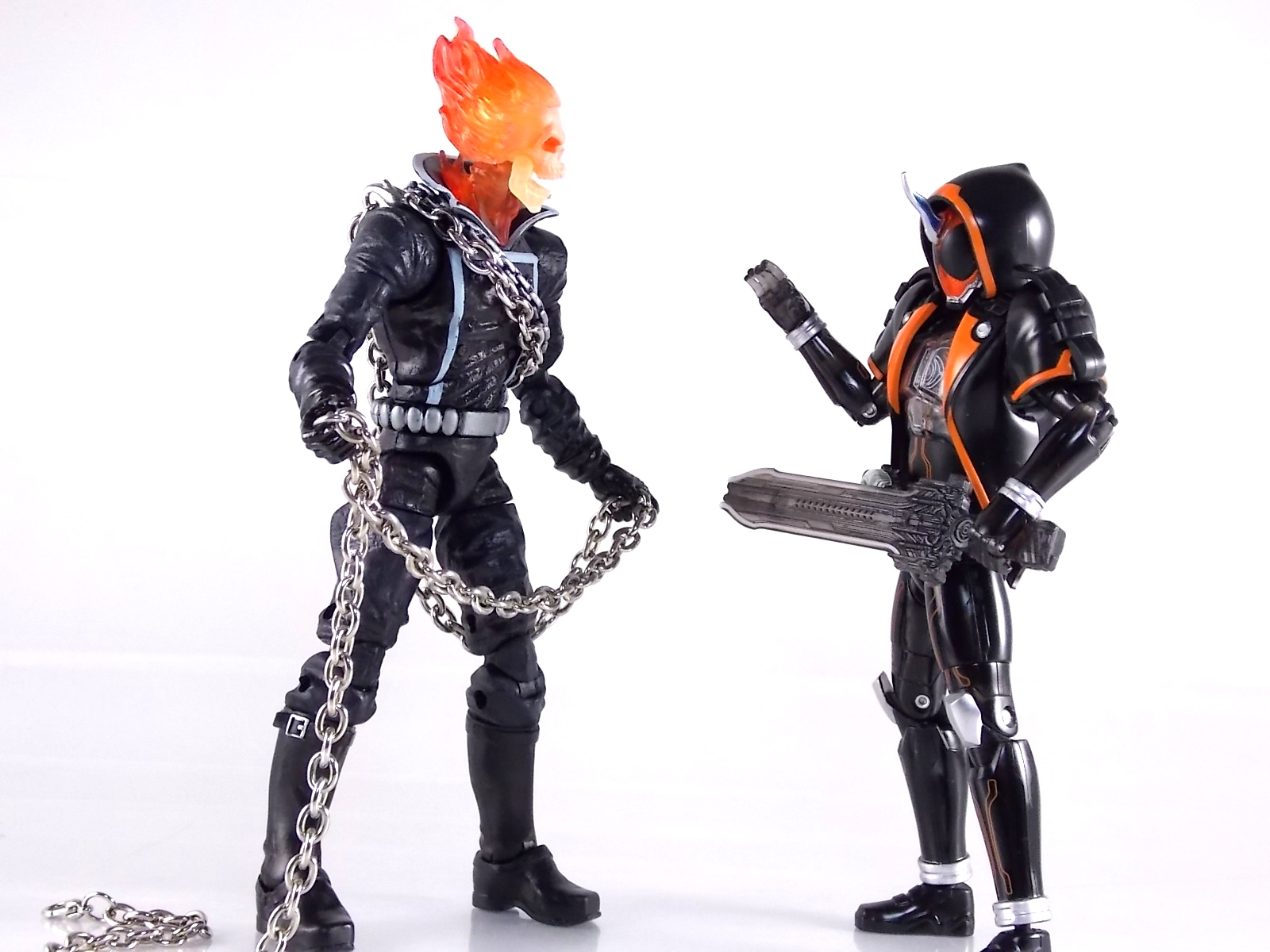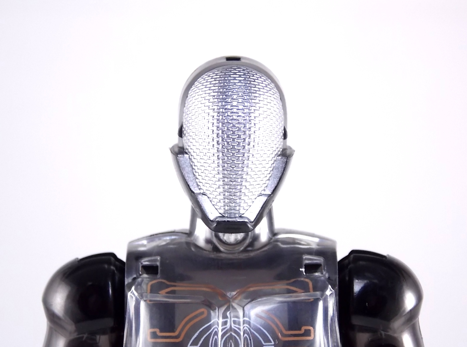 The spooktacular new rider, Kamen Rider Ghost arrives with the first of many gimmick line figures! Today we take a look at that initial release with Ghost Change GC-01 Kamen Rider Ghost Ore Damashii! ** This gallery was made possible thanks to the generosity of my good friend Baltmatrix, who let me borrow his Ghost so I didn't have to purchase one myself. Thanks Matt! Packaging As we've seen over the years the packaging for the mass retail rider gimmick lines is actually pretty nice, though for consistencies sake they usually share the same basic packaging type. Which is a smart move for a series that's on annually. Similar packaging for figures like this through out the years has got to make it easier on Japanese retailers. In any case Kamen Rider Ghost's packing deviates a bit with the two halves of his plastic inner shell forming over the figure like normal, but the box itself doesn't have a plastic window. My guess would be cost cutting as it is really unnecessary since the plastic shell fully encapsulates the toy anyway. There are good shots of the Ghost suit on the package and call outs to other merch as well as a large Ghost symbol printed on card back in the box. All in all pretty nice. Main Figure Ghost Change Kamen Rider Ghost is a rather bland figure on it's own. In his basic form with no Damashii's attached he's known as Kamen Rider Ghost Transient. This very basic form is akin to past years' pre-forms like Kuuga Growing or Den-O Plat Form. While basic it does look rather interesting. An all black suit, the majority of the figure is cast in a translucent gray/green plastic to give it a ghostly ethereal feel. The body lines are painted in a nice bright orange to contrast this and the chest detail in particular is very nice. The Ghost Driver is a little plain but that's to be expected on a gimmick style toy like this. Though as many fans have pointed out in the show, the Ghost Driver sticks rather far out off of Ghosts' waist. Here it's the same. It's non-functioning but it gets the job done well enough. The helmet details in this form actually deviate a bit from the show. The silver face plate is sort of studded with bumps to replicate the features of traditional Kamen Rider Compound Eyes. This is to help the figure pull the look of each different Damashii off, without having to tool that detail into each Damashii. So while it's a bit off from the smooth show face plate, it's smart. The figure has a fairly basic range of movement with swivel/ball jointed feet. Swivels thighs, knee bends, rotating hips, a partially rotating waist, poseable fingers, elbows, rotating shoulders, and a neck that can swivel side to side and back. It's capable of some fairly decent poses thanks to this, but as you'll see in images & read below, the Parka Ghosts/Damashiis greatly hinder this. Accessories Ghost Change Kamen Rider Ghost is pretty standard as far as retail figures of this nature are concerned. He comes with only the essential accessories: 1 - Gan Gun Saber. A totally unpainted scaled down version of his signature weapon. It's a nicely scaled weapon that indeed is sculpted faithfully to the real thing. But is totally unpainted. And cast in the same kind of translucent gray plastic as Ghost himself. Again this is probably a cost cutting measure. Like the body parts cast in this color and this weapon are probably on the same parts runner at the factory. But gimmick accessories like this rarely have many paint apps as is. 1 - Ore Damashii Parka Ghost/jacket. The series and toylines' signature gimmick. Ore Damashii is the personification of Takeru/Ghosts own soul or damashii. An interesting accessory, this gimmick very clearly appears like a spiritual (forgive the pun) successor to Arms Change. However don't be fooled. It's far sub-standard to that gimmick. While as a floating Parka Ghost on it's own this piece is fun. It's combination with the Ghost figure pretty much kills anything you could have done with the figure. Rotate the face mask on the Parka Ghost up to reveal the Ghost Ore face plate, rotate the small strappy arms on the sleeves up over the shoulders. Then slide the the whole contraption over Ghost. There are slits in the jacket part to clear the shoulders. But getting the face plugged in is I've found frustratingly difficult. But once you do, you've basically killed all the neck articulation the figure has. You can just barely angle the head side to side by pulling down on the mask and locking it in, but it's minimal at best. But not in any meaningful way that I've found. And the jacket now limits the upper body and waist movement you had before. The shoulder pads are hinged to move somewhat with the arms but they only give you minimal outward movement before they impact the arms and kill that too. Frankly it's the most obtrusive gimmick Bandai could have come up with. Final Thoughts After several years of solid gimmick toy lines with Gaim & Drive I'm sad to report that Ghost Change is kind of a flop in my book. The basic Transient Ghost figure is very nicely detailed albeit a bit boring. But the Damashii gimmick itself is terribly intrusive to the figure, limiting almost all aspects of it. Even in static poses the way the jacket forces the figure into a more rigid stance makes it look lifeless. I'm sorry to say that GC-01 Ghost Change Kamen Rider Ghost Ore Damashii is not a great toy. Buy this one on the cheap, or better yet wait for the S.H. Figuart that's being fully revealed this weekend.