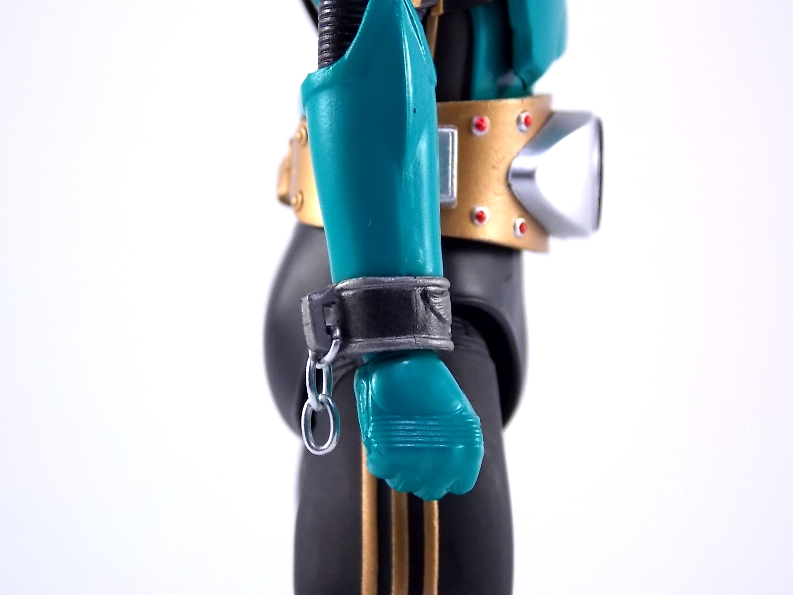 That guy is the forgotten hero of the Showa era, S.H. Figuarts Kamen Rider 3! This unique rider is not as you might first imagine, simply a new character created in the modern day. But is actually based upon one created by Shotaro Ishinimori himself in the 1972 Manga Kamen Rider 3 vs. General Black! Originally conceived as the successor to Rider's 1 & 2, Rider 3 was none other than Kazuya Taki, FBI Agent & ally to the Double Riders. Though this version of the character as rider only existed in this short 5-page manga as he was dropped in favor of Kamen Rider V3. The character would be largely forgotten for some 40+ years until 2015's Super Hero Taisen GP: Kamen Rider 3 in which a new updated version of the character was presented. Here, Rider 3 AKA Kyoichiro Kuroi, is created by Shocker with the aid of the Time-Altering Machine in order to change history. Arriving in 1972 shortly after Riders 1 & 2 have destroyed Gel-Shocker, Rider 3 savagely attacks and defeats both riders, ensuring Shocker's time altered control of the past present & future. However what Great Leader could have never imagined, was how the act of destroying the Double Riders and the guilt of that action would eventually reawaken Rider 3's heart to justice. Ultimately bringing the downfall of Shocker once more. ** The name is often romanized one of three ways like most numerically based rider names. "3", "3Go", or "Sango". For ease and consistency I'll just be using the term Rider 3. Packaging What you'll immediately notice about Rider 3's packaging is that even though he's meant to have Showa Rider lineage, it's actually in the style of a Kamen Rider Drive release! That makes sense considering his origin & appearances in Tasien GP, itself a primarily Drive focused film. It's unique to see a pseudo-Showa rider packed in a specific Heisei style of box none the less and it looks very good. But the box is primarily what we've come to expect from Drive themed releases. Many Rider releases come in these slim style boxes now, but Rider 3 specifically is designed around the Drive packaging type. Main Figure Ever since the first images of Rider 3 leaked from the film online I was impressed. This, for all intents and purposes, additional Showa Rider bore all the hallmarks of the time period, but with a modern twist. Specifically he's always appeared to me to be like a S.I.C Kamen Rider in physical form. The figure is no different in hand. Kamen Rider 3 is one of the most solid original molds released in years. A brand new figure, Rider 3 is entirely unique. Which is a bit odd given his nature as a one-off alternate time line movie villain/hero. This mold can't really be used for anyone else. But boy did they go all out on this one. Again Rider 3 seems to take cues from the S.I.C. toyline but also seems to draw inspiration from the Kamen Rider The First & The Next film designs. Hard angular lines and sharp edges adorn his body and build up his physique well beyond those of the aging Shin Rider 1 & Rider 2 figuarts seen below. I never felt the old riders showed their age much until this bad boy arrived. Now it's much more apparent. Each of Rider 3's ankles and wrists features a really nice detail you don't see often, and that's Shocker cuffs with actual metal links on the chains. Each cuff features the Shocker emblem and has a couple small links hanging off of them. A symbolic design feature to show his servitude to Shocker. This among other creative choices really sets Rider 3 apart from his Showa brothers. Like the very bright teal color of a majority of his armor, rather than the drab green of 1 & 2. Gold body stripes rather than white and a gold belt & scarf to go along with this. Uniquely Rider 3 also features yellow compound eyes that just look gorgeous in the right light. And that headsculpt is where it's at. Again, this component more than any other screams S.I.C. to me, in the best ways. The Rider 3 design is just a beautiful one to behold in any form and this figure is no different. Perhaps my only gripe with it would be that the hips can be a bit fidgety and hard to set in an even position with one another. I was surprised that the chest and torso have a fantastic range of motion as well despite the thick broad design. This is jut a solid figure. Accessories Rider 3 Actually has even more in common with his Showa brothers than you might think, specifically a mid-level accessory count: 6 - additional hands. The usual type of open expressive hands. No "holding things" or driving/riding hands at all. 1 - scarf/muffler. A nice golden brown to match his suit. 1 - Rider Kick Effect Part. In fact this is the exact same kick effect that Shin Rider 1 & Rider 2 (Ichigo/Nigo) came with. Some slight color differences give it a distinct teal flavor. But otherwise identical, the foot hole has been remolded slightly to accommodate Rider 3's new boot design. Though I find this effect to be difficult to use, it does look nice. Mine kept falling off his foot. 2- Typhoon Rocket Effect Parts. These smaller effects are meant to plug onto the tiny jets on either side of Rider 3's Typhoon belt. These simulate his limited flight capability, but they also serve as effects for his henshin poses. Honestly that's a pretty decent selection. As a retail release he feels a bit lite, but he really does come with just about anything he'd need at all. Everything that he used in the movie is here. Well other than, you know, other than that gigantic awesome car.... Final Thoughts As a whole package S.H. Figuarts Kamen Rider 3 is one of the more complete and solid releases I've handled for some time. It's a fantastic looking figure with just the right accessories to compliment it. He's a well designed and executed toy that really captures the look of his on screen counterpart. They've managed to take that wild modern design and shrink it down perfectly. And it fits in just perfectly with about any Showa or Heisei rider display as well. I'm a little bit sad 