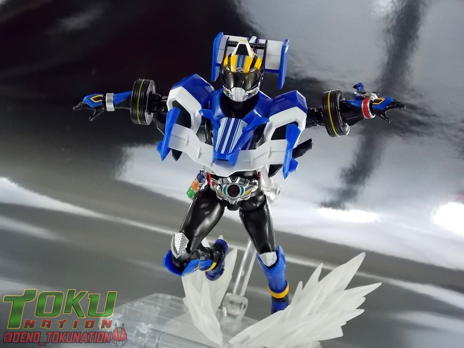 Kamen Rider Drive's penultimate form arrives in our latest gallery before the holidays commence! Today we're showcasing S.H. Figuarts Kamen Rider Drive Type Formula! ** I've basically taken 2 galleries here. Post #1 has an extensive look at this figure without decals applied, [/B] post #2 features the Trailer Cannon, & post #3 features the full figure with all decals applied. Packaging As with all previous Kamen Rider Drive releases, the only new thing to say about this packaging is that it feature a windowless box because it's a Tamashii Web Exclusive. So this is totally normal for web exclusives. In this case, just as with Heart, we get to see a lot more awesome box art because of it. Everything else is business as usual. Main Figure I'll start off by saying I never really understood the distaste that many people had for Drive Type Formula. To me it's an incredibly unique and fun design that takes the car theme to it's extreme, in a good way. The figuart down scales that fantastic design perfectly. And of course because it shares molding with the previous Drive releases it's an already excellent figure. So let's break it down. For starters, aside from minor mold changes and color differences much of Type Formula's lower body is indentical to Type Speed & Proto-Drive. The first significant change is the new Formula readout on the Drive Driver As with all previous uses of this part the Driver can be removed and the readout can be swapped out. The upper body of course features extensive new molding & remolding. Beginning with the arms we get the new "flipped" Shift Formula in the Drive Brace. Also new to the forearms are the Type Formula Tires. These smaller tires thankfully do no significantly hinder the arms posability. The Tire Koukan Formula figure, as well as the show prop, could exchange these tires in favor of other power ups but much like Proto-Drive this figure has not been designed for these Tires to be removable. The most interesting new molding on this figure is the entire chest assembly. Basically the entire upper body is new. The chest has a rather large pair of spoiler wings modeled after an F1 car called the Power Gail Wing. This assembly can be removed exposing the flat chest beneath and also allows you to plug on one of the below listed accessories, an exposed Core Driviar-N. The shoulder pads greatly resemble car fenders and do hinge up, but not quite enough to give the arms quite the forward & back range they require. Don't get me wrong you can plenty of use out of the arms, but the combination of the tires, shoulders, & large breast plate make it difficult to get some poses out of this guy. On the back side Drive has the newly molded in X-Fan-Boost. Essentially a booster jet on his back with a spoiler. And finally we have a new remold of the standard Type Speed head. Formula's head features the same basic design of Type Sped with a new vent on top for aerodynamics and an epic pair of shades over his visor. The shades can be removed by the nature of their design but there's no real purpose to it. As I'm sure everyone is wondering, yes this figure had an extensive decals sheet to deal with. I was pretty skeptical of having to apply ALL of the Shift Car sponsor logos myself too, I still firmly believe Bandai should have just done these as tampographs. I'd even have been willing to pair even more for that. But that being said, applying the decals was not difficult in the slightest. While the layout of the decal sheet itself and the instructions don't quite match up, it's not too hard to get everything where it goes. There's a certain margin of error I was willing to accept and I'm glad to say I never came close to it. I expected to ruin these decals and I didn't. If you use a fine point curved pair of tweezers as I did then applying these is a piece of cake. Oddly there are several totally unused decals on this sheet, a couple of Drive "R" symbols and the FULL readout that would go on the Trailer Cannon. The directions make no mention of these additional labels. Accessories 1 - Shift Formula Car. Standard un-flipped version, the flipped one is in the Drive Brace already. 1 - Core Driviar-N. A swap out part for the chest. Not much point in it really without a figuarts version of the Pit Crew to do repairs on the suit as the only time this part was exposed in show meant Drive had been damaged. 2 - sets of hands. Just so Drive can actually hold the Trailer Cannon and the 2nd set just for expressive purposes. 1 - Trailer Cannon. Now this is a pretty great example of how S.H. Figuarts should strike the balance between functionality & accuracy. When not in use by Drive the Trailer Mode can be left on it's own as an oversized Shift Car. To become a handheld weapon you just need to pull down on the handle and lock it into place. However the Trailer Cannon can also replicate the Rider Shooting Full Throttle attack. To do this you can first remove the Shutter Gate Panel, its the sort of sight on top of the Cannon, a small peg for Shift Cars is there. Just plug on the one of you're choosing. This replicates how the real deal would physically load Shift Cars through a slot in the same place. You can also pull on the silver panel on the front of the cannon to full the entire Shift Container Barrel out, which itself has 2 Shift Car pegs on it. So you can mix & match Shifts as you please to recreate Drive's attacks. I can't really think of anything else that Type Formula should have come with that it didn't. That's everything relevant to it, and while the hand selection is slim it's all you really need for this figure. It's got the perfect accessory loadout. I do wish the Pit Crew Shift Cars & tires (Sparner, Jacky, & Mantan) had been released but I doubt they would have been included with this. As is though I'm more than pleased. Final Thoughts Overall I'm ridiculously happy with how this figure turned out. Being what it is many people wrote this design off as goofy, cumbersome, and ul