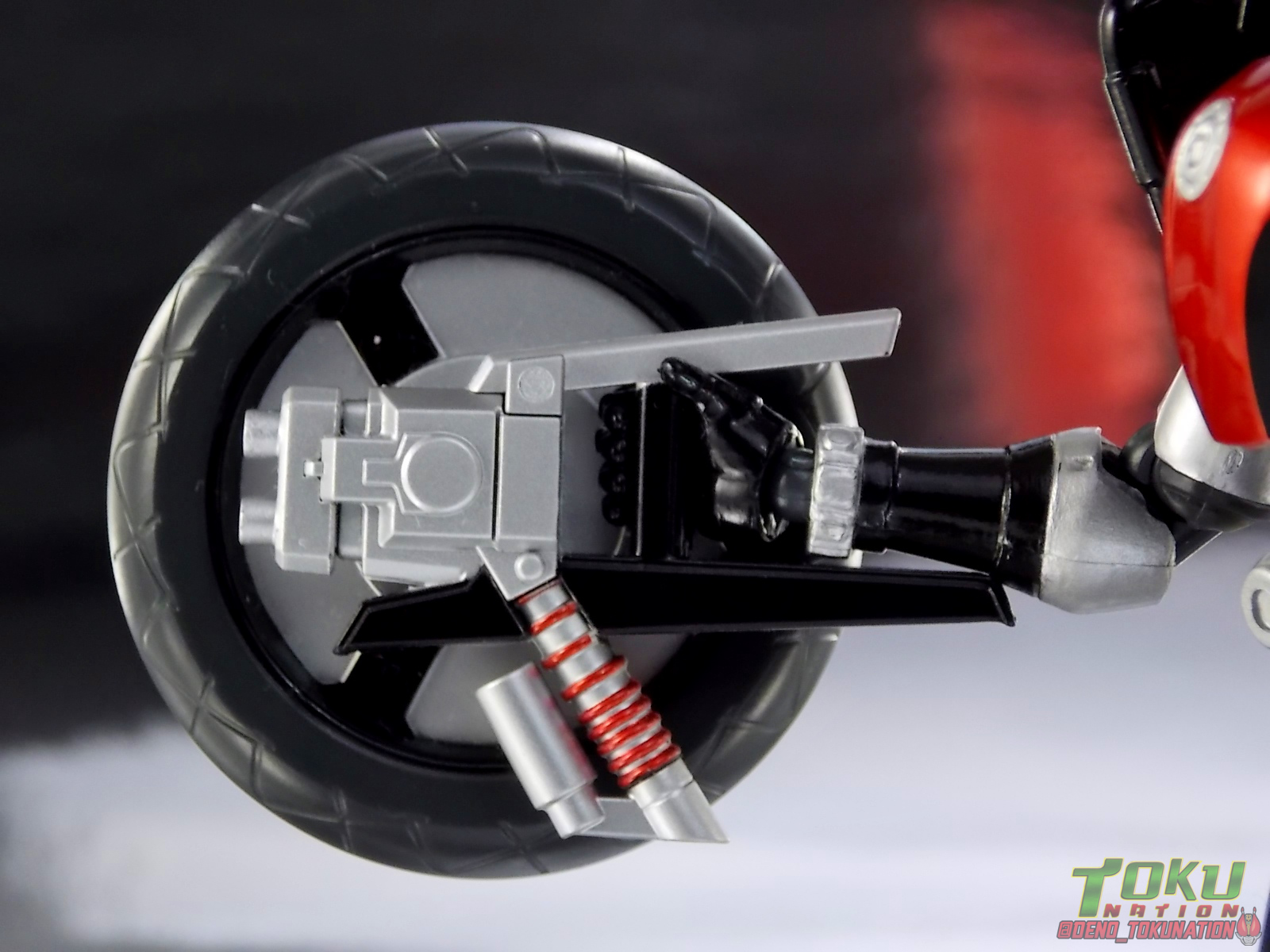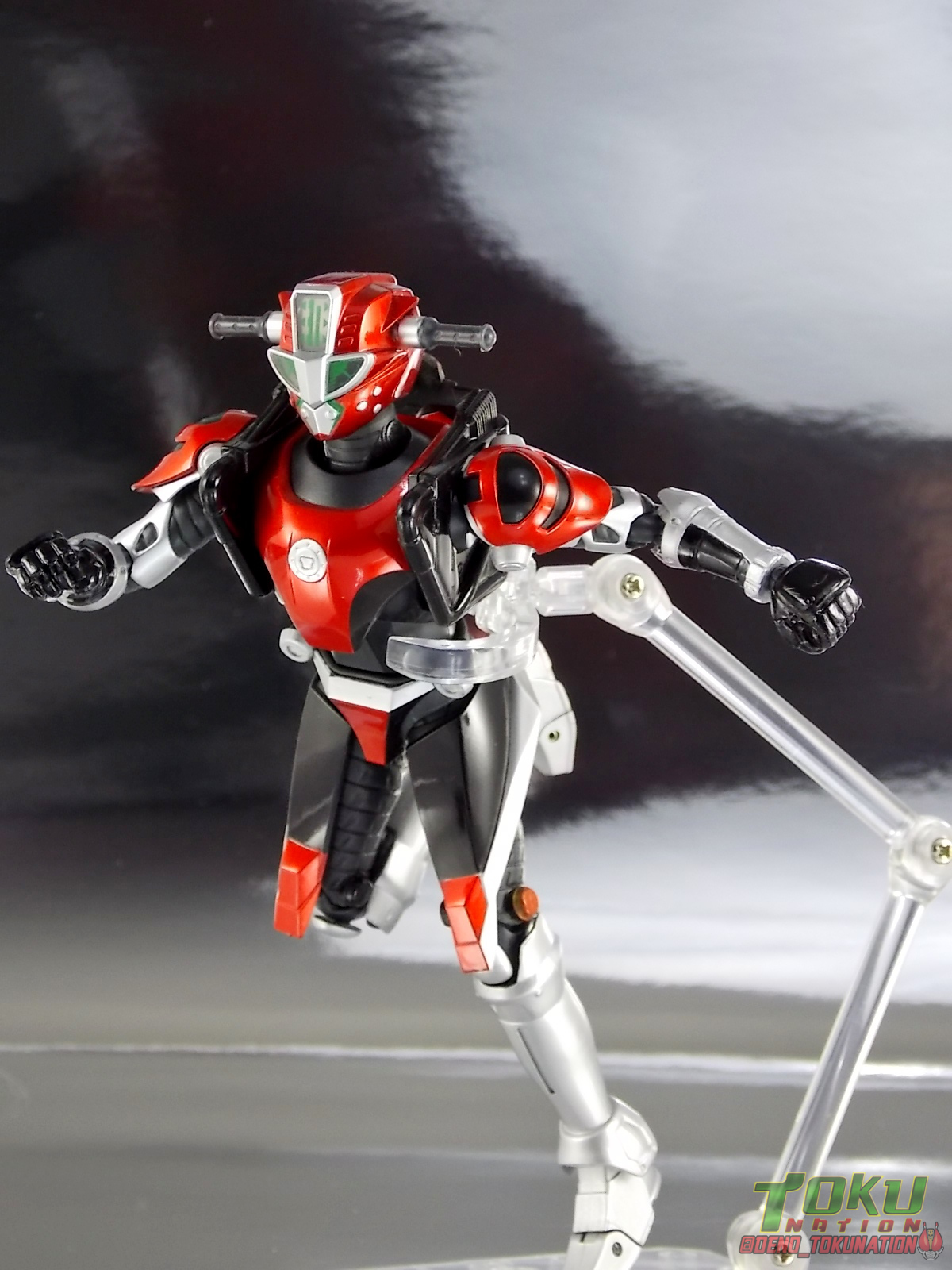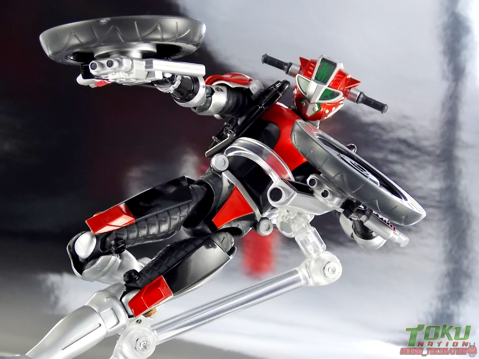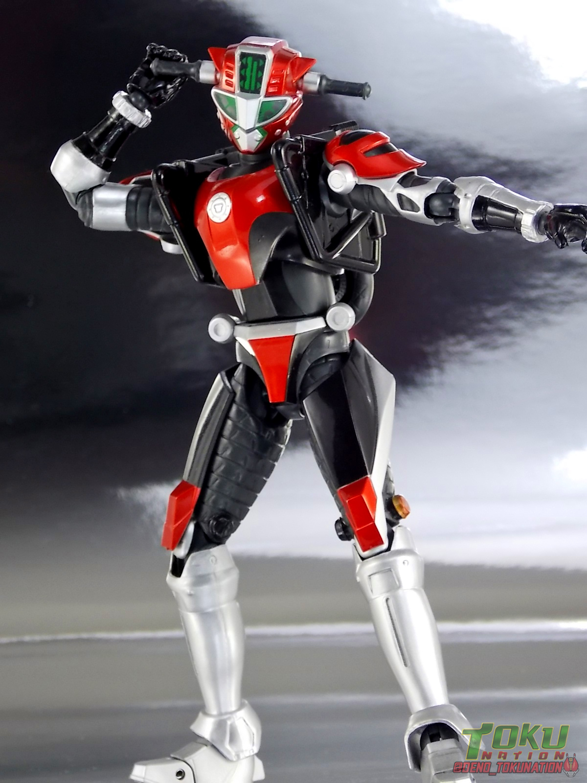 Continuing my retrospective look back at the figures released for Tokumei Sentai Go-Busters we've got another gallery 2.0 for you. Last time we caught up with a look back at S.H. Figuarts Red Buster. Today we're taking a look at his robotic partner, his buddy, S.H. Figuarts Nick Cheeda! Nick is of course the first of the 3 companion Buddyroids for the team. Uniquely of the 3 Buddyroids Nick is the only with the ability to transform, and also the only one to go out into the field regularly and face combat. While this figure can't transform into his bike mode it gets the point of Nick's fun loving directionless personality across perfectly. Read on below! Packaging As I mentioned last time, Go-Busters figuarts featured some really creative packaging. And I still think that's true. Nicks' box features all the same series hallmarks and logos as part of it's design that Red Buster did. Even that wonderful "shades" logo. The metallic reflective cardboard makes it feel premium, which in this case is beneficial as Nick was released as a Tamashii Web Exclusive. Stock photos don't offer much but frankly the figure demonstrates why, more on that below. Obviously when it comes to Japanese names the family name is spoken first followed by the first name. So Nick's name is spoken as "Cheeda Nick" and is written that way on the box. However for the sake of ease when referring to the figure, and framing it in English, I'm just gonna stick to saying Nick Cheeda. Main Figure S.H. Figuarts Nick Cheeda is a brand new mold when compared to Red Buster. They share no similar parts at all. Most of the time when a figuarts subline begins you get several figures with similar design and new tooling. But because of how radically different each of the Buddyroids are, their molding is totally unique to them. This probably explains why all 3 became Web Exclusives, but then again so were Blue & Yellow Busters. In any case Nick is a refresher after Red Buster. However in much the same Red Buster suffered from design deficiencies so too does Nick. For starters Nick has very odd legs. While the design of this figure is truly faithful, it doen't attempt to fix the design to work in toy form. The figure doesn't take into account how everything functions on a human wearing a suit as opposed to a toy with limited mobility. Nick has toes that curve upwards in their resting position. Meaning with the added weight on his back this makes for precarious posing, even for basic generic stances. The hips likewise have large silver/black protrusions that impact the waist and keep the legs from reaching a full range of motion. You can either get some pretty boring poses out of them or you have to work the protrusions past the waist for crazy leg splits. There's not much of an in-between. Add on top of this that the hips themselves are rather loose and you see the main problem with the figure. Making up for this the torso components are actually really great. Again this is a faithful sculpt. Nick has a nice floating upper torso that can angle out pretty well, the black struts/shoulders don't really impact that. Surprisingly he has much better arm movement than Red Buster himself thanks to higned shoulder pads and improved elbow joints. The plastic tolerances seem to be greatly improved as well. The headsculpt is totally on point too. Nick's head & face is of course what becomes his motorcycle modes' handlebars & gauges. Now this figure can't transform into that mode but the detailing is present that would make you believe it could. Nick's eyes and forehead are actually painted then overlayed with translucent plastic to give the gauges an authentic look. And yes of course, as you can see below, Nick can reach up and 'rev' his own handlebars. On his back you'll also see sculpted in details that mimic the front wheel and nose of his motorcycle mode. Albeit in a mass shifted and slimmed down form. Though this is accurate to the show suit as well. While Nick Cheeda is far from perfect, this figure winds up having a pretty deep personality. You can jut hear Nick shouting "Hiromu!" when posed running. A Tamashii Stage & some effect parts go a long way to complementing this figure. A quick comparison VS the old retail toy transforming MBAF Nick Cheeda, shows that S.H. Figuarts Nick Cheeda is indeed the winner. And Nick can ride himself (sort of). Accessories Nick includes just a few essential accessories: 2 - open "holding things" hands. Included to use the following weapons. 2 - Rear Wheel Guns. These weapons are rarely used by Nick in show but necessary for inclusion with this figure. They make up the missing mass lost in the transition from his bike to Buddyroid mode. When transforming in show Nick usually just uses some CGI magic to go from bike to complete robot without these guns showing up much. Technically they should always be present but oh well. The only difference between the two is that the left hand gun has a removable exhaust pipe that you'll need to pop off to get it in his hand. It plugs back on securely. They can be a little difficult to get into his fists but once there they're nice and secure. They're a little large and clunky but you can get some decent poses out of them. The only limitation is the design of Nick himself. Honestly the Buddyroids didn't use many items or accessories in show. So I was never surprised by how little Nick came with. This figure predates the now semi-typical trend of transforming characters getting figuarts that actually can transform. Nick came out long before the like of Auto Vaijin or the soon to be release Dragranzer. So it's understandable he can't transform, but I would have gladly paid more for a figure that could. Final Thoughts As with Red Buster, even after all these years flaws & all, I'm still more than happy to own S.H. Figuarts Nick Cheeda. Tokumei Sentai Go-Busters is still one of my favorite shows ever so I'm happy to have these figures. Even knowing the team will never be complet
