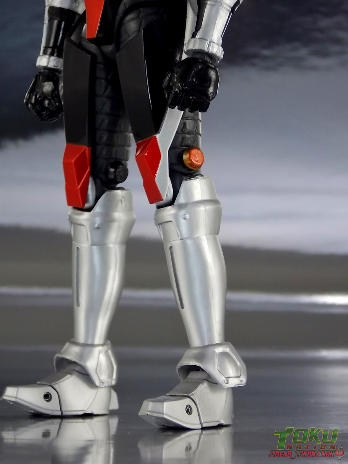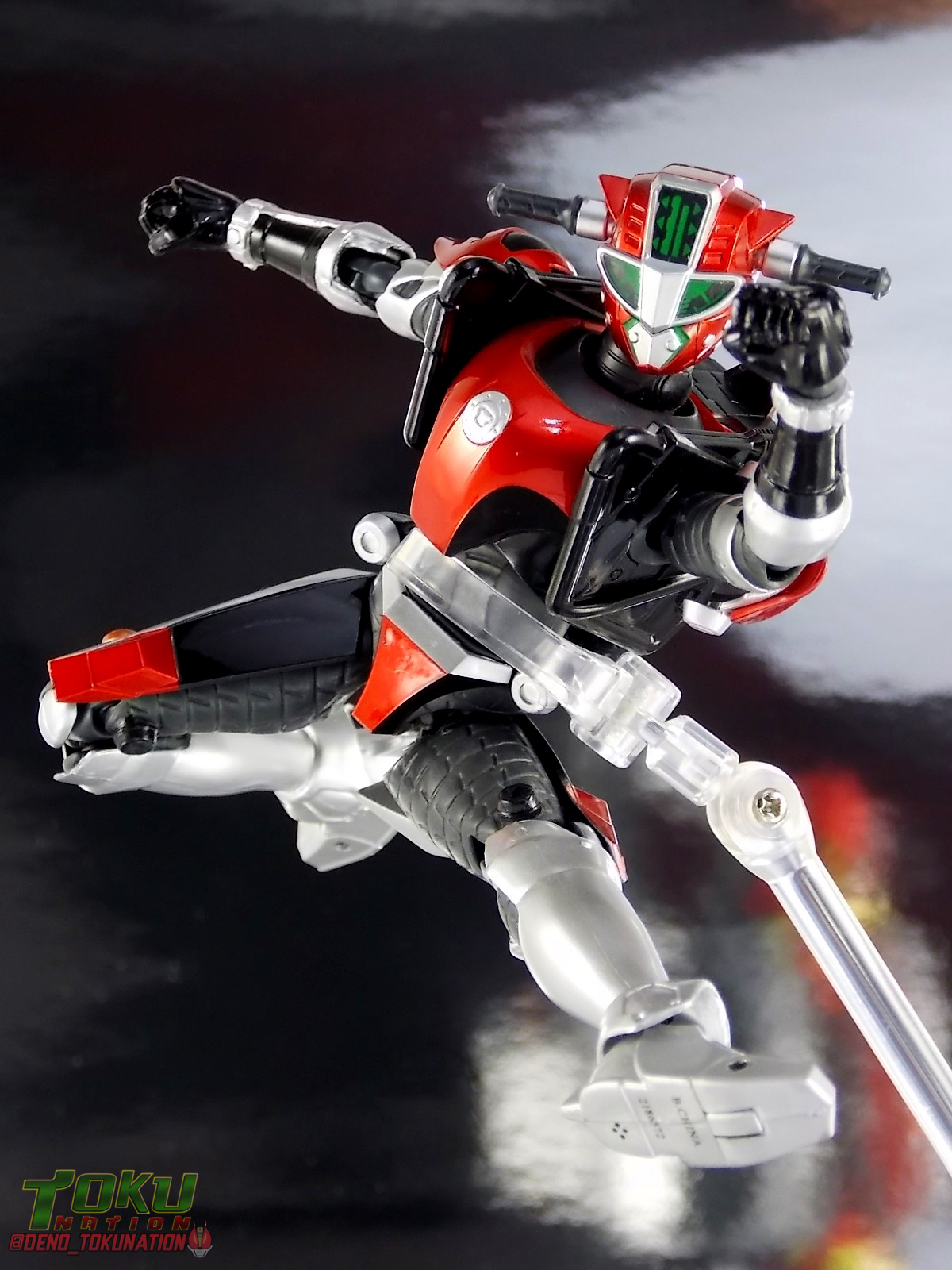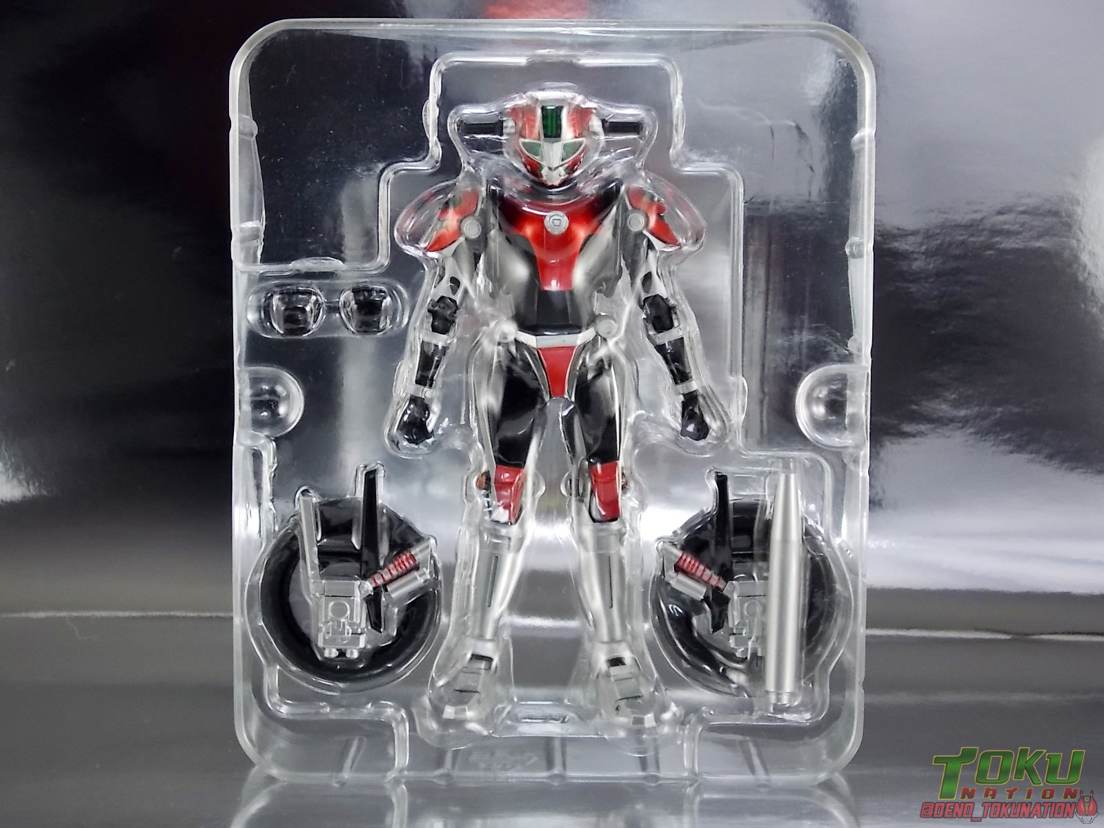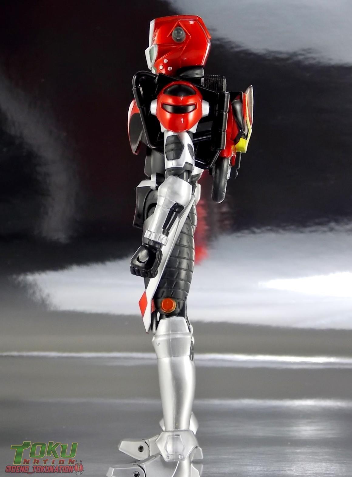 Continuing my retrospective look back at the figures released for Tokumei Sentai Go-Busters we've got another gallery 2.0 for you. Last time we caught up with a look back at S.H. Figuarts Red Buster. Today we're taking a look at his robotic partner, his buddy, S.H. Figuarts Nick Cheeda! Nick is of course the first of the 3 companion Buddyroids for the team. Uniquely of the 3 Buddyroids Nick is the only with the ability to transform, and also the only one to go out into the field regularly and face combat. While this figure can't transform into his bike mode it gets the point of Nick's fun loving directionless personality across perfectly. Read on below! Packaging As I mentioned last time, Go-Busters figuarts featured some really creative packaging. And I still think that's true. Nicks' box features all the same series hallmarks and logos as part of it's design that Red Buster did. Even that wonderful "shades" logo. The metallic reflective cardboard makes it feel premium, which in this case is beneficial as Nick was released as a Tamashii Web Exclusive. Stock photos don't offer much but frankly the figure demonstrates why, more on that below. Obviously when it comes to Japanese names the family name is spoken first followed by the first name. So Nick's name is spoken as "Cheeda Nick" and is written that way on the box. However for the sake of ease when referring to the figure, and framing it in English, I'm just gonna stick to saying Nick Cheeda. Main Figure S.H. Figuarts Nick Cheeda is a brand new mold when compared to Red Buster. They share no similar parts at all. Most of the time when a figuarts subline begins you get several figures with similar design and new tooling. But because of how radically different each of the Buddyroids are, their molding is totally unique to them. This probably explains why all 3 became Web Exclusives, but then again so were Blue & Yellow Busters. In any case Nick is a refresher after Red Buster. However in much the same Red Buster suffered from design deficiencies so too does Nick. For starters Nick has very odd legs. While the design of this figure is truly faithful, it doen't attempt to fix the design to work in toy form. The figure doesn't take into account how everything functions on a human wearing a suit as opposed to a toy with limited mobility. Nick has toes that curve upwards in their resting position. Meaning with the added weight on his back this makes for precarious posing, even for basic generic stances. The hips likewise have large silver/black protrusions that impact the waist and keep the legs from reaching a full range of motion. You can either get some pretty boring poses out of them or you have to work the protrusions past the waist for crazy leg splits. There's not much of an in-between. Add on top of this that the hips themselves are rather loose and you see the main problem with the figure. Making up for this the torso components are actually really great. Again this is a faithful sculpt. Nick has a nice floating upper torso that can angle out pretty well, the black struts/shoulders don't really impact that. Surprisingly he has much better arm movement than Red Buster himself thanks to higned shoulder pads and improved elbow joints. The plastic tolerances seem to be greatly improved as well. The headsculpt is totally on point too. Nick's head & face is of course what becomes his motorcycle modes' handlebars & gauges. Now this figure can't transform into that mode but the detailing is present that would make you believe it could. Nick's eyes and forehead are actually painted then overlayed with translucent plastic to give the gauges an authentic look. And yes of course, as you can see below, Nick can reach up and 'rev' his own handlebars. On his back you'll also see sculpted in details that mimic the front wheel and nose of his motorcycle mode. Albeit in a mass shifted and slimmed down form. Though this is accurate to the show suit as well. While Nick Cheeda is far from perfect, this figure winds up having a pretty deep personality. You can jut hear Nick shouting "Hiromu!" when posed running. A Tamashii Stage & some effect parts go a long way to complementing this figure. A quick comparison VS the old retail toy transforming MBAF Nick Cheeda, shows that S.H. Figuarts Nick Cheeda is indeed the winner. And Nick can ride himself (sort of). Accessories Nick includes just a few essential accessories: 2 - open "holding things" hands. Included to use the following weapons. 2 - Rear Wheel Guns. These weapons are rarely used by Nick in show but necessary for inclusion with this figure. They make up the missing mass lost in the transition from his bike to Buddyroid mode. When transforming in show Nick usually just uses some CGI magic to go from bike to complete robot without these guns showing up much. Technically they should always be present but oh well. The only difference between the two is that the left hand gun has a removable exhaust pipe that you'll need to pop off to get it in his hand. It plugs back on securely. They can be a little difficult to get into his fists but once there they're nice and secure. They're a little large and clunky but you can get some decent poses out of them. The only limitation is the design of Nick himself. Honestly the Buddyroids didn't use many items or accessories in show. So I was never surprised by how little Nick came with. This figure predates the now semi-typical trend of transforming characters getting figuarts that actually can transform. Nick came out long before the like of Auto Vaijin or the soon to be release Dragranzer. So it's understandable he can't transform, but I would have gladly paid more for a figure that could. Final Thoughts As with Red Buster, even after all these years flaws & all, I'm still more than happy to own S.H. Figuarts Nick Cheeda. Tokumei Sentai Go-Busters is still one of my favorite shows ever so I'm happy to have these figures. Even knowing the team will never be complet