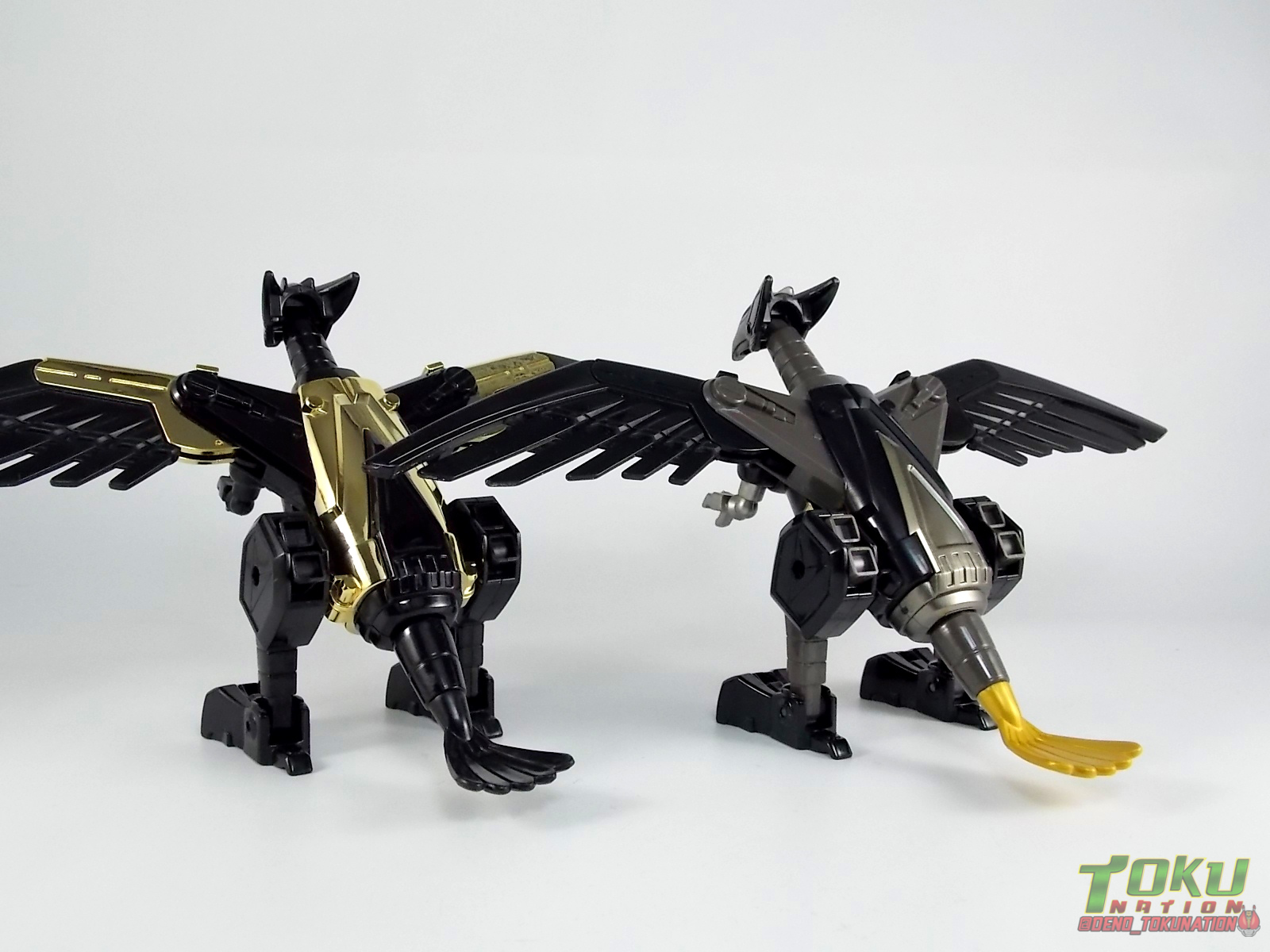 So what do we know about it? As far as anyone knows an extremely limited number of Gold Galaxy Megazords were produced. In similar fashion to Lucky Draw releases from Bandai Japan, this set exists only in double digit numbers. Originally thought to have only been manufactured in a run of less than 10, in recent years it's come to light that as many as 15+ of these gorgeous sets were produced. Originally sold as FAO Schwartz exclusives each Gold Galaxy Megazord included a Certificate for the buyer as "proof" of their ownership of the set. The one included with my Megazord is luckily still blank. After the initial FAO Schwartz run a handful of these Megazords were given away some years later as prizes. These sets rarely turn up for sale and often for staggering prices. Though there aren't many of them left in circulation, prices can range anywhere from about the $500 mark to upwards of $1500 and beyond in some earlier documented sales. I simply lucked into finding this set for an absurdly good deal. And I could not pass up the opportunity to share an incredible piece of Power Rangers & toy collecting history with the community. So here we are! Below you'll find a quick overview of each component and the combined form with photo comparisons to Black GingaiOh for reference. I hope you enjoy it! Packaging As with most special color releases in toy lines, the Gold Galaxy Megazord comes packaged in the same box as the original release, though with significantly altered colors. The entire packaging is done up in black & gray with gold accents. The stock images of the toys show them in their true black & gold colors but everything else is muted. Including the cross-sells for the Stratoforce & Centaurus Megazords on the side. The inner packaging is the exact same styrofoam tray as the normal Galaxy Megazord. The packaging as a whole is of course totally different from either of the original Japanese GingaiOh releases. The box and styrofoam were re-designed to be a few inches shorter and more compact for US store shelves. I have to mention that it's a little difficult to determine exactly which surfaces are true 14K Gold or vacuum metalized gold chrome. While undoubtedly the actual diecast components that are gold have the 14K plating, that my not necessarily be true for the rest of everything. Regardless the gold looks identical on nearly every surface where it's present. Components Gorilla We'll kick the review proper off with the Gorilla Galactabeast. In this rendition of the figure, nearly every visible surface is golden. The only portions of this figure not covered in gold in one form or another are the forearm and the top of the shoulder area. Even the underside of the feet where the Megazord fists are stored is golden. Now of course this presents a fairly wide spread fingerprint issue. LOL. Once transformed for its part of the Megazord combination you can see the exposed thighs are actually black as well as the small hinges the Gorilla arms rotate on. As you can see the Black Starbeast Gingarilla has a radically different color scheme with a much more vibrant gold, though much less of it. As with all the figures in these 2 sets, this pair couldn't be more different. Down to an including the shade of gold used. Condor Perhaps the most bland member of this team is the Condor Galactabeast. With no paint applications whatsoever this figure can look rather boring. The Gold applications are limited to the wing hinges, as well as the back plate and the underside of the bird beneath the black diecast chest plate. This gold is only visible when the Condor is used for it's crossbow mode. Between these two figures, the Black Starbeast Gingalcon is the clear winner with the additional paint apps, though it lacks somewhat in gold. At least on these two the gold chrome appears to be nearly the same color. Lion The Lion Galactabeast has a nice liberal gold chrome application applied to the section that becomes the Galaxy Megazord head as well as it's chest/shoulders. Because of the where the gold is located it can be difficult to transform the lion without getting a number of finger prints on it. Interestingly when transforming it to the chest component the chunk that slides forward to fill out the gap left by the head is mostly black with gold trim. More interesting is that the head features the only paint app in the entire set, the Galaxy Megazords' eyes are painted blue! Likely to make them distinguishable in the sea of gold chrome. The Lion itself could have benefited from some eye paint apps. Again the contrast between this piece and its' Black Starbeast Gingaleon counterpart is striking. Wildcat With the Wildat Galactabeast we come to the figure that relates most to it's Black GingaiOh counterpart, Black Starbeast Gingat. These two are practically inverses of one another. Where a part is golden on Wildcat, it's black or grey on Gingat. Tail, front hips, legs, head. It's just a really poignant comparison between these two. Wildcat indeed looks great with all that gold, it just needs a few paint apps to break things up. As is the only non-gold components at all are the toes, tail, and front hips. Even when you use the Gorilla's fist on it for combined mode those too are solid gold. Wolf The Wolf Galactabeast is basically identical to the Wildcat in design. And shares a similar type of inversion with it's Black Starbeast Gingaverick counterpart. This piece features gold and black applied in all the same places, has an identical transformation and fist as well as the aforementioned lack of paint apps. Galaxy Megazord When fully combined into the Gold Galaxy Megazord this set really shines. Literally. The black accents that do exist serve to break up the monotony of the color scheme decently enough and help unify the design more. Disappointingly the Galaxy Megazord Saber included with this set is only cast in an incredibly dull black plastic with no gold plating or paint at all. However this doesn't detra