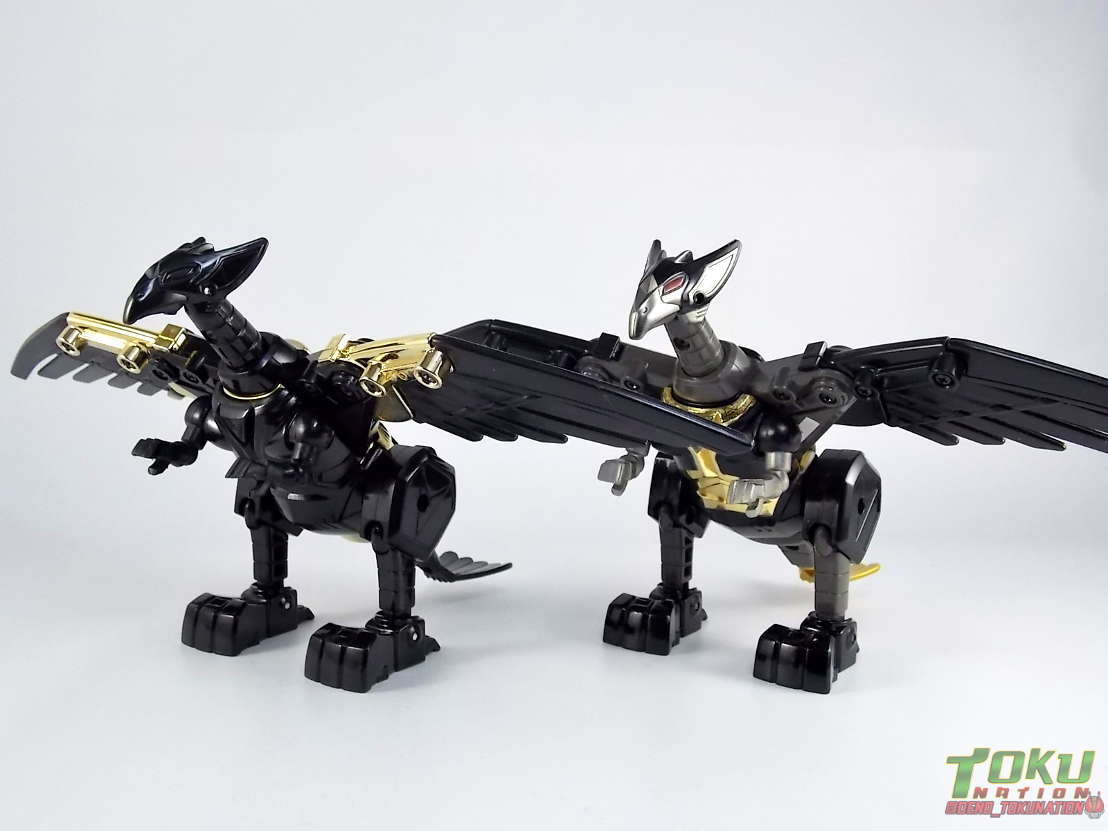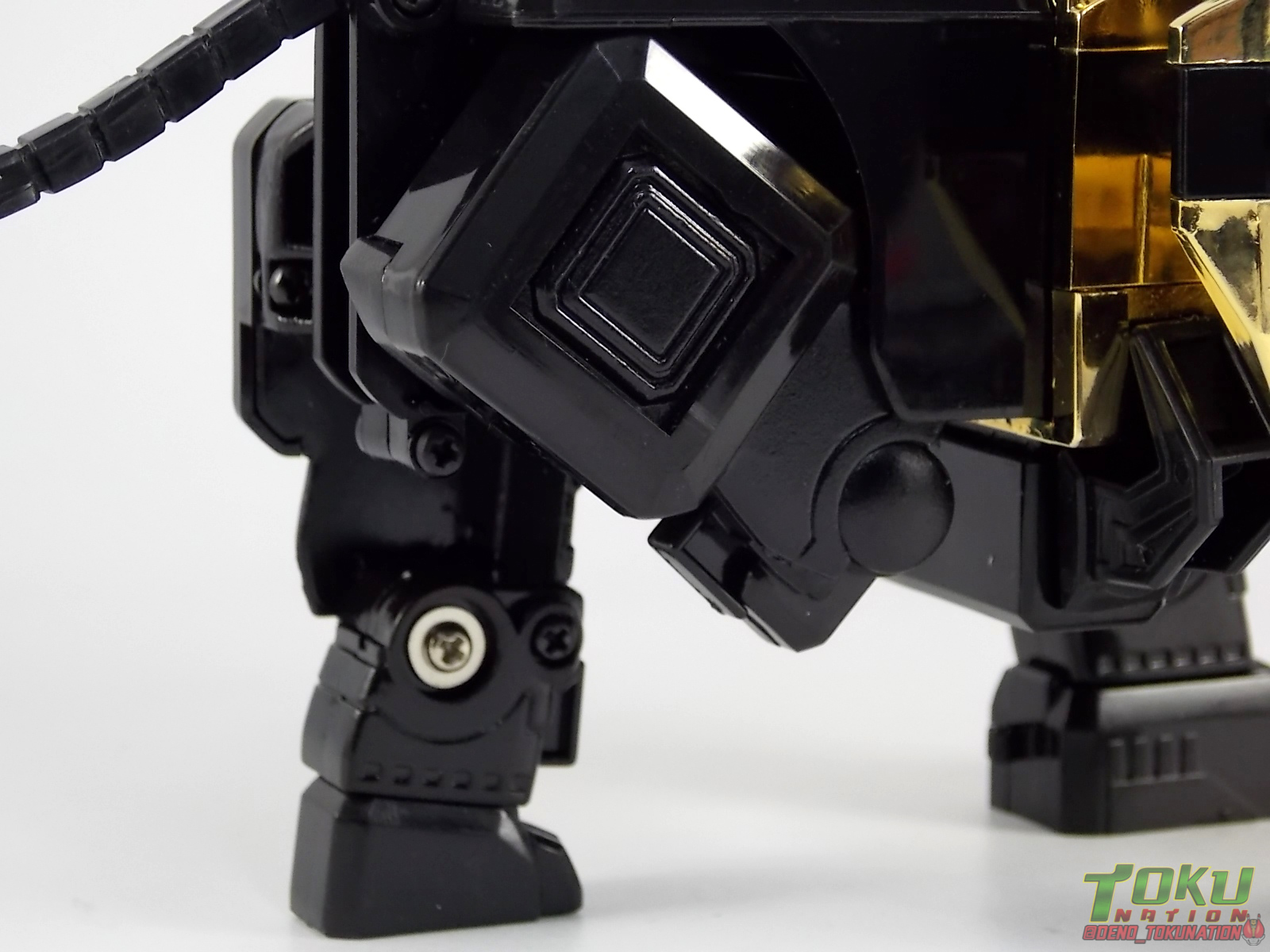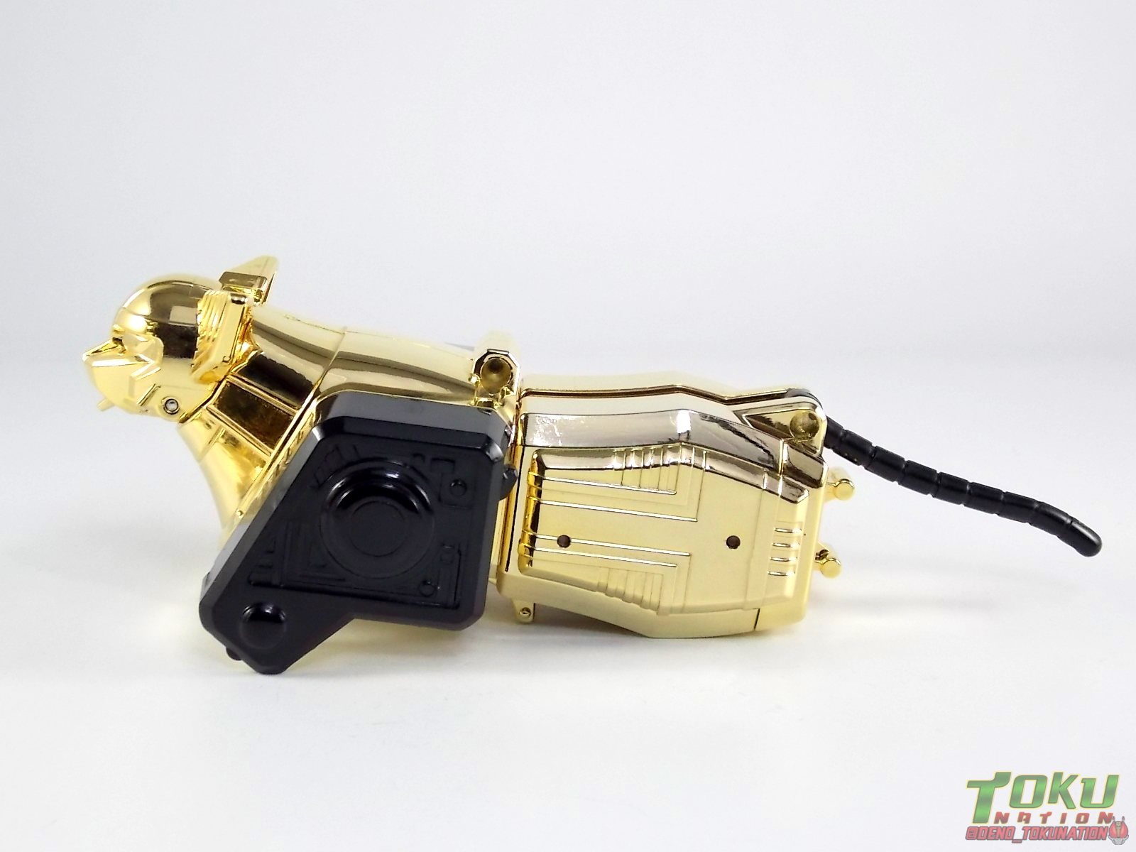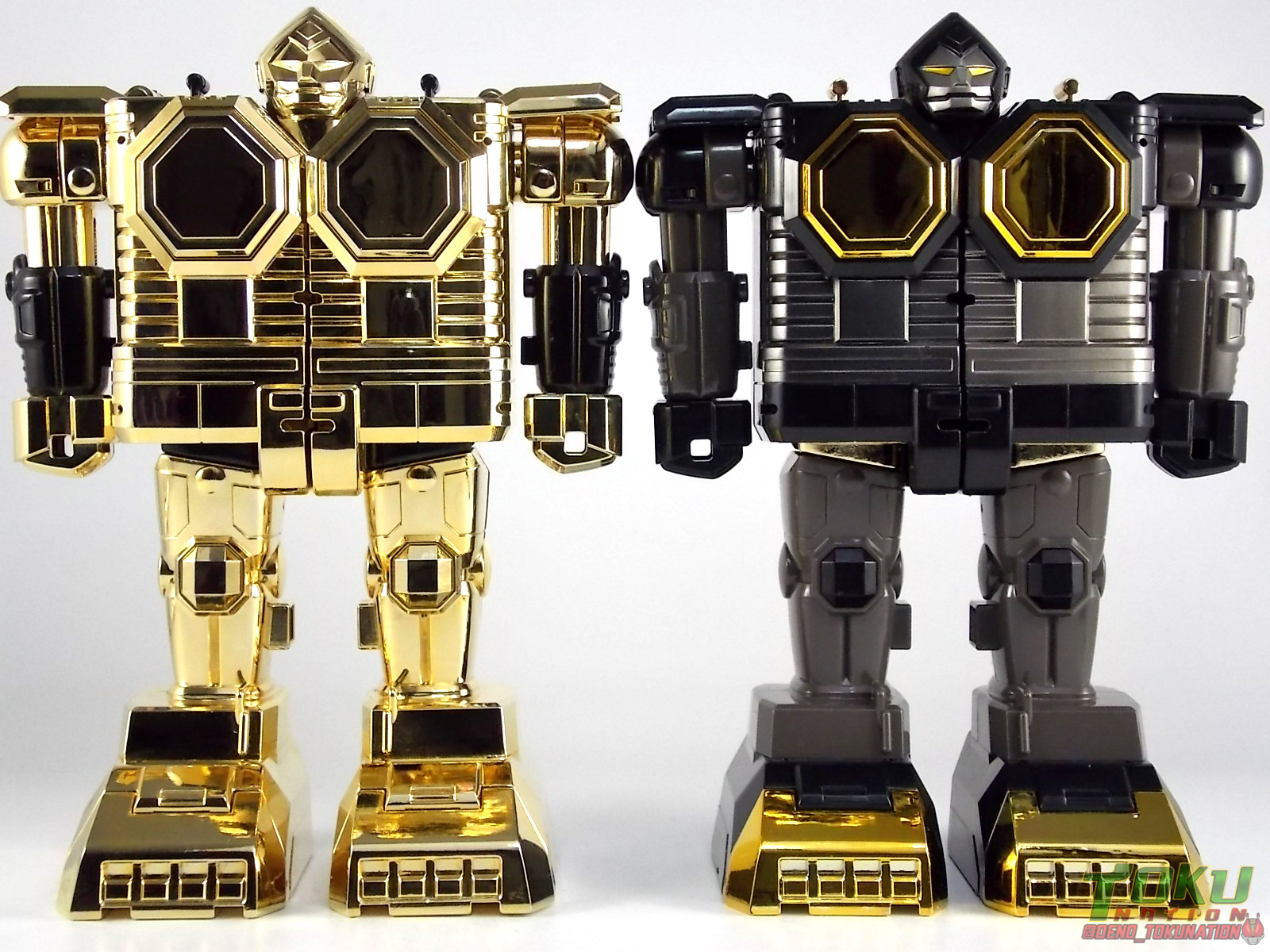 So what do we know about it? As far as anyone knows an extremely limited number of Gold Galaxy Megazords were produced. In similar fashion to Lucky Draw releases from Bandai Japan, this set exists only in double digit numbers. Originally thought to have only been manufactured in a run of less than 10, in recent years it's come to light that as many as 15+ of these gorgeous sets were produced. Originally sold as FAO Schwartz exclusives each Gold Galaxy Megazord included a Certificate for the buyer as "proof" of their ownership of the set. The one included with my Megazord is luckily still blank. After the initial FAO Schwartz run a handful of these Megazords were given away some years later as prizes. These sets rarely turn up for sale and often for staggering prices. Though there aren't many of them left in circulation, prices can range anywhere from about the $500 mark to upwards of $1500 and beyond in some earlier documented sales. I simply lucked into finding this set for an absurdly good deal. And I could not pass up the opportunity to share an incredible piece of Power Rangers & toy collecting history with the community. So here we are! Below you'll find a quick overview of each component and the combined form with photo comparisons to Black GingaiOh for reference. I hope you enjoy it! Packaging As with most special color releases in toy lines, the Gold Galaxy Megazord comes packaged in the same box as the original release, though with significantly altered colors. The entire packaging is done up in black & gray with gold accents. The stock images of the toys show them in their true black & gold colors but everything else is muted. Including the cross-sells for the Stratoforce & Centaurus Megazords on the side. The inner packaging is the exact same styrofoam tray as the normal Galaxy Megazord. The packaging as a whole is of course totally different from either of the original Japanese GingaiOh releases. The box and styrofoam were re-designed to be a few inches shorter and more compact for US store shelves. I have to mention that it's a little difficult to determine exactly which surfaces are true 14K Gold or vacuum metalized gold chrome. While undoubtedly the actual diecast components that are gold have the 14K plating, that my not necessarily be true for the rest of everything. Regardless the gold looks identical on nearly every surface where it's present. Components Gorilla We'll kick the review proper off with the Gorilla Galactabeast. In this rendition of the figure, nearly every visible surface is golden. The only portions of this figure not covered in gold in one form or another are the forearm and the top of the shoulder area. Even the underside of the feet where the Megazord fists are stored is golden. Now of course this presents a fairly wide spread fingerprint issue. LOL. Once transformed for its part of the Megazord combination you can see the exposed thighs are actually black as well as the small hinges the Gorilla arms rotate on. As you can see the Black Starbeast Gingarilla has a radically different color scheme with a much more vibrant gold, though much less of it. As with all the figures in these 2 sets, this pair couldn't be more different. Down to an including the shade of gold used. Condor Perhaps the most bland member of this team is the Condor Galactabeast. With no paint applications whatsoever this figure can look rather boring. The Gold applications are limited to the wing hinges, as well as the back plate and the underside of the bird beneath the black diecast chest plate. This gold is only visible when the Condor is used for it's crossbow mode. Between these two figures, the Black Starbeast Gingalcon is the clear winner with the additional paint apps, though it lacks somewhat in gold. At least on these two the gold chrome appears to be nearly the same color. Lion The Lion Galactabeast has a nice liberal gold chrome application applied to the section that becomes the Galaxy Megazord head as well as it's chest/shoulders. Because of the where the gold is located it can be difficult to transform the lion without getting a number of finger prints on it. Interestingly when transforming it to the chest component the chunk that slides forward to fill out the gap left by the head is mostly black with gold trim. More interesting is that the head features the only paint app in the entire set, the Galaxy Megazords' eyes are painted blue! Likely to make them distinguishable in the sea of gold chrome. The Lion itself could have benefited from some eye paint apps. Again the contrast between this piece and its' Black Starbeast Gingaleon counterpart is striking. Wildcat With the Wildat Galactabeast we come to the figure that relates most to it's Black GingaiOh counterpart, Black Starbeast Gingat. These two are practically inverses of one another. Where a part is golden on Wildcat, it's black or grey on Gingat. Tail, front hips, legs, head. It's just a really poignant comparison between these two. Wildcat indeed looks great with all that gold, it just needs a few paint apps to break things up. As is the only non-gold components at all are the toes, tail, and front hips. Even when you use the Gorilla's fist on it for combined mode those too are solid gold. Wolf The Wolf Galactabeast is basically identical to the Wildcat in design. And shares a similar type of inversion with it's Black Starbeast Gingaverick counterpart. This piece features gold and black applied in all the same places, has an identical transformation and fist as well as the aforementioned lack of paint apps. Galaxy Megazord When fully combined into the Gold Galaxy Megazord this set really shines. Literally. The black accents that do exist serve to break up the monotony of the color scheme decently enough and help unify the design more. Disappointingly the Galaxy Megazord Saber included with this set is only cast in an incredibly dull black plastic with no gold plating or paint at all. However this doesn't detra