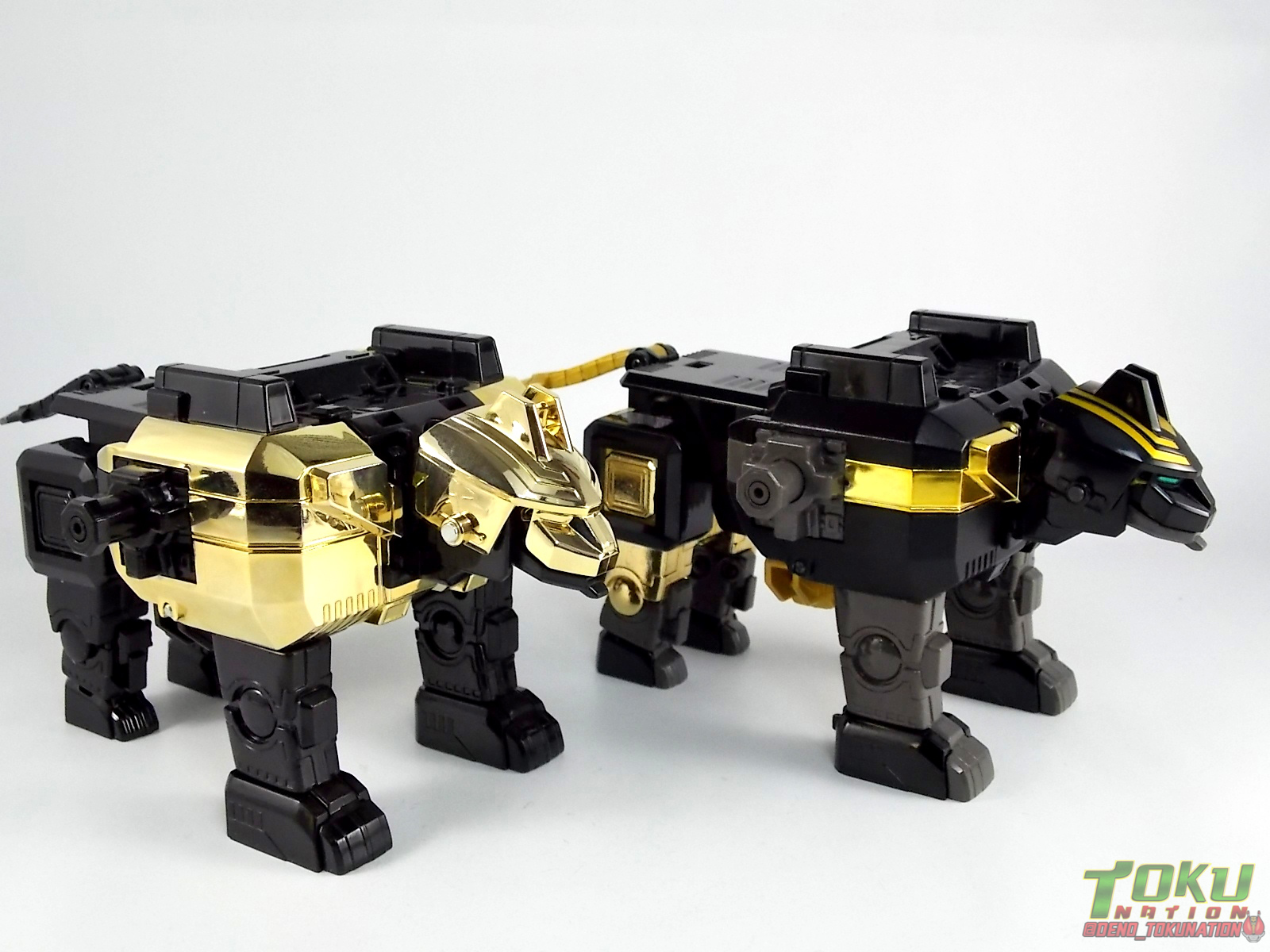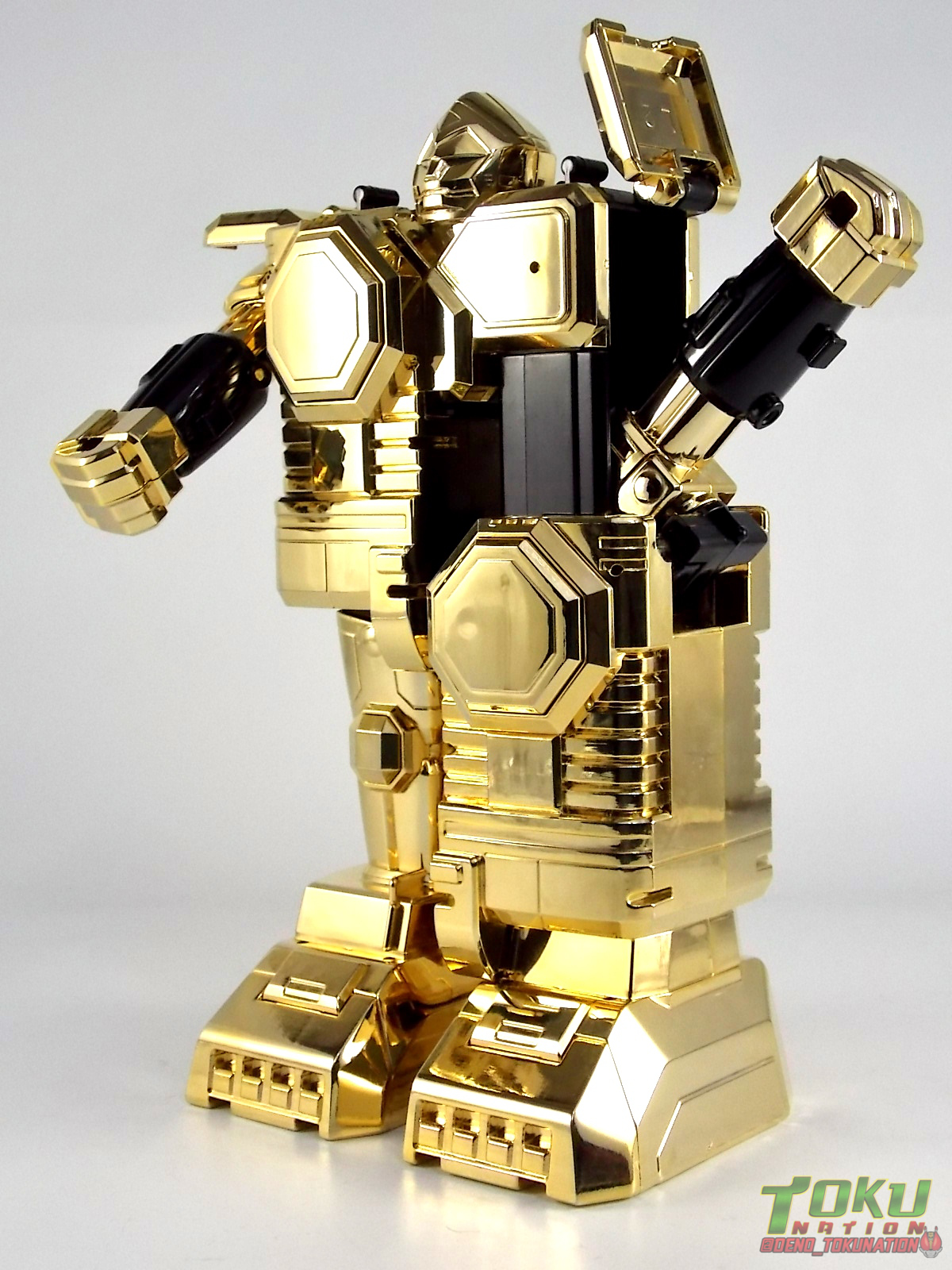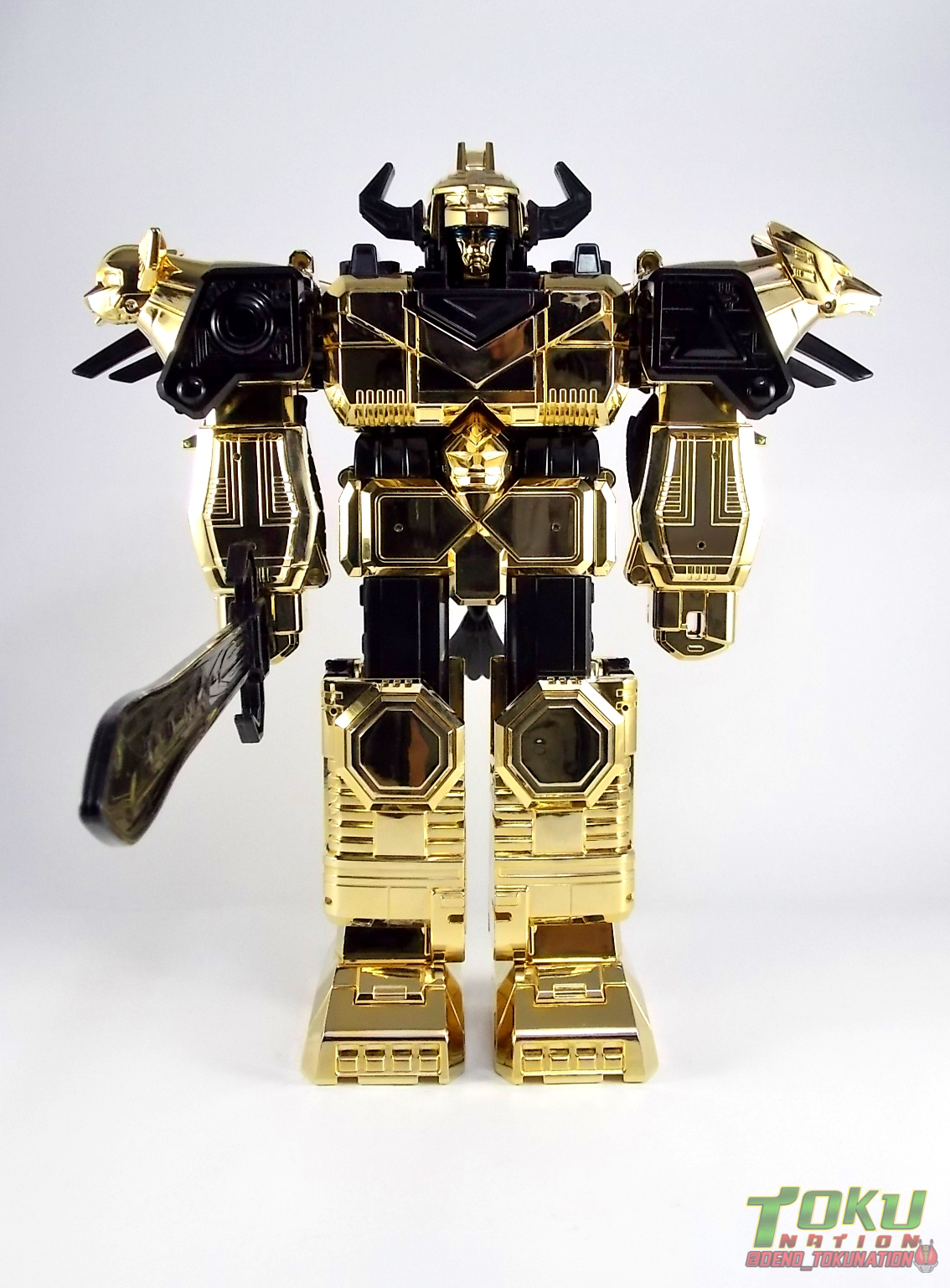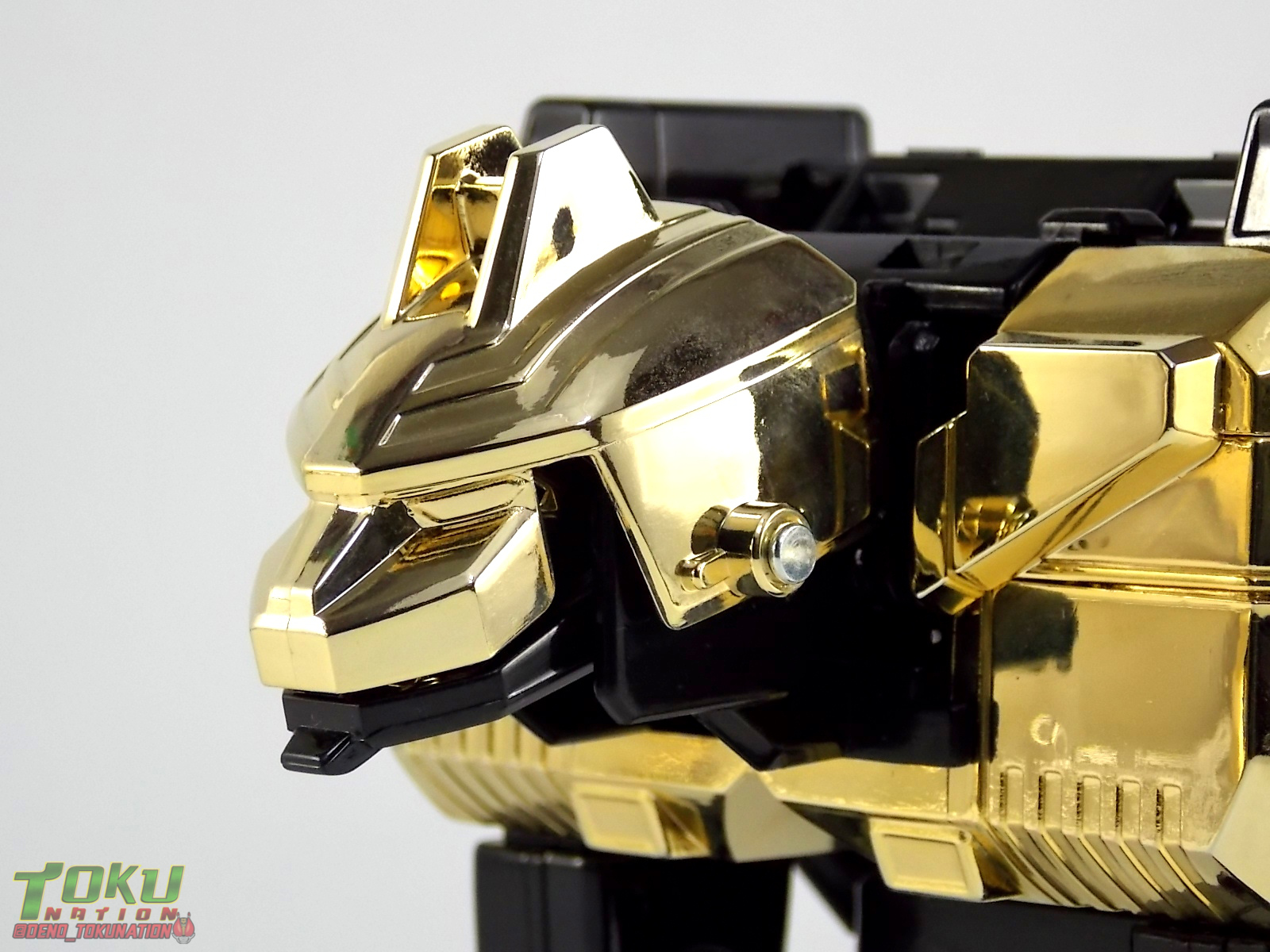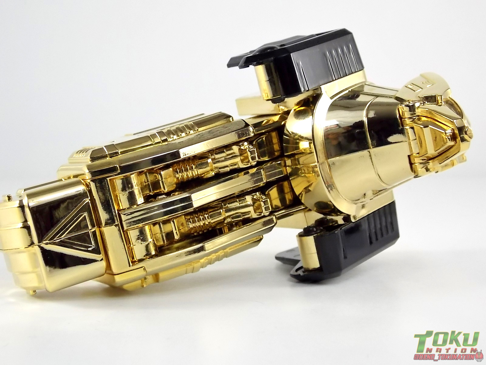 So what do we know about it? As far as anyone knows an extremely limited number of Gold Galaxy Megazords were produced. In similar fashion to Lucky Draw releases from Bandai Japan, this set exists only in double digit numbers. Originally thought to have only been manufactured in a run of less than 10, in recent years it's come to light that as many as 15+ of these gorgeous sets were produced. Originally sold as FAO Schwartz exclusives each Gold Galaxy Megazord included a Certificate for the buyer as "proof" of their ownership of the set. The one included with my Megazord is luckily still blank. After the initial FAO Schwartz run a handful of these Megazords were given away some years later as prizes. These sets rarely turn up for sale and often for staggering prices. Though there aren't many of them left in circulation, prices can range anywhere from about the $500 mark to upwards of $1500 and beyond in some earlier documented sales. I simply lucked into finding this set for an absurdly good deal. And I could not pass up the opportunity to share an incredible piece of Power Rangers & toy collecting history with the community. So here we are! Below you'll find a quick overview of each component and the combined form with photo comparisons to Black GingaiOh for reference. I hope you enjoy it! Packaging As with most special color releases in toy lines, the Gold Galaxy Megazord comes packaged in the same box as the original release, though with significantly altered colors. The entire packaging is done up in black & gray with gold accents. The stock images of the toys show them in their true black & gold colors but everything else is muted. Including the cross-sells for the Stratoforce & Centaurus Megazords on the side. The inner packaging is the exact same styrofoam tray as the normal Galaxy Megazord. The packaging as a whole is of course totally different from either of the original Japanese GingaiOh releases. The box and styrofoam were re-designed to be a few inches shorter and more compact for US store shelves. I have to mention that it's a little difficult to determine exactly which surfaces are true 14K Gold or vacuum metalized gold chrome. While undoubtedly the actual diecast components that are gold have the 14K plating, that my not necessarily be true for the rest of everything. Regardless the gold looks identical on nearly every surface where it's present. Components Gorilla We'll kick the review proper off with the Gorilla Galactabeast. In this rendition of the figure, nearly every visible surface is golden. The only portions of this figure not covered in gold in one form or another are the forearm and the top of the shoulder area. Even the underside of the feet where the Megazord fists are stored is golden. Now of course this presents a fairly wide spread fingerprint issue. LOL. Once transformed for its part of the Megazord combination you can see the exposed thighs are actually black as well as the small hinges the Gorilla arms rotate on. As you can see the Black Starbeast Gingarilla has a radically different color scheme with a much more vibrant gold, though much less of it. As with all the figures in these 2 sets, this pair couldn't be more different. Down to an including the shade of gold used. Condor Perhaps the most bland member of this team is the Condor Galactabeast. With no paint applications whatsoever this figure can look rather boring. The Gold applications are limited to the wing hinges, as well as the back plate and the underside of the bird beneath the black diecast chest plate. This gold is only visible when the Condor is used for it's crossbow mode. Between these two figures, the Black Starbeast Gingalcon is the clear winner with the additional paint apps, though it lacks somewhat in gold. At least on these two the gold chrome appears to be nearly the same color. Lion The Lion Galactabeast has a nice liberal gold chrome application applied to the section that becomes the Galaxy Megazord head as well as it's chest/shoulders. Because of the where the gold is located it can be difficult to transform the lion without getting a number of finger prints on it. Interestingly when transforming it to the chest component the chunk that slides forward to fill out the gap left by the head is mostly black with gold trim. More interesting is that the head features the only paint app in the entire set, the Galaxy Megazords' eyes are painted blue! Likely to make them distinguishable in the sea of gold chrome. The Lion itself could have benefited from some eye paint apps. Again the contrast between this piece and its' Black Starbeast Gingaleon counterpart is striking. Wildcat With the Wildat Galactabeast we come to the figure that relates most to it's Black GingaiOh counterpart, Black Starbeast Gingat. These two are practically inverses of one another. Where a part is golden on Wildcat, it's black or grey on Gingat. Tail, front hips, legs, head. It's just a really poignant comparison between these two. Wildcat indeed looks great with all that gold, it just needs a few paint apps to break things up. As is the only non-gold components at all are the toes, tail, and front hips. Even when you use the Gorilla's fist on it for combined mode those too are solid gold. Wolf The Wolf Galactabeast is basically identical to the Wildcat in design. And shares a similar type of inversion with it's Black Starbeast Gingaverick counterpart. This piece features gold and black applied in all the same places, has an identical transformation and fist as well as the aforementioned lack of paint apps. Galaxy Megazord When fully combined into the Gold Galaxy Megazord this set really shines. Literally. The black accents that do exist serve to break up the monotony of the color scheme decently enough and help unify the design more. Disappointingly the Galaxy Megazord Saber included with this set is only cast in an incredibly dull black plastic with no gold plating or paint at all. However this doesn't detra
