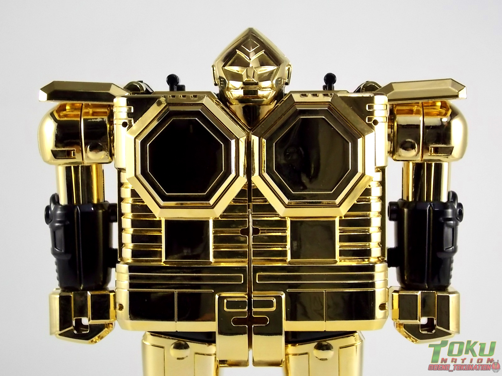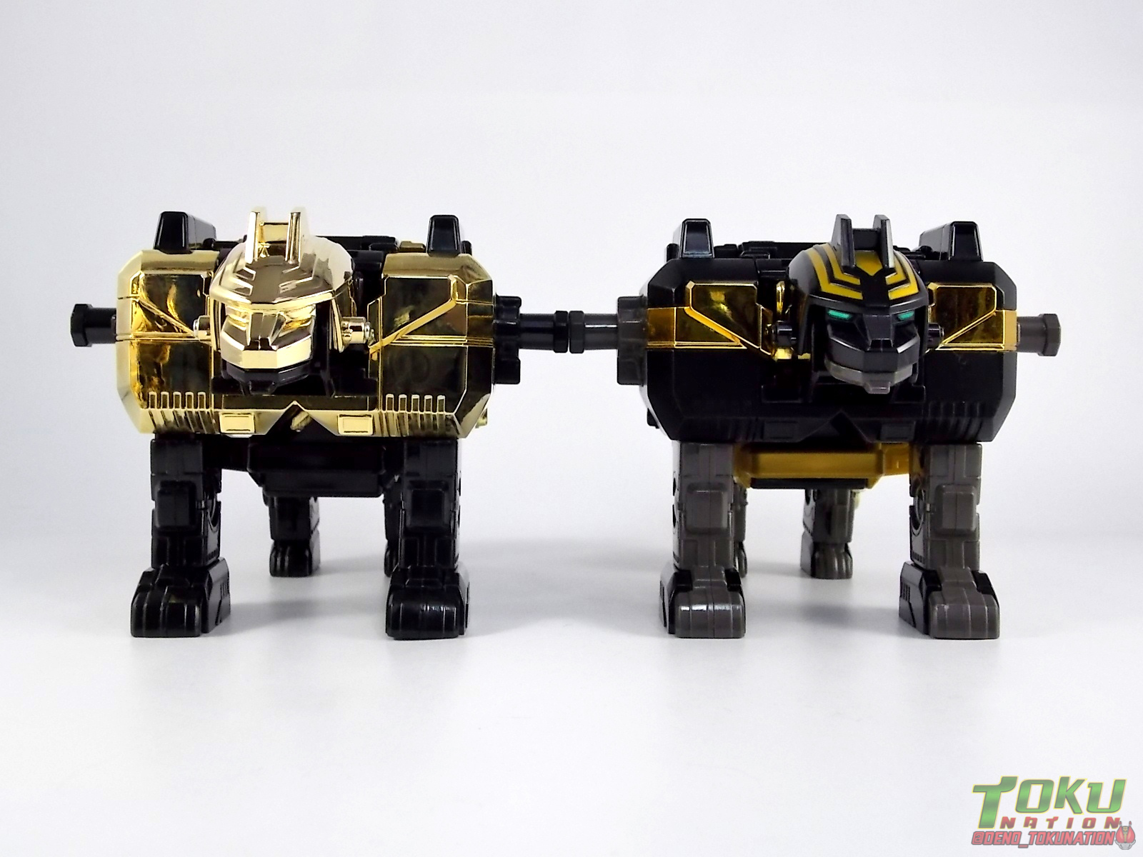 So what do we know about it? As far as anyone knows an extremely limited number of Gold Galaxy Megazords were produced. In similar fashion to Lucky Draw releases from Bandai Japan, this set exists only in double digit numbers. Originally thought to have only been manufactured in a run of less than 10, in recent years it's come to light that as many as 15+ of these gorgeous sets were produced. Originally sold as FAO Schwartz exclusives each Gold Galaxy Megazord included a Certificate for the buyer as "proof" of their ownership of the set. The one included with my Megazord is luckily still blank. After the initial FAO Schwartz run a handful of these Megazords were given away some years later as prizes. These sets rarely turn up for sale and often for staggering prices. Though there aren't many of them left in circulation, prices can range anywhere from about the $500 mark to upwards of $1500 and beyond in some earlier documented sales. I simply lucked into finding this set for an absurdly good deal. And I could not pass up the opportunity to share an incredible piece of Power Rangers & toy collecting history with the community. So here we are! Below you'll find a quick overview of each component and the combined form with photo comparisons to Black GingaiOh for reference. I hope you enjoy it! Packaging As with most special color releases in toy lines, the Gold Galaxy Megazord comes packaged in the same box as the original release, though with significantly altered colors. The entire packaging is done up in black & gray with gold accents. The stock images of the toys show them in their true black & gold colors but everything else is muted. Including the cross-sells for the Stratoforce & Centaurus Megazords on the side. The inner packaging is the exact same styrofoam tray as the normal Galaxy Megazord. The packaging as a whole is of course totally different from either of the original Japanese GingaiOh releases. The box and styrofoam were re-designed to be a few inches shorter and more compact for US store shelves. I have to mention that it's a little difficult to determine exactly which surfaces are true 14K Gold or vacuum metalized gold chrome. While undoubtedly the actual diecast components that are gold have the 14K plating, that my not necessarily be true for the rest of everything. Regardless the gold looks identical on nearly every surface where it's present. Components Gorilla We'll kick the review proper off with the Gorilla Galactabeast. In this rendition of the figure, nearly every visible surface is golden. The only portions of this figure not covered in gold in one form or another are the forearm and the top of the shoulder area. Even the underside of the feet where the Megazord fists are stored is golden. Now of course this presents a fairly wide spread fingerprint issue. LOL. Once transformed for its part of the Megazord combination you can see the exposed thighs are actually black as well as the small hinges the Gorilla arms rotate on. As you can see the Black Starbeast Gingarilla has a radically different color scheme with a much more vibrant gold, though much less of it. As with all the figures in these 2 sets, this pair couldn't be more different. Down to an including the shade of gold used. Condor Perhaps the most bland member of this team is the Condor Galactabeast. With no paint applications whatsoever this figure can look rather boring. The Gold applications are limited to the wing hinges, as well as the back plate and the underside of the bird beneath the black diecast chest plate. This gold is only visible when the Condor is used for it's crossbow mode. Between these two figures, the Black Starbeast Gingalcon is the clear winner with the additional paint apps, though it lacks somewhat in gold. At least on these two the gold chrome appears to be nearly the same color. Lion The Lion Galactabeast has a nice liberal gold chrome application applied to the section that becomes the Galaxy Megazord head as well as it's chest/shoulders. Because of the where the gold is located it can be difficult to transform the lion without getting a number of finger prints on it. Interestingly when transforming it to the chest component the chunk that slides forward to fill out the gap left by the head is mostly black with gold trim. More interesting is that the head features the only paint app in the entire set, the Galaxy Megazords' eyes are painted blue! Likely to make them distinguishable in the sea of gold chrome. The Lion itself could have benefited from some eye paint apps. Again the contrast between this piece and its' Black Starbeast Gingaleon counterpart is striking. Wildcat With the Wildat Galactabeast we come to the figure that relates most to it's Black GingaiOh counterpart, Black Starbeast Gingat. These two are practically inverses of one another. Where a part is golden on Wildcat, it's black or grey on Gingat. Tail, front hips, legs, head. It's just a really poignant comparison between these two. Wildcat indeed looks great with all that gold, it just needs a few paint apps to break things up. As is the only non-gold components at all are the toes, tail, and front hips. Even when you use the Gorilla's fist on it for combined mode those too are solid gold. Wolf The Wolf Galactabeast is basically identical to the Wildcat in design. And shares a similar type of inversion with it's Black Starbeast Gingaverick counterpart. This piece features gold and black applied in all the same places, has an identical transformation and fist as well as the aforementioned lack of paint apps. Galaxy Megazord When fully combined into the Gold Galaxy Megazord this set really shines. Literally. The black accents that do exist serve to break up the monotony of the color scheme decently enough and help unify the design more. Disappointingly the Galaxy Megazord Saber included with this set is only cast in an incredibly dull black plastic with no gold plating or paint at all. However this doesn't detra