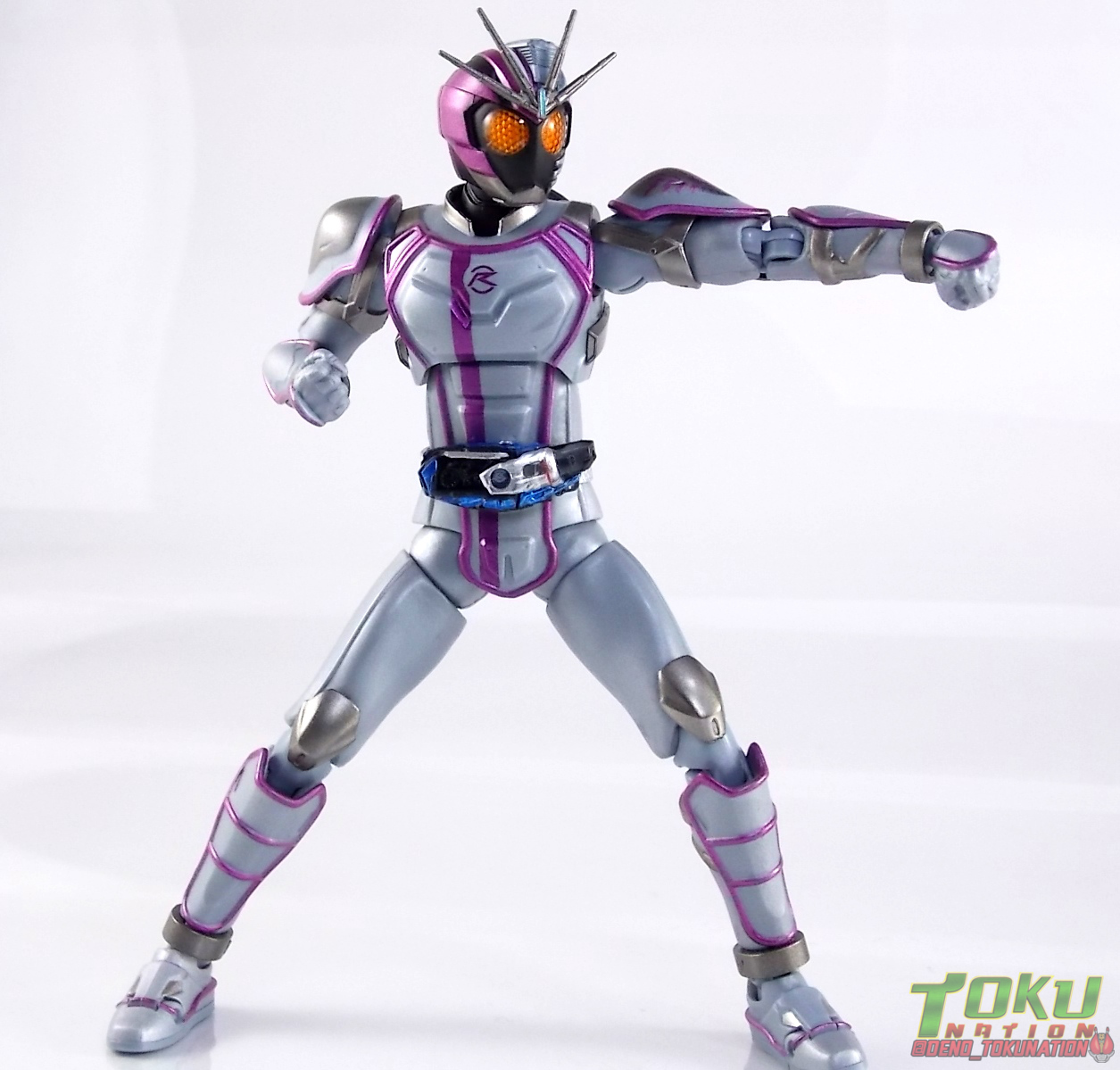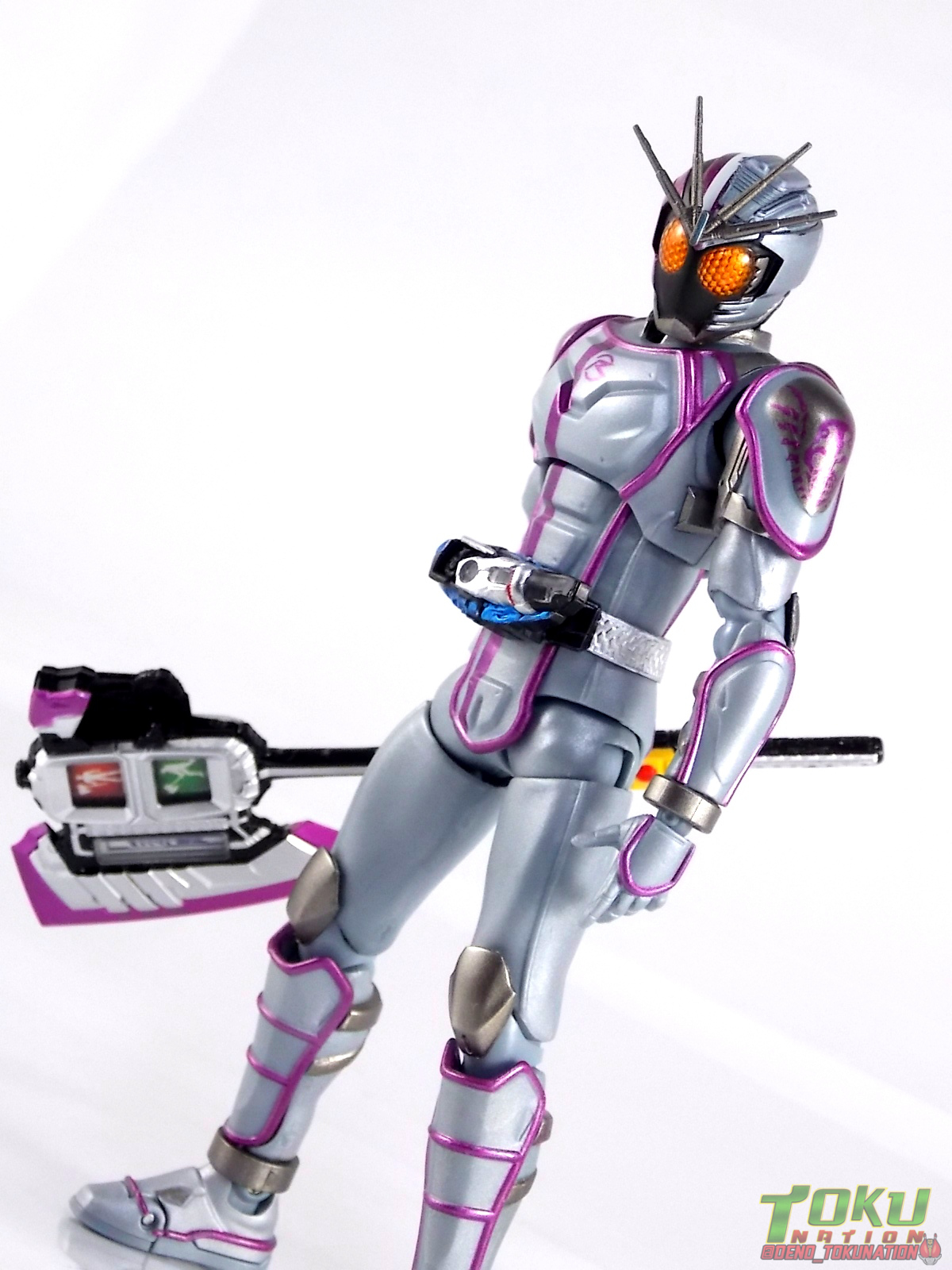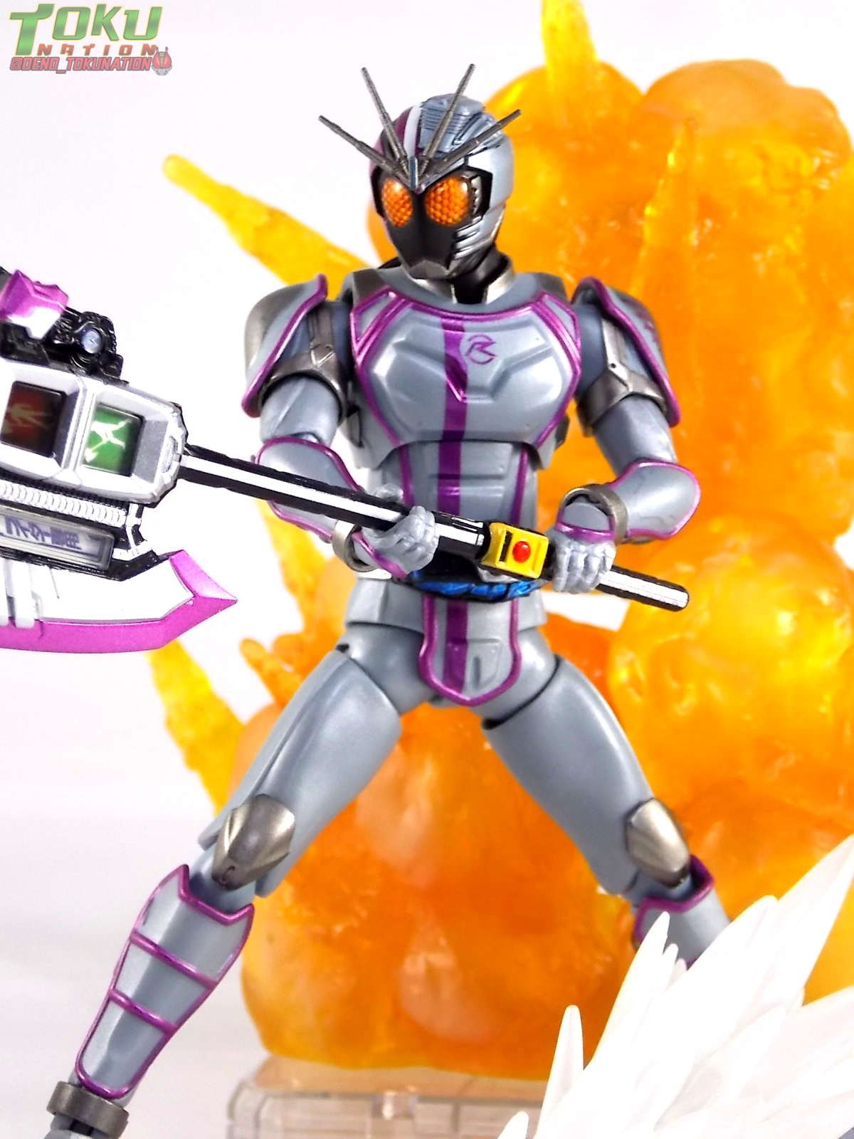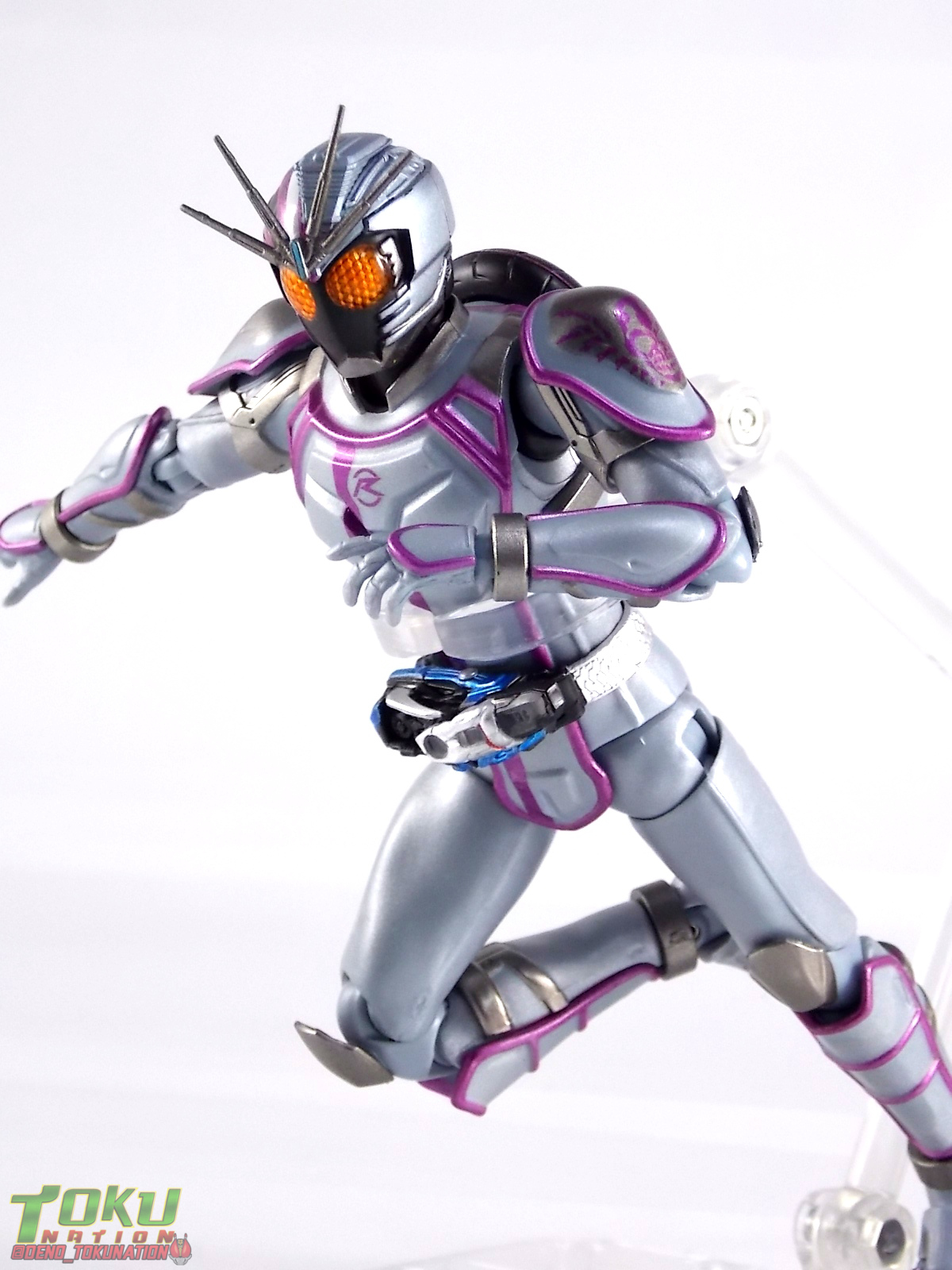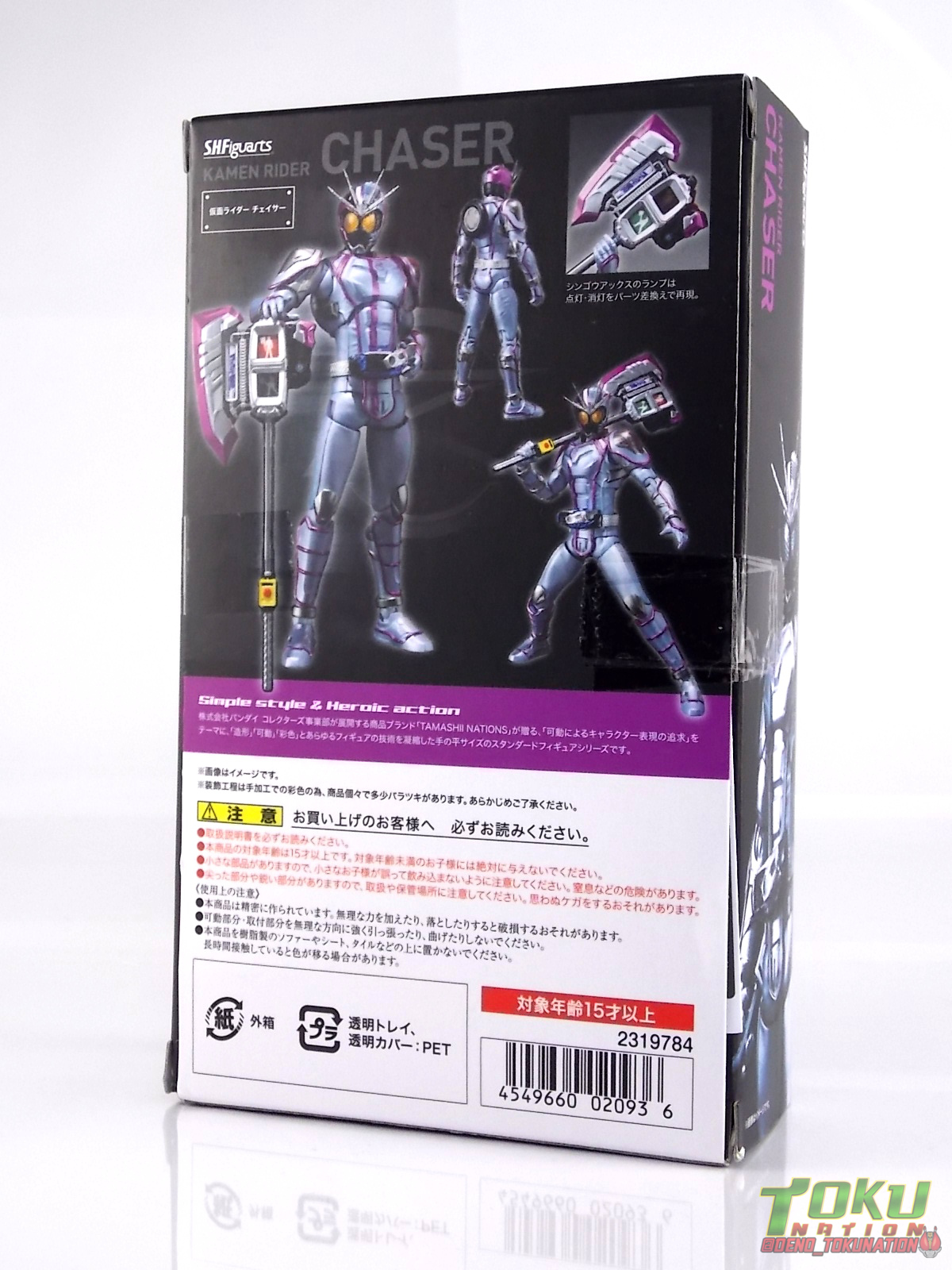 Kamen Rider Drive figuarts releases have slowly but steadily been making their way out via the Tamashii Web Shop and todays' gallery brings us to one of the final (so far) scheduled releases. The next releases coming up will be Kamen Rider Drive Chou Deadheat, & Kamen Rider Chaser Mach but for now we're going to take a look at the series' 3rd heroic rider. Our gallery today focuses on S.H. Figuarts Kamen Rider Chaser! Packaging Business as usual once again! Nothing new to report with the now standard Drive release packaging. Just some epic shots of Chaser himself on the box. Otherwise we have seen this numerous times over up til now. Main Figure As with the other 2 main riders from this series (Drive & Mach) Chaser is an entirely new mold. And thankfully this one is right at the top of the list with Drive Type Speed for excellence. The nice thing about less bulky and more acrobatic suits is they just don't have all that bulk to get in their way. Much like Drive, Chaser has fully unrestricted hips. However I do need to mention that because of the sort of safety pad design of the shin armor the feet cant quite tilt back as far as I'd like, and the toes have almost zero wiggle in them. But Chaser can more than strike a pose even with these faults. His arms are just about perfect with nice easy to work around shoulder armor, the Chaser symbol on his left shoulder looks even better on this mold than it did on Mashin Chaser. As far as the upper body goes we see more of that glorious silver-ish blue armor with purple accenting. The torso & waist are looks great, including the Mach Driver & the new for this release Chaser Signal Bike. I wish the torso cut was a little bit more free for movement, but Chaser is still fairly nimble. The main event is of course that wonderful asymmetrical head. This piece emulates fully the asymmetry of the Mashin Chaser form. The orange compound eyes which are really striking and appear to be accurate to the altered eyes seen around episode 34 of the series, look like they were hiding under the Mashin Chaser mask all along. The headcrest looks like a natural extension and duplication of what was present on Mashin Chaser as well. The headcrest (as mentioned in the accessories section below) is a separate piece entirely. Now perhaps the only thing I can say bugs me about this release (other than the previously mentioned headcrest) is that Chaser feels just a bit small. Not in any real measurable way, but just looking at him next Drive & Mach he doesn't seem very big or bulky. Granted his suit is much more streamlined and basic by comparison, no goofy tire bisecting the chest or attached to the shoulder, he just features the sleek Wheeler Dynamics on his back. But he does seem just a tad small. This seems more apparent when he's positioned on the S.H. Figuarts Ride Chaser. But overall this really is just a superb figure. Chaser features all the best elements of the Drive line with only minor drawbacks. Accessories Chaser comes with probably the most appropriate selection of accessories he could have (aside from one notable exception). Chaser includes: 1 - antennae/crest. Oddly Bandai has opted to package Chaser's head crest as a separate piece. Granted the part is very thin and I imagine could break easily during shipping, but they've never really done this before with a rider figuart. Also since the piece is so thin and the port it plugs into is so tight, it makes for a pretty scary experience plugging it in. I suggest some healthy caution when doing so. 2 - sets of additional hands. That includes 2 identical open palm expressive hands, and 2 holding things hands. Weirdly the holding things hands are molded in such a way that they are clearly intended to hold a gun or a weapon with a trigger rather than the included ax. More on that below. 1 - Shingou Axe (Signal Axe). Chaser's signature weapon and all around fun plot device for battles. The Signal Axe looks pretty spot on to it's show counterpart & is just the right size to look like a pretty fearsome weapon. It can also accept Signal Bikes like the one included in Chaser's Mach Driver thanks to a small port adjacent to the signals. My 2 gripes with the ax however are that the silver paint used on the handle rubs off very easily, and that the signals themselves are labels. In a stupidly similar fashion to how Gaim Kiwami Arms had a label inserted into it's chest to replicate that detail but was crinkled and damaged on many, my Chaser clearly suffers a similar problem. The "stop" label appears to have been applied more than once, incorrectly, and has creases resulting from it. Get your act together Bandai, collector products should not suffer from this. 1 - signal effect part. A replacement window for the E-Condition Lamp that signifies the change from the "wait" & "go ahead" signals during Chasers' Full Throttle attack, Across Breaker. This piece replaces the clear plastic window on the ax with one darkened half that can be used over either signal. It's a really a nice piece to have included. Though removing the faceplate on the ax can be dicey at times. As I mentioned above there is a notable exception from this set, Chaser's Break Gunner. A holdover from his prior Mashin Chaser form, this item was maintained by Chaser as a secondary weapon in show. It was used numerous times, most often while waiting for the Signal Axe to change signals. But it was used very often. It's exclusion here is baffling. The accessory exists already, it would have cost next to nothing to include it with this figure. It's just baffling. Without it Chaser feels a little incomplete. You can always borrow it from your S.H. Figuarts Mashin Chaser. But ultimately that will leave him without a Gunner as well. What makes this all the more idiotic is that Chasers' "holding things" hands are literally molded to hold a gun! They aren't even the proper shape to hold the ax in a natural way, they are specifically molded to hold a weapon with a trigge