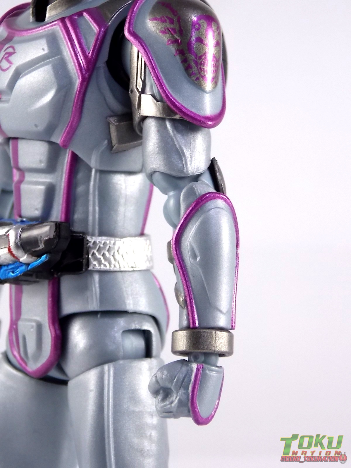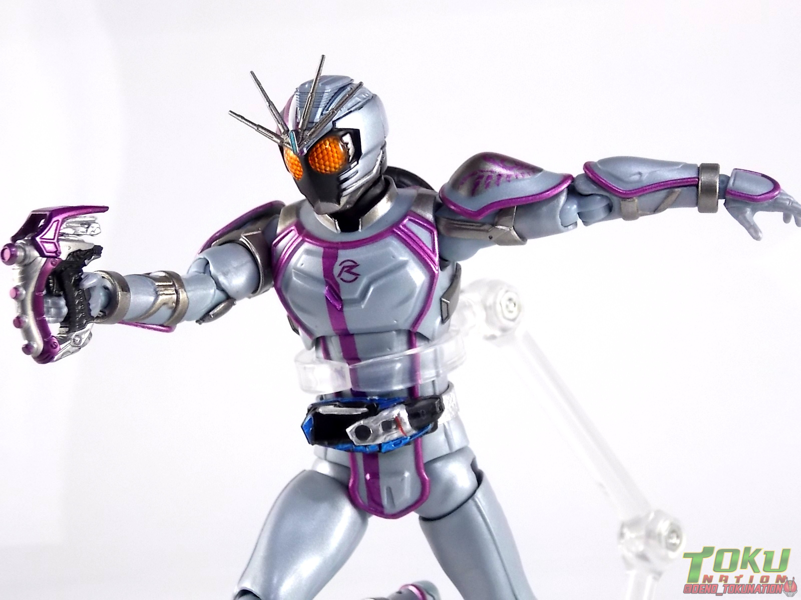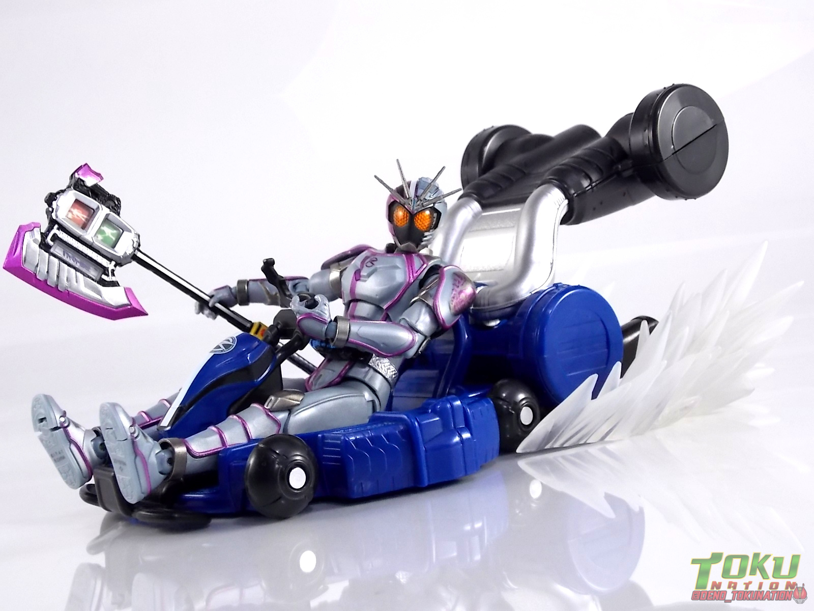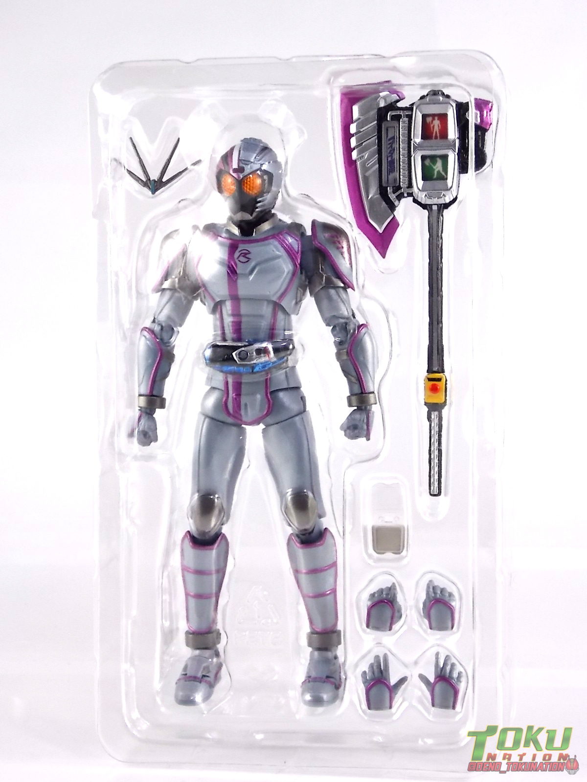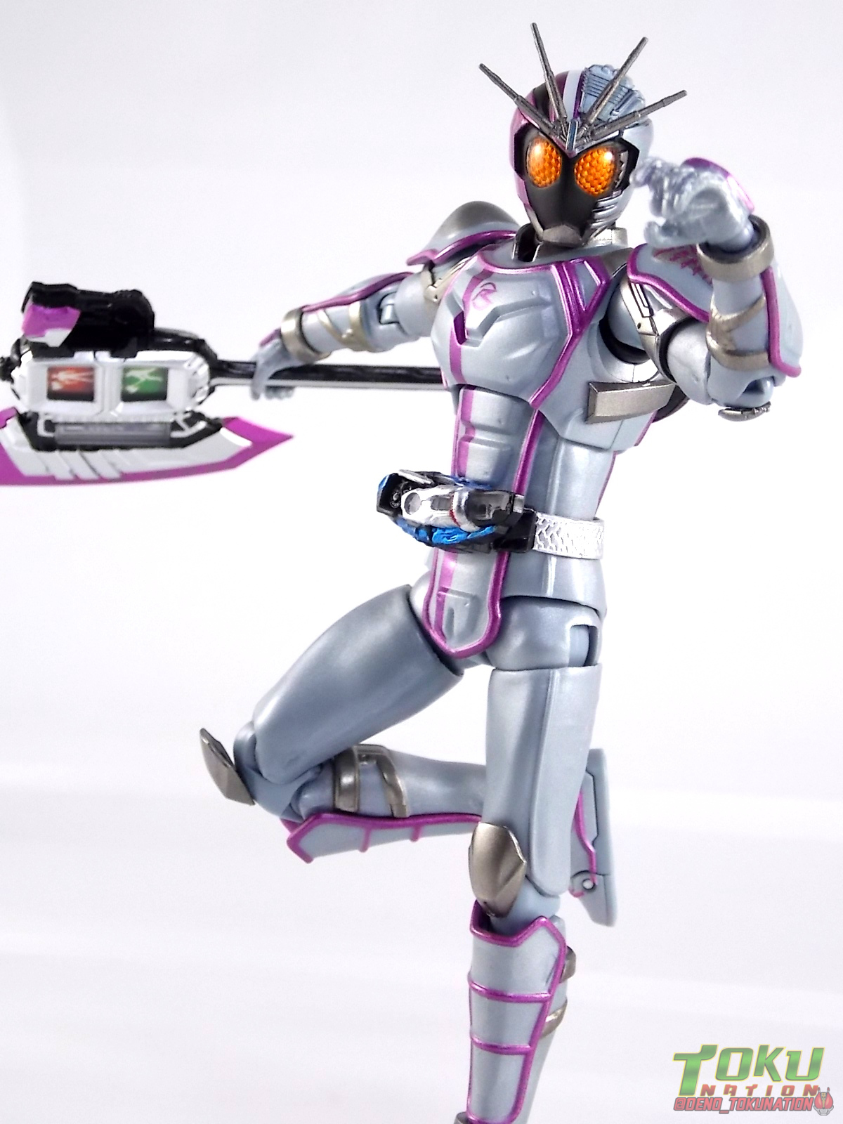 Kamen Rider Drive figuarts releases have slowly but steadily been making their way out via the Tamashii Web Shop and todays' gallery brings us to one of the final (so far) scheduled releases. The next releases coming up will be Kamen Rider Drive Chou Deadheat, & Kamen Rider Chaser Mach but for now we're going to take a look at the series' 3rd heroic rider. Our gallery today focuses on S.H. Figuarts Kamen Rider Chaser! Packaging Business as usual once again! Nothing new to report with the now standard Drive release packaging. Just some epic shots of Chaser himself on the box. Otherwise we have seen this numerous times over up til now. Main Figure As with the other 2 main riders from this series (Drive & Mach) Chaser is an entirely new mold. And thankfully this one is right at the top of the list with Drive Type Speed for excellence. The nice thing about less bulky and more acrobatic suits is they just don't have all that bulk to get in their way. Much like Drive, Chaser has fully unrestricted hips. However I do need to mention that because of the sort of safety pad design of the shin armor the feet cant quite tilt back as far as I'd like, and the toes have almost zero wiggle in them. But Chaser can more than strike a pose even with these faults. His arms are just about perfect with nice easy to work around shoulder armor, the Chaser symbol on his left shoulder looks even better on this mold than it did on Mashin Chaser. As far as the upper body goes we see more of that glorious silver-ish blue armor with purple accenting. The torso & waist are looks great, including the Mach Driver & the new for this release Chaser Signal Bike. I wish the torso cut was a little bit more free for movement, but Chaser is still fairly nimble. The main event is of course that wonderful asymmetrical head. This piece emulates fully the asymmetry of the Mashin Chaser form. The orange compound eyes which are really striking and appear to be accurate to the altered eyes seen around episode 34 of the series, look like they were hiding under the Mashin Chaser mask all along. The headcrest looks like a natural extension and duplication of what was present on Mashin Chaser as well. The headcrest (as mentioned in the accessories section below) is a separate piece entirely. Now perhaps the only thing I can say bugs me about this release (other than the previously mentioned headcrest) is that Chaser feels just a bit small. Not in any real measurable way, but just looking at him next Drive & Mach he doesn't seem very big or bulky. Granted his suit is much more streamlined and basic by comparison, no goofy tire bisecting the chest or attached to the shoulder, he just features the sleek Wheeler Dynamics on his back. But he does seem just a tad small. This seems more apparent when he's positioned on the S.H. Figuarts Ride Chaser. But overall this really is just a superb figure. Chaser features all the best elements of the Drive line with only minor drawbacks. Accessories Chaser comes with probably the most appropriate selection of accessories he could have (aside from one notable exception). Chaser includes: 1 - antennae/crest. Oddly Bandai has opted to package Chaser's head crest as a separate piece. Granted the part is very thin and I imagine could break easily during shipping, but they've never really done this before with a rider figuart. Also since the piece is so thin and the port it plugs into is so tight, it makes for a pretty scary experience plugging it in. I suggest some healthy caution when doing so. 2 - sets of additional hands. That includes 2 identical open palm expressive hands, and 2 holding things hands. Weirdly the holding things hands are molded in such a way that they are clearly intended to hold a gun or a weapon with a trigger rather than the included ax. More on that below. 1 - Shingou Axe (Signal Axe). Chaser's signature weapon and all around fun plot device for battles. The Signal Axe looks pretty spot on to it's show counterpart & is just the right size to look like a pretty fearsome weapon. It can also accept Signal Bikes like the one included in Chaser's Mach Driver thanks to a small port adjacent to the signals. My 2 gripes with the ax however are that the silver paint used on the handle rubs off very easily, and that the signals themselves are labels. In a stupidly similar fashion to how Gaim Kiwami Arms had a label inserted into it's chest to replicate that detail but was crinkled and damaged on many, my Chaser clearly suffers a similar problem. The "stop" label appears to have been applied more than once, incorrectly, and has creases resulting from it. Get your act together Bandai, collector products should not suffer from this. 1 - signal effect part. A replacement window for the E-Condition Lamp that signifies the change from the "wait" & "go ahead" signals during Chasers' Full Throttle attack, Across Breaker. This piece replaces the clear plastic window on the ax with one darkened half that can be used over either signal. It's a really a nice piece to have included. Though removing the faceplate on the ax can be dicey at times. As I mentioned above there is a notable exception from this set, Chaser's Break Gunner. A holdover from his prior Mashin Chaser form, this item was maintained by Chaser as a secondary weapon in show. It was used numerous times, most often while waiting for the Signal Axe to change signals. But it was used very often. It's exclusion here is baffling. The accessory exists already, it would have cost next to nothing to include it with this figure. It's just baffling. Without it Chaser feels a little incomplete. You can always borrow it from your S.H. Figuarts Mashin Chaser. But ultimately that will leave him without a Gunner as well. What makes this all the more idiotic is that Chasers' "holding things" hands are literally molded to hold a gun! They aren't even the proper shape to hold the ax in a natural way, they are specifically molded to hold a weapon with a trigge