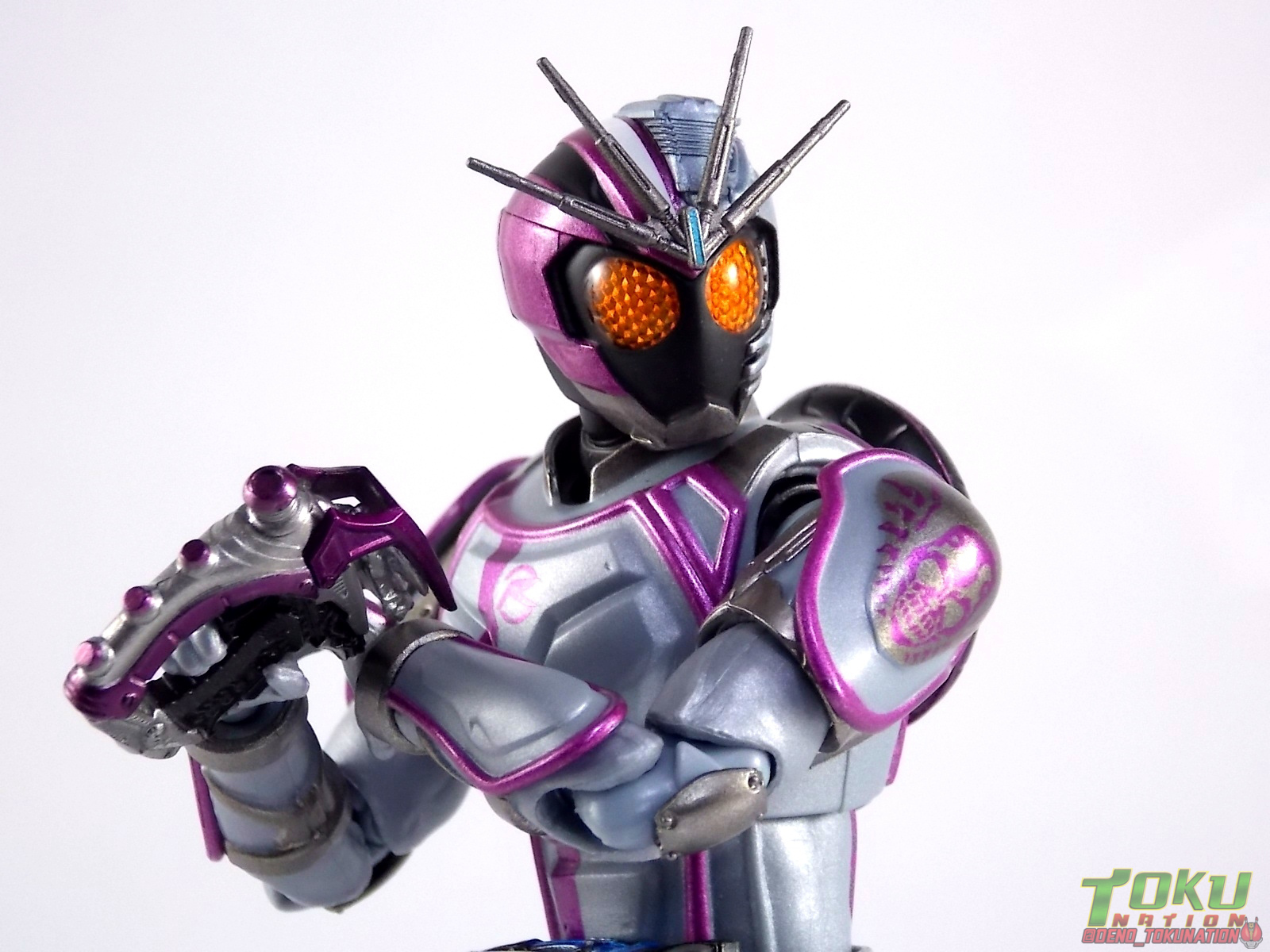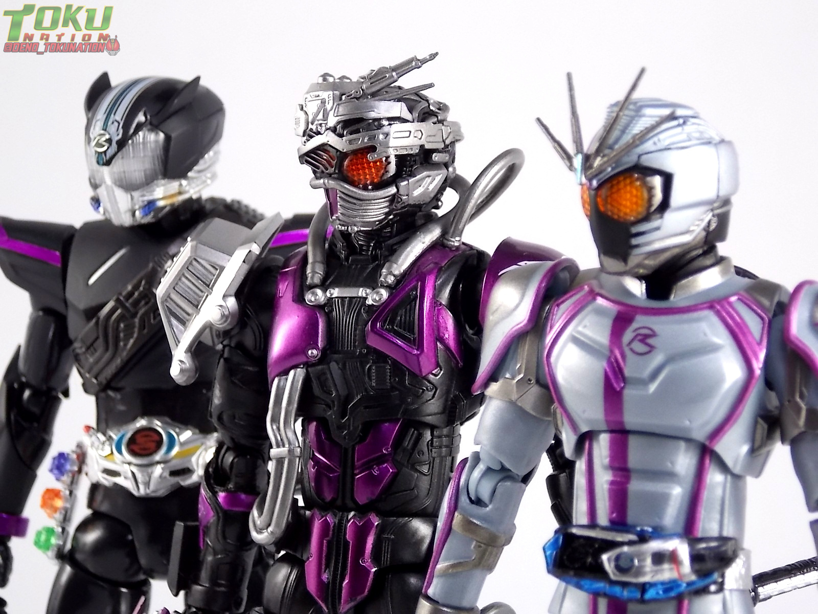 Kamen Rider Drive figuarts releases have slowly but steadily been making their way out via the Tamashii Web Shop and todays' gallery brings us to one of the final (so far) scheduled releases. The next releases coming up will be Kamen Rider Drive Chou Deadheat, & Kamen Rider Chaser Mach but for now we're going to take a look at the series' 3rd heroic rider. Our gallery today focuses on S.H. Figuarts Kamen Rider Chaser! Packaging Business as usual once again! Nothing new to report with the now standard Drive release packaging. Just some epic shots of Chaser himself on the box. Otherwise we have seen this numerous times over up til now. Main Figure As with the other 2 main riders from this series (Drive & Mach) Chaser is an entirely new mold. And thankfully this one is right at the top of the list with Drive Type Speed for excellence. The nice thing about less bulky and more acrobatic suits is they just don't have all that bulk to get in their way. Much like Drive, Chaser has fully unrestricted hips. However I do need to mention that because of the sort of safety pad design of the shin armor the feet cant quite tilt back as far as I'd like, and the toes have almost zero wiggle in them. But Chaser can more than strike a pose even with these faults. His arms are just about perfect with nice easy to work around shoulder armor, the Chaser symbol on his left shoulder looks even better on this mold than it did on Mashin Chaser. As far as the upper body goes we see more of that glorious silver-ish blue armor with purple accenting. The torso & waist are looks great, including the Mach Driver & the new for this release Chaser Signal Bike. I wish the torso cut was a little bit more free for movement, but Chaser is still fairly nimble. The main event is of course that wonderful asymmetrical head. This piece emulates fully the asymmetry of the Mashin Chaser form. The orange compound eyes which are really striking and appear to be accurate to the altered eyes seen around episode 34 of the series, look like they were hiding under the Mashin Chaser mask all along. The headcrest looks like a natural extension and duplication of what was present on Mashin Chaser as well. The headcrest (as mentioned in the accessories section below) is a separate piece entirely. Now perhaps the only thing I can say bugs me about this release (other than the previously mentioned headcrest) is that Chaser feels just a bit small. Not in any real measurable way, but just looking at him next Drive & Mach he doesn't seem very big or bulky. Granted his suit is much more streamlined and basic by comparison, no goofy tire bisecting the chest or attached to the shoulder, he just features the sleek Wheeler Dynamics on his back. But he does seem just a tad small. This seems more apparent when he's positioned on the S.H. Figuarts Ride Chaser. But overall this really is just a superb figure. Chaser features all the best elements of the Drive line with only minor drawbacks. Accessories Chaser comes with probably the most appropriate selection of accessories he could have (aside from one notable exception). Chaser includes: 1 - antennae/crest. Oddly Bandai has opted to package Chaser's head crest as a separate piece. Granted the part is very thin and I imagine could break easily during shipping, but they've never really done this before with a rider figuart. Also since the piece is so thin and the port it plugs into is so tight, it makes for a pretty scary experience plugging it in. I suggest some healthy caution when doing so. 2 - sets of additional hands. That includes 2 identical open palm expressive hands, and 2 holding things hands. Weirdly the holding things hands are molded in such a way that they are clearly intended to hold a gun or a weapon with a trigger rather than the included ax. More on that below. 1 - Shingou Axe (Signal Axe). Chaser's signature weapon and all around fun plot device for battles. The Signal Axe looks pretty spot on to it's show counterpart & is just the right size to look like a pretty fearsome weapon. It can also accept Signal Bikes like the one included in Chaser's Mach Driver thanks to a small port adjacent to the signals. My 2 gripes with the ax however are that the silver paint used on the handle rubs off very easily, and that the signals themselves are labels. In a stupidly similar fashion to how Gaim Kiwami Arms had a label inserted into it's chest to replicate that detail but was crinkled and damaged on many, my Chaser clearly suffers a similar problem. The "stop" label appears to have been applied more than once, incorrectly, and has creases resulting from it. Get your act together Bandai, collector products should not suffer from this. 1 - signal effect part. A replacement window for the E-Condition Lamp that signifies the change from the "wait" & "go ahead" signals during Chasers' Full Throttle attack, Across Breaker. This piece replaces the clear plastic window on the ax with one darkened half that can be used over either signal. It's a really a nice piece to have included. Though removing the faceplate on the ax can be dicey at times. As I mentioned above there is a notable exception from this set, Chaser's Break Gunner. A holdover from his prior Mashin Chaser form, this item was maintained by Chaser as a secondary weapon in show. It was used numerous times, most often while waiting for the Signal Axe to change signals. But it was used very often. It's exclusion here is baffling. The accessory exists already, it would have cost next to nothing to include it with this figure. It's just baffling. Without it Chaser feels a little incomplete. You can always borrow it from your S.H. Figuarts Mashin Chaser. But ultimately that will leave him without a Gunner as well. What makes this all the more idiotic is that Chasers' "holding things" hands are literally molded to hold a gun! They aren't even the proper shape to hold the ax in a natural way, they are specifically molded to hold a weapon with a trigge