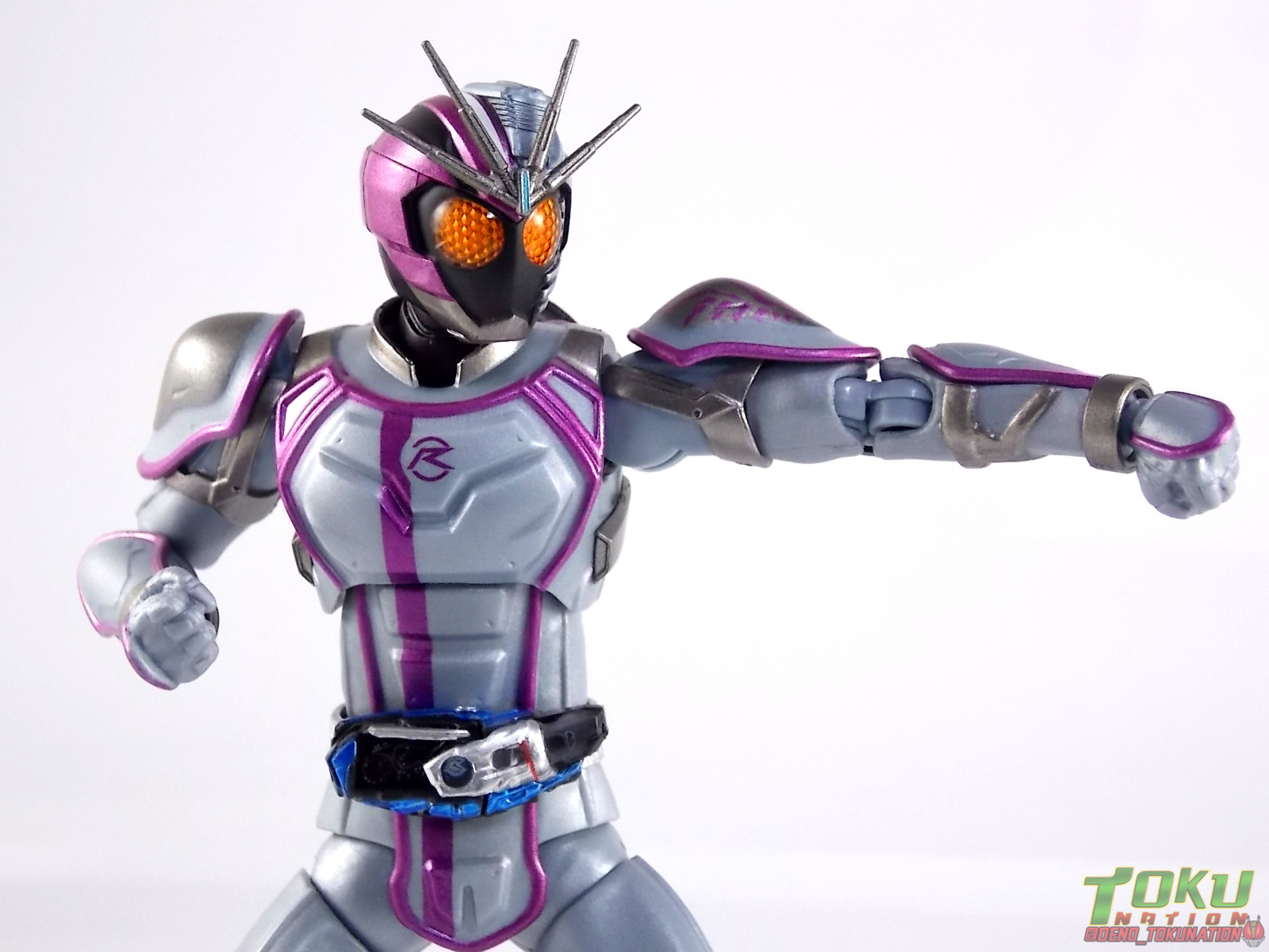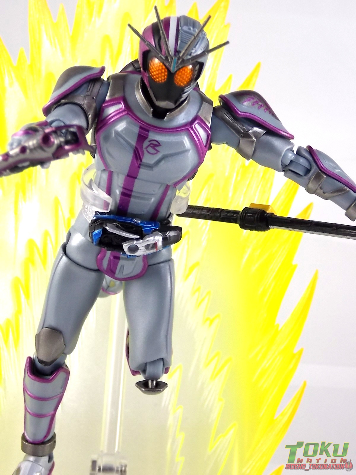 Kamen Rider Drive figuarts releases have slowly but steadily been making their way out via the Tamashii Web Shop and todays' gallery brings us to one of the final (so far) scheduled releases. The next releases coming up will be Kamen Rider Drive Chou Deadheat, & Kamen Rider Chaser Mach but for now we're going to take a look at the series' 3rd heroic rider. Our gallery today focuses on S.H. Figuarts Kamen Rider Chaser! Packaging Business as usual once again! Nothing new to report with the now standard Drive release packaging. Just some epic shots of Chaser himself on the box. Otherwise we have seen this numerous times over up til now. Main Figure As with the other 2 main riders from this series (Drive & Mach) Chaser is an entirely new mold. And thankfully this one is right at the top of the list with Drive Type Speed for excellence. The nice thing about less bulky and more acrobatic suits is they just don't have all that bulk to get in their way. Much like Drive, Chaser has fully unrestricted hips. However I do need to mention that because of the sort of safety pad design of the shin armor the feet cant quite tilt back as far as I'd like, and the toes have almost zero wiggle in them. But Chaser can more than strike a pose even with these faults. His arms are just about perfect with nice easy to work around shoulder armor, the Chaser symbol on his left shoulder looks even better on this mold than it did on Mashin Chaser. As far as the upper body goes we see more of that glorious silver-ish blue armor with purple accenting. The torso & waist are looks great, including the Mach Driver & the new for this release Chaser Signal Bike. I wish the torso cut was a little bit more free for movement, but Chaser is still fairly nimble. The main event is of course that wonderful asymmetrical head. This piece emulates fully the asymmetry of the Mashin Chaser form. The orange compound eyes which are really striking and appear to be accurate to the altered eyes seen around episode 34 of the series, look like they were hiding under the Mashin Chaser mask all along. The headcrest looks like a natural extension and duplication of what was present on Mashin Chaser as well. The headcrest (as mentioned in the accessories section below) is a separate piece entirely. Now perhaps the only thing I can say bugs me about this release (other than the previously mentioned headcrest) is that Chaser feels just a bit small. Not in any real measurable way, but just looking at him next Drive & Mach he doesn't seem very big or bulky. Granted his suit is much more streamlined and basic by comparison, no goofy tire bisecting the chest or attached to the shoulder, he just features the sleek Wheeler Dynamics on his back. But he does seem just a tad small. This seems more apparent when he's positioned on the S.H. Figuarts Ride Chaser. But overall this really is just a superb figure. Chaser features all the best elements of the Drive line with only minor drawbacks. Accessories Chaser comes with probably the most appropriate selection of accessories he could have (aside from one notable exception). Chaser includes: 1 - antennae/crest. Oddly Bandai has opted to package Chaser's head crest as a separate piece. Granted the part is very thin and I imagine could break easily during shipping, but they've never really done this before with a rider figuart. Also since the piece is so thin and the port it plugs into is so tight, it makes for a pretty scary experience plugging it in. I suggest some healthy caution when doing so. 2 - sets of additional hands. That includes 2 identical open palm expressive hands, and 2 holding things hands. Weirdly the holding things hands are molded in such a way that they are clearly intended to hold a gun or a weapon with a trigger rather than the included ax. More on that below. 1 - Shingou Axe (Signal Axe). Chaser's signature weapon and all around fun plot device for battles. The Signal Axe looks pretty spot on to it's show counterpart & is just the right size to look like a pretty fearsome weapon. It can also accept Signal Bikes like the one included in Chaser's Mach Driver thanks to a small port adjacent to the signals. My 2 gripes with the ax however are that the silver paint used on the handle rubs off very easily, and that the signals themselves are labels. In a stupidly similar fashion to how Gaim Kiwami Arms had a label inserted into it's chest to replicate that detail but was crinkled and damaged on many, my Chaser clearly suffers a similar problem. The "stop" label appears to have been applied more than once, incorrectly, and has creases resulting from it. Get your act together Bandai, collector products should not suffer from this. 1 - signal effect part. A replacement window for the E-Condition Lamp that signifies the change from the "wait" & "go ahead" signals during Chasers' Full Throttle attack, Across Breaker. This piece replaces the clear plastic window on the ax with one darkened half that can be used over either signal. It's a really a nice piece to have included. Though removing the faceplate on the ax can be dicey at times. As I mentioned above there is a notable exception from this set, Chaser's Break Gunner. A holdover from his prior Mashin Chaser form, this item was maintained by Chaser as a secondary weapon in show. It was used numerous times, most often while waiting for the Signal Axe to change signals. But it was used very often. It's exclusion here is baffling. The accessory exists already, it would have cost next to nothing to include it with this figure. It's just baffling. Without it Chaser feels a little incomplete. You can always borrow it from your S.H. Figuarts Mashin Chaser. But ultimately that will leave him without a Gunner as well. What makes this all the more idiotic is that Chasers' "holding things" hands are literally molded to hold a gun! They aren't even the proper shape to hold the ax in a natural way, they are specifically molded to hold a weapon with a trigge