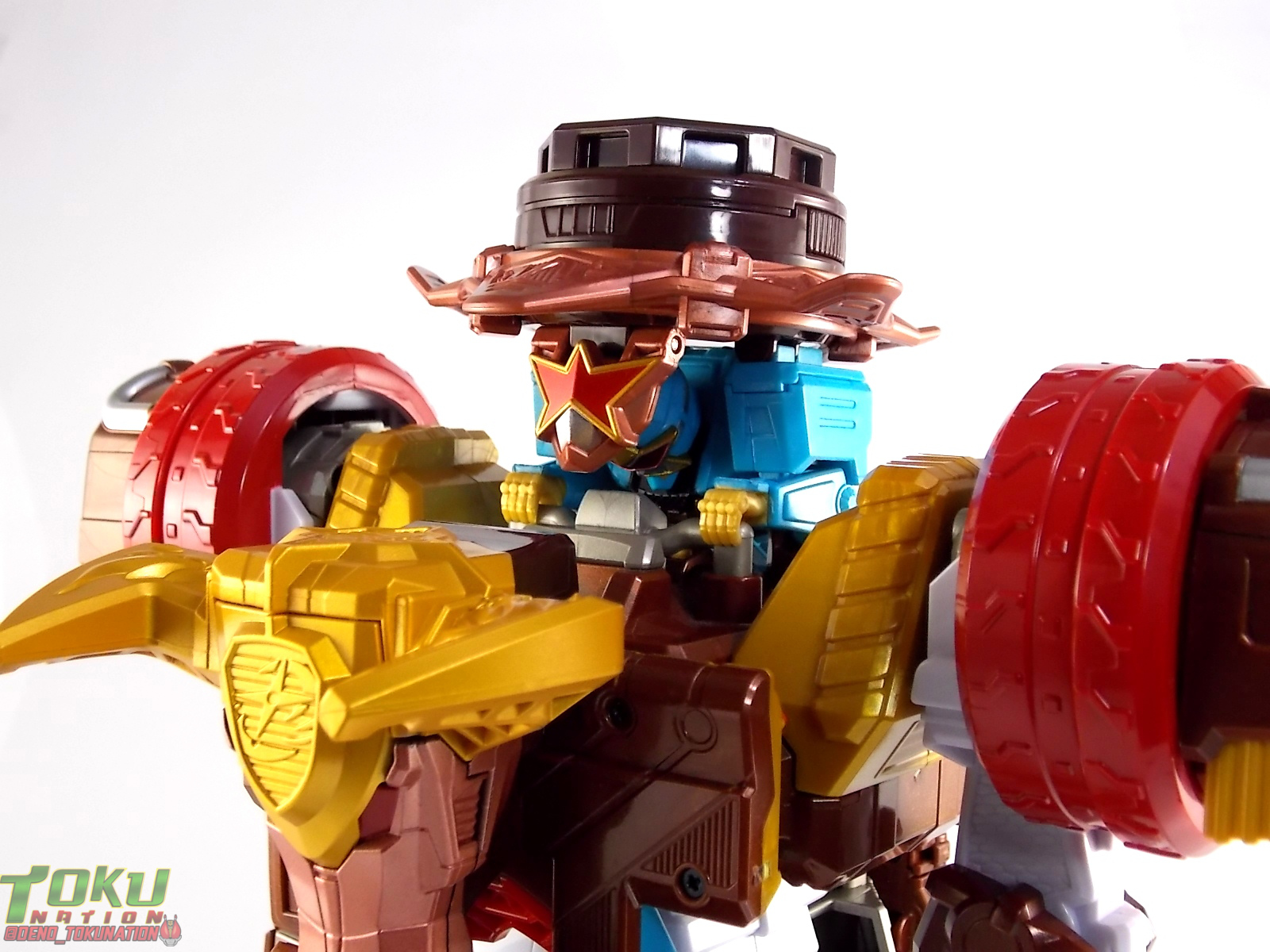 Premium Bandai is at it again with another Shuriken Sentai Ninninger high end release. Last year saw the inaugural figure of this premium sub line with the Artisan Chogokin Shinobimaru. Now for round 2 we have yet another high end articulated replacement for a DX figure with a touch of diecast to give it that premium feel. Today we're taking a look at the Super Sentai Artisan Rodeomaru! Packaging Artisan Rodeomaru comes in a box slightly larger than Shinobimaru, mostly because of the vastly improved accessory count. It's still a very compact but wonderful looking box. A shot of the actual show suit is used on the front while the back prominently features Chouzetsu Akaninger. There's also the characters for Chogokin/超合金 on the front so you legitimately get excited about the figure you're about to handle. Main Figure As a Super Sentai Artisan release one can expect a degree of quality in this figure that simply isn't present in the main retail toyline. To a degree Rodeomaru is a great example of what the Artisan premium line could be. Much like Shinobimaru it's a pretty quality figure, but it does still have some significant drawbacks. In the plus column, Rodeomaru looks fantastic, just a wonderfully almost perfectly accurate representation of this mecha. His DX counterpart looked fine, but as you can see in the comparisons, it was molded in such a way as to allow it to combine more than anything else. So the individual robot mode of the figure suffered for it. The way the arms and shoulders were on the DX was specific for it's combinations with Bison Buggy/King. As you can see in the accessory list below, the Artisan has an answer to that, but one that isn't all that great. Now on the topic of the arms they are pretty solid. There's a nice swivel joint in the upper shoulder, the elbows have good ranger, and the poseable fingers help this guy do a lot of things, like hold silly accessories as pictured below. However his shoulders are gargantuan, and not designed to angle out of the way. You won't get much outward movement from them. The legs, while featuring some nice hefty chunks of diecast and the same cool floating knee pads as Shinobimaru, are pretty limited. The way the hip armor works on his things it impacts the waist, and unlike with Shinobimaru where there was angled hip armor to use to your advantage, Rodeo just suffers with hips that can't reach their full potential. While there are swivel joints just above the knee to maneuver these thigh pads, you still lose a bit of movement because of them. I still managed to get him into some decent poses despite these flaws and he looks undoubtedly good while doing them. Rounding things out this figure features the same kind of back clips as Shinobimaru, allowing it to sit in DX Shurikenjins' pilot seat to form Shurikenjin Texas. And we should also take a look at the final 2 gorgeous components of the figure, the golden chest plate, and that wonderfully sculpted head. Now while the head IS sculpted very well, the paint can vary figure to figure. As you can see below mine has a rather noticeable golden droplet just below his chin. Sadly I have to report that the head wasn't designed to angle up at a 90 degree angle like the DX either, so when you do combine it to form Bison King, you're going to have some issue with the head sticking out too far, as pictured. Accessories In STARK contrast to Shinobimaru, the accessory breakdown for this release is pretty solid. Honestly it's kind of funny because one of these "accessories" is an entirely new figure: 1 - Starninger figure. This is meant to replicate the way in which Kinji rides Rodeomaru into battle. To use it you just need to slide out the rectangular piece on the figures' right shoulder, then plug this in. At it's size the sculpt is great for this part and it gives the figure a good sense of scale, but otherwise it doesn't do anything and features no paint applications. Just like the Akaninger included with Shinobimaru 2 - replacement arms. These arms are meant to more properly replicate the way the DX toy and show counterpart of Rodeomaru ride on Bison Buggy. The arms can be pulled off at a rather inconveniently placed plug up inside the shoulder. Plugging the new arms on can be a little bit of a pain as well. When in use I can't say I find the results all that satisfying. You lose the articulated and therefore much stronger grip of the normal arms' hands, and the tabs on their undersides, meant to interface with the buggy physically, don't click in very strongly. Honestly the arms are really disappointing and don't amount to a cast improvement. They'd have been better served making fold out clips on the underside of the normal arms. 2 - replacement shoulder pads. Perhaps not quite as disappointing as the new arms, these pads can be used by sliding out the top section of the normal shoulders. These have clips which allow the DX Bison King Shuriken to plug onto Artisan Rodeomaru as it would his DX counterpart. Again, just as with the underside of the arms, these clips really don't snap in very well. The connection is kind of loose and dodgy. Add to this that Artisan Rodeomaru doesn't have the kind of neck his DX counterpart does and his head sticks straight forward very noticeably making the Bison King faceplate look as though it's pointing at an outward angle. 1 - Chouzetsu Akaninger figure. Now this little guy is what was originally the real selling point of this set to me. The announcement of his inclusoin got me excited. Then I got the figure in hand. So much for premium chogokin eh? Akaninger is an entirely plastic, yet admittedly nicely articulated figure. This diminutive little guy is about the size of his DX counterpart so he's still compatible with Lion Ha OH, though he requires 2 adapter accessories pictured with him below. He also included his Ninja Ichibantou and has a peg hole molded into his back to store it. While there are some paint apps present on the figure it isn'