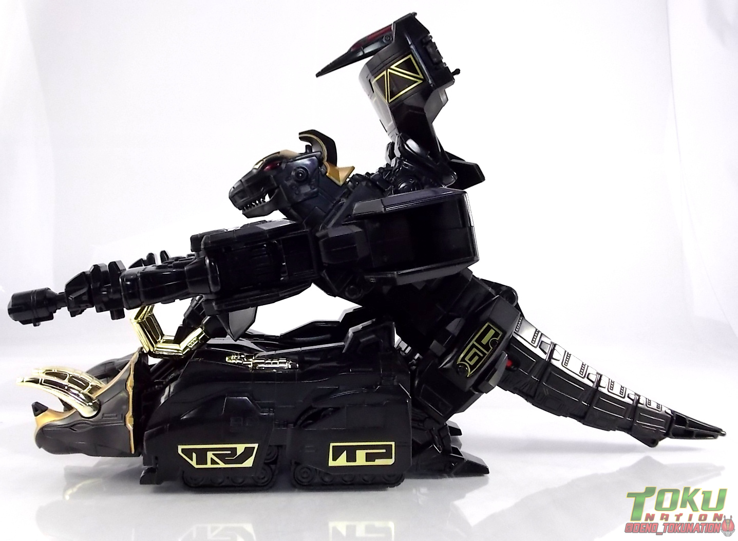 It's time to share an incredibly special gallery with the community once again! Made possible with no more than shear luck and some patience, we've uncovered a real gem for today's subject. Dating back to 1992-93 is of course Kyoryu Sentai Zyuranger. The series known the world over as the basis for Mighty Morphin Power Rangers in the west. Zyuranger set many firsts for the sentai franchise, but it's toyline also had a huge contribution to the tradition of the brand, the black repaint! So today we've managed to get our hands on what's increasingly become one of the most rare special sentai releases ever, the DX Black Daizyujin! This gallery is HUGE so it'll be broken down like this: Post 1: Packaging, Paperwork, Tyrannosaurus, Mammoth Post 2: Triceratops, Tiger, Pterodactyl, Group shots, Dino tanker Post 3: Daizyujin & the Dinosaur Sword God Horn! Packaging/Paperwork Black Daizyujin's packaging is basically identical to that of the standard release. It's the exact same box, just done up in blacks grays and whites with Gold metallic for it's name in Japanese. Otherwise there's no change at all. It always fun to review a vintage release like this as well because I still love love the old classic styrofoam trays these sets come in. That and at least in this case, the statistics for all the Guardian Beasts as well as Daizyujin are listed. Even the Dinotanker mode. These kinds of stats are trivial and ultimately don't mean anything in regard to the toy on hand, but I love in universe factoids like this. Now as for the included paperwork, the instructions are a identical to those from the standard release. The label sheets included however are complete recolors. In nice bright Golds, blacks, and with some minor red accents. Now I didn't use these labels at all. I simply couldn't bring myself to ruin them as replacements would be impossible to find. I was terrified of them peeling back off at some point. Components My purchase of this set was primarily driven by the incredible deal i got on it. I wanted to take the time to do a nice complete gallery for the site, and then hopefully flip it for a profit so I could purchase a new camera to continue bringing you guys great new content. Now I did have to snip the parts off the various included sprues in order to complete the look of each beast. But that's it. So I present to you each of the main 5 Guardian Beasts of Zyuranger! Guardian Beasts Now truly what is there to say about the functionality of the individual components at this point? I can assume that many of you have at least some experience with the US Megazord release of this toy so you know what to expect. Again there's going to just be stark contrasts in colors with these figures compared to their standard counterparts, US or Japanese. That's just the nature of Black repaints. Which if you were unaware, Black Daizyujin was the very 1st sentai release done in such a color scheme. The precedent set by this release has allowed for such sets as Black Gaoking, Black Ultimate Daibouken, Police Gunbir-Oh, and even had an influence on such figures being released in Western markets. While the colors are a bit dull, please remember that I never applied the labels to these figures. So they don't look as flashy as they normally would. Some really great gold trim and surprisingly some deep crimson red accents break up the monotony though. The red can mostly be found on the Tiger with some minor applications of it to the Pterodactyl & Tyrannosaurus as well. One thing to note at this point though are the parts that actually weren't cast in black plastic. In fact all of the clips on the Mammoth, release triggers on the Tyranno tail as well as the clip for the backpack, the interior panel of the Pterodactyl, and even the knee connectors in the Triceratops & Tiger are all still cast in red plastic. For some reason these components alone could not be made in black plastic. In their individual modes they really aren't noticeable, even less so in either of the combined forms. But that red really stands out against gray and black once you've noticed it. As mentioned above I had to remove some parts from sprues to complete the physical look of most of this set. Horns and the tail piece for the Triceratops, tusks for the mammoth, & wings for the Pterodactyl. Dinotanker I've included step by step images below for how to get the Guardian Beasts into their first combined mode, Dinotanker, but it's simple. Really you just need to lay out the Tiger flat with it's tail flipped up, flip the tail up for the Tricera, and plug the Tyranno's knees into each. Fold out the Mammoth arms and attach the backpack and shoulders. Then snap the Pterodactyl in between the Mammoths feet. The "feet" of the Pterodactyl are actually small cannons you need to plug into the Mammoth's feet to create the Dinotankers' Beast Tank Cannons. The Mammoth Shield also needs to be plugged into the small port under the Tyranno head, and the trunk pointed downward. This is a, for lack of a better word, beastly combination that looks really intimidating in all black. It looked cool if a little disjointed in normal colors but the uniform color scheme really helps sell the idea that this thing is a literal tank. Daizyujin The mighty Daizyujin can be formed straight from Dinotanker mode by simply removing a few components. The Mammoth Shield, Pterodactyl, & Beast Tank Cannons. Once removed, flip up the Tiger & Tricera heads and stand the combination fully upright. Rotate the arms down and the fists out. Plug the Beast Cannons on the back of the backpack and flip the Tyranno tail up to lock the backpack assembly firmly together. Then open the chest cavity and rotate the Tyranno head down revealing most of the head for the combined form. Close the chest back up, plug the Pterodactyl on, then simply rotate the horns out and Daizyujin is formed! As the progenitor of the entire Black Sentai repaint concept, Black Daizyujin is magnificent. When fully assembled 