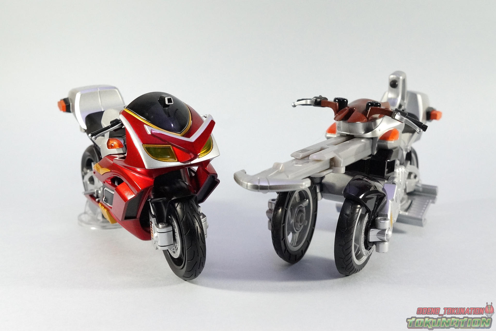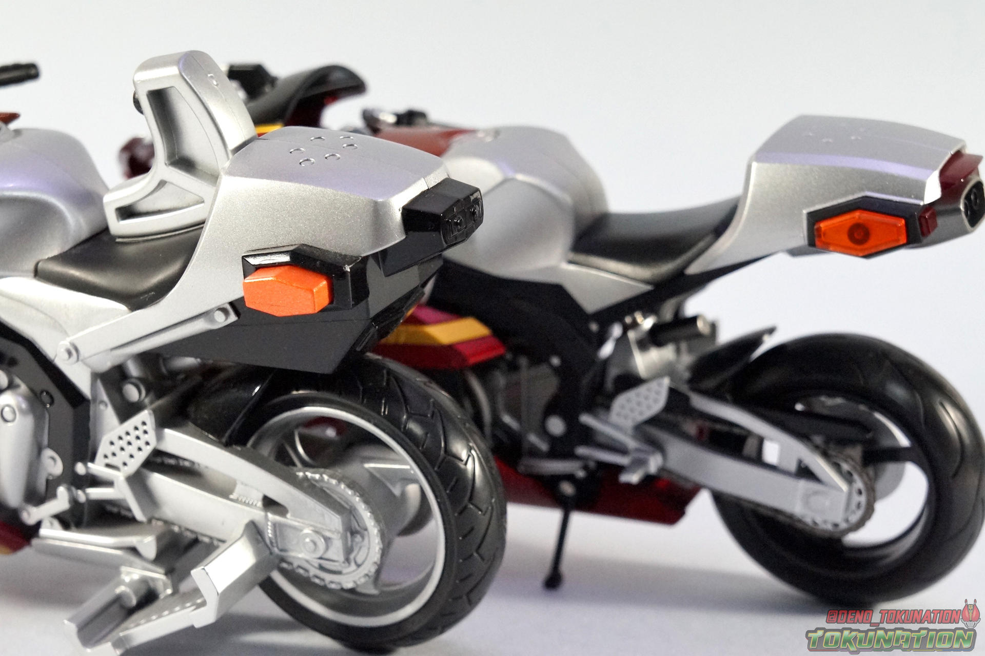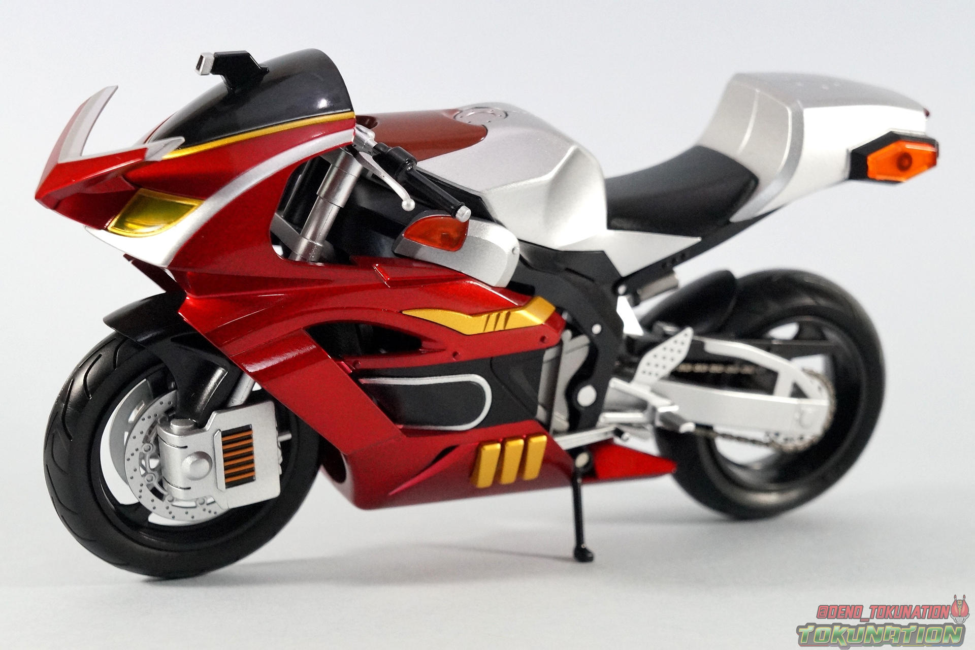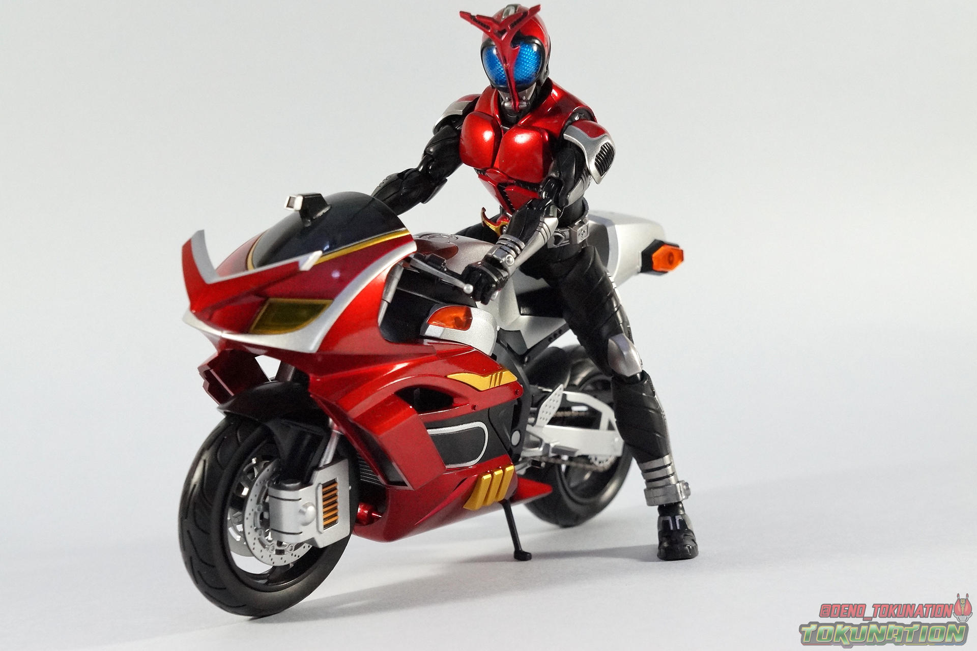 Packaging Pretty standard stuff here. Most Rider Machines come in pretty plain boxes. This one is no different thanks to the drab black & gray color scheme of it. Nothing else of interest to note with this one. Main Figure It's a bike. Review done. Oh, you expected more? I suppose.... In truth there isn't much you can say about a vehicle of this nature. The Kabuto Extender is a really gorgeous bike. And one that's well past due. Considering all of the Kabuto Riders themselves (minus the Brightrooper variant) were released as S.H. Figuarts years ago, it's still surprising that none of the bikes were ever produced before now. Luckily the Gattack Extender is being teased currently too, and with SS Gattack on the way it's just a matter of time. But I'd still like to see the Machine Zectron, in both TheBee & Drake flavors some day. But as Rider Machines go, Kabuto Extender is pretty basic. It doesn't have any action features to speak of unlike it's vintage DX counterpart, which I've included comparison shots of. In show the Extender could also "cast off" it's outer armor like the series' riders, to reveal a faster more powerful form beneath. While it's probably not fair to expect the figuart to be capable of this, we live in a time where a fully transformable Survive Contract Monster Dragranzer exists. So you know, wishful thinking. But it's still a goo looking bike and Kabuto looks perfectly natural sitting on it. Tendou has never looked better than he does with this modern day pairing. Accessories 1 - wheel base like most Figuarts bikes. Nothing special here. 1- Tamashii Stage Adapter. To be used on the underside of the bike the recreate action shots or chase scenes. I had some fun with it and explosions as you can see below. Also it seem additional handlebars are a thing of the past, as this release doesn;'t have the standard extra pair. But honestly who ever used them anyway? Can't think of much else that could have been done with this one. For what we got I'm relatively pleased though. Final Thoughts Basically S.H. Figuarts Kabuto Extender is a really nicely painted and sculpted vehicle that will be a great accessory for your Shinkochu Seihou Kabuto. Many collectors don't particularly feel the necessity to own every bike for every rider. And with releases like this, I can totally get that. I loved Kabuto, the series and the rider, so it's a must have personally. But even I can admit you don't get much bang for your buck with this one. S.H. Figuarts Kabuto Extender could have been much more, but like many Rider Machines it just becomes background display material.