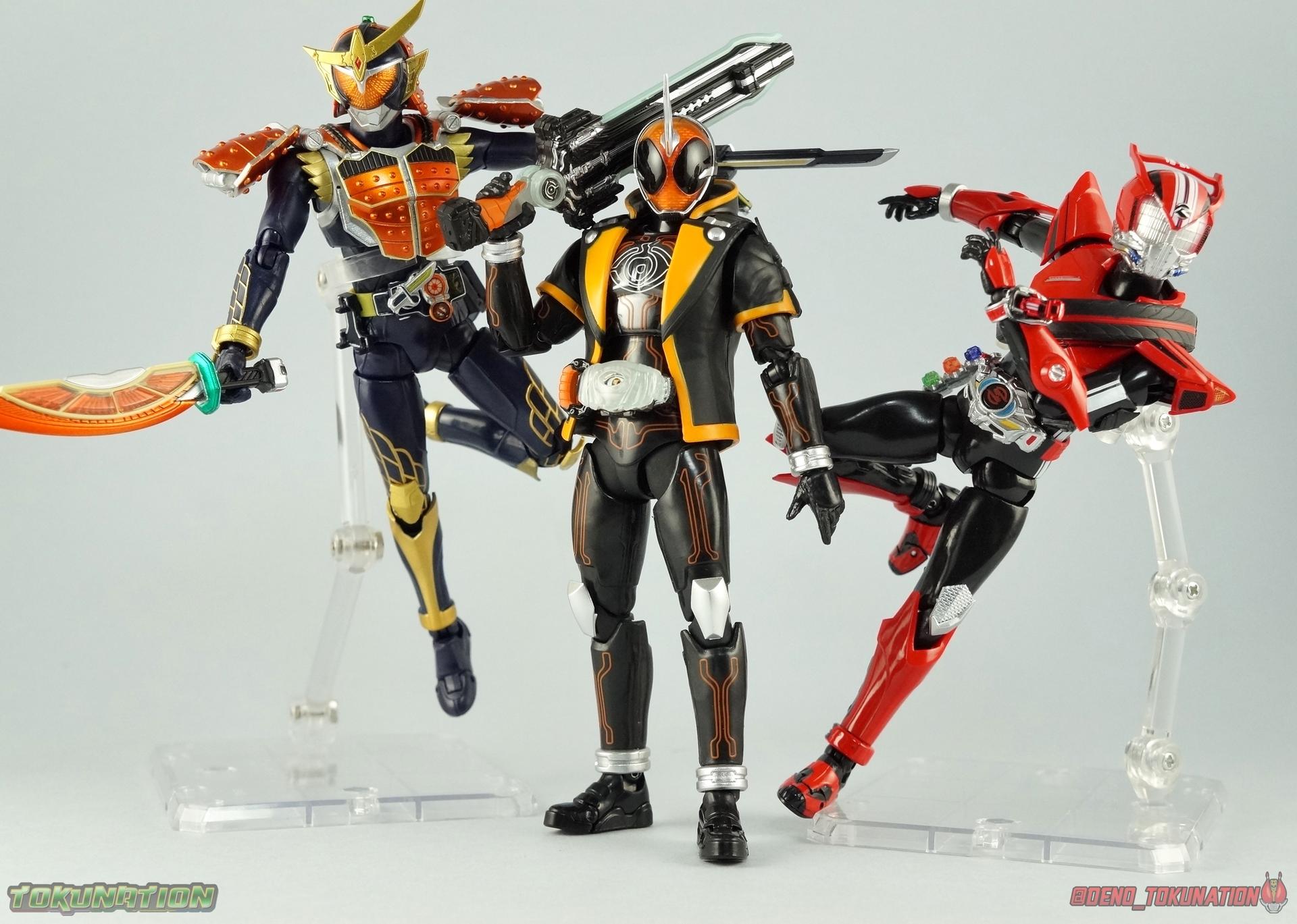 The latest Heisei Rider has made his debut in Bandai's long running collector's line with S.H. Figuarts Kamen Rider Ghost Ore Damashii! Takeru's 1st basic form, Ore Damashii is the embodiment of his own soul. In figure terms it's also our first outing with this line. So let's see how it'' be be shaping up. Packaging For starters the packaging is styled in the now very common slim box popularized during Kamen Rider Drive's run. It's not bad but it doesn't offer much to look at aside from some stock photos on the back. This 1st release of the figuart features a gold foil sticker on the window indicating it includes the 1st run bonus Yurusen figure. Similar to how S.H. Figuarts Sailor Moon had a 1st run sticker indicating the extra faces she came with. But all in all a pretty standard box. Main Figure Like many collectors you may be thinking that Ghost Ore Damashii will be a disappointment. And who could blame you? At the time of release this figure got quite a few negative reviews and there were more than a few stories about it's hit or miss QC. However I'll kick off my review by saying that, while Ghost is flawed, it's actually a quite solid figure. And that's coming from someone who hates the show itself, and generally doesn't care for this riders' design. For starters Ghost is painted in a combination of matte black & orange that while not bad, is lazily applied in spots. Especially around the trim on his Parka Ghost. However the finer details lining the glossy translucent parts of the armor are top notch. No imperfections at all. Likewise the ghost emblem on his chest is spot on and the head couldn't be more perfect. Ghost's head is a gorgeous brilliant orange that captures light perfectly. It just glows at the right angles. And for once I'm sold on those massive black eyes, they really give him a sense of depth and power I hadn't realized before. The Ghost Driver is a pretty bland opaque blue but much like it's DX counterpart this opaque face plate can be removed to expose the toothy monstrous face beneath. An Ore Damashii Eyecon is present but non-removable as it's sculpted in. It is however painted pretty well for something at that scale. Now lets talk about how Ghost moves. Again, many people have talked about how limited his articulation is. I'd like to dispel some of that myth. Ghost's leg design provides a full range of motion stunted only by the ankle tilts being just a bit limited. If they had a bit more forward/back room to move then they'd be great. But the cuff around the ankle limits that. The hips just need to be pulled down and rotated a little to clear the waste which is a relief, drop down hips are something I'm not a fan of. Here's the biggest issue the figure has though, the waist. While it certainly is possible to rotate it side to side, the flawed design also means you have to apply excessive for to the joint to make it move. This can make a scary loud clicking sound and can in some cases, as sadly evidenced by board member Barricade64, snap the waist in two entirely. I can't quite get my Ghost's waist to rotate that much and I certainly don't plan to force it. Liberal applications of shock oil to that joint seem to be the most popular fix. His jacket contributes to the restriction of the waist when it impacts the Driver, but more particularly it limits the upper body and shoulders. The arms themselves are actually pretty well thought out. Though mine must be a bad example of quality control. They keep pulling out of the body at the shoulder & elbow joints. It plugs right back together but it gets annoying while posing. The weakest piece of their design is the soft rubber shoulder sections. The "tabs" on the end are made of soft rubber so they don't get in the way while posing, as you can tuck the shoulders sort of up into the torso recesses. But they get bent very very easily. So watch out for those. I have to mention that wrist cuffs also nix just about any ankle tilt. When the hand is plugged on to the wrist it sits nearly flush so there isn't much room to work with. Finally Ghosts' head, as mentioned above, is perfect. But the molded folded down hoodie on his shoulders really limits how it can move. Forcing Ghost to look up when turned to one side or the other. The included normal hoodie accessory fixes that issue somewhat. Ghost Ore Damashii is more or less the spitting image of his TV counterpart. It's a great scale representation of a suit that I don't particularly care for, that somehow manages to make me like it. Posability issues aside, Ghost is actually a pretty great figure that fits right in with your other Heisei Riders. I've included comparison images with Gaim Orange Arms & Drive Type Speed as well below. Accessories Retail releases tend to come with a pretty nice array of accessories these days and Ghost is no slouch: 2 - sets of additional hands. 1 splayed open pair for posing, 1 "holding things" pair for use with his weapon. 1 - Gan Gun Saber. Once again this figure manages to surprise me and sell me on something I didn't like from the show. I felt the Saber looked clunky and silly in action but it scales well with the figuart and is surprisingly semi-functional. Now it can't replicate it's multitude of forms for various Ghost Changes like in show, but it can manage to do 2 of them. The default Blade Mode as well as Gun Mode. Just split the blade in half, plug the removed portion back on backwards, & fold the grip down to form the Gun. This is an unwieldy mode for it that thanks to the figures arm & shoulder design means it's difficult to 2-hand hold, but it's got a shotgun vibe to it that I like. 1 - hoodie (up). Intended to replace the default folded down hoodie, this piece can be used by removing the standard one as well as a small panel on the top of Ghosts' head. Then just plug this hoodie down on. Weirdly this hoodie which totally surrounds his head provides far far better neck movement. It's free floating so it's not attached to anything b