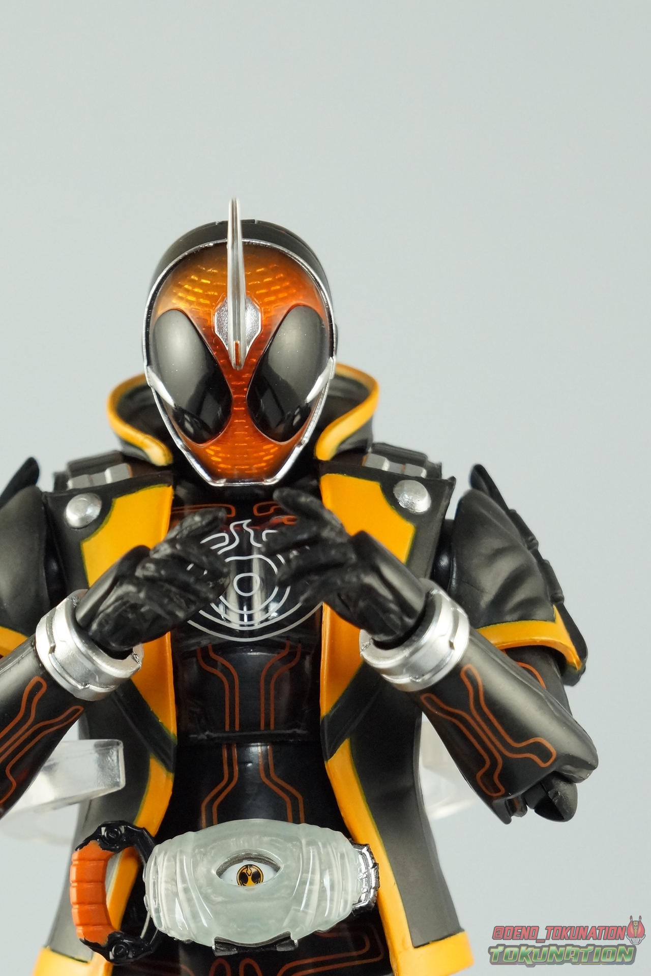 The latest Heisei Rider has made his debut in Bandai's long running collector's line with S.H. Figuarts Kamen Rider Ghost Ore Damashii! Takeru's 1st basic form, Ore Damashii is the embodiment of his own soul. In figure terms it's also our first outing with this line. So let's see how it'' be be shaping up. Packaging For starters the packaging is styled in the now very common slim box popularized during Kamen Rider Drive's run. It's not bad but it doesn't offer much to look at aside from some stock photos on the back. This 1st release of the figuart features a gold foil sticker on the window indicating it includes the 1st run bonus Yurusen figure. Similar to how S.H. Figuarts Sailor Moon had a 1st run sticker indicating the extra faces she came with. But all in all a pretty standard box. Main Figure Like many collectors you may be thinking that Ghost Ore Damashii will be a disappointment. And who could blame you? At the time of release this figure got quite a few negative reviews and there were more than a few stories about it's hit or miss QC. However I'll kick off my review by saying that, while Ghost is flawed, it's actually a quite solid figure. And that's coming from someone who hates the show itself, and generally doesn't care for this riders' design. For starters Ghost is painted in a combination of matte black & orange that while not bad, is lazily applied in spots. Especially around the trim on his Parka Ghost. However the finer details lining the glossy translucent parts of the armor are top notch. No imperfections at all. Likewise the ghost emblem on his chest is spot on and the head couldn't be more perfect. Ghost's head is a gorgeous brilliant orange that captures light perfectly. It just glows at the right angles. And for once I'm sold on those massive black eyes, they really give him a sense of depth and power I hadn't realized before. The Ghost Driver is a pretty bland opaque blue but much like it's DX counterpart this opaque face plate can be removed to expose the toothy monstrous face beneath. An Ore Damashii Eyecon is present but non-removable as it's sculpted in. It is however painted pretty well for something at that scale. Now lets talk about how Ghost moves. Again, many people have talked about how limited his articulation is. I'd like to dispel some of that myth. Ghost's leg design provides a full range of motion stunted only by the ankle tilts being just a bit limited. If they had a bit more forward/back room to move then they'd be great. But the cuff around the ankle limits that. The hips just need to be pulled down and rotated a little to clear the waste which is a relief, drop down hips are something I'm not a fan of. Here's the biggest issue the figure has though, the waist. While it certainly is possible to rotate it side to side, the flawed design also means you have to apply excessive for to the joint to make it move. This can make a scary loud clicking sound and can in some cases, as sadly evidenced by board member Barricade64, snap the waist in two entirely. I can't quite get my Ghost's waist to rotate that much and I certainly don't plan to force it. Liberal applications of shock oil to that joint seem to be the most popular fix. His jacket contributes to the restriction of the waist when it impacts the Driver, but more particularly it limits the upper body and shoulders. The arms themselves are actually pretty well thought out. Though mine must be a bad example of quality control. They keep pulling out of the body at the shoulder & elbow joints. It plugs right back together but it gets annoying while posing. The weakest piece of their design is the soft rubber shoulder sections. The "tabs" on the end are made of soft rubber so they don't get in the way while posing, as you can tuck the shoulders sort of up into the torso recesses. But they get bent very very easily. So watch out for those. I have to mention that wrist cuffs also nix just about any ankle tilt. When the hand is plugged on to the wrist it sits nearly flush so there isn't much room to work with. Finally Ghosts' head, as mentioned above, is perfect. But the molded folded down hoodie on his shoulders really limits how it can move. Forcing Ghost to look up when turned to one side or the other. The included normal hoodie accessory fixes that issue somewhat. Ghost Ore Damashii is more or less the spitting image of his TV counterpart. It's a great scale representation of a suit that I don't particularly care for, that somehow manages to make me like it. Posability issues aside, Ghost is actually a pretty great figure that fits right in with your other Heisei Riders. I've included comparison images with Gaim Orange Arms & Drive Type Speed as well below. Accessories Retail releases tend to come with a pretty nice array of accessories these days and Ghost is no slouch: 2 - sets of additional hands. 1 splayed open pair for posing, 1 "holding things" pair for use with his weapon. 1 - Gan Gun Saber. Once again this figure manages to surprise me and sell me on something I didn't like from the show. I felt the Saber looked clunky and silly in action but it scales well with the figuart and is surprisingly semi-functional. Now it can't replicate it's multitude of forms for various Ghost Changes like in show, but it can manage to do 2 of them. The default Blade Mode as well as Gun Mode. Just split the blade in half, plug the removed portion back on backwards, & fold the grip down to form the Gun. This is an unwieldy mode for it that thanks to the figures arm & shoulder design means it's difficult to 2-hand hold, but it's got a shotgun vibe to it that I like. 1 - hoodie (up). Intended to replace the default folded down hoodie, this piece can be used by removing the standard one as well as a small panel on the top of Ghosts' head. Then just plug this hoodie down on. Weirdly this hoodie which totally surrounds his head provides far far better neck movement. It's free floating so it's not attached to anything b