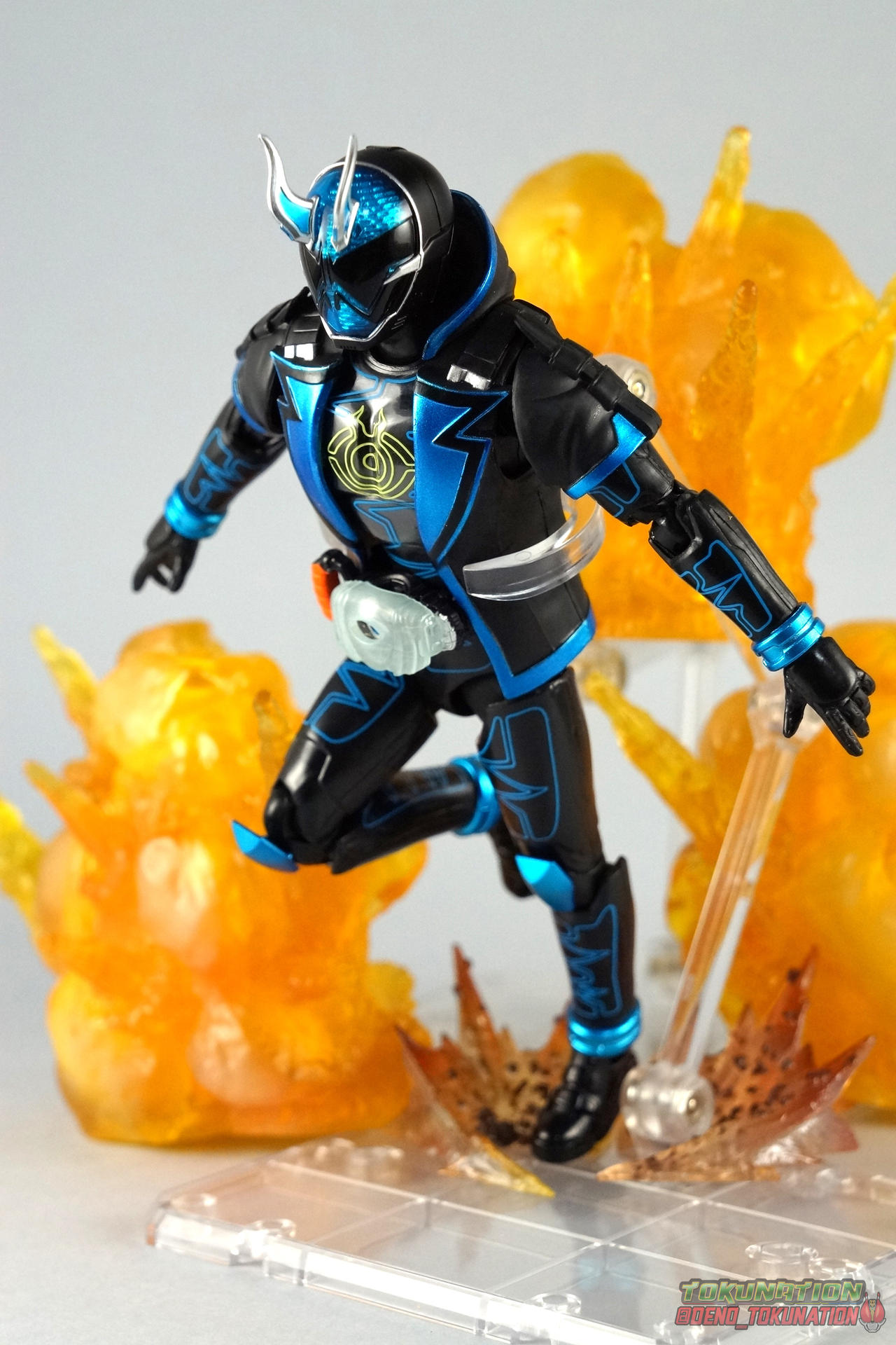 The second release in the fledgling Kamen Rider Ghost subline of S.H. Figuarts is here! The super cool secondary rider of the series, S.H. Figuarts Kamen Rider Specter! And he's brought with him a nice first run bonus much like his predecessor Ghost. ** This figure is part for part identical to Ghost Ore Damashii aside from accessories, paint, and the dual horns. Most of this review will be very similar to that one. Packaging As with Ghost, the packaging is that of the very common slim box popularized during Kamen Rider Drive's run. Same kind of boring design really. This 1st release of the figuart features a foil sticker indicating it includes the 1st run bonus Eyecons. But all in all a very standard box. Main Figure Like many collectors I thought Ghost Ore Damashii would be a disappointment in hand. And who could blame you? At the time of his release there were negative reviews and more than a few stories about it's hit or miss QC. But once I had Ghost in hand I really was charmed by his design. He wasn't executed perfectly, but he worked quite well and had a ton of personality. Now I'm reexamining that same mold and those same feelings with Kamen Rider Specter. Specter is painted in a combination of matte black & almost electric blue that manages to be applied more accurately than Ghosts' paint apps despite them being in the same places. The finer details lining the glossy translucent parts of the armor are top notch. No imperfections at all. Likewise the ghost emblem on his chest is spot on and the head couldn't be more perfect. Specter's head is a gorgeous deep & reflective blue that captures light magnificently. The toy manages to capture a bit more of the menace in his facial design than I think the show suit communicates. The Ghost Driver is the same bland opaque blue and like it's DX counterpart this opaque face plate can be removed to expose the toothy monstrous face beneath. A Specter Ghost Eyecon is present but non-removable as it's sculpted in. It is however painted pretty well for something at that scale. Now lets talk about how Specter moves. Again, its fair to to talk about the limitations of this mold. But first the positives. Specter's leg design provides a full range of motion stunted only by the ankle tilts being more limited by the ankle cuff. If they had a bit more forward/back room to move then they'd be great. The hips just need to be pulled down and rotated a little to clear the waste which is a relief, drop down hips are something I'm not a fan of normally. But here's the biggest issue the figure has, the waist. While it certainly is possible to rotate it side to side, the flawed design of the waist also means you have to apply excessive for to the joint to make it move. This can make a scary loud clicking sound and can in some cases break the waist. This has happened more than once to peoples' Ghosts. It could happen with Specter though I haven't heard such stories yet. I can't really get Specter's waist to rotate that much and I certainly don't plan to force it. Liberal applications of shock oil to that joint seem to be the most popular fix. His Ghost Parka contributes to the restriction of the waist when it impacts the Driver, but more particularly it limits the upper body and shoulders. The arms themselves are actually pretty well thought out and clearly made better than my Ghost, whose arms would fall off simply by being looked at. The weakest piece of their design is the soft rubber shoulder sections. The "tabs" on the end are made of soft rubber so they don't get in the way while posing, as you can tuck the shoulders sort of up into the torso recesses. But they get bent very very easily. So watch out for those. I have to mention that the wrist cuffs also nix just about any dynamic use of the hands When the hand is plugged on to the wrist it sits nearly flush so there isn't much room to work with. Finally Specter's head, as mentioned above, is perfect. But the molded folded down hoodie on his shoulders really limits how it can move side to side. Forcing him to look up when turned to one side or the other. The included normal hoodie accessory fixes that issue somewhat. Kamen Rider Specter is more or less the spitting image of his TV counterpart and a great scale representation of a suit that I didn't particularly care for. Poseability issues aside Specter will fit right into your collection and certainly into your Ghost display. I've included some comparison shots with previous Heisei Secondary riders for fun as well; Mach, Baron, Beast, Meteor, Birth, Accel, Diend. Accessories Retail releases tend to come with a pretty nice array of accessories these days and Specter is pretty on par: 3 - sets of additional hands. 2 different types of "holding things" pair for use with his weapon. The "trigger finger" pair is almost pointless though. The grip is so loose and his weapon so long & heavy that he can barely maintain a pose using them. The other pair of hands are splayed open for dramatic poses. 1 - Gan Gun Hand. Unlike Ghost's Gan Gun Saber this one doesn't really transform per se. Even in show the barely plausible Gun Mode is hardly different from the Rod Mode. Basically you only need to slide up the orange hand grip and close the fingers for Gun Mode. Neither form is very impressive and it winds up being a bit more like a big bat than anything. It's painted well but ultimately does nothing and is incredibly difficult to pose Specter with because of his shoulders and large broad chest. As mentioned above the hands included to hold this thing could have a tighter grip as well. 1 - hoodie (up). Intended to replace the default folded down hoodie, this piece can be used by removing the standard one as well as a small panel on the top of Specter's head. Then just plug this hoodie down on. Weirdly this hoodie, which totally surrounds his head, provides far far better neck movement. It's free floating so it's not attached to anything but it completely covers the hea