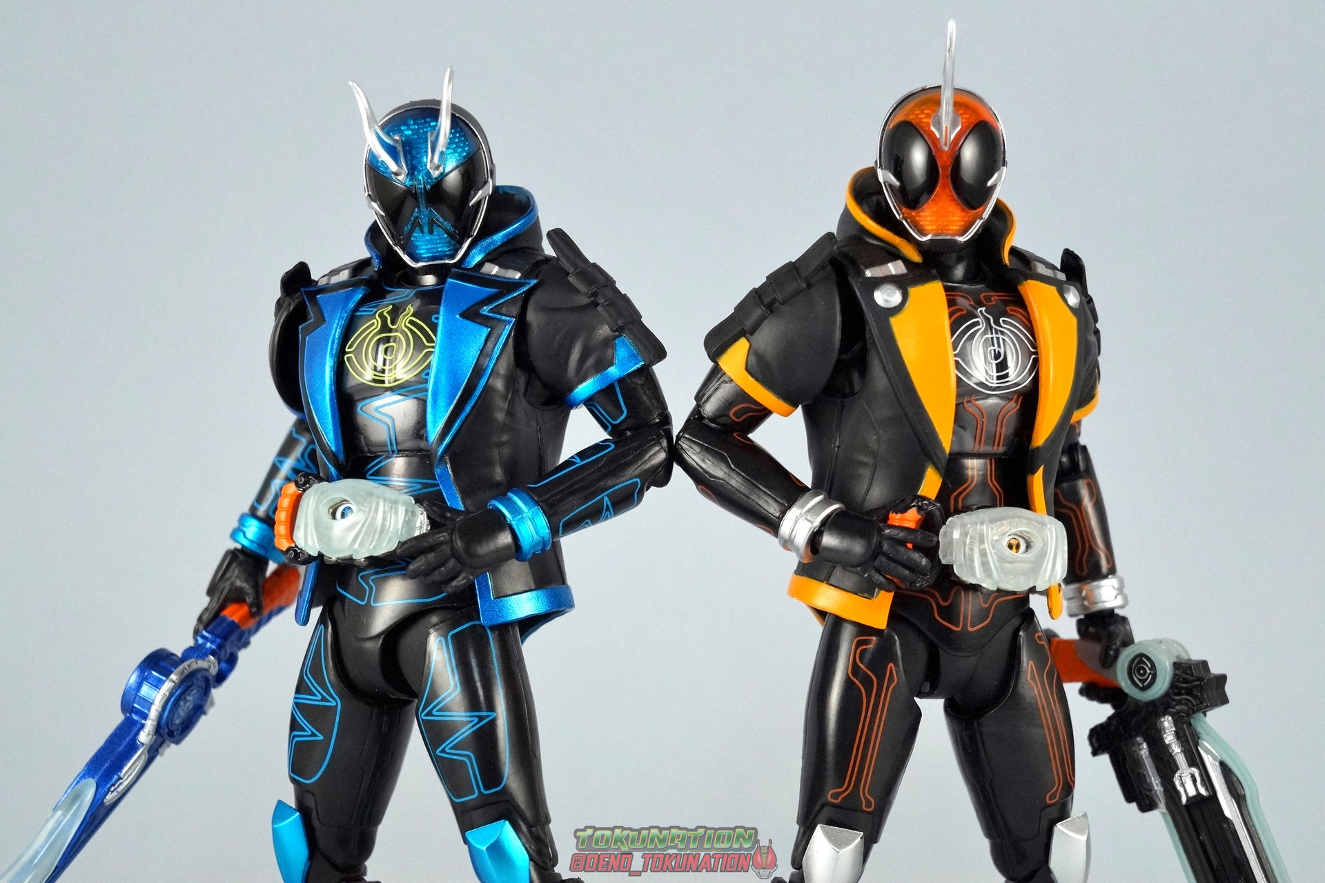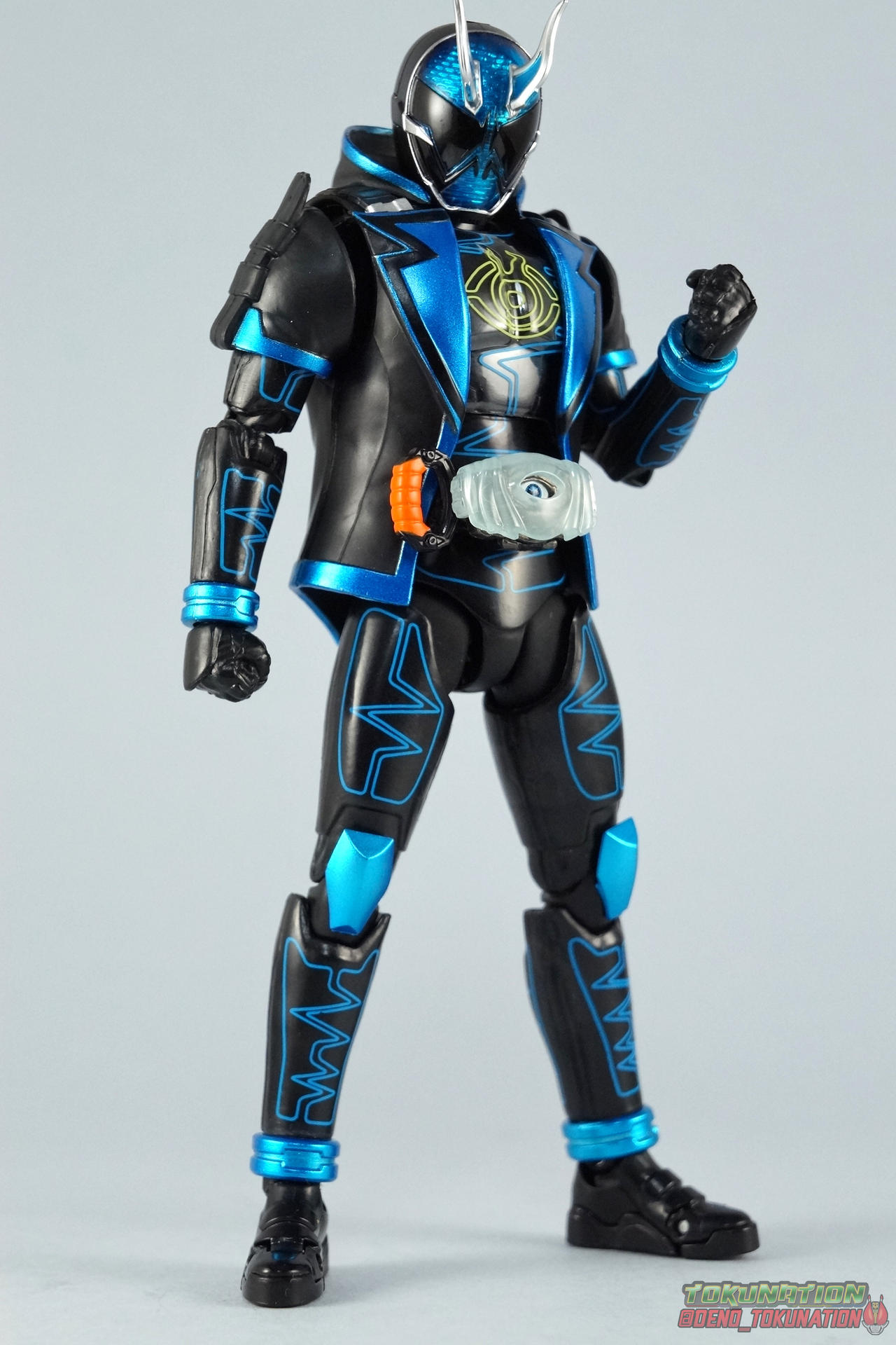 The second release in the fledgling Kamen Rider Ghost subline of S.H. Figuarts is here! The super cool secondary rider of the series, S.H. Figuarts Kamen Rider Specter! And he's brought with him a nice first run bonus much like his predecessor Ghost. ** This figure is part for part identical to Ghost Ore Damashii aside from accessories, paint, and the dual horns. Most of this review will be very similar to that one. Packaging As with Ghost, the packaging is that of the very common slim box popularized during Kamen Rider Drive's run. Same kind of boring design really. This 1st release of the figuart features a foil sticker indicating it includes the 1st run bonus Eyecons. But all in all a very standard box. Main Figure Like many collectors I thought Ghost Ore Damashii would be a disappointment in hand. And who could blame you? At the time of his release there were negative reviews and more than a few stories about it's hit or miss QC. But once I had Ghost in hand I really was charmed by his design. He wasn't executed perfectly, but he worked quite well and had a ton of personality. Now I'm reexamining that same mold and those same feelings with Kamen Rider Specter. Specter is painted in a combination of matte black & almost electric blue that manages to be applied more accurately than Ghosts' paint apps despite them being in the same places. The finer details lining the glossy translucent parts of the armor are top notch. No imperfections at all. Likewise the ghost emblem on his chest is spot on and the head couldn't be more perfect. Specter's head is a gorgeous deep & reflective blue that captures light magnificently. The toy manages to capture a bit more of the menace in his facial design than I think the show suit communicates. The Ghost Driver is the same bland opaque blue and like it's DX counterpart this opaque face plate can be removed to expose the toothy monstrous face beneath. A Specter Ghost Eyecon is present but non-removable as it's sculpted in. It is however painted pretty well for something at that scale. Now lets talk about how Specter moves. Again, its fair to to talk about the limitations of this mold. But first the positives. Specter's leg design provides a full range of motion stunted only by the ankle tilts being more limited by the ankle cuff. If they had a bit more forward/back room to move then they'd be great. The hips just need to be pulled down and rotated a little to clear the waste which is a relief, drop down hips are something I'm not a fan of normally. But here's the biggest issue the figure has, the waist. While it certainly is possible to rotate it side to side, the flawed design of the waist also means you have to apply excessive for to the joint to make it move. This can make a scary loud clicking sound and can in some cases break the waist. This has happened more than once to peoples' Ghosts. It could happen with Specter though I haven't heard such stories yet. I can't really get Specter's waist to rotate that much and I certainly don't plan to force it. Liberal applications of shock oil to that joint seem to be the most popular fix. His Ghost Parka contributes to the restriction of the waist when it impacts the Driver, but more particularly it limits the upper body and shoulders. The arms themselves are actually pretty well thought out and clearly made better than my Ghost, whose arms would fall off simply by being looked at. The weakest piece of their design is the soft rubber shoulder sections. The "tabs" on the end are made of soft rubber so they don't get in the way while posing, as you can tuck the shoulders sort of up into the torso recesses. But they get bent very very easily. So watch out for those. I have to mention that the wrist cuffs also nix just about any dynamic use of the hands When the hand is plugged on to the wrist it sits nearly flush so there isn't much room to work with. Finally Specter's head, as mentioned above, is perfect. But the molded folded down hoodie on his shoulders really limits how it can move side to side. Forcing him to look up when turned to one side or the other. The included normal hoodie accessory fixes that issue somewhat. Kamen Rider Specter is more or less the spitting image of his TV counterpart and a great scale representation of a suit that I didn't particularly care for. Poseability issues aside Specter will fit right into your collection and certainly into your Ghost display. I've included some comparison shots with previous Heisei Secondary riders for fun as well; Mach, Baron, Beast, Meteor, Birth, Accel, Diend. Accessories Retail releases tend to come with a pretty nice array of accessories these days and Specter is pretty on par: 3 - sets of additional hands. 2 different types of "holding things" pair for use with his weapon. The "trigger finger" pair is almost pointless though. The grip is so loose and his weapon so long & heavy that he can barely maintain a pose using them. The other pair of hands are splayed open for dramatic poses. 1 - Gan Gun Hand. Unlike Ghost's Gan Gun Saber this one doesn't really transform per se. Even in show the barely plausible Gun Mode is hardly different from the Rod Mode. Basically you only need to slide up the orange hand grip and close the fingers for Gun Mode. Neither form is very impressive and it winds up being a bit more like a big bat than anything. It's painted well but ultimately does nothing and is incredibly difficult to pose Specter with because of his shoulders and large broad chest. As mentioned above the hands included to hold this thing could have a tighter grip as well. 1 - hoodie (up). Intended to replace the default folded down hoodie, this piece can be used by removing the standard one as well as a small panel on the top of Specter's head. Then just plug this hoodie down on. Weirdly this hoodie, which totally surrounds his head, provides far far better neck movement. It's free floating so it's not attached to anything but it completely covers the hea