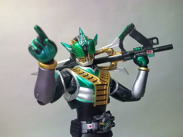 And bringing us our photo gallery of this nice looking S.H.Figuarts is Hima Toys Accessories with S.H.Figuarts Zeronos Altair Form includes a set of interchangable hands, his Rider Pass, the Zerogasher in Sword and Crossbow mode, and a separate belt piece. |