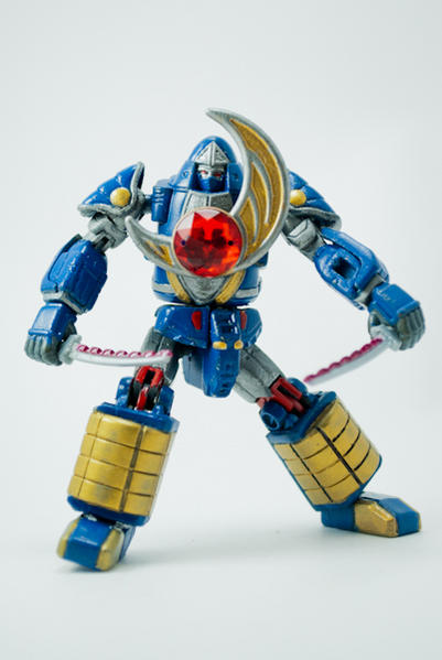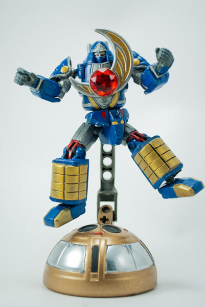 MiniZord was made from a PVC figure with Gundam bits used for articulation. The short swords come from a 'Human Mode Deker' Megabloks figure and the katana from a dollar store ninja. The figure stands at about 4 inches tall and has 15 points of articulation. It was base coated with Krylon Primer and then painted with Citadel Acrylic paints. The red chest gem was found in the craft section of wal-mart. The power sphere base was constructed using half a power sphere and lego bits. It was then painted with Krylon sprays. Last edited by conundrum; 10-26-2012 at 09:43 PM.. |