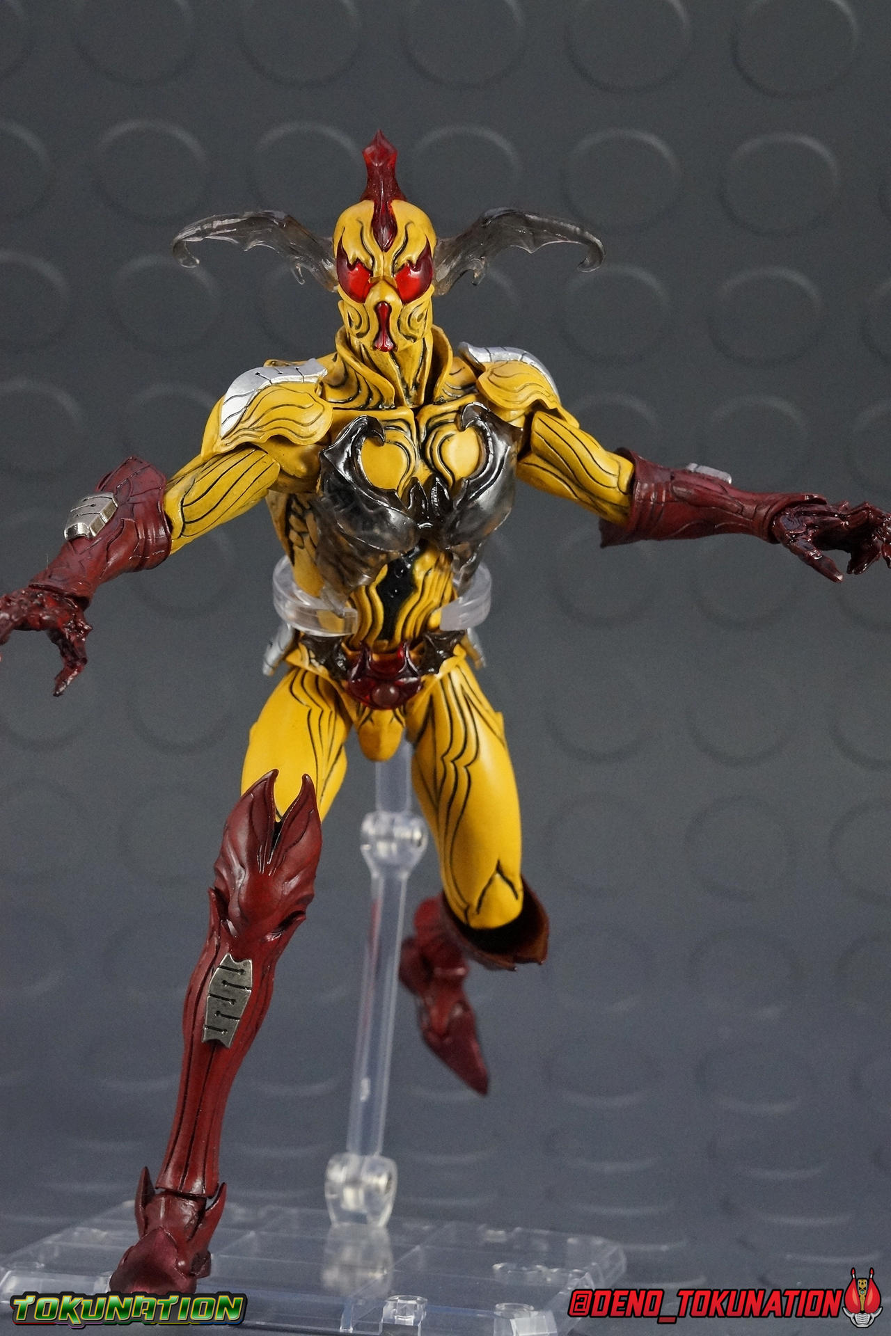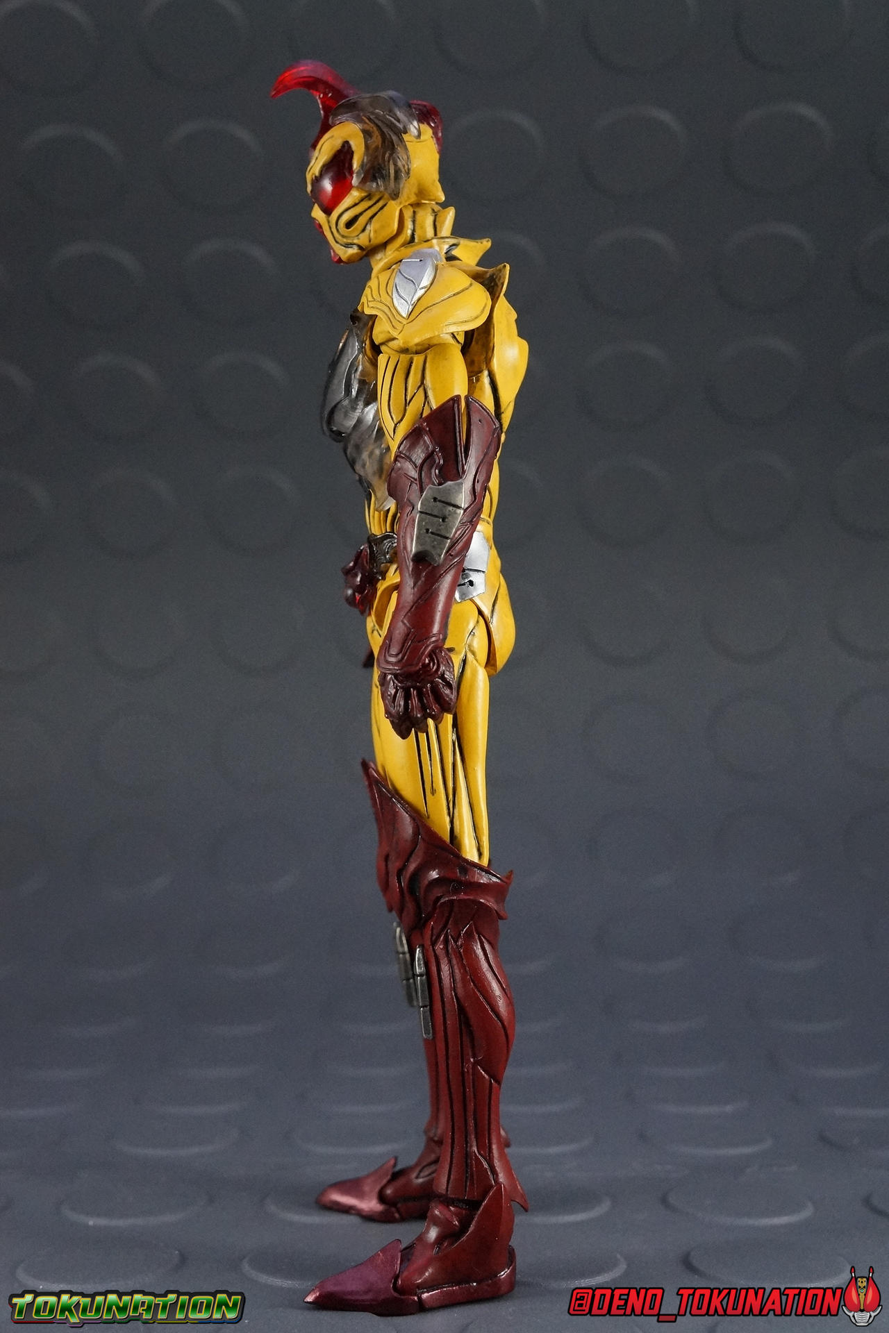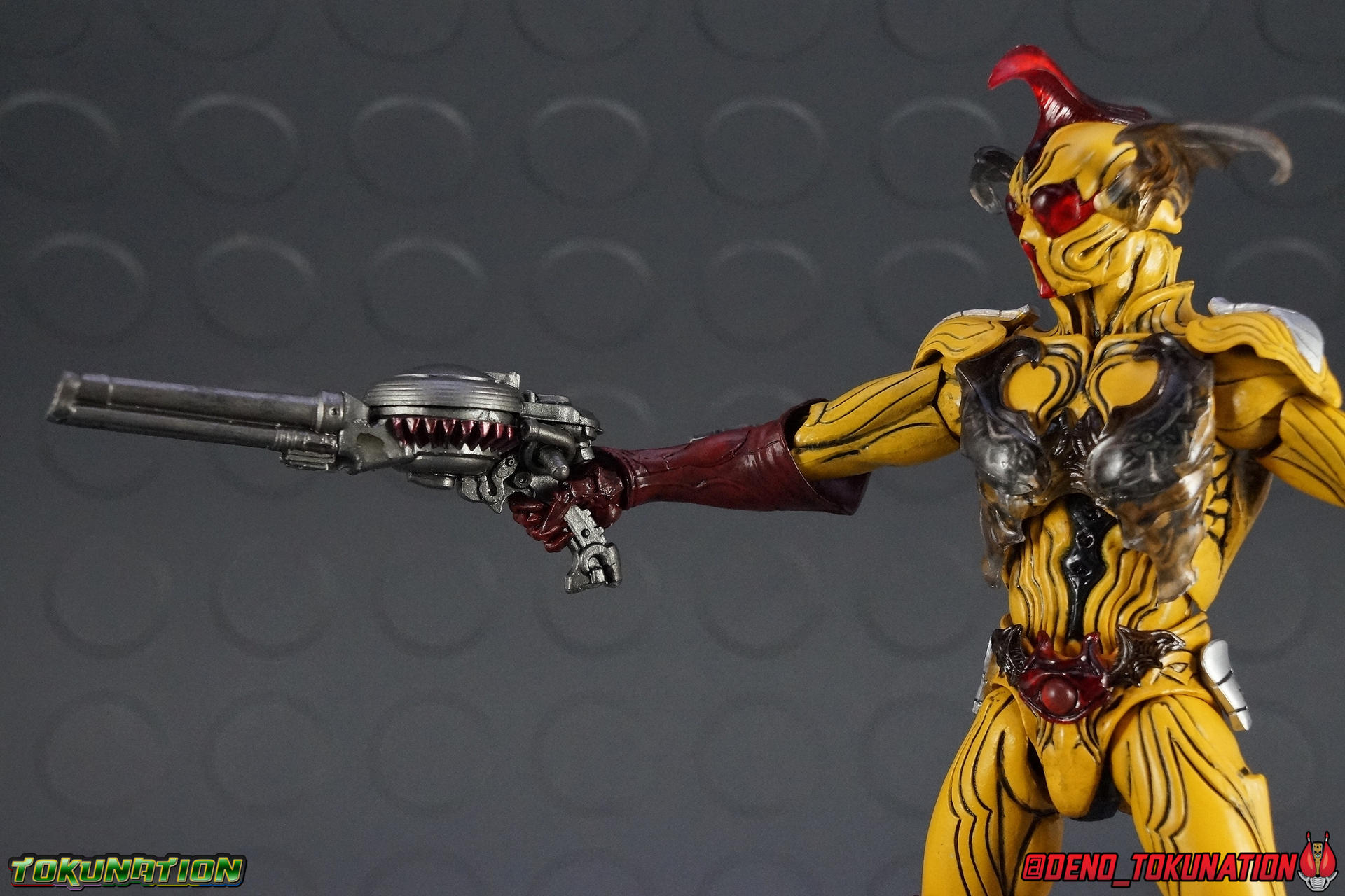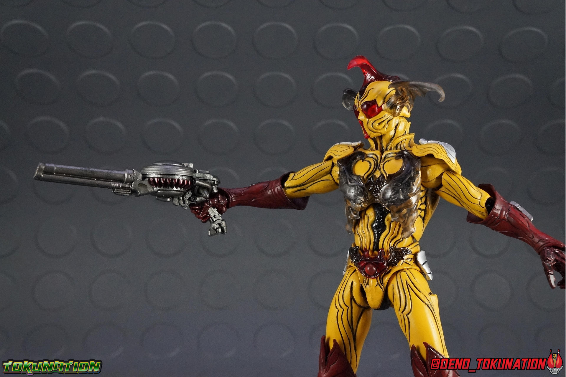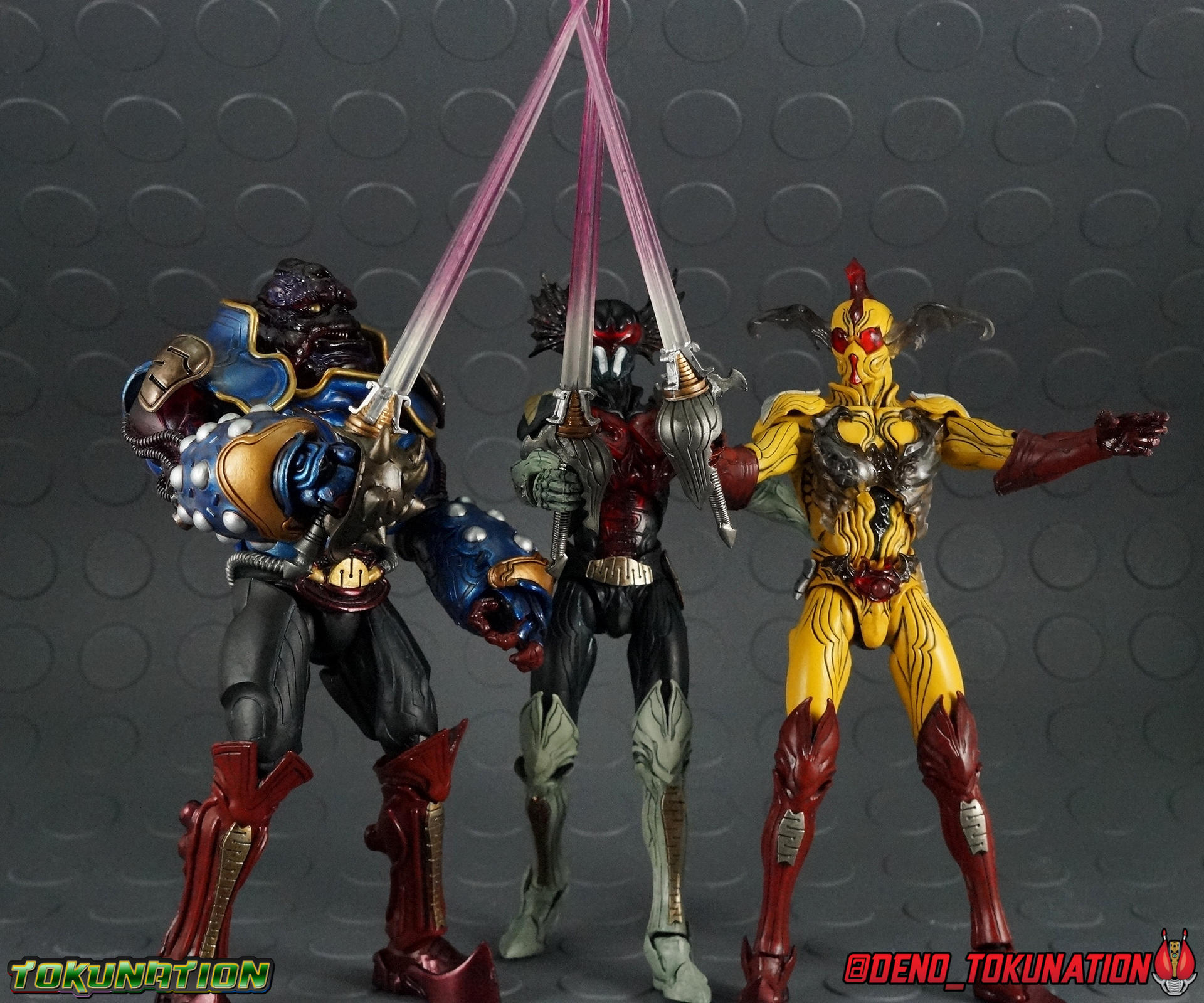 As for the figures, they're pretty nice. I was never a big fan of SICs, especially the larger 8'' scale. After my Kuuga kind of self destructed, I've always been super weary ![]() Zabitan definitely looks the coolest in my book, but then again, apparently I'm a massive edgelord ![]() His overall look is just awesome. While he doesn't pop as much as his companions, I think I just like him on style points alone. Iburu effing pops, though. Bright yellow and red is certainly hard to miss ![]() While he certainly has the most interest head design in my opinion, and his Jo gun is pretty baller, I just don't find the rest of his design to be on par with the other two. I do like the look of Gabura. He definitely screams out "Monster." It's just...I dunno. I don't think I'm too big a fan of his, still. Including the axe and mace is pretty cool, though~ The SICs are pretty nice figures, and definitely give these designs a lot of cool style to them that the original designs were lacking.