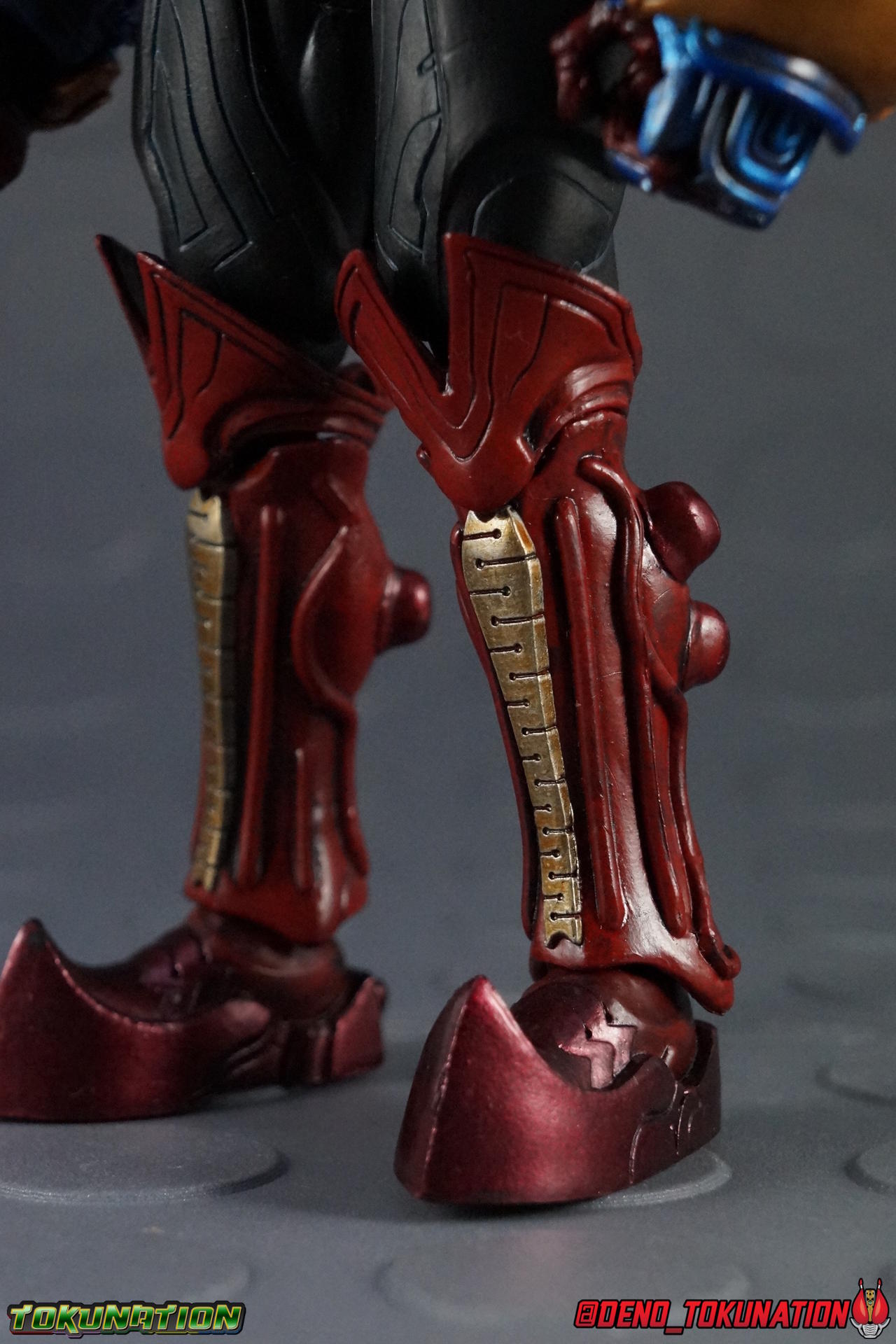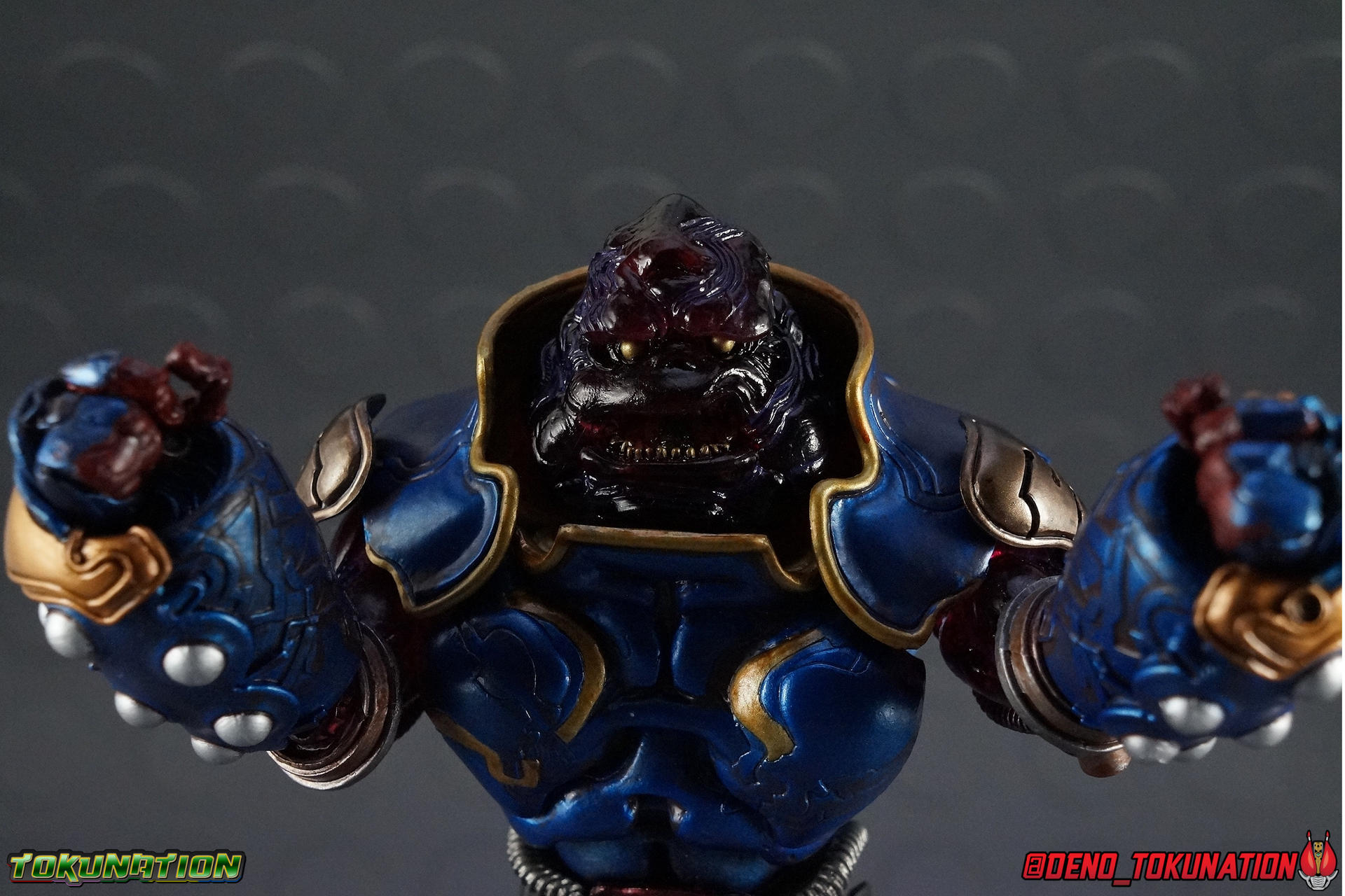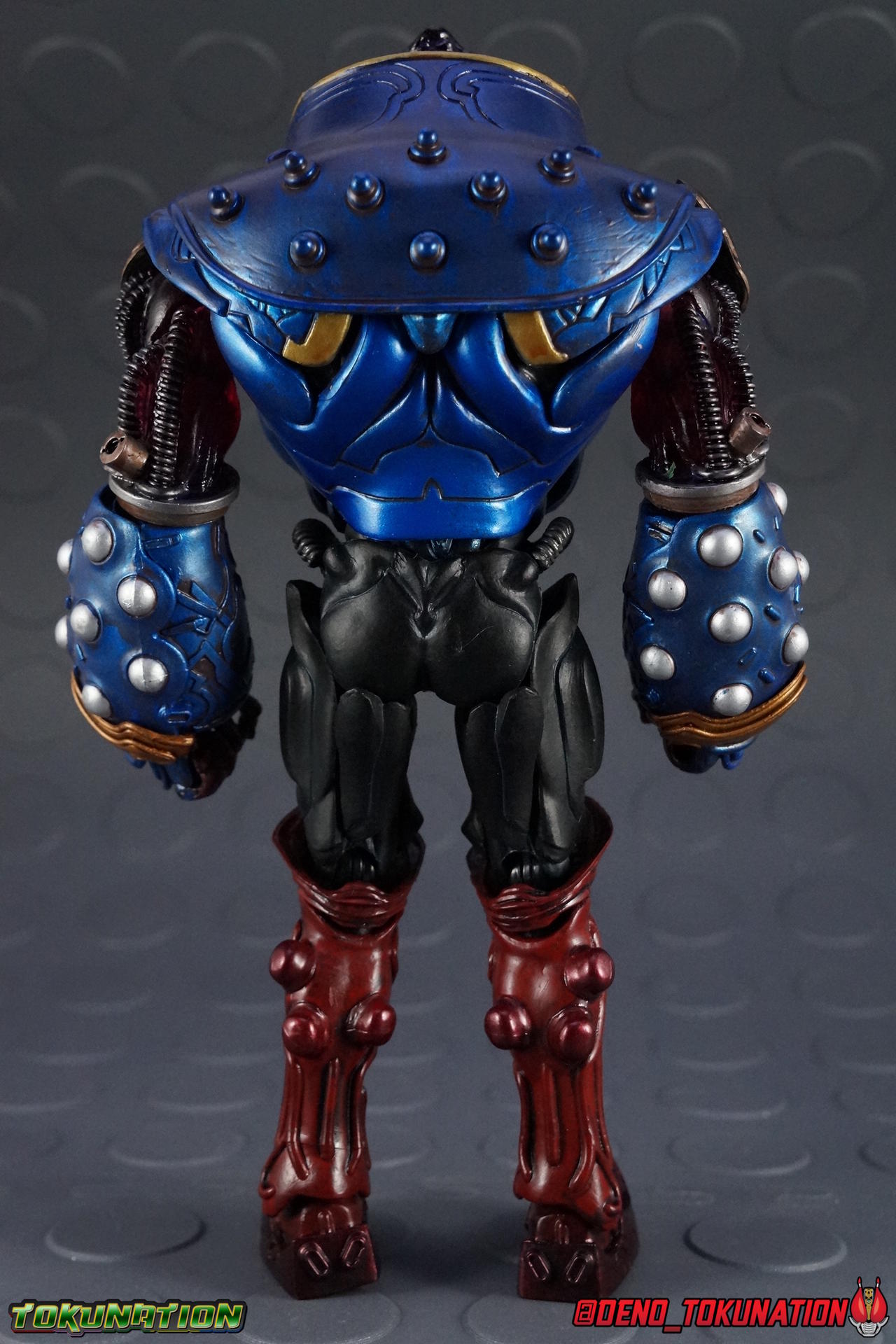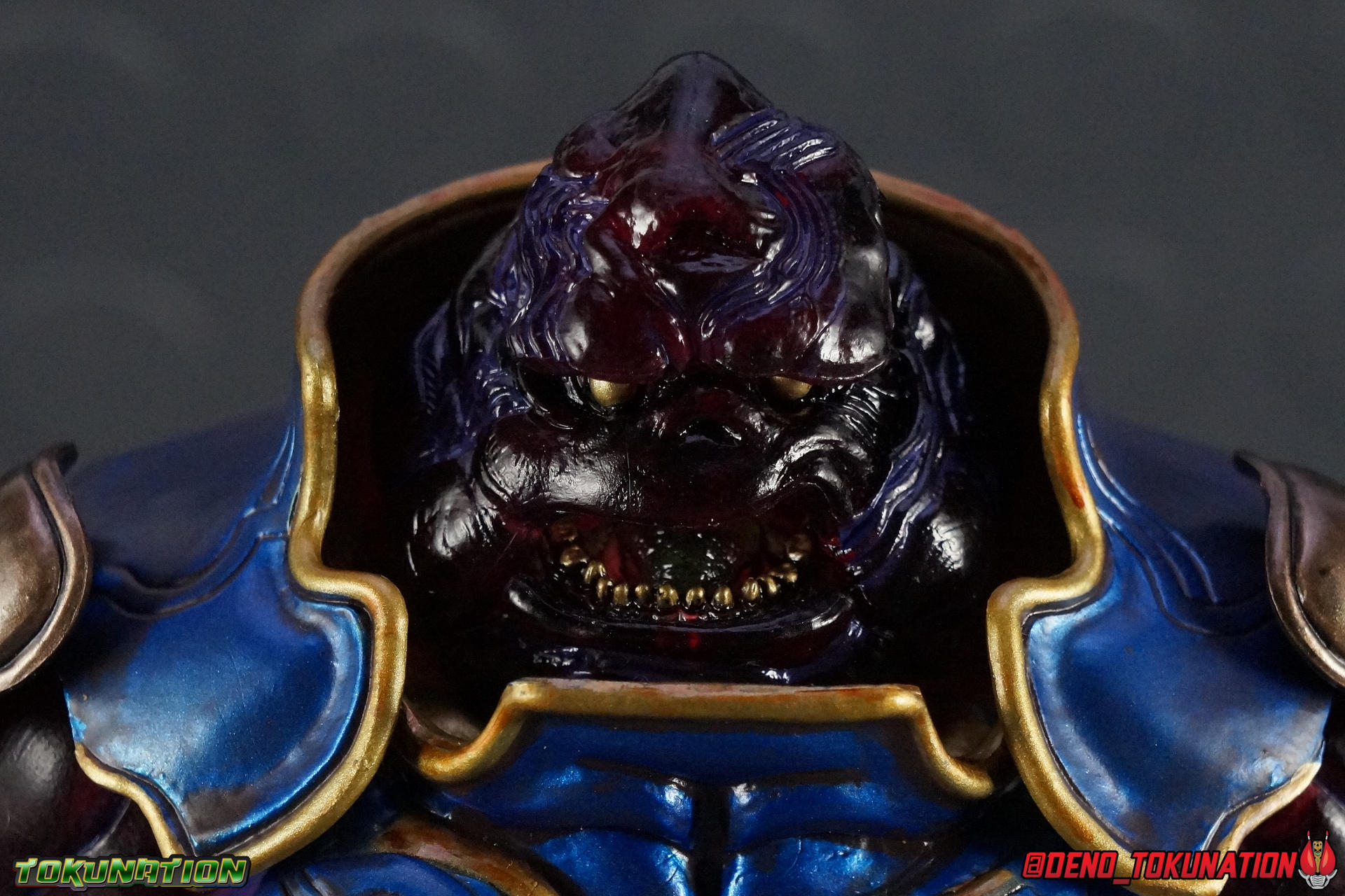 The classic 1975 Shotaro Ishinomori series Akumaizer 3 may not be something you're familiar with, but today that changes! The series stars Zabitan, a rogue member of the Demon Clan who has come from the Downworld to the human one, in order to become a hero. However he's initially pursued by 2 members of his clan's Internal Affairs, Ibiru & Gabura. While these 2 do initially hunt Zabitan, rather quickly (by episode 1's end) his code of honor and mercy win the duo over to his cause. Thus the Akumaizer 3 are formed! Rather oddly, although these characters are definitely demons, Zabitan himself is in fact half human as he has a human father. ![]() Akumaizer 3 was a brief footnote in Toei Tokusatsu history, running 38 episodes from 1975-76. But a very good one. So good in fact that it spawned a direct sequel in the form of Choujin Bibyun! A series which featured the Akumaizer 3 as new heroes, rewarded with human bodies in honor of their good deeds in their past life. While these 2 series don't receive much love these days, the Akumaizer 3 were dug up to be used as villains in Kamen Rider Wizard & Fourze Movie Wars Ultimatum. Their designs in that film were reminiscent of the S.I.C.S. but still very much their own thing. Now as with most all S.I.C. releases you'll see that the figures reviewed below are VERY different compared to their original show designs. The majority of S.I.C. designs are actually the brain child of the incredibly talented Takeyuki Takeya, whom you may recall designed all of the Roidmude for Kamen Rider Drive. His particular style has always been interesting and seeing it put to use redesigning these 70's Showa heroes is just incredible. The S.I.C. Akumaizer 3 figures are in fact the only high end poseable figures that have ever been made of the team as well. While these figures may not fit what you're looking for in terms of their classic appearances, you should read the review below to find out why they're so great. ** Post #1 is all Zabitan, #2 is Ibiru, & #3 is Gabura plus group shots Packaging As with most S.I.C.'s the box here is pretty huge. Granted this is also a pretty extensive 3-pack. But the box is just massive. The 3 figures are twist tied into the packaging with a separate parts tray for accessories. Be careful when removing older releases like this from box though as older S.I.C.s can be very fragile. Main Figures Zabitan- What you first need to know about these figures is that they're big. Like nearly 8" tall. S.I.C. prides itself on intricate detail and design flourishes so this 8" scale really helps set it apart even further from Bandai's other collector lines. The Chogokin implied by the "C" in S.I.C. obviously means there are diecast parts involved as well. On Zabitan those parts consist of the bronze colored shin guards, belt buckle, hip guards, shoulder pads, and forearm guards. Now they don't add much weight to this figure, but they do add, I don't know how to word it, a tiny bit of class perhaps? Regardless they don't improve or hinder the figure. With a S.I.C. of this age your expectations should be tempered in the first place. Older S.I.C.s tend to be fragile and easily broken. Tight joint tolerances/part fits and sometimes inconsistent quality can be a bad combination. And like many older S.I.C.'s articulation can be limited. Zabitan has some standard articulation himself, but it's hindered by his design. While he does have ball hips knees and ankles, his ankles are very loose, his knees are on a double joint that pulls out easily, and his hips don't have much back or outward range. It can be very difficult to get him into a dynamic stance with these issues. The upper body features a pretty nice waist and ab joint, but the shoulders pose more problems, the arms can only get up to about 45 degrees. The elbows pose a similar problem. So you get a pretty mixed bag articulation-wise out of Zabitan. The potential is there, the execution is not. But thankfully the head is on a peg to make exchanging it with the alternate ones easier, so it's mostly free of obstruction. Sidenote, the head originally attached tot he figure is actually one that represents an alternate state for Zabitan. This "standard" head is specifically a call back to episode 1 of the series when Master Mezalord used the Demon Crest to attempt to regain control of Zabitan. His skull began to crack and ripple from the strain so this head features that damage. The visor is also a bit larger and differently shaped on this head, a nod to how Zabitan's visor would change often from when he's not in combat to when he fights other members of the Demon Clan. An alternate and more towards show accurate head is included. As for the rest of the figure, a nice light blue paint wash is applied to black parts to draw out details, and a black wash is applied to the white parts. So it's a gorgeous looking figure, but one that ultimately doesn't function extraordinarily well. Ibiru - Ibiru shares many basic design similarities with Zabitan actually. His body is simply a bit more lean & slender. But ultimately the two are very very similar. Ibiru has all the same basic articulation and issues that come with it as Zabitan. Though I do feel he is more limited in the elbow area, and has weaker elbow joints, his shoulders seem much more free to rotate. His legs also feel a bit less restricted, though his ankles are just as weak. Ibiru also features diecast like Zabitan, though not in exactly the same spots (shins, forearms). But basically everything else about the two is the same from a design & execution standpoint. Ibiru even has a dark paint wash meant to bring out more details on the intricate suit. Speaking of the suit, just like Zabitan, Ibiru is a pretty interesting departure from the original costume. Though much like Zabitan it feels like a natural progression of the demon theme. The standard head attached to the body out of box is much like Zabitans in that it's more menacing than normal, but not 