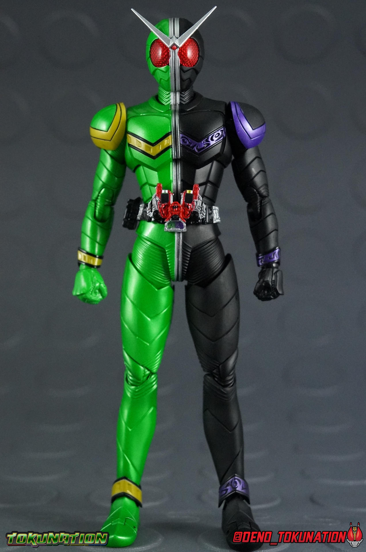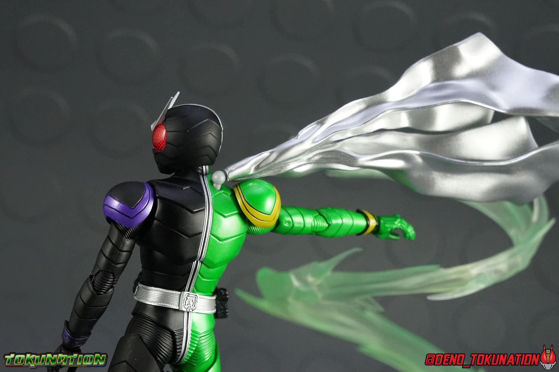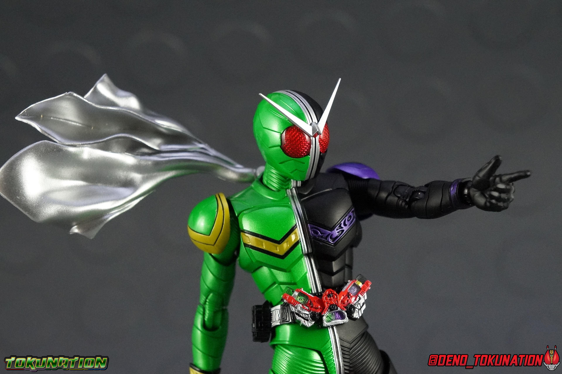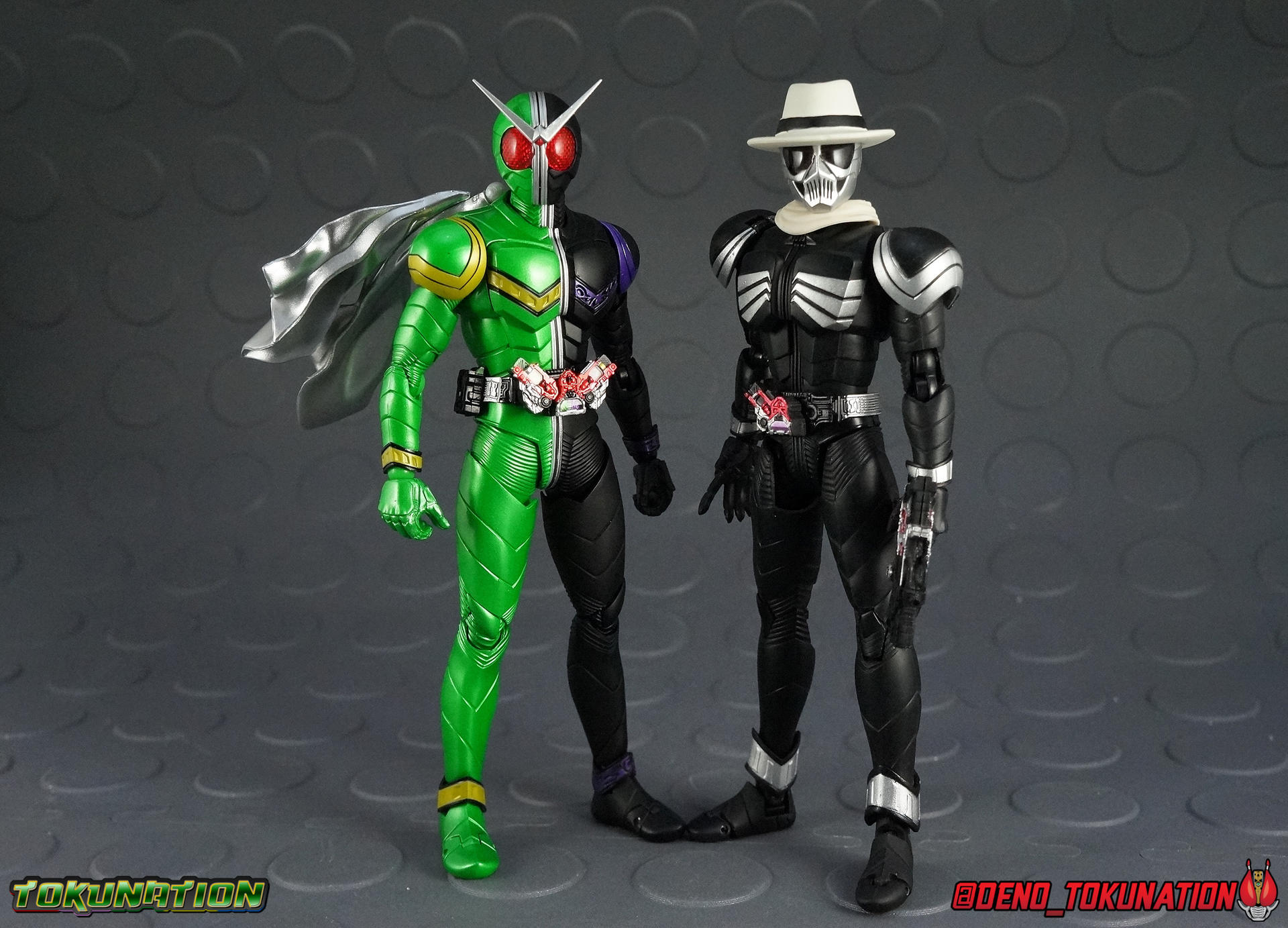 Once again Bandai have outdone themselves with another sophisticated modern update to a fan faovrite character. After years of being represented only by the original S.H. Figuart, collectors can finally upgrade their Kamen Rider W's with the S.H. Figuarts Shinkocchou Seihou Kamen Rider W! But is it the Figuart of year? Read on to find out that, yes, I think it is! Packaging The wonderful premium Shinkocchou Seihou packaging returns! If you've seen any of my recent reviews for Seihou Kuuga Ultimate or Seihou Gattack, etc etc, then you know I love this packaging, but it also isn't very different from release to release. Main Figure It's no secret that I have never been the biggest fan of Kamen Rider W. The show just didn't work for me on a number of levels. But I can respect that for many people it wound up being their access point into the franchise. And for those people more than most, there's been a glaring hole in their collection for years. A truly good SHF W. Well after 5 years of waiting, Bandai has finally rectified their mistakes. The original SHF W can go in the trash heap where it belongs, because Shinkocchou Seihou W is the renewal fans have deserved for years! This figure basically accurately recreates the suit you've seen in numerous episodes and movies down to it's finest details. I've said this many times with Shinkoccouh Seihou releases, but I truly think W is the peak of the line so far. In every conceivable way this figuart is a masterpiece. For a frame of reference, the original W Figuart was largely a product of it's time. A figure rushed to production with sloppy proportions, inaccurate details, no functional gimmicks, and an absolute dearth of accessories. In last 5 years this toyline has made huge strides towards striking the balance of accuracy & playability. And S.S. W is probably the peak at this point. For starters the S.S. release is completely the perfect shades of green & black. Finally after years of the ugly metallic on the original release, the S.S. embraces that wonderful shade of green and brings the suit design to life. Adding to this the gold & purple detailing are also the correct colors, the silver paint apps are on point, and the eyes are the correct shade of red. As you can see in the comparison shots below it's like night & day between these two. There is no comparison at this point, and then you look at the Double Driver. Not only does Seihou W feature an intricately detailed sculpt with appropriate paint apps for this device, it is entirely functional! Yes this Drive works just as it should including open slots for to-scale Gaia Memories to be used. This figuart includes (appropriately) the Cyclone & Joker memories, they fit into the slots very snugly as well so once in there they should be safe. But be careful when inserting them as they are easy to lose. The sides of the W Driver can fold down as well completing the look. If/when further W releases come out you'll be able to swap in their Gaia Memories as well, though obviously this figure can't split in half to form change. Now the Seihou W obviously has the look down, but does it have the functionality. Yes. In every sense of the word. Before now possibly the only poseable W figures released that could really pull off his signature poses and still look good doing it were the Master Grade Figurise model kit and perhaps the 12" Medicom figure. S.S. W has the articulation to pull off everything, and the proper sculpting for the joints needed for it to look perfect while doing so. How about those extending knee joints that look like a natural expansion of the costume, almost like fabric stretching? Or those seamless thigh swivels? Perhaps the masterful design of the shoulder pads & upper arms? Or the miraculous way the upper torso is designed. When I initially handled this figure I thought the torso was all one piece until I realized the upper body could move. It just looks that good in hand. This figure can pull off most any pose you recall the character making, and looks absolutely perfect while doing so. I've encountered a lot of truly great releases in the last year. But I believe this one takes the cake. Accessories 1 - Cyclone Gaia Memory. These small accessories can be used in either the Double Driver or the Maximum Drive slot on the right hip. They are extremely tiny, and extremely easy to lose. Do be careful with them. 1 - Joker Gaia Memory. These small accessories can be used in either the Double Driver or the Maximum Drive slot on the right hip. They are extremely tiny, and extremely easy to lose. Do be careful with them. 5 - sets of additional hands. Pretty much every iconic pose that W ever used. You couldn't ask for better character specific hands. 5 set's is just brilliant. As if the figure weren't already excellent enough, the hands just sell the body language it can pull off. 1 - muffler/scarf (short). The standard version of W's muffler. It can peg into the right shoulder blade and is hinged to move as needed. My only complaint about this smaller muffler is that it won't lay flat against W's back. It's molded in such a wavy position and the hinged joint it moves on doesn't allow for it to get very close to the main body. I get that W is known for his sweeping scarf in poses, but occasionally things do look more flat and static. I would have liked an alternate flattened scarf like we've seen in the past with numerous Showa Rider releases. 1 -muffler/scarf (long). Now this one is purely for cool posing. It's not really practical, especially due to it's considerable weight. The hinge on the peg can't entirely support it, so it can fall easily if moved to much. But it's not really a long term use accessory either. This one is obviously much larger and more wind swept. Honestly that's a pretty great set of accessories for W. I would say he should have included some effect parts, but the wind/cyclone Tamashii Act Effects that were released in tandem with him get the job done very wel