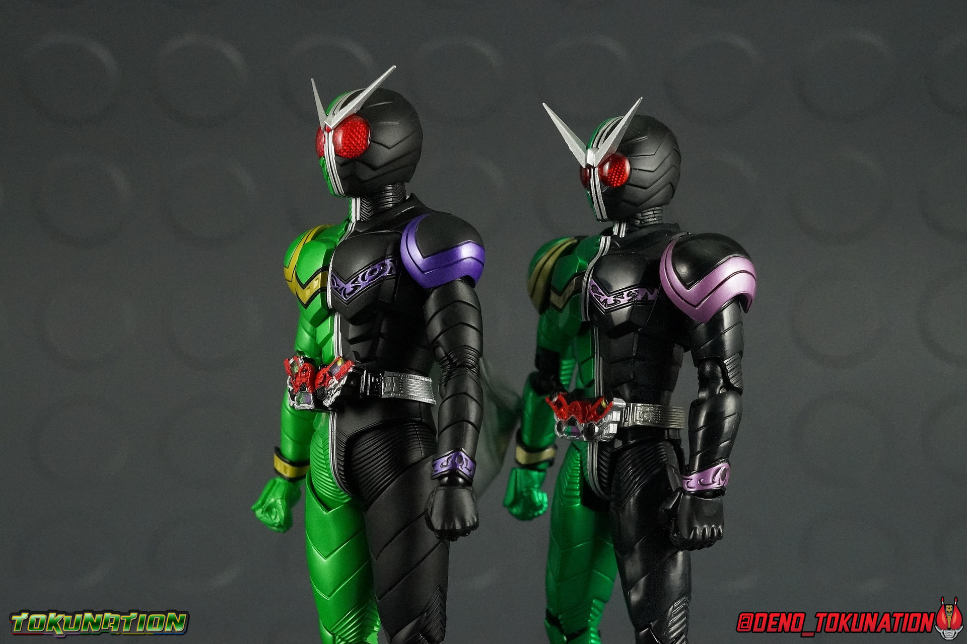 Once again Bandai have outdone themselves with another sophisticated modern update to a fan faovrite character. After years of being represented only by the original S.H. Figuart, collectors can finally upgrade their Kamen Rider W's with the S.H. Figuarts Shinkocchou Seihou Kamen Rider W! But is it the Figuart of year? Read on to find out that, yes, I think it is! Packaging The wonderful premium Shinkocchou Seihou packaging returns! If you've seen any of my recent reviews for Seihou Kuuga Ultimate or Seihou Gattack, etc etc, then you know I love this packaging, but it also isn't very different from release to release. Main Figure It's no secret that I have never been the biggest fan of Kamen Rider W. The show just didn't work for me on a number of levels. But I can respect that for many people it wound up being their access point into the franchise. And for those people more than most, there's been a glaring hole in their collection for years. A truly good SHF W. Well after 5 years of waiting, Bandai has finally rectified their mistakes. The original SHF W can go in the trash heap where it belongs, because Shinkocchou Seihou W is the renewal fans have deserved for years! This figure basically accurately recreates the suit you've seen in numerous episodes and movies down to it's finest details. I've said this many times with Shinkoccouh Seihou releases, but I truly think W is the peak of the line so far. In every conceivable way this figuart is a masterpiece. For a frame of reference, the original W Figuart was largely a product of it's time. A figure rushed to production with sloppy proportions, inaccurate details, no functional gimmicks, and an absolute dearth of accessories. In last 5 years this toyline has made huge strides towards striking the balance of accuracy & playability. And S.S. W is probably the peak at this point. For starters the S.S. release is completely the perfect shades of green & black. Finally after years of the ugly metallic on the original release, the S.S. embraces that wonderful shade of green and brings the suit design to life. Adding to this the gold & purple detailing are also the correct colors, the silver paint apps are on point, and the eyes are the correct shade of red. As you can see in the comparison shots below it's like night & day between these two. There is no comparison at this point, and then you look at the Double Driver. Not only does Seihou W feature an intricately detailed sculpt with appropriate paint apps for this device, it is entirely functional! Yes this Drive works just as it should including open slots for to-scale Gaia Memories to be used. This figuart includes (appropriately) the Cyclone & Joker memories, they fit into the slots very snugly as well so once in there they should be safe. But be careful when inserting them as they are easy to lose. The sides of the W Driver can fold down as well completing the look. If/when further W releases come out you'll be able to swap in their Gaia Memories as well, though obviously this figure can't split in half to form change. Now the Seihou W obviously has the look down, but does it have the functionality. Yes. In every sense of the word. Before now possibly the only poseable W figures released that could really pull off his signature poses and still look good doing it were the Master Grade Figurise model kit and perhaps the 12" Medicom figure. S.S. W has the articulation to pull off everything, and the proper sculpting for the joints needed for it to look perfect while doing so. How about those extending knee joints that look like a natural expansion of the costume, almost like fabric stretching? Or those seamless thigh swivels? Perhaps the masterful design of the shoulder pads & upper arms? Or the miraculous way the upper torso is designed. When I initially handled this figure I thought the torso was all one piece until I realized the upper body could move. It just looks that good in hand. This figure can pull off most any pose you recall the character making, and looks absolutely perfect while doing so. I've encountered a lot of truly great releases in the last year. But I believe this one takes the cake. Accessories 1 - Cyclone Gaia Memory. These small accessories can be used in either the Double Driver or the Maximum Drive slot on the right hip. They are extremely tiny, and extremely easy to lose. Do be careful with them. 1 - Joker Gaia Memory. These small accessories can be used in either the Double Driver or the Maximum Drive slot on the right hip. They are extremely tiny, and extremely easy to lose. Do be careful with them. 5 - sets of additional hands. Pretty much every iconic pose that W ever used. You couldn't ask for better character specific hands. 5 set's is just brilliant. As if the figure weren't already excellent enough, the hands just sell the body language it can pull off. 1 - muffler/scarf (short). The standard version of W's muffler. It can peg into the right shoulder blade and is hinged to move as needed. My only complaint about this smaller muffler is that it won't lay flat against W's back. It's molded in such a wavy position and the hinged joint it moves on doesn't allow for it to get very close to the main body. I get that W is known for his sweeping scarf in poses, but occasionally things do look more flat and static. I would have liked an alternate flattened scarf like we've seen in the past with numerous Showa Rider releases. 1 -muffler/scarf (long). Now this one is purely for cool posing. It's not really practical, especially due to it's considerable weight. The hinge on the peg can't entirely support it, so it can fall easily if moved to much. But it's not really a long term use accessory either. This one is obviously much larger and more wind swept. Honestly that's a pretty great set of accessories for W. I would say he should have included some effect parts, but the wind/cyclone Tamashii Act Effects that were released in tandem with him get the job done very wel