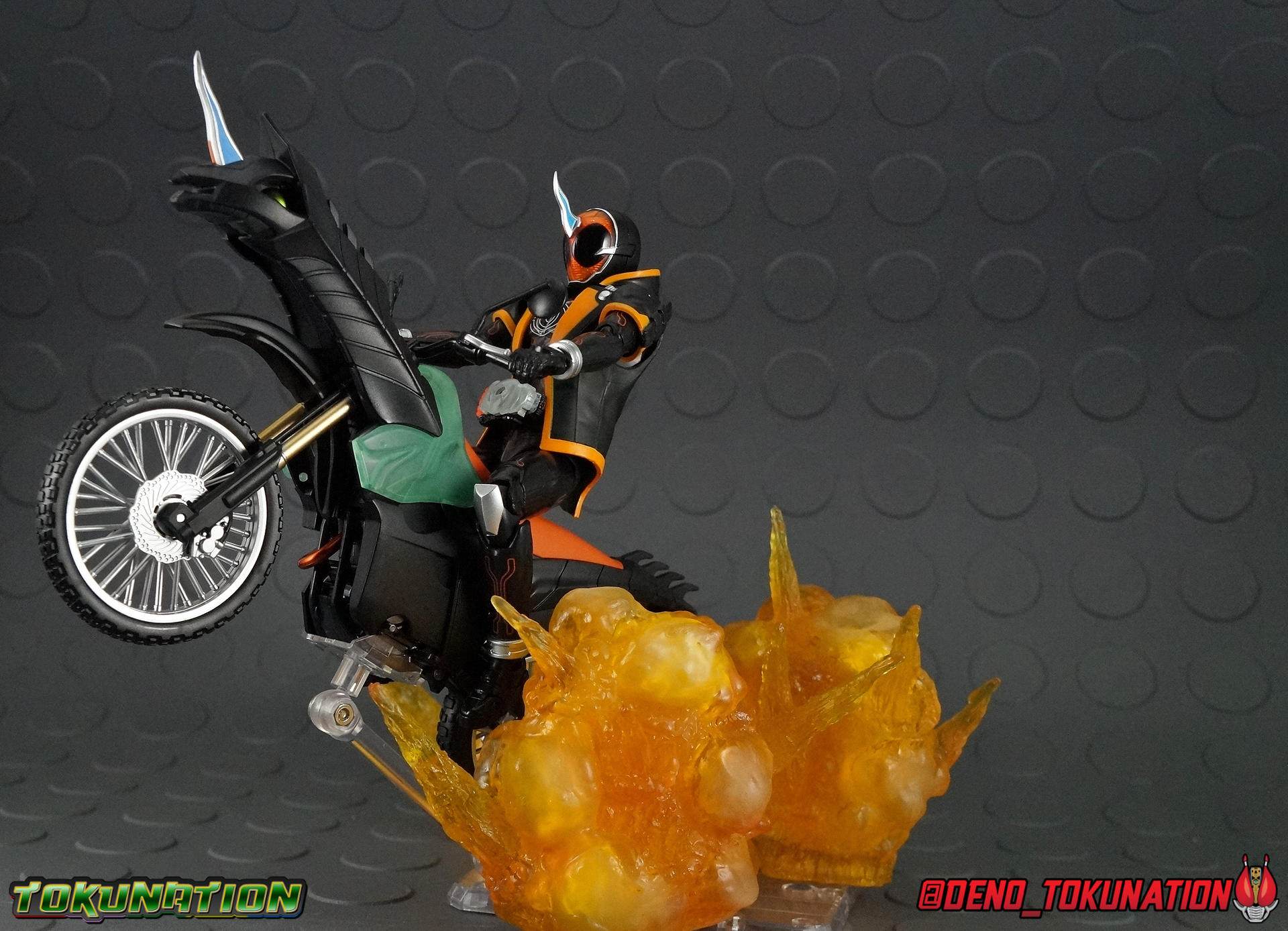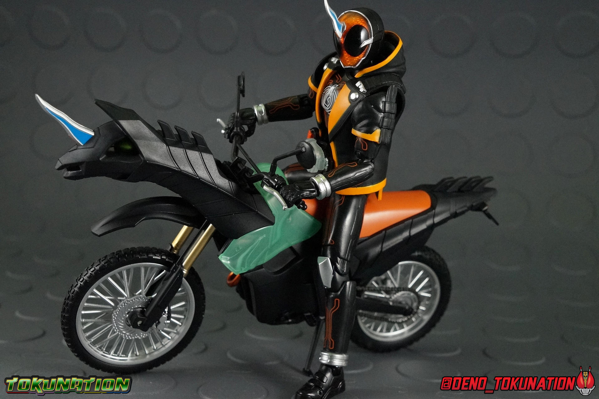 Packaging Fairly standard Ghost theme here. Nothing special to report, and stock photos for a bike are generally pretty boring anyway. Main Figure Rider Machine reviews are usually pretty easy, and this one is no different. Bikes rarely do much of anything new or noteworthy in execution. Transforming behemoths like Autovaijn, Darkraider, & the like being fantastic exceptions. But Machine Ghostriker is a totally by the numbers release. Keeping that in mind let's talk about the only thing we can really discuss with this piece, the details. Ghostriker has a fairly boring color scheme given it's unique design. I'd have loved to seen this bike in some more wacky colors. Using Ghost's standard black & orange with a hint of the Ghost Driver's opaque blue however is pretty unappealing. The Design itself is unique though. This horse theme is entirely new to rider machines, no previous bike I can think of uses this motif. The segmented skeletal nature of the horse comes into play only on the front end of the bike though. So the rest of it is, well, just a bike. And again, just a rather boring one. Ultimately there's not a lot to say about this machine that pictures can't express. It's a serviceable companion to any of your Ghost figuarts and will complete a display quite nicely. But if you're looking for intricacy or complexity, then you'll find it lacking. As always I welcome crisp paint apps, the working rear suspension, and a design that can (mostly) accommodate the figure of the rider it's intended for. Accessories As with almost any Rider Machine, Machine Ghostriker includes next to nothing. 1 - wheel base. Just the standard type included with most Rider Machines for stability. 1 - Tamashii Stage Adapter. This adapter clamps onto the underside of the bike pretty securely and allows you to put it in some more dyamic poses. But it's uses are limited as well That's not much, but it is very much in line with the types of accessories usually included with Figuarts bikes. Final Thoughts As with every release in the Ghost lineup, I waited for this one to hit a pretty deep clearance before buying it. I probably should have waited longer though. S.H. Figuarts Machine Ghostriker doesn't really set itself apart much from other bikes, there's no Captain Ghost for it to combine with, and it doesn't come with any meaningful accessories. This release is totally unnecessary unless you just want to go all in on Kamen Rider Ghost, otherwise, I'd say take a hard pass on it. If you must buy Machine Ghostriker though, I would advise you wait for a sub-2000 yen discount first.