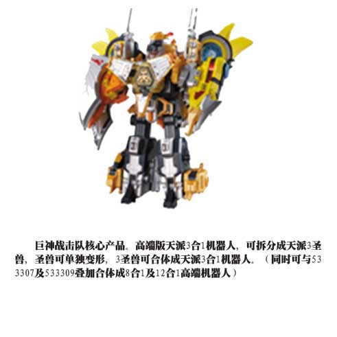 More details posted: http://www.tokunation.com/showthread.php?t=1304 This week, the products had just gone up pre-ordering at Taobao.com. Robot series Giant team robot "Formed by five saint animals. There's a mid-mode that formed by three. Also combine with Sky team and Earth team to form 8-in-1 robot or 12-in-1 robot." Sky team robot "Formed by three saint animals.* Also combine with Giant team and Earth team to form 8-in-1 robot or 12-in-1 robot." Earth team robot "Formed by four saint animals. Also combine with Giant team and Sky team to form 12-in-1 robot." Robots in show Figure series "155mm of height, 11 points of articulation, come with weapons" Morphing/transform/henshin scrolls "Spring loaded gimmick, lights & sounds, magnetic sensing, film projection " Weapons "Press to trigger extention, lights & sounds" "Pull string to trigger flying saucer , lights & sounds" weapons are kinda old school......