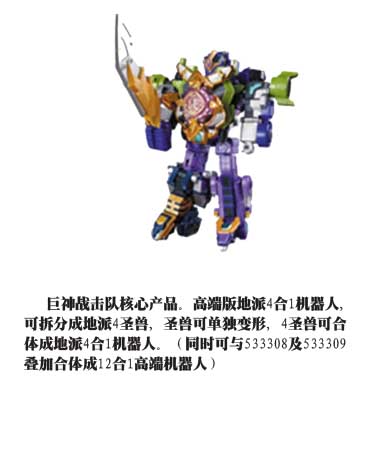 More details posted: http://www.tokunation.com/showthread.php?t=1304 This week, the products had just gone up pre-ordering at Taobao.com. Robot series Giant team robot "Formed by five saint animals. There's a mid-mode that formed by three. Also combine with Sky team and Earth team to form 8-in-1 robot or 12-in-1 robot." Sky team robot "Formed by three saint animals.* Also combine with Giant team and Earth team to form 8-in-1 robot or 12-in-1 robot." Earth team robot "Formed by four saint animals. Also combine with Giant team and Sky team to form 12-in-1 robot." Robots in show Figure series "155mm of height, 11 points of articulation, come with weapons" Morphing/transform/henshin scrolls "Spring loaded gimmick, lights & sounds, magnetic sensing, film projection " Weapons "Press to trigger extention, lights & sounds" "Pull string to trigger flying saucer , lights & sounds" weapons are kinda old school......