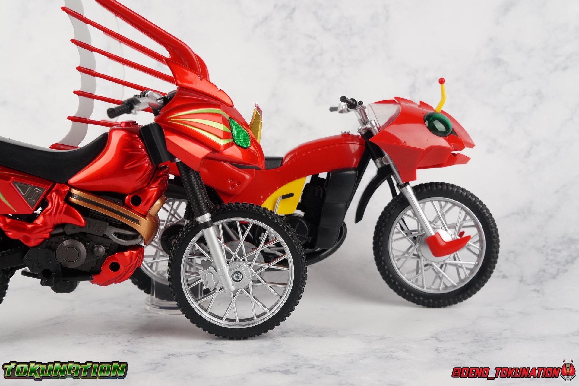 Packaging Jungraider comes in a pretty slick box that fits in well with the retail release of Omega. While Rider Machines rarely do much and the stock photos instead focus on the rider, the Jungraider still manages to look great in these shots. While we're here though, yes, the box does say "Junglaider". And while that appears to be the official romanization of the name, much like "Akarenger" we can infer the proper spelling from context. Showa Amazon's bike was named the Jungler, this bike is named Jungraider obviously as combination of the words Jungle & Raider. That classic flipped "L" & "R" in Japanese is what's caused that nonsensical english name for the bike. Jungraider is clearly the intent. Much like how Amazon "Alpha" is clearly meant to be the Alpha to Haruka's Omega and not the rather silly spelling of "Alfa" that's on his box. Main Figure The Jungraider, like many Rider Machines, is a very basic release. It's not a gimmick bike, it doesn't transform like Dragranzer or Auto-Vaijin. It's just a standard figuarts bike. But wow is it a sexy one. And one you've probably seen before, whether you realized it or not. Both in show and in toy form, the Jungraider is heavily based upon the Gills Raider. That's right, the actual show prop Jungraider is built from is the Gills Raider used by Kamen Rider Gills in Kamen Rider Agito. It's physically the same bike with cosmetic changes. And awesomely enough, so is the figuart! At it's core S.H. Figuarts Jungraider is still a Gills Raider, a nearly 7 year old toy! You can see where the molding diverges in the side detailing but the core engine block of the bike is identical, right down to the nice hefty die-cast parts. It still kind of blows my mind, but this bike just looks so different that sometimes it's hard to even se the similarities. As I said Jungraider is a gorgeous machine. The new detailing added to this mold give it a very nice hybrid organic/machine look, much like the Amazons themselves. And wow do the compound eyes on this beauty shine. They pop more than most rider figuarts. I've included some side by side comparison shots of the Jungraider with it's Showa counterpart the Jungler so you can see where the design influence comes from. While Jungraider still has the tail fins they're much smaller, likewise the "head" of the bike is clearly based on it's rider, it's just that in the Jungraider's case it doesn't have a mouth that opens with missiles in it like Jungler. And honestly that's about all there is to say about the bike itself. It's a wonderful modern update to a classic design that fits right into the world of the current Amazons. It looks fantastic with Amazon Omega, and considering in Amazons Season 2 that Amazon Neo has an almost identical bike, I think it's safe to say that an eventual figuarts Neo will look great with it to. One minor complaint is that because this is such an old mold, and rider figuarts are generally larger these days, Omega does look almost too big for it. But I'll let the picture do the rest of the talking. Accessories Thankfully the Jungraider includes the only 2 things that were really missing from Amazon Omega! 1 - Wheel base. The standard sized one nearly all Rider machines come with these days to stabilize the rear tire. 1 - Tamashii Stage Adapter. One specifically made for this bike that hooks onto the undercarriage to allow for dynamic action shots. 1 - Battler Grip (Whip). The whip form of the Battler is based on Showa Amazon's classic Condorer Rope. This one however is made of a flexible plastic that will hold it's shape much more easily allowing you to capture some nice curved poses with it. 1 - Battler Grip (Sickle). By far my favorite version of the Grip, the Sickle just seems to be a much more savage weapon. And given how Omega used it in show, that's appropriate. So really the Jungraider doesn't come with much for itself, but then it doesn't really need to. The extra accessories for Omega should help incentive people who would otherwise pass on this release to get it for completion. I wanted the bike anyway, but the weapons are a great bonus. Final Thoughts Now nicely enough Amazon Neo from Amazons Season 2 rides the same type of Jungraider as Haruka/Omega. The ONLY difference being the eye color. Omega's Jungraider has green eyes whereas Neo's has yellow eyes. I can easily see this bike being repainted with the yellow eyes, and coming with at least some kind of one-off weapon accessory for Neo and probably being a Web Exclusive to boot. And I'd still buy it. This is a really sharp looking bike that I'd be happy to own more than one of. If you see S.H. Figuarts Jungraider out there for a decent price, I say pick it up to complete your Amazons display!