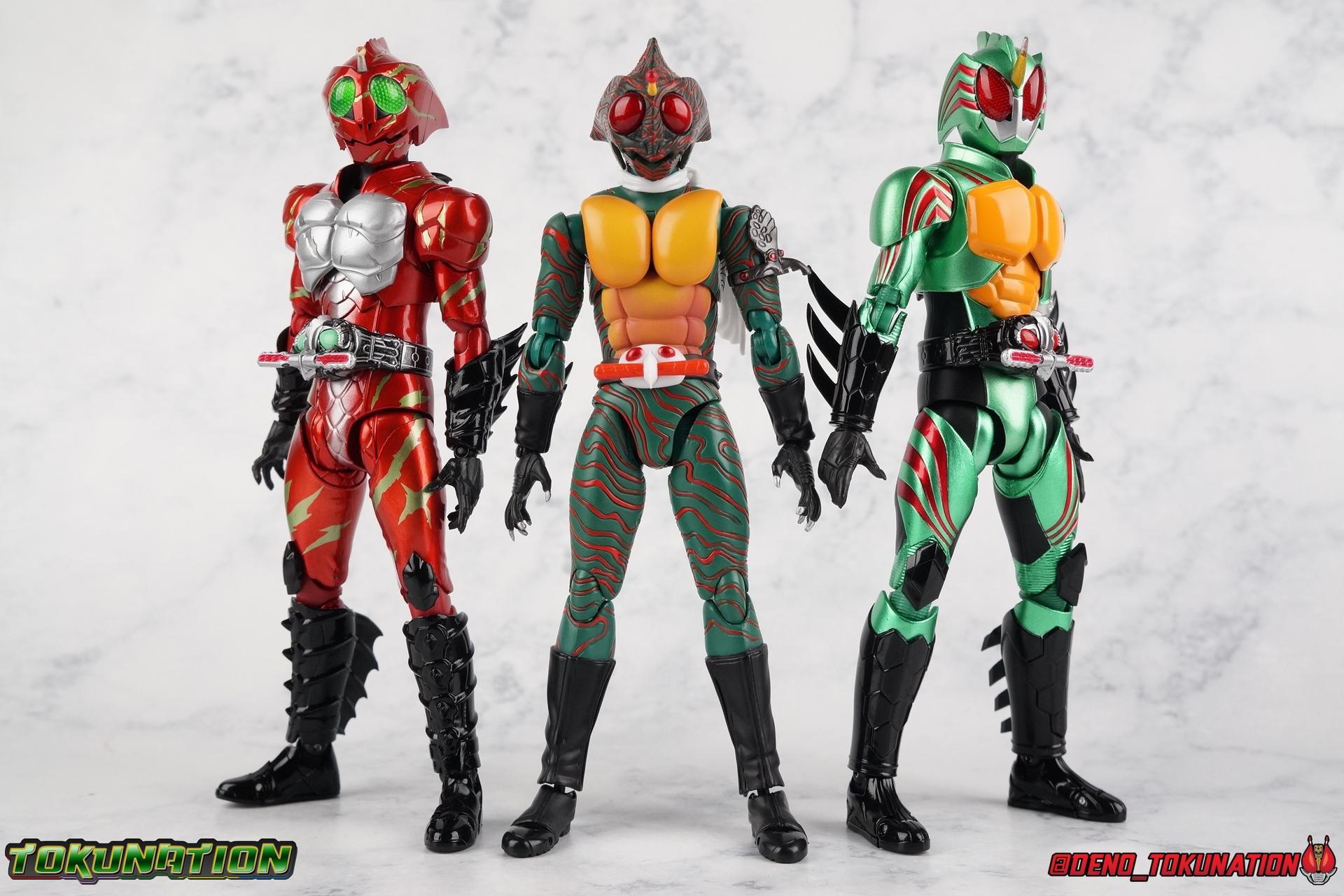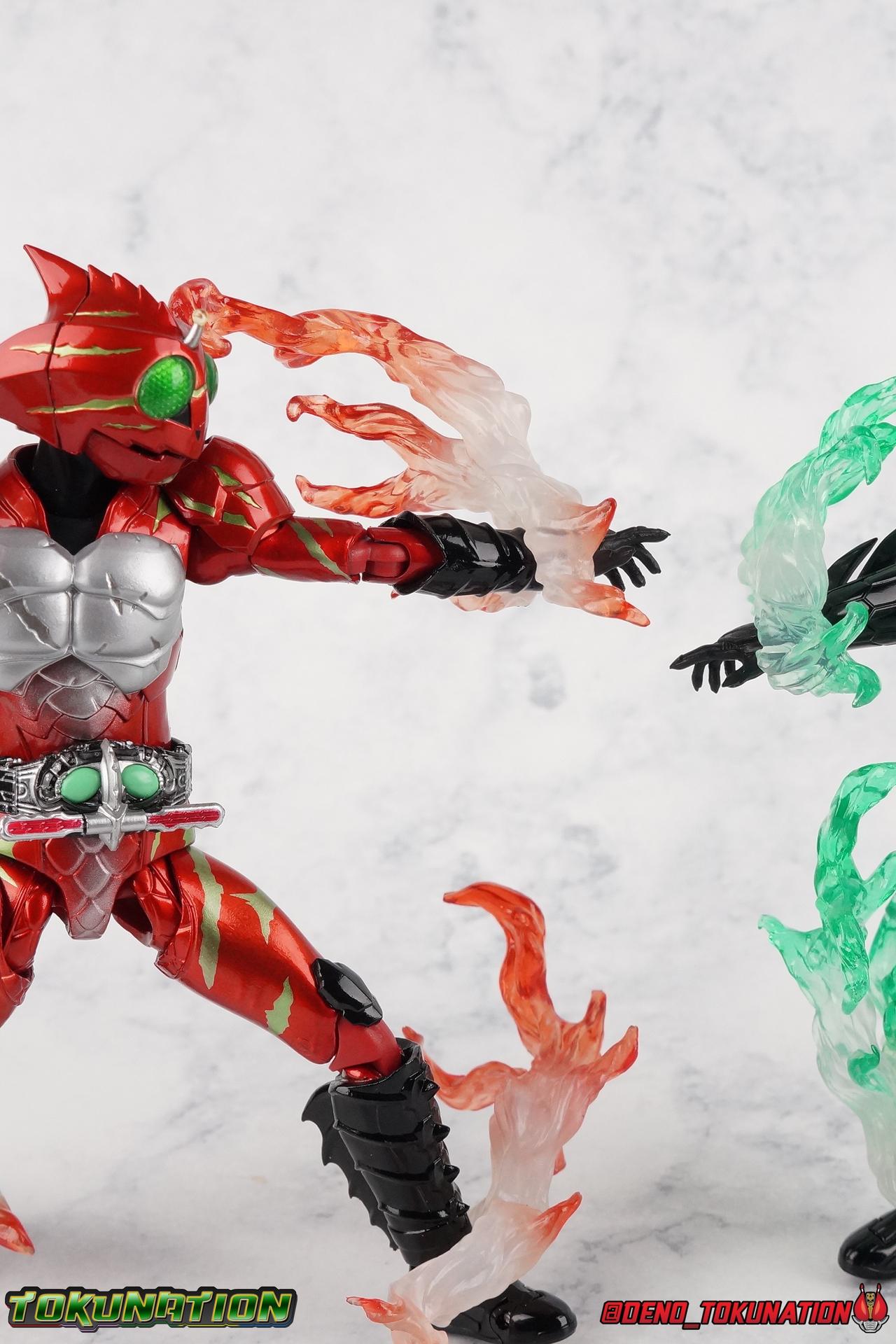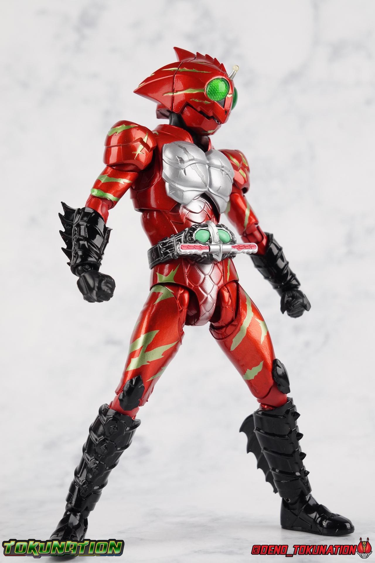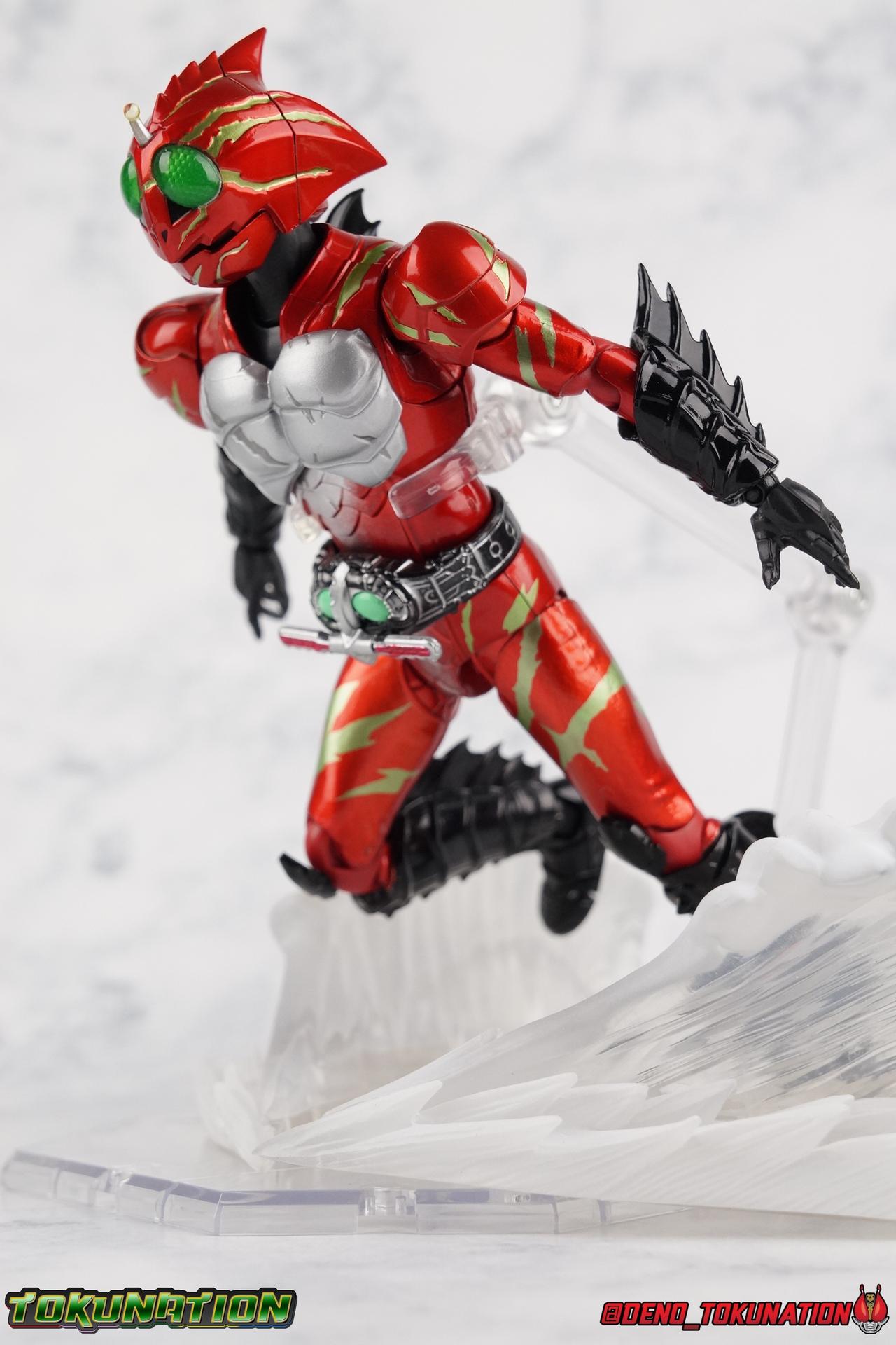 We have officially entered the Armor Zone people! This marks our 3rd full gallery from the fantastic Amazon Japan series Kamen Rider Amazons. This week saw confirmation of yet another figure from the show with the Mole Amazon, and season 2 is well under way with an exciting 2nd episode. And at long last we're going to take a look at the other sometimes heroic but often savage rider from season 1 with S.H. Figuarts Kamen Amazon Alpha (Amazon JP Edition)! Packaging This version of Amazon Alpha comes in a special corrugated brown box. Just like the Amazon JP release of Amazon Omega. Going further back even Showa Amazon received this kind of special release. But as I said Alpha is packed in the exact same style of box as Omega, which is a bit wider than the normal retail release because of some additional red flame effects. But ultimately it's pretty plain looking compared to the standard retail version. While we're here let's address the erroneous english spelling of his name on the box, "Alfa". Clearly the intent with his name is for it to be Alpha to Haruka's Omega. "Alfa" seems to stem from soem sort of mis-translation into english equivalence, but much like "Junglaider" which should be properly spelled as Jungraider, we can easily infer the correct intent of the name. Main Figure I'm so happy to have finally had the time to look at both Amazon Omega & Alpha in the same week! It's been great photographing both of them and Jungraider all in the same stretch. I loved Amazons season 1 as it aired and I'm already hooked by season 2, so handling the figure right now is perfect. Omega was a less than perfectly executed release, but one that still looks fantastic. Let's see how Alpha stacks up. Amazon Alpha is a design that more closely resembles the original Showa Amazon. While Omega had a similar color scheme, it's clear that Alpha is the more direct homage. In fact, specifically, Alpha is based on the S.I.C. Hero Saga exclusive form of Pre-Amazon. A form which doesn't use the Gigi Armlet, is 1/3 as powerful as the full Amazon, and the user will die in 3 days if the armlet is not obtained. So they went very obscure for his inspiration, but it works. It's clearly the direct inspiration for this rider as I noted way back when it was first revealed last year. As for the figure itself, Alpha is just about as solid a release as Omega was. I take more issue with Alpha's leg design than Omega though. Sadly Alpha has some weirdly stunted ankles that can't quite bend back. The very tip of his heel points upward and impact the fins on the backs of his legs., making it difficult to balance him on occasion. Adding to this is the somewhat limited hips. Where Omega looked like he was wearing a diaper but had functional legs, Alpha is visually better looking but his hips impact the waist too soon to be really dynamic. The Amazons Driver is once again gorgeous with this release. The colors are inverted from Omega so it gives Jin's driver a nice weathered look to it. You don't really notice how different the 2 are until you see them like this. The right grip on the driver is removable like Omega's, though Alpha includes no Battler Grip weapons. Alphas' torso articulation is where he gets a leg up on Omega. Omega felt a bit stiff and limited by the more mechanical looking nature of his torso armor. Whereas Alpha has a more organic feel too him and is less bulky, the upper body rotates around the abdomen really well. I love it when you can get figuarts in like wild feral looking poses and Alpha is great for that. Alpha also has some excellently molded scaring on his torso that I think a lot of people expected to just be paint apps. Thankfully Bandai went the extra mile. Alphas' Arms are designed a bit better than Omega's in my opinion as well. Omega had this pesky habit of his shoulder pads popping off when you stretched the arm out too far, and they were on a friction tab that moved so getting them back was difficult. Alpha's shoulder pads are on ball joints making matters much more manageable. You get the same great range out of the elbow and wrists otherwise, unfortunately the ball joints on the wrists like to pop completely apart on mine every time I change the hands. Finally, Amazon Alpha's head is just spot on. Whereas Omega's felt a bit squished, Alpha's is just right. And thankfully his neck is designed with articulation in mind this time, so you can actually arch his head back or down to the side quite easily. You can see Jin's personality shine through in moments like that. As with Omega I feel like this figuart does a great job of capturing the characters screen presence and body language, just slightly better even than Omega. But frankly they're both wonderful representations of these riders. I'm very much ready for Amazon Sigma and Mole Amazon now. Accessories Even as a retail release Amazon Alpha included a ton of stuff, but this edition also includes some bonus effects! 4 - sets of hands. That's 2 types of open hands, and two sets of "holding things" hands that can be used for something I'm sure. But Alpha doesn't include any Battler Grip weapons, and doesn't ride a Jungraider in show. So really the holding hands aren't superfluous here. i let him borrow a weapon from Omega for my photos. 1 - Violent Slash effect part. It clips right on over the forearm blades on either arm and can be a little snug. So just be careful when removing it. 1 - Set of Red Flame Effects. This set is a recolor of the popular Tamashii Flame Effects tailor made for Amazon Alpha's Amazon Japan edition. Amazon Omega also includes a set of them in Green to match his armor. Obviously that's a pretty great pack of accessories, even if Alpha doesn't have a lot of variety the same Omega did. He still comes with quite a lot. Though after seeing the upcoming Mole Amazon and his burger accessory I'm astounded that Alpha didn't come with some eggs to chow down on. Final Thoughts S.H. Figuarts Kamen Rider Amazon Alpha is a fantastic 