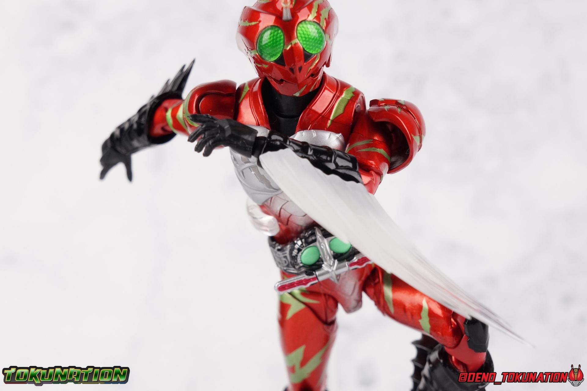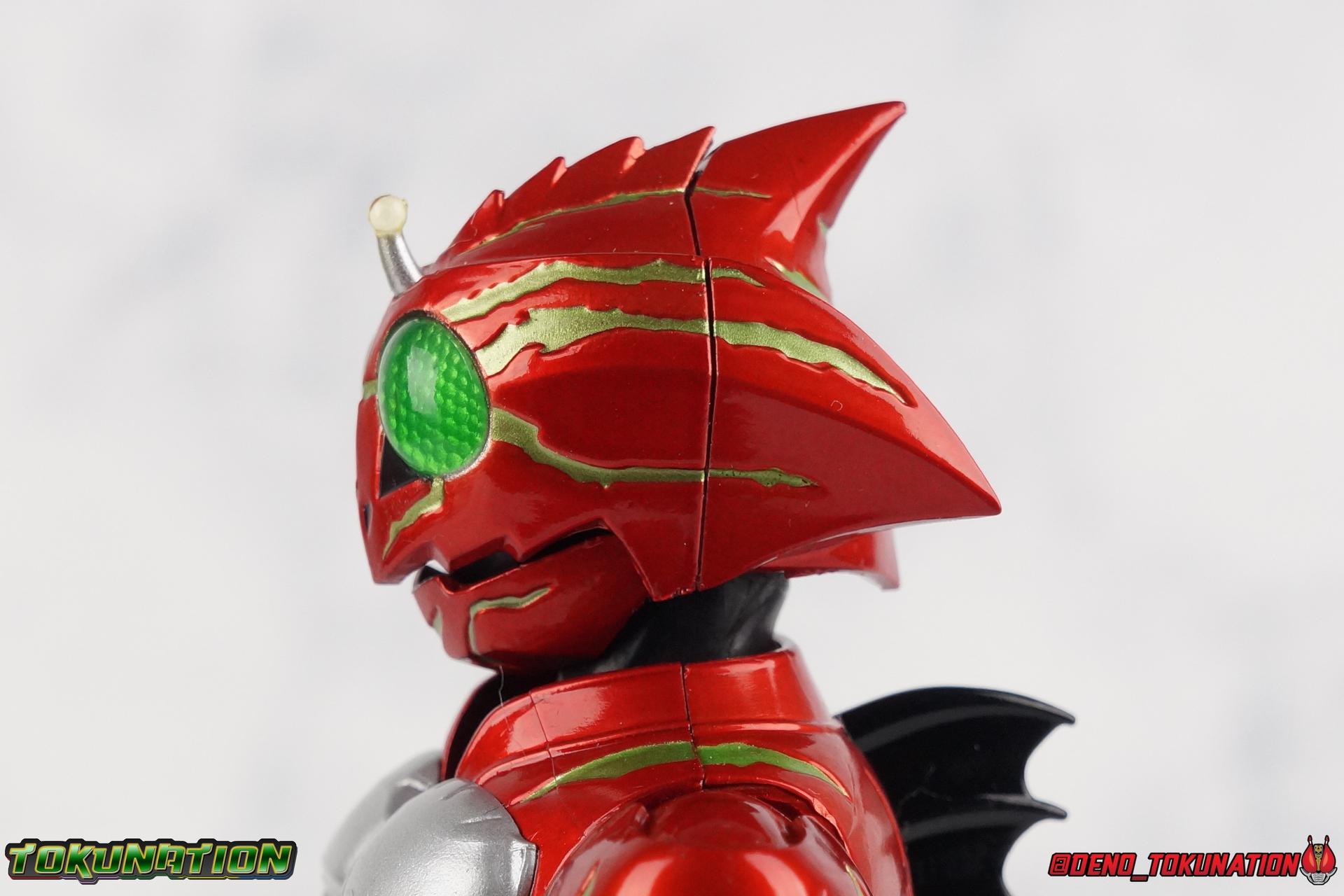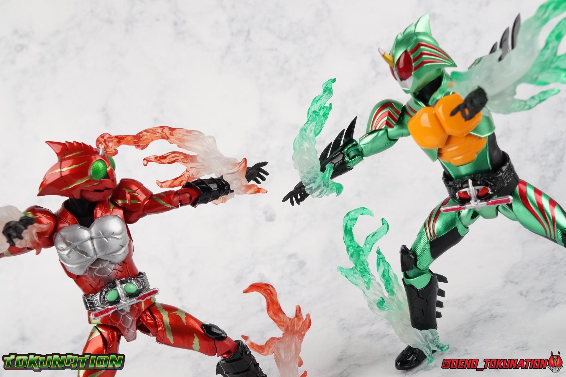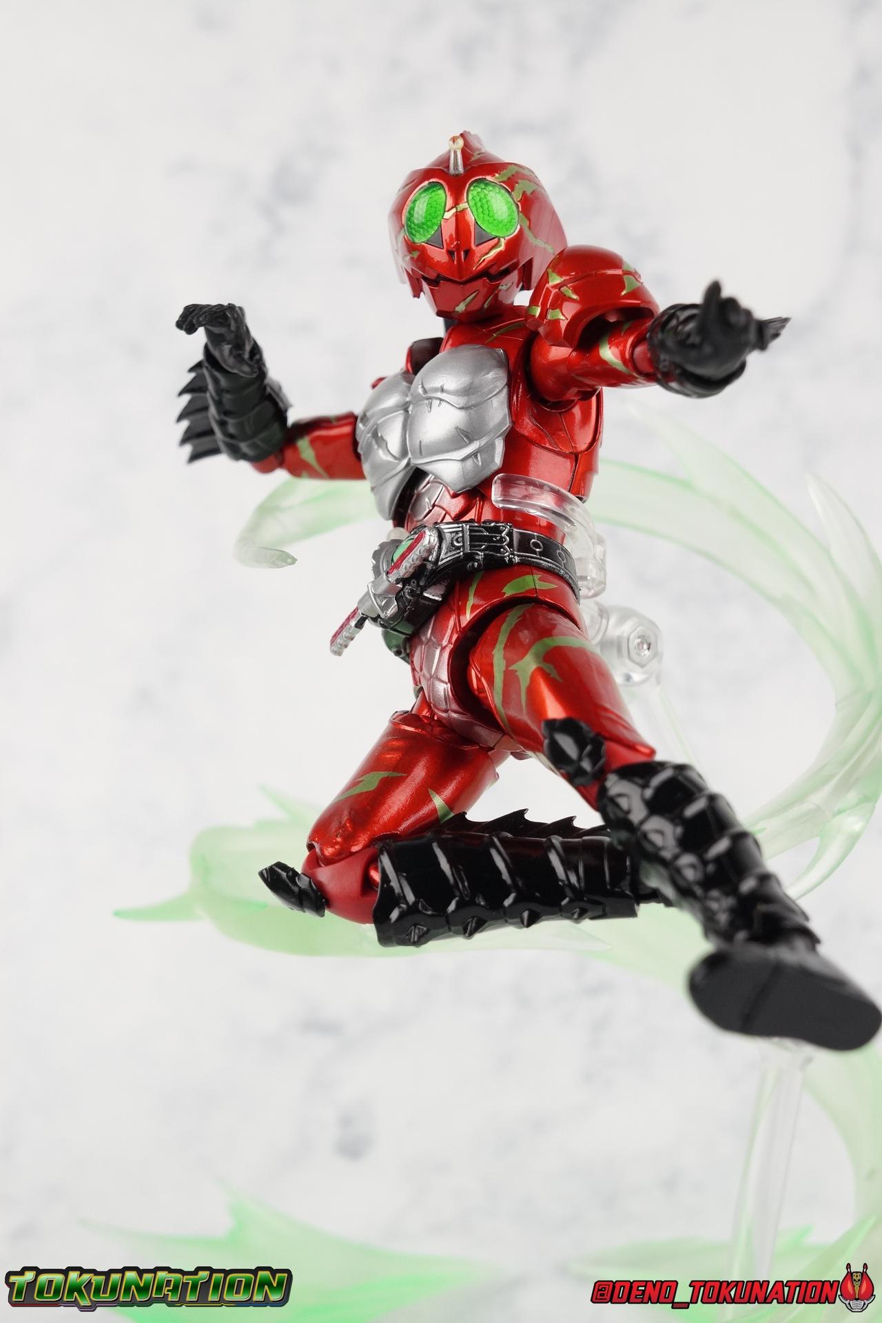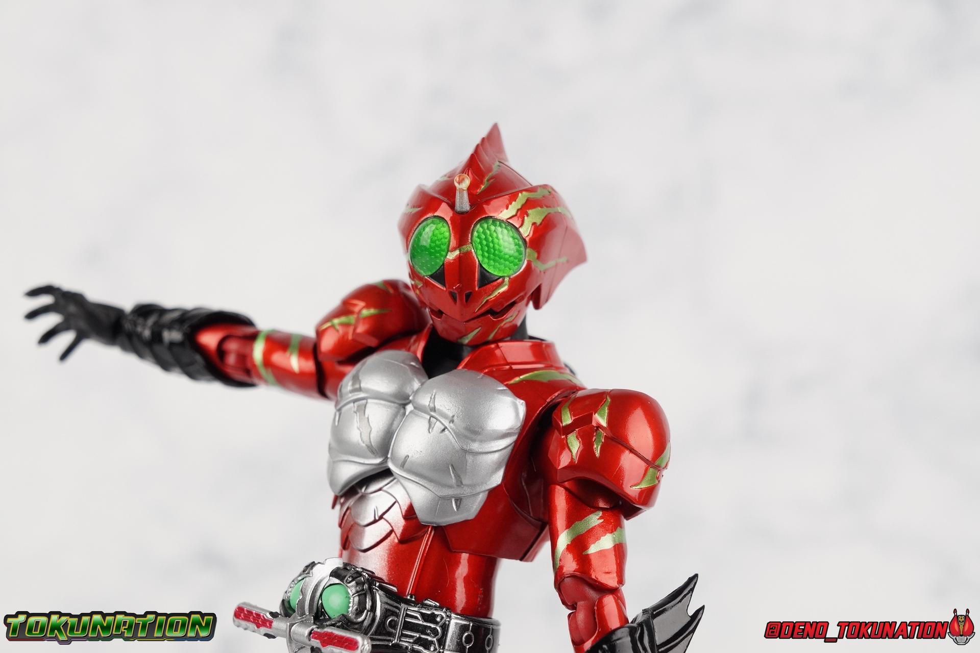 We have officially entered the Armor Zone people! This marks our 3rd full gallery from the fantastic Amazon Japan series Kamen Rider Amazons. This week saw confirmation of yet another figure from the show with the Mole Amazon, and season 2 is well under way with an exciting 2nd episode. And at long last we're going to take a look at the other sometimes heroic but often savage rider from season 1 with S.H. Figuarts Kamen Amazon Alpha (Amazon JP Edition)! Packaging This version of Amazon Alpha comes in a special corrugated brown box. Just like the Amazon JP release of Amazon Omega. Going further back even Showa Amazon received this kind of special release. But as I said Alpha is packed in the exact same style of box as Omega, which is a bit wider than the normal retail release because of some additional red flame effects. But ultimately it's pretty plain looking compared to the standard retail version. While we're here let's address the erroneous english spelling of his name on the box, "Alfa". Clearly the intent with his name is for it to be Alpha to Haruka's Omega. "Alfa" seems to stem from soem sort of mis-translation into english equivalence, but much like "Junglaider" which should be properly spelled as Jungraider, we can easily infer the correct intent of the name. Main Figure I'm so happy to have finally had the time to look at both Amazon Omega & Alpha in the same week! It's been great photographing both of them and Jungraider all in the same stretch. I loved Amazons season 1 as it aired and I'm already hooked by season 2, so handling the figure right now is perfect. Omega was a less than perfectly executed release, but one that still looks fantastic. Let's see how Alpha stacks up. Amazon Alpha is a design that more closely resembles the original Showa Amazon. While Omega had a similar color scheme, it's clear that Alpha is the more direct homage. In fact, specifically, Alpha is based on the S.I.C. Hero Saga exclusive form of Pre-Amazon. A form which doesn't use the Gigi Armlet, is 1/3 as powerful as the full Amazon, and the user will die in 3 days if the armlet is not obtained. So they went very obscure for his inspiration, but it works. It's clearly the direct inspiration for this rider as I noted way back when it was first revealed last year. As for the figure itself, Alpha is just about as solid a release as Omega was. I take more issue with Alpha's leg design than Omega though. Sadly Alpha has some weirdly stunted ankles that can't quite bend back. The very tip of his heel points upward and impact the fins on the backs of his legs., making it difficult to balance him on occasion. Adding to this is the somewhat limited hips. Where Omega looked like he was wearing a diaper but had functional legs, Alpha is visually better looking but his hips impact the waist too soon to be really dynamic. The Amazons Driver is once again gorgeous with this release. The colors are inverted from Omega so it gives Jin's driver a nice weathered look to it. You don't really notice how different the 2 are until you see them like this. The right grip on the driver is removable like Omega's, though Alpha includes no Battler Grip weapons. Alphas' torso articulation is where he gets a leg up on Omega. Omega felt a bit stiff and limited by the more mechanical looking nature of his torso armor. Whereas Alpha has a more organic feel too him and is less bulky, the upper body rotates around the abdomen really well. I love it when you can get figuarts in like wild feral looking poses and Alpha is great for that. Alpha also has some excellently molded scaring on his torso that I think a lot of people expected to just be paint apps. Thankfully Bandai went the extra mile. Alphas' Arms are designed a bit better than Omega's in my opinion as well. Omega had this pesky habit of his shoulder pads popping off when you stretched the arm out too far, and they were on a friction tab that moved so getting them back was difficult. Alpha's shoulder pads are on ball joints making matters much more manageable. You get the same great range out of the elbow and wrists otherwise, unfortunately the ball joints on the wrists like to pop completely apart on mine every time I change the hands. Finally, Amazon Alpha's head is just spot on. Whereas Omega's felt a bit squished, Alpha's is just right. And thankfully his neck is designed with articulation in mind this time, so you can actually arch his head back or down to the side quite easily. You can see Jin's personality shine through in moments like that. As with Omega I feel like this figuart does a great job of capturing the characters screen presence and body language, just slightly better even than Omega. But frankly they're both wonderful representations of these riders. I'm very much ready for Amazon Sigma and Mole Amazon now. Accessories Even as a retail release Amazon Alpha included a ton of stuff, but this edition also includes some bonus effects! 4 - sets of hands. That's 2 types of open hands, and two sets of "holding things" hands that can be used for something I'm sure. But Alpha doesn't include any Battler Grip weapons, and doesn't ride a Jungraider in show. So really the holding hands aren't superfluous here. i let him borrow a weapon from Omega for my photos. 1 - Violent Slash effect part. It clips right on over the forearm blades on either arm and can be a little snug. So just be careful when removing it. 1 - Set of Red Flame Effects. This set is a recolor of the popular Tamashii Flame Effects tailor made for Amazon Alpha's Amazon Japan edition. Amazon Omega also includes a set of them in Green to match his armor. Obviously that's a pretty great pack of accessories, even if Alpha doesn't have a lot of variety the same Omega did. He still comes with quite a lot. Though after seeing the upcoming Mole Amazon and his burger accessory I'm astounded that Alpha didn't come with some eggs to chow down on. Final Thoughts S.H. Figuarts Kamen Rider Amazon Alpha is a fantastic 