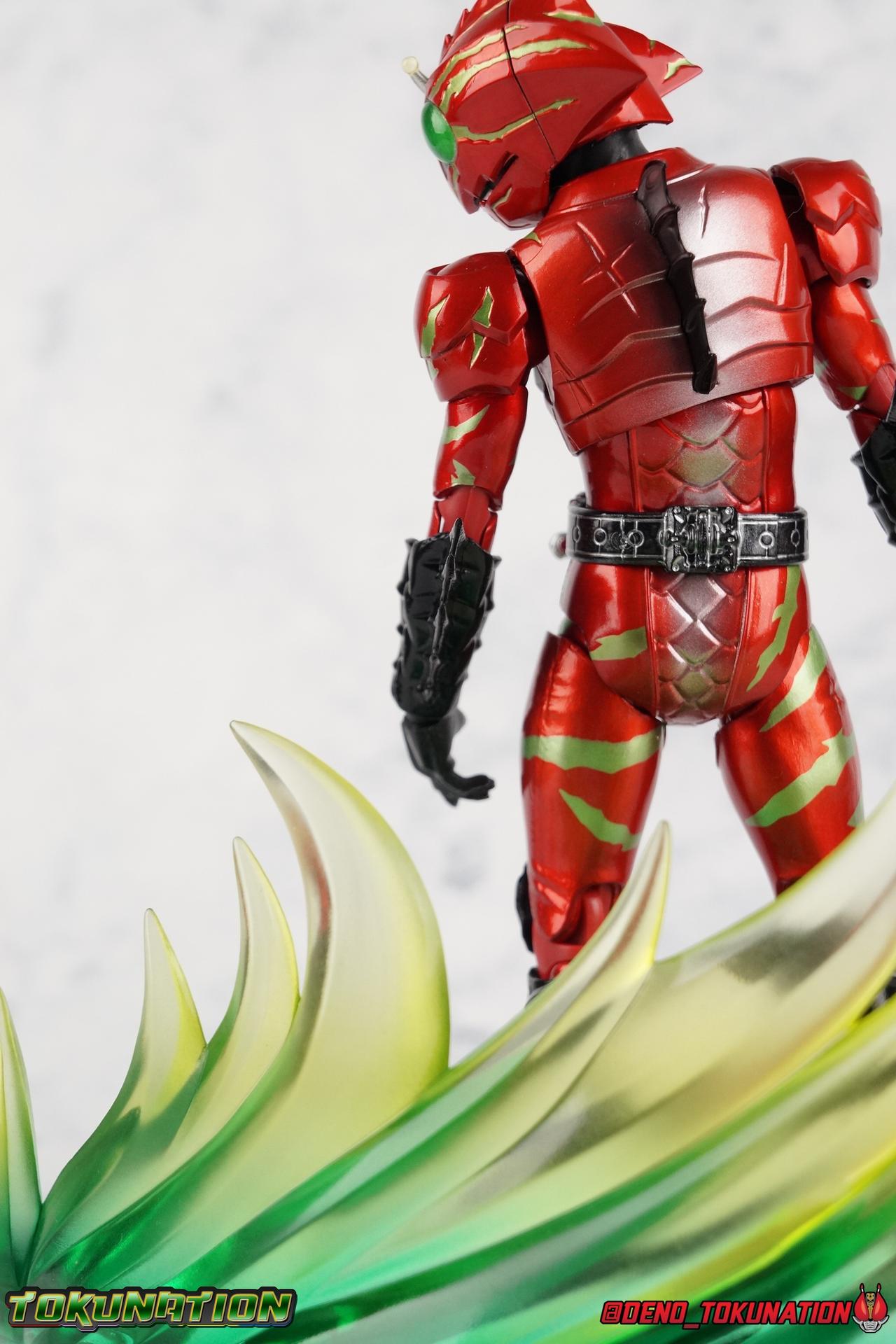 We have officially entered the Armor Zone people! This marks our 3rd full gallery from the fantastic Amazon Japan series Kamen Rider Amazons. This week saw confirmation of yet another figure from the show with the Mole Amazon, and season 2 is well under way with an exciting 2nd episode. And at long last we're going to take a look at the other sometimes heroic but often savage rider from season 1 with S.H. Figuarts Kamen Amazon Alpha (Amazon JP Edition)! Packaging This version of Amazon Alpha comes in a special corrugated brown box. Just like the Amazon JP release of Amazon Omega. Going further back even Showa Amazon received this kind of special release. But as I said Alpha is packed in the exact same style of box as Omega, which is a bit wider than the normal retail release because of some additional red flame effects. But ultimately it's pretty plain looking compared to the standard retail version. While we're here let's address the erroneous english spelling of his name on the box, "Alfa". Clearly the intent with his name is for it to be Alpha to Haruka's Omega. "Alfa" seems to stem from soem sort of mis-translation into english equivalence, but much like "Junglaider" which should be properly spelled as Jungraider, we can easily infer the correct intent of the name. Main Figure I'm so happy to have finally had the time to look at both Amazon Omega & Alpha in the same week! It's been great photographing both of them and Jungraider all in the same stretch. I loved Amazons season 1 as it aired and I'm already hooked by season 2, so handling the figure right now is perfect. Omega was a less than perfectly executed release, but one that still looks fantastic. Let's see how Alpha stacks up. Amazon Alpha is a design that more closely resembles the original Showa Amazon. While Omega had a similar color scheme, it's clear that Alpha is the more direct homage. In fact, specifically, Alpha is based on the S.I.C. Hero Saga exclusive form of Pre-Amazon. A form which doesn't use the Gigi Armlet, is 1/3 as powerful as the full Amazon, and the user will die in 3 days if the armlet is not obtained. So they went very obscure for his inspiration, but it works. It's clearly the direct inspiration for this rider as I noted way back when it was first revealed last year. As for the figure itself, Alpha is just about as solid a release as Omega was. I take more issue with Alpha's leg design than Omega though. Sadly Alpha has some weirdly stunted ankles that can't quite bend back. The very tip of his heel points upward and impact the fins on the backs of his legs., making it difficult to balance him on occasion. Adding to this is the somewhat limited hips. Where Omega looked like he was wearing a diaper but had functional legs, Alpha is visually better looking but his hips impact the waist too soon to be really dynamic. The Amazons Driver is once again gorgeous with this release. The colors are inverted from Omega so it gives Jin's driver a nice weathered look to it. You don't really notice how different the 2 are until you see them like this. The right grip on the driver is removable like Omega's, though Alpha includes no Battler Grip weapons. Alphas' torso articulation is where he gets a leg up on Omega. Omega felt a bit stiff and limited by the more mechanical looking nature of his torso armor. Whereas Alpha has a more organic feel too him and is less bulky, the upper body rotates around the abdomen really well. I love it when you can get figuarts in like wild feral looking poses and Alpha is great for that. Alpha also has some excellently molded scaring on his torso that I think a lot of people expected to just be paint apps. Thankfully Bandai went the extra mile. Alphas' Arms are designed a bit better than Omega's in my opinion as well. Omega had this pesky habit of his shoulder pads popping off when you stretched the arm out too far, and they were on a friction tab that moved so getting them back was difficult. Alpha's shoulder pads are on ball joints making matters much more manageable. You get the same great range out of the elbow and wrists otherwise, unfortunately the ball joints on the wrists like to pop completely apart on mine every time I change the hands. Finally, Amazon Alpha's head is just spot on. Whereas Omega's felt a bit squished, Alpha's is just right. And thankfully his neck is designed with articulation in mind this time, so you can actually arch his head back or down to the side quite easily. You can see Jin's personality shine through in moments like that. As with Omega I feel like this figuart does a great job of capturing the characters screen presence and body language, just slightly better even than Omega. But frankly they're both wonderful representations of these riders. I'm very much ready for Amazon Sigma and Mole Amazon now. Accessories Even as a retail release Amazon Alpha included a ton of stuff, but this edition also includes some bonus effects! 4 - sets of hands. That's 2 types of open hands, and two sets of "holding things" hands that can be used for something I'm sure. But Alpha doesn't include any Battler Grip weapons, and doesn't ride a Jungraider in show. So really the holding hands aren't superfluous here. i let him borrow a weapon from Omega for my photos. 1 - Violent Slash effect part. It clips right on over the forearm blades on either arm and can be a little snug. So just be careful when removing it. 1 - Set of Red Flame Effects. This set is a recolor of the popular Tamashii Flame Effects tailor made for Amazon Alpha's Amazon Japan edition. Amazon Omega also includes a set of them in Green to match his armor. Obviously that's a pretty great pack of accessories, even if Alpha doesn't have a lot of variety the same Omega did. He still comes with quite a lot. Though after seeing the upcoming Mole Amazon and his burger accessory I'm astounded that Alpha didn't come with some eggs to chow down on. Final Thoughts S.H. Figuarts Kamen Rider Amazon Alpha is a fantastic 