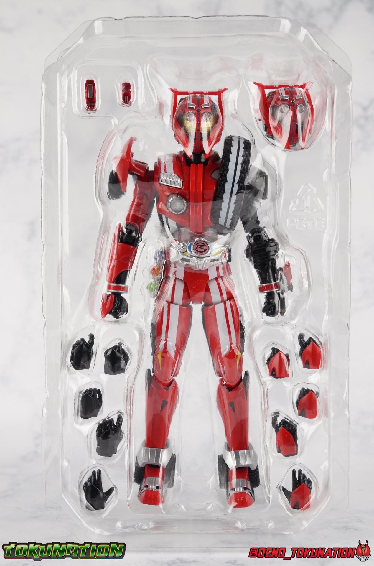 It's been a long time coming but we're proud to finally present a gallery of Kamen Rider Drive's final form with S.H. Figuarts Kamen Rider Drive Type Tridoron (Tire Blending Set)! Unlike many Heisei riders, Drive has yet to gain a new form that appears in a film after the end of his series, that also seems to exceed the power of his original final form. Den-O went from Liner to Super Climax, Fourze went from Cosmic to either of the two Fusion States, Wizard went from Infinity to Infinity All Dragon, etc. Plenty of riders have gotten yet another form that seems to exceed the power of their series' final form. Drive has only received one additional form of his own since the end of the TV series proper, and that was Kamen Rider Zero Drive, which is actually a precursor to even the most basic Drive form, Proto-Drive. So it's refreshing to see that the hulking power-house of Type Tridoron has yet to be outclassed! Let's dive into the figure below! **This gallery contains over 100 images! So it's split across 3 posts. Feel free to peruse them at your leisure. Packaging Type Tridoron continues the steadfast tradition of Drive packaging we've come to know and love over the last 2+ years. Those slick black boxes with a subtle racing theme and killer stock photos. Tridoron's box is a bit thicker in this case because it's specifically the Tire Blending (Tire Kakimazerl) release. So it includes several blended tires for accessories, making the trays a bit thicker. Main Figure It's pretty satisfying to finally have this bad boy in hand. Drive has shaped up to have one of my favorite toylines to date so I'm especially pleased we've finally made it to his final form. Drive Type Tridoron finally rounds out the slew of TV series forms for our heroes. We're left now with only a handful of releases to wait for. But as as is I'm pretty pleased with what we've gotten in Tridoron. Despite what appear to be cumbersome thick feet, the tire ankles actually serve their purpose very well. They balance this figure magnificently, and they still rock side to side a decent amount. Though wide angle stances aren't going to work as well as you'd probably like, the feet won't quite lay flat. The legs are the standard we've seen from this line so far, but the knee pads irk me to no end since they constantly pop off. The Drive Driver & Shift Car holster are identical to previous uses of those molds. The only difference with the driver is the new Type Tridoron read out. It still works just like any other release of the driver in that the face can be replaced. Sadly the arms disappoint me. They're asymmetrical both in design and functionality. They look great, but the left arm can only just manage a 90 degree angle. The second bend in the arm is neutered by the shift tire peg style molding on the forearm. The right arm fares a bit better, but not by much. The arms just aren't super dynamic. Luckily the shoulders are great, even though the Tire has been placed much further over for this outing the left arm doesn't suffer from that. The right is also free of obstruction thanks to the hinge that the fender/bumper part is on. The new chest detailing to replicate Tridoron's front bumper looks fantastic, It's a nice scale representation of what the Tridoron itself looks like. And of course there's that magnificent head. I know a lot of people didn't care for the elongated design itself, but I absolutely adore it. And those gorgeous compound eyes as well. But I think the one bit of detailing I might love most about this figure is the back side of it. It's designed to resemble the undercarriage of the Tridoron itself and it looks incredible. Right down to the small license plate type application on the back of Drive's head. All in all this is a fantastic mold. And I'm glad to see it's getting some mild reuse with the Heart Type Miracle release. I'd love to see another repaint of this mold out down the line but they'll need to make up a new V-cinema form for me to get something that awesome. Drive Type Tridoron is yet another fantastic figure in this great line. Accessories Since this is the more deluxe styled Tire Blending set, Type Tridoron comes with a number of accessories. Everything you could have hoped for: 5 - sets of additional hands. Each set has one red right hand and one black left hand. I love that the asymmetry of this suit carries all the way down to such a minute detail like the hands. You get basically everything you need with this kind of selection as well. 1 - Alternate Krim Head. This extra head represents Krim's control of this form, which was only really demonstrated in show a few times. Primarily we saw it in Drive's final clash with the Freeze Roidmude. The only difference with this head is the bright red compound eyes. It's an extra accessory that totally didn't have to be includde but that I'm very grateful to have as an option. 1 - Trailer Cannon. A straight repack of the accessory included with Type Formula."] It operates exactly the same as before and can accept Shift Cars. 1 - Shift Speed. An extra of this shift car to be used with the included Trailer Cannon, it can be slotted into the cannon just as you could with Type Formula. 1 - Shift Tridoron. An extra of this shift car to be used with the included Trailer Cannon, it can be slotted into the cannon just as you could with Type Formula. 1 - Attack 1 2 3 Tire. A blend of the Midnight Shadow, Max Flare, & Funky Spike Tires. As with any tire that's compatible with Type Tridoron, you just need to split it apart to attach it to his chest/shoulder. 1 - People Saver Tire. A blend of the Mad Doctor, Fire Braver & Justice Hunter Tires. As with any tire that's compatible with Type Tridoron, you just need to split it apart to attach it to his chest/shoulder. 1 - Construction Site (Kouji Genbar) Tire. A blend of the Rumble Dump, Spin Mixer, & Rolling Gravity Tires. As with any tire that's compatible with Type Tridoron, you just need to split it apart to attach it