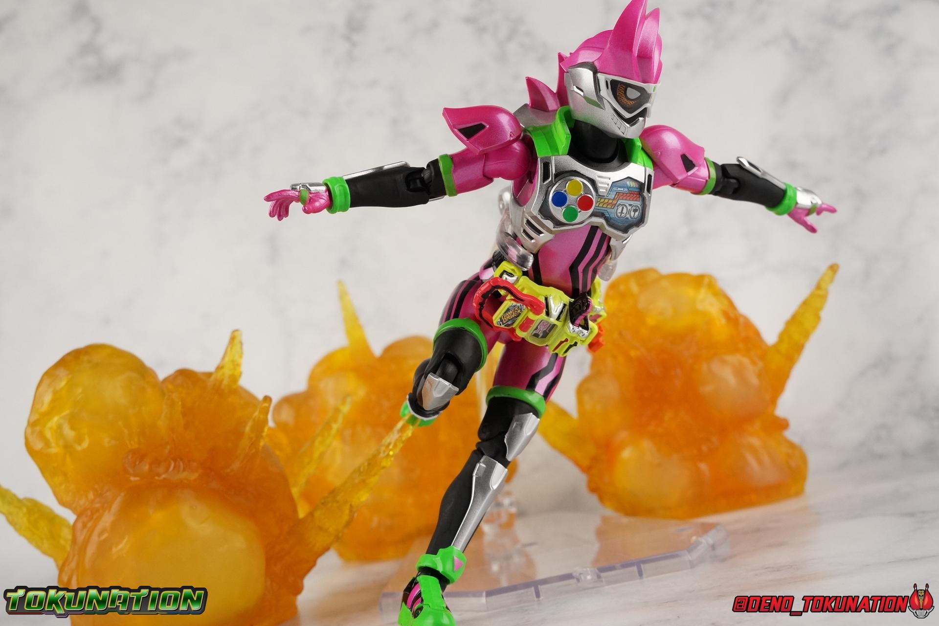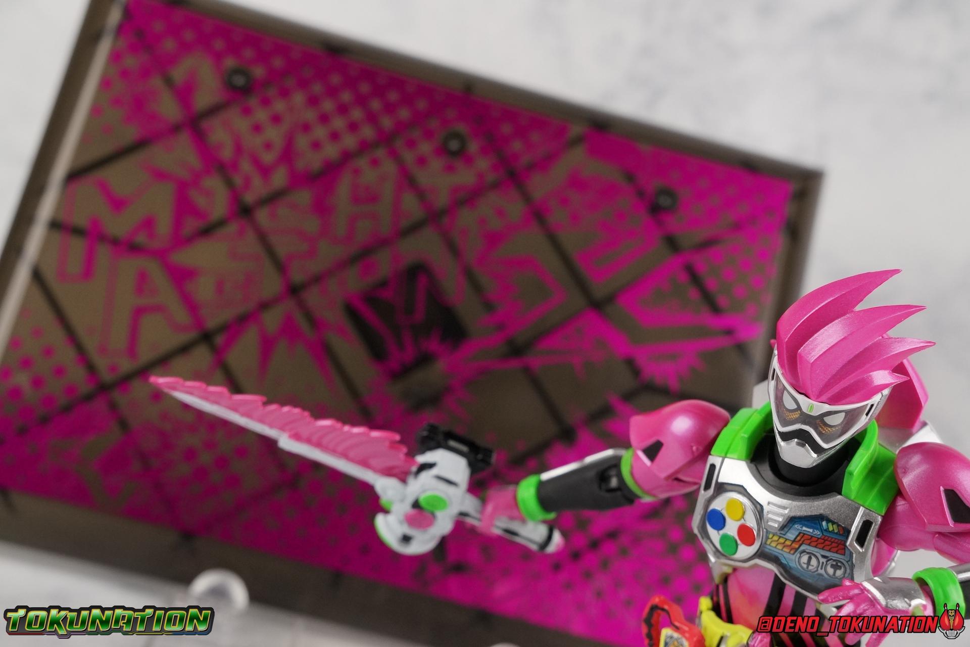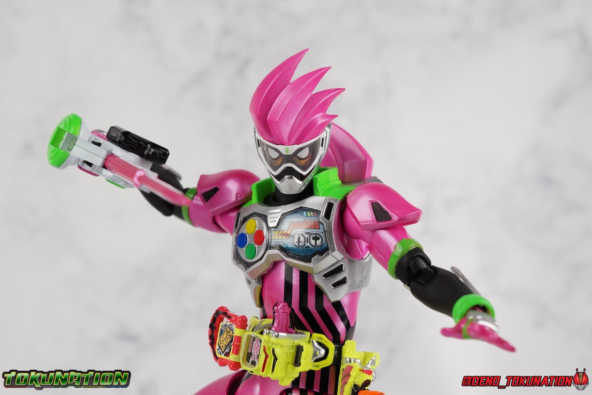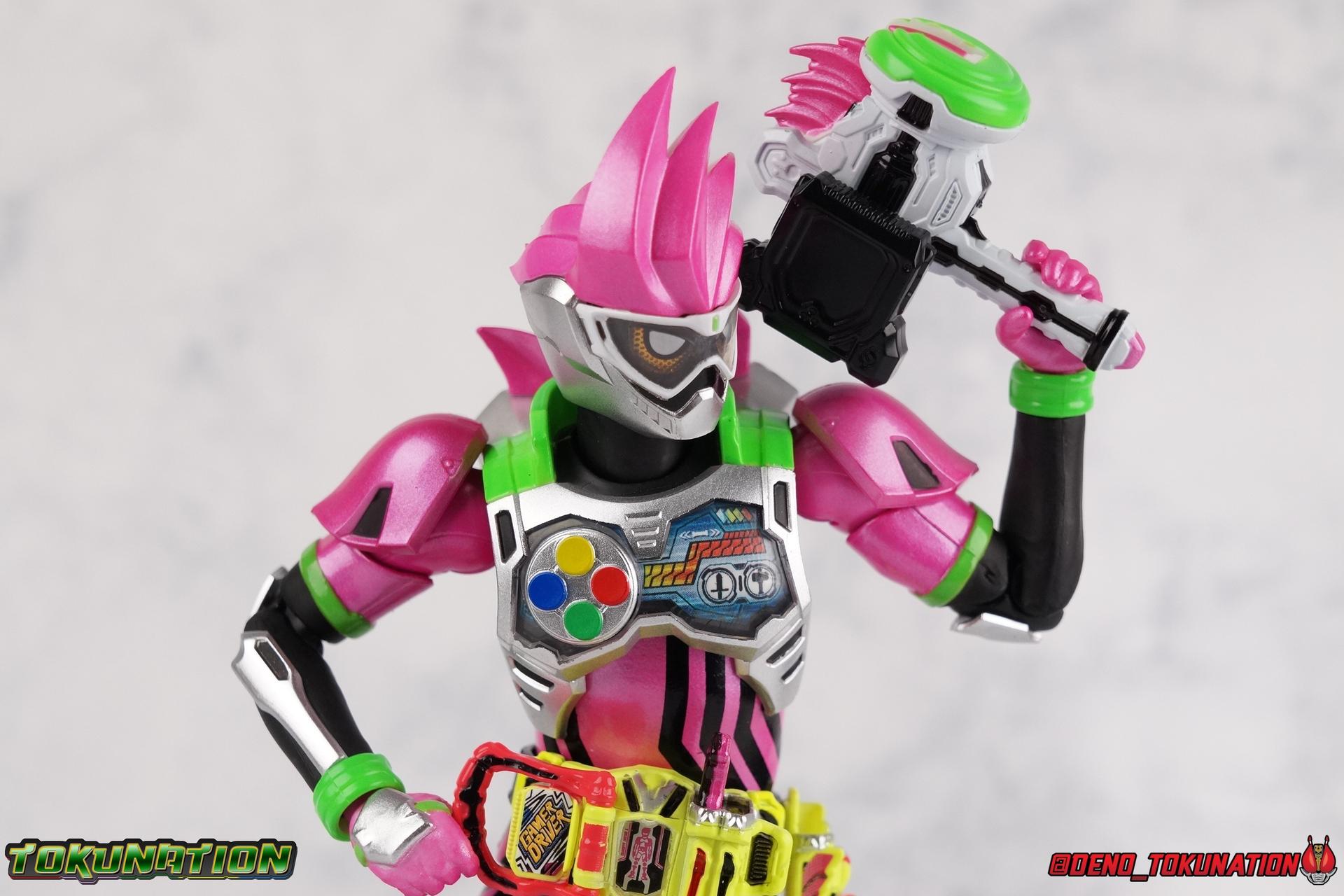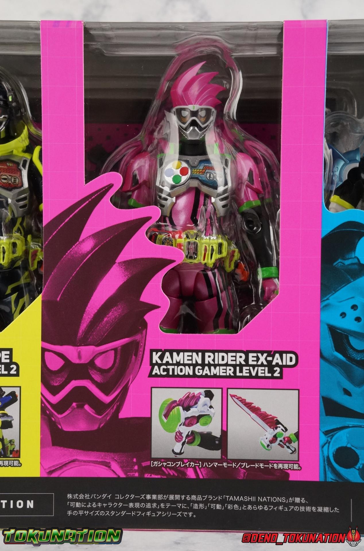 Each of the 3 figures in this set will be photographed separately. So that's 3 different galleries over the course of the week. This gallery is part 1 of 3, so for now we're going to take a look at S.H. Figuarts Kamen Rider Ex-Aid Action Gamer Level 2! Packaging The Mighty Action X Beginning set is a rather large 3-pack. Something that's rarely tried with figuarts release. The last 3-pack in recent memory was the Hakaider Squad set, that was a web exclusive release, and it didn't sell well. So for Bandai to take a chance on 3 unique riders from Ex-Aid, and release them at retail, that was pretty surprising. The box is a rather colorful 3-tone type that really pops, definitely befitting of the series it's from. Honestly the figures in box would make for a nice display piece if you'd like to pick up the individual figures to open too. It just looks good. The 3 riders come in one large tray with their hands, while the Mighty Action X stage as well as their unique weapons are in a separate tray below. Main Figure Ex-Aid Action Gamer Level 2 is our first experience with the new mold introduced for this line. I'm a little behind in my review so I was only just recently able to crack this bad boy open to give him a go. I must say that I am very impressed. Mainline rider releases have just gotten so good over the years. Now Ex-Aid joins the ranks of Gaim & Drive for fantastic inaugural releases. Find out why below. Obviously this figure is quite a bit more detailed and complex than we commonly see each year. There are a ton of paint apps, and a ton of small molded details. This figure is just lavishly executed. From the Ground up the new Ex-Aid type body is pretty solidly built. Though I do have a nit pick right at the ground floor, the ankles. They don't have the full range of motion they need for Ex-Aid to assume many of the dynamic poses he's known for. You'll find that wide stances are just really really difficult to achieve, which means he's always gonna be a bit off balance. The knees have a great bend that helps add to Mighty Action X's sort of athletic platformer theme. And all that being said, the paint apps for the legs are exquisite. including the black lines on the hips. One of the more elaborate pieces on the figure is the Gamer Driver itself. This entire device is extraordinarily detailed for something at this scale. the Driver handle can flip shut, thus hiding the rider read out on the front screen as well. The right of the driver has 2 slots for Gasshats. One is already attached in the form of the Mighty Action X Gasshat. It's kind of a dummy item though as it's really just the handle portion that pegs in. To the right of the driver, is a Gashat holster. There are 2 slots for extra Gasshats as well as 1 slot for a Critical Finish to be inserted. This whole assembly just looks fantastic. I'm taken back to Gaim Orange Arms and the wonderful design of his Sengoku Driver. I won't sell the rest of the upper body short either. Ex-Aid is gorgeous already but his chest detailing is magnificent. The paint apps on the outer layer are crisp and clear, but I'm so impressed by the Rider Gauge label within his chest. Unlike previous failures Bandai has had with labels (I'm looking at you Kiwami Arms) this is flawless. On the flip side of the torso is the deactivated Level 1 head. It's a bit stylized and shrunk down, but that's as it should be if TV CG magic could really work in toy form. Not to be forgotten are the arms, which admittedly only have one flaw that I'm truly bothered by, and that's the shoulder pads. Not because they impact the articulation, but because they pop off easily when fully extending the arms. I have the same problem with my Brave actually as well. But it's a minor issue. The wrists are solid, the elbows fully functional and the bicep swivel welcome as always. Finally that brings us to the head. I know plenty of people weren't a fan of this head when the original stock photos and prototype images began to circulate. Many people take issue with the angle and placement of Ex-Aids' eyes. I actually think it looks pretty spot on. My big issue is the inconsistent white paint apps on the visor, you can see a decent amount of overspray up close, admittedly that bugs me more than it would most people. But it's there. Otherwise I think the shape of the head is generally great, and the hair looks very solid. I'm just really really pleased with how this initial release in the line has turned out. It's a great new body mold with a ton of personality and some seriously striking colors. Accessories Ex-aid is included in a pretty massive 3-pack, but the accessories aren't actually all that heavy: 3 - sets of additional hands. 1 set for holding the Gashacon Breaker. 1 open palm posing set. 1 flat "karate chop" type of set. 1 - Gashacon Breaker handle. Just plug it into either of the other included modules to form a full weapon. 1 - Gashacon Breaker Hammer Mode. While traditionally more associated with Ex-Aid Level 1, the Hammer Mode has been seen with Level 2 plenty of times too. Just plug the handle into the bottom and it's ready to go. I would have preferred to see a fully transformable breaker with a swap out longer edge for the blade mode. But what Bandai has opted for here will do just fine. 1 - Gashacon Breaker Blade Mode. Just plug the handle into the bottom and it's ready to go. Again, I would have preferred to see a fully transformable breaker with a swap out for the blade instead. But it looks just fine as a standard weapon for level 2. As with Brave & Snipe, there are no individual Gasshats included other than the dummy ones already attached to the Gamer Drivers. I think this is easily the biggest omission with any of these releases. Much like last year when Eyecons were few and far between with Ghost releases, Ex-Aid appears to be missing the boat with Gasshats. Final Thoughts As the first release from Ex-Aids' now fledgling figuarts line-up, I am very very satisfied! Someti