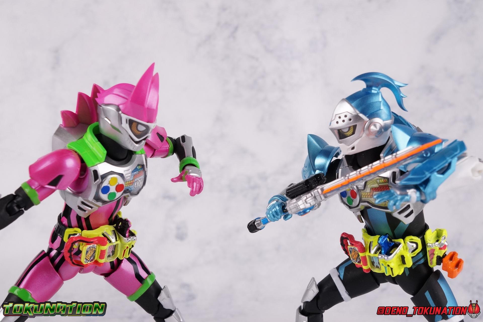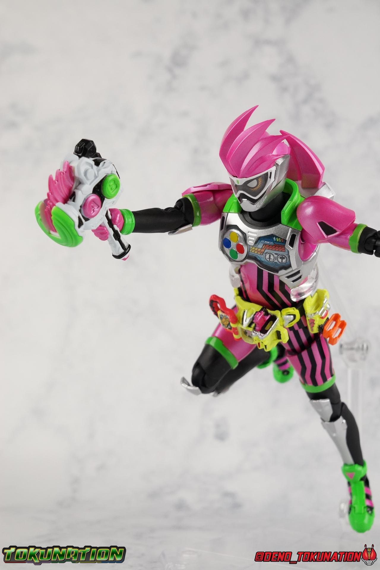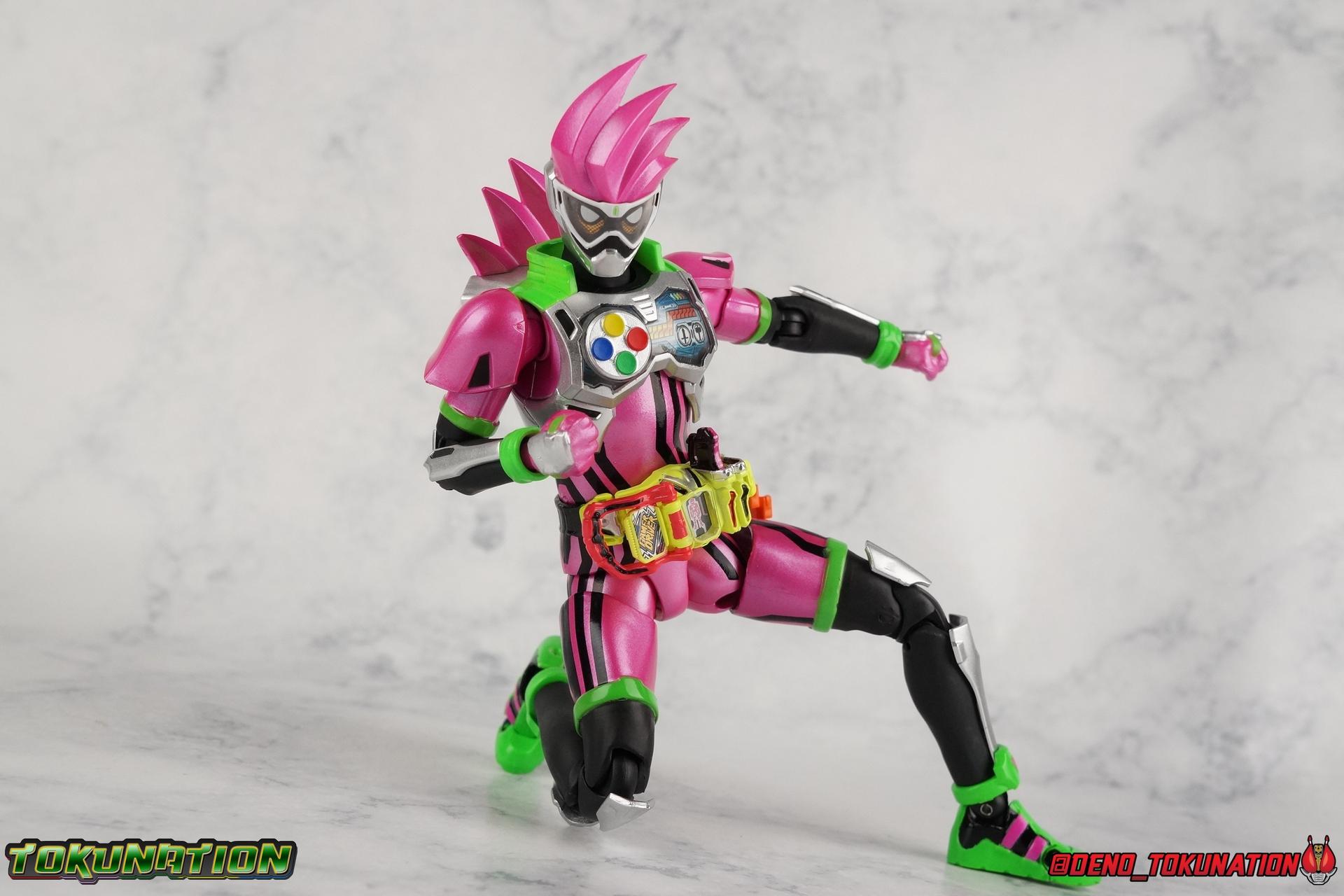 Each of the 3 figures in this set will be photographed separately. So that's 3 different galleries over the course of the week. This gallery is part 1 of 3, so for now we're going to take a look at S.H. Figuarts Kamen Rider Ex-Aid Action Gamer Level 2! Packaging The Mighty Action X Beginning set is a rather large 3-pack. Something that's rarely tried with figuarts release. The last 3-pack in recent memory was the Hakaider Squad set, that was a web exclusive release, and it didn't sell well. So for Bandai to take a chance on 3 unique riders from Ex-Aid, and release them at retail, that was pretty surprising. The box is a rather colorful 3-tone type that really pops, definitely befitting of the series it's from. Honestly the figures in box would make for a nice display piece if you'd like to pick up the individual figures to open too. It just looks good. The 3 riders come in one large tray with their hands, while the Mighty Action X stage as well as their unique weapons are in a separate tray below. Main Figure Ex-Aid Action Gamer Level 2 is our first experience with the new mold introduced for this line. I'm a little behind in my review so I was only just recently able to crack this bad boy open to give him a go. I must say that I am very impressed. Mainline rider releases have just gotten so good over the years. Now Ex-Aid joins the ranks of Gaim & Drive for fantastic inaugural releases. Find out why below. Obviously this figure is quite a bit more detailed and complex than we commonly see each year. There are a ton of paint apps, and a ton of small molded details. This figure is just lavishly executed. From the Ground up the new Ex-Aid type body is pretty solidly built. Though I do have a nit pick right at the ground floor, the ankles. They don't have the full range of motion they need for Ex-Aid to assume many of the dynamic poses he's known for. You'll find that wide stances are just really really difficult to achieve, which means he's always gonna be a bit off balance. The knees have a great bend that helps add to Mighty Action X's sort of athletic platformer theme. And all that being said, the paint apps for the legs are exquisite. including the black lines on the hips. One of the more elaborate pieces on the figure is the Gamer Driver itself. This entire device is extraordinarily detailed for something at this scale. the Driver handle can flip shut, thus hiding the rider read out on the front screen as well. The right of the driver has 2 slots for Gasshats. One is already attached in the form of the Mighty Action X Gasshat. It's kind of a dummy item though as it's really just the handle portion that pegs in. To the right of the driver, is a Gashat holster. There are 2 slots for extra Gasshats as well as 1 slot for a Critical Finish to be inserted. This whole assembly just looks fantastic. I'm taken back to Gaim Orange Arms and the wonderful design of his Sengoku Driver. I won't sell the rest of the upper body short either. Ex-Aid is gorgeous already but his chest detailing is magnificent. The paint apps on the outer layer are crisp and clear, but I'm so impressed by the Rider Gauge label within his chest. Unlike previous failures Bandai has had with labels (I'm looking at you Kiwami Arms) this is flawless. On the flip side of the torso is the deactivated Level 1 head. It's a bit stylized and shrunk down, but that's as it should be if TV CG magic could really work in toy form. Not to be forgotten are the arms, which admittedly only have one flaw that I'm truly bothered by, and that's the shoulder pads. Not because they impact the articulation, but because they pop off easily when fully extending the arms. I have the same problem with my Brave actually as well. But it's a minor issue. The wrists are solid, the elbows fully functional and the bicep swivel welcome as always. Finally that brings us to the head. I know plenty of people weren't a fan of this head when the original stock photos and prototype images began to circulate. Many people take issue with the angle and placement of Ex-Aids' eyes. I actually think it looks pretty spot on. My big issue is the inconsistent white paint apps on the visor, you can see a decent amount of overspray up close, admittedly that bugs me more than it would most people. But it's there. Otherwise I think the shape of the head is generally great, and the hair looks very solid. I'm just really really pleased with how this initial release in the line has turned out. It's a great new body mold with a ton of personality and some seriously striking colors. Accessories Ex-aid is included in a pretty massive 3-pack, but the accessories aren't actually all that heavy: 3 - sets of additional hands. 1 set for holding the Gashacon Breaker. 1 open palm posing set. 1 flat "karate chop" type of set. 1 - Gashacon Breaker handle. Just plug it into either of the other included modules to form a full weapon. 1 - Gashacon Breaker Hammer Mode. While traditionally more associated with Ex-Aid Level 1, the Hammer Mode has been seen with Level 2 plenty of times too. Just plug the handle into the bottom and it's ready to go. I would have preferred to see a fully transformable breaker with a swap out longer edge for the blade mode. But what Bandai has opted for here will do just fine. 1 - Gashacon Breaker Blade Mode. Just plug the handle into the bottom and it's ready to go. Again, I would have preferred to see a fully transformable breaker with a swap out for the blade instead. But it looks just fine as a standard weapon for level 2. As with Brave & Snipe, there are no individual Gasshats included other than the dummy ones already attached to the Gamer Drivers. I think this is easily the biggest omission with any of these releases. Much like last year when Eyecons were few and far between with Ghost releases, Ex-Aid appears to be missing the boat with Gasshats. Final Thoughts As the first release from Ex-Aids' now fledgling figuarts line-up, I am very very satisfied! Someti
