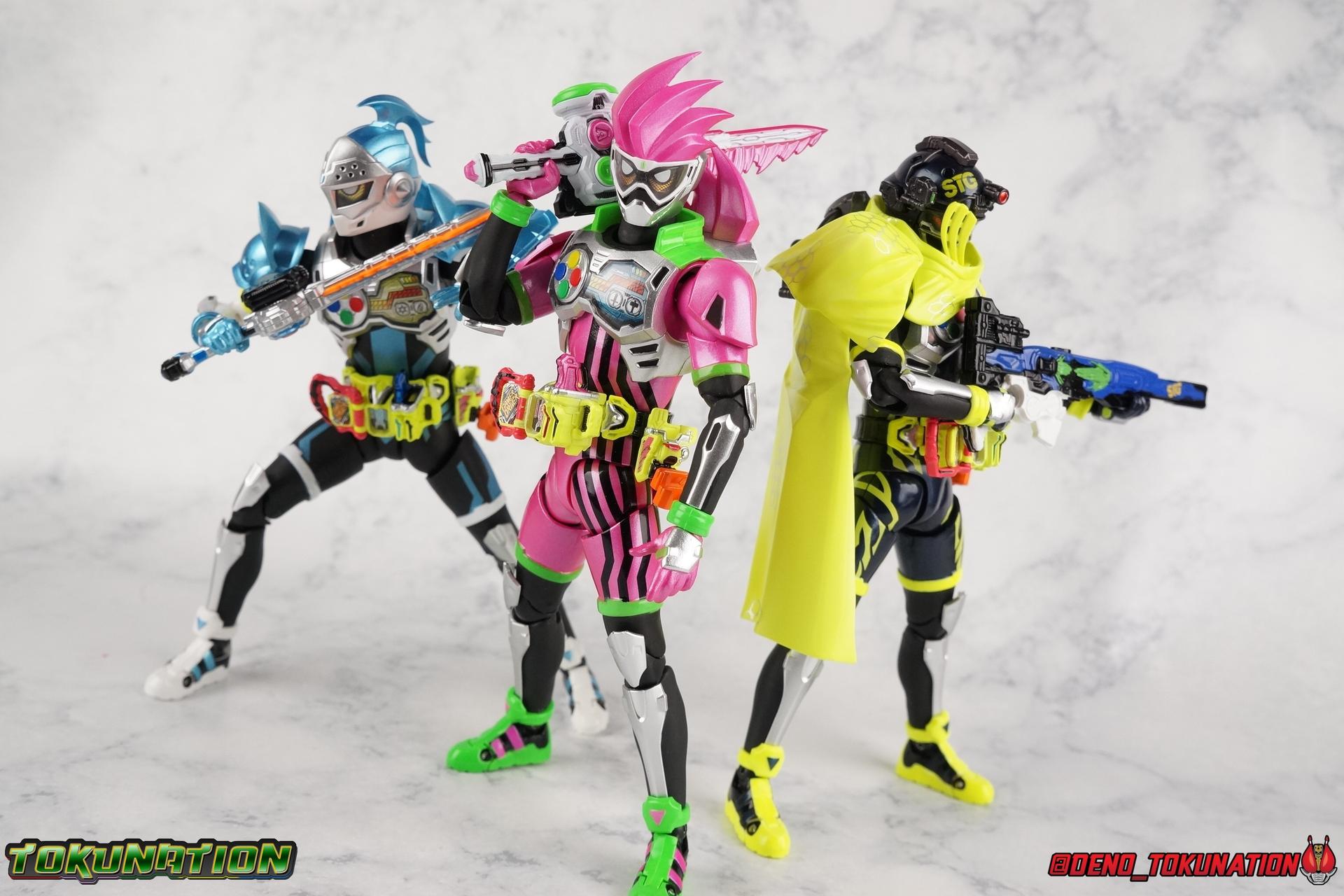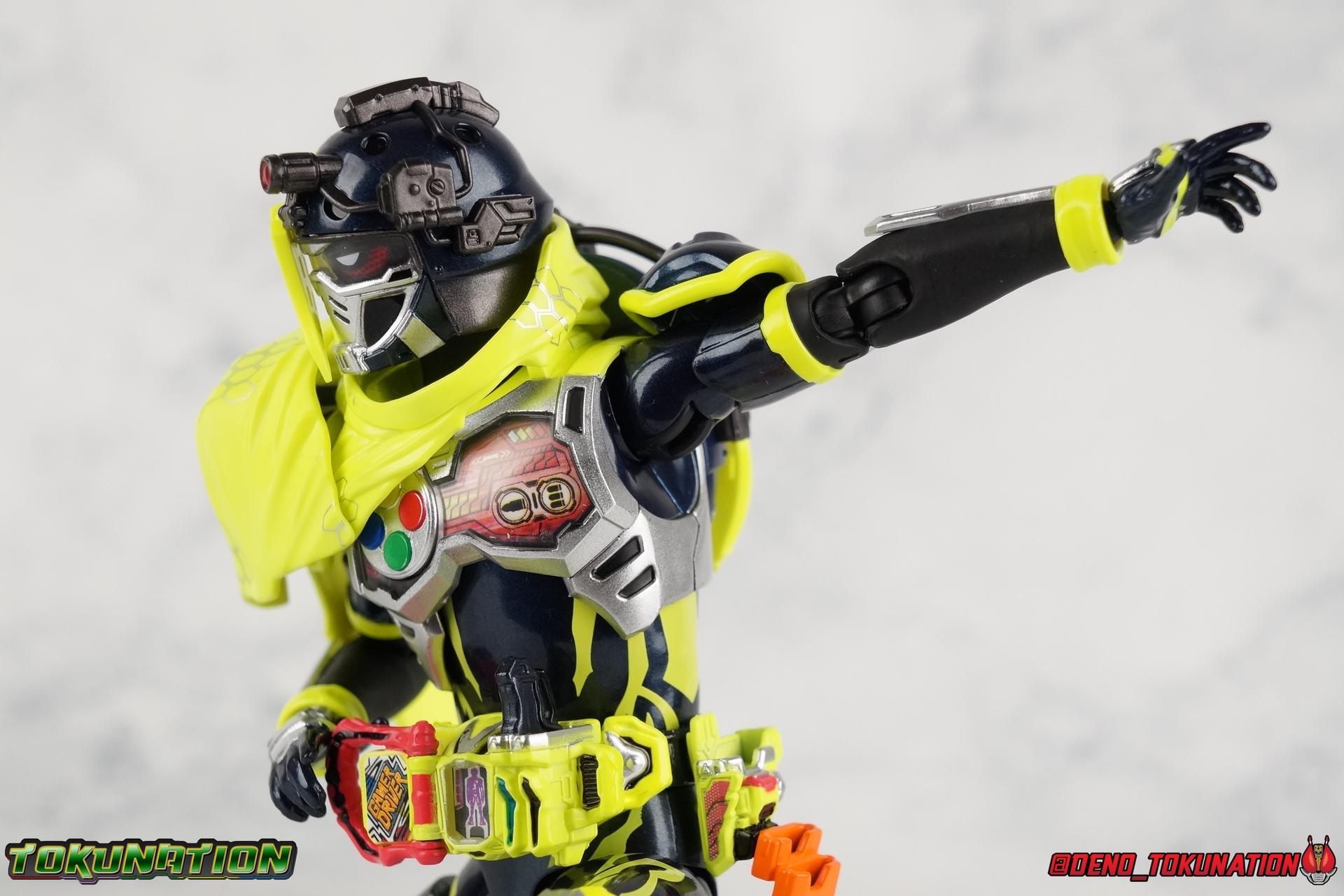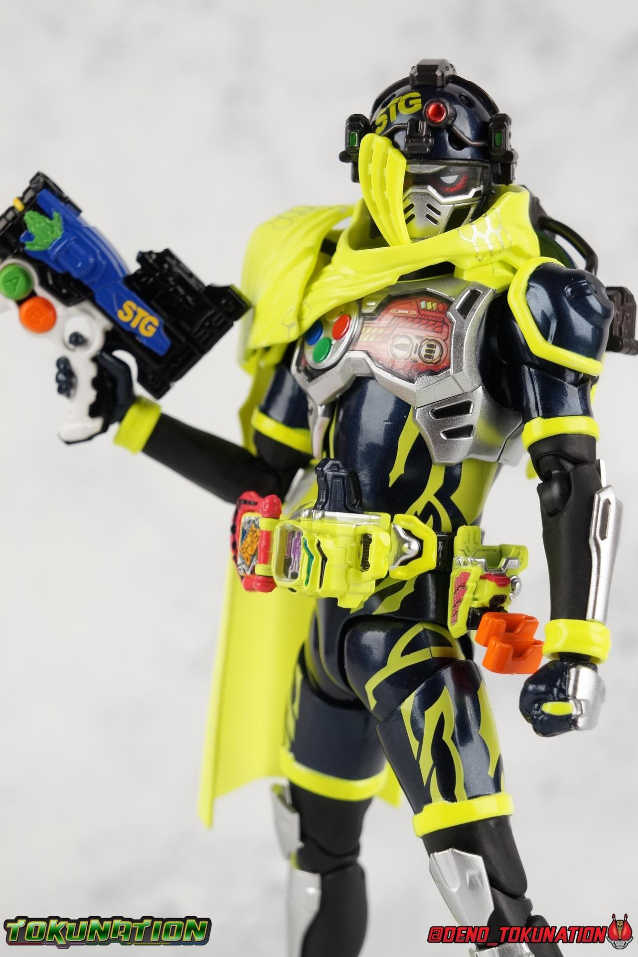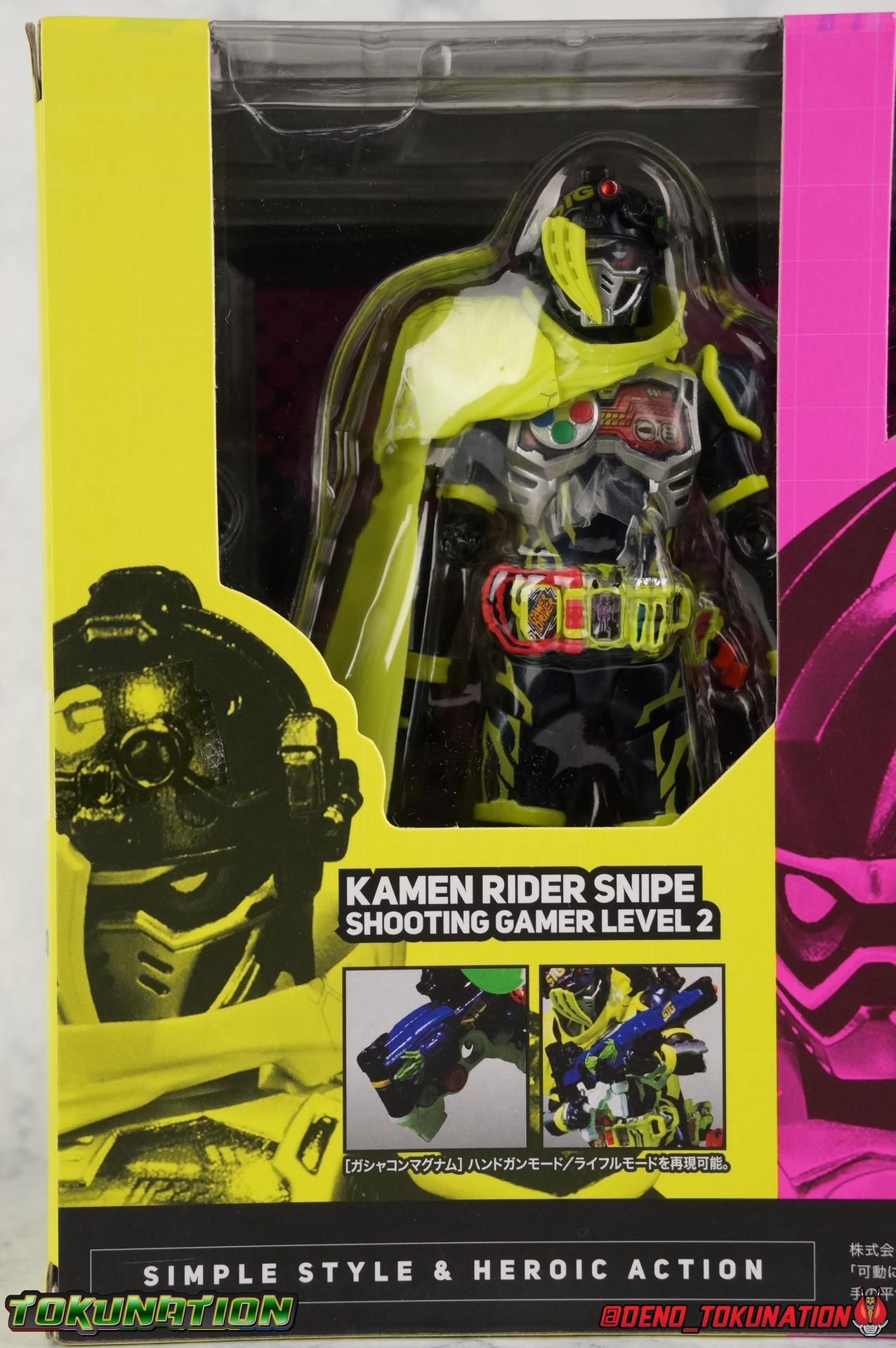 We're back for the final part of our Mighty Action X Beginning Set gallery series! S.H. Figuarts Kamen Riders Ex-Aid Action Gamer Level 2, & Brave Quest Gamer Level 2. And this time we get to end things with everyone's favorite unlicensed doctor, S.H Figuarts Kamen Rider Snipe Shooting Gamer Level 2! Packaging The Mighty Action X Beginning set is a rather large 3-pack. Something that's rarely tried with figuarts release. The last 3-pack in recent memory was the Hakaider Squad set, that was a web exclusive release, and it didn't sell well. So for Bandai to take a chance on 3 unique riders from Ex-Aid, and release them at retail, that was pretty surprising. The box is a rather colorful 3-tone type that really pops, definitely befitting of the series it's from. Honestly the figures in box would make for a nice display piece if you'd like to pick up the individual figures to open too. It just looks good. The 3 riders come in one large tray with their hands, while the Mighty Action X stage as well as their unique weapons are in a separate tray below. Main Figure ** Special note, I lost the Bang Bang Shooting Gasshat about halfway through this gallery and simply could not find it for several hours. So some pictures are of Snipe with it missing. Sorry! Each Ex-Aid rider has a pretty radically different design, as with any series each character is unique. But they also tend to share some design influence, and in many cases parts. The Ex-Aid line, at least so far as Level 2 forms are concerned is a prime example of this. Each suit has it's own unique detailing and colors, but at a basic level they feature the same mold. Sporty type shoes, the bike shorts look, the driver, the chest plate. You see what I mean. So although Ex-Aid, Brave, & Snipe look very different, they also have a ton of similarities. This review will echo nearly everything I have said about Ex-Aid & Brave as the mold is mostly identical. Please feel free to skip ahead to photos if you like. As with the last two riders, Snipe Level 2 features a ton of complex detail that we don't normally see each year. Paint apps and small molded details galore. Snipe may look slightly more dull by comparison, but that's just his more drab color scheme. Still, from the Ground up the new Ex-Aid type body is pretty solidly built. Though the ankles still lack the freedom of movement they need. You'll still find that wide stances are just really really difficult to achieve, which means he's always gonna be a bit off balance. This could be more of a detriment with a character like Snipe, the FPS based Bang Bang Shooting should mean this figure can pull off stable balanced poses, but it can be difficult. All that being said though, the paint apps for the lower part of the body are still top notch, even if again the whole package is a bit more drab. The bright green striping on Snipe's thighs is well done, just not as exciting. One of the more elaborate pieces on the figure is the Gamer Driver itself. This entire device is extraordinarily detailed for something at this scale. The Driver handle can flip shut, thus hiding the rider read out on the front screen as well. The right of the driver has 2 slots for Gasshats. One is already attached in the form of the Bang Bang Shooting Gasshat. It's kind of a dummy item though as it's really just the handle portion that pegs in. To the right of the driver, is a Gasshat holster. There are 2 slots for extra Gasshats as well as 1 slot for a Critical Finish to be inserted. This whole assembly just looks fantastic. I'm taken back to Gaim Orange Arms and the wonderful design of his Sengoku Driver. This level of functionality is always impressive. I won't sell the rest of the upper body short either. Snipe may not be as striking as his predecessors but his chest detailing is just as magnificent. The paint apps on the outer layer are crisp and clear, but I'm so impressed by the Rider Gauge label within his chest. Again, unlike Bandai's previous failures with labels (Kiwami Arms) this is flawless. On the flip side of the torso is the deactivated Level 1 head. As with Ex-Aid it's a bit stylized and shrunk down, but wow it looks good. It's such a strange detail for me to love but I do. Not to be forgotten are the arms. Sadly this is where I take great issue with the figure. Snipe's shoulder sash is absolute junk. Plain and simple. It does nothing but hinder articulation and be frustrating. You can angle the pieces of it which are ball-jointed, but not enough for anything meaningful. Most of the time the parts simply pop off before getting into a position that's useful. It's sculpted well and the jointed nature of it doesn't detract from it's look, but it's very poorly executed. Finally that brings us to the head. While Ex-Aid's head still seems to get a far bit criticism, & Snipes collar color is incorrect, I don't see how you could complain with Brave's likeness frankly. That design is sharp, solid, and gorgeous. I like the extra mile Bandai went to making Taiga's "bangs" a removable piece as well. It's on a small pege so it can be rotated as needed when moving the head, this way when it impacts the collar you move it without fear of breakage. Smart move! Accessories Snipe's accesories are a bit more similar to Ex-Aid, he comes with a pretty basic assortment but it's also basically everything you need for him: 3 - Sets of additional hands. The same basic set up as Ex-Aid, Snipe's holding things hands are just specifically designed for his Magnum. 1 - Gashacon Magnum (Handgun Mode). Like Ex-Aids Gashacon Breaker, Bandai opted for a swap out part rather than a functioning weapon. The Magnum in Handgun Mode looks good, but is very difficult to get Snipe to hold properly. The grip is actually too big for the set of hands it's intended for. Otherwise I think it looks pretty nice, even if the paint is a bit too thick. 1 - Gashacon Magnum Rilfe Mode Barrel. A swap out part, you just remove one side of the Magnum and add this on