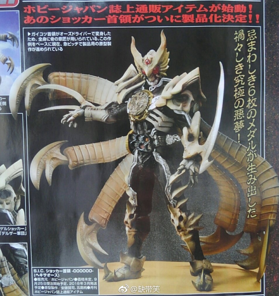 Take this with a grain of salt however, as that date could be for anything, source of the reveal: For those that don't know, Boss is character in SIC Hero Saga He's a being created by Shocker with Six Core Medals being made up of: Shocker Greeed, Gel-Shocker Greeed, Destron Greeed, G.O.D. Greeed, Garanda Greeed and the Delza Greeed. He was transformed by the Great Leader. https://twitter.com/_Erasu/status/888801280222793728 |