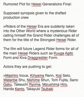 All I can see is that most Heisei riders without the original actors returning will be fodder to the ex-aid and build gang. There's a leak photo of brave vs Kabuto and most likely he'll defeat Kabuto. Hope it isn't turning in to another Taisen movie even though all these movies focus on flashy action and fan service over plot.