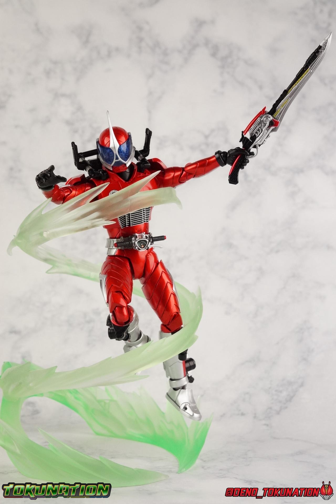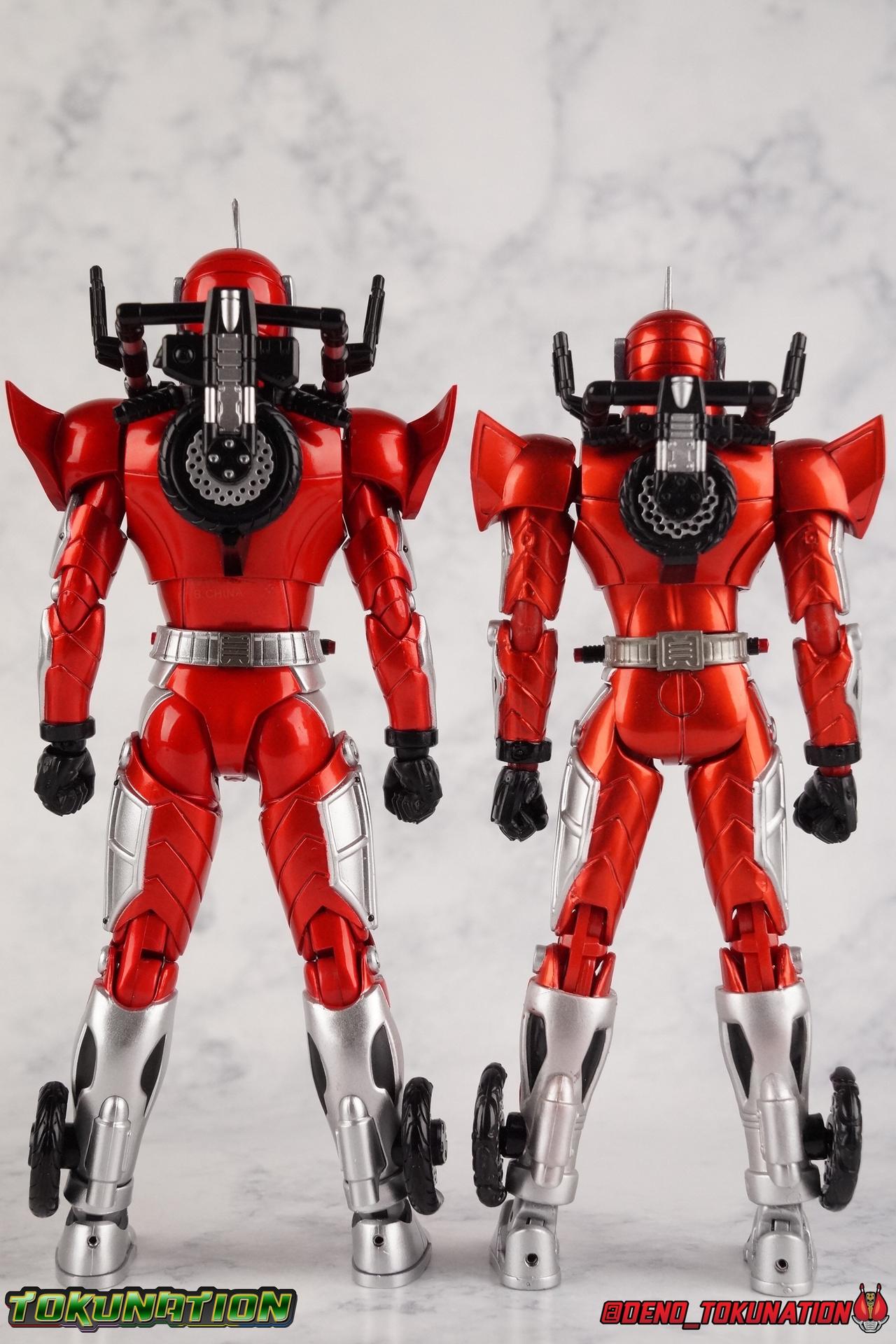 Ryu Terui was an ordinary police office like anyone else, until the day that Isaka the Weather Dopant savagely murdered his entire family. With the help of Shroud though, Ryu began a quest for his revenge as Kamen Rider Accel! Years ago, when S.H. Figuarts was still a pretty fledgling line Accel had his first collector style figure. For the time, it was really pretty great. Good detailing, decent poseability, even some nice diecast feet for stability. But as with many figuarts from that era, it's aged out. Now, 7 years later, Bandai has revisited this character as the next entry in their premium renewal line with S.H. Figuarts Shinkocchou Seihou Kamen Rider Accel! Packaging This is the one area I'm always going to be less than impressed with for Shinkocchou Seihou. While the the slip cover box style actually is something I really like, it's always quite boring too. The standard black & white packaging with a few official images just doesn't wow me like it did when this subline was still fairly new. I still think it's some of the best collectors style packaging we could hope for, but I would like to see maybe the colors get mixed up a bit at least. Main Figure Like I mentioned above, it's been 7 years people. 7 years since the original Accel figuart was released. I honestly hadn't even realized it had been that long, but let me tell you now that Seihou Accel induces some serious whiplash. The differences between the original & Seihou releases of Decade, Kuuga, Kabuto, they were stark. W was on another level entirely. I dare say that Shinkocchou Seihou Accel is every bit the kind of improvement that W was. He's just a top notch release. For starters, Seihou Accel is just bigger. As you can see in my comparison shots below, he's about a head taller than the original. Overall about 15% larger and bulkier. This was much much needed. A figure that can finally match the suits proportions properly. But really it's more than that. This figure excels (see what I did there??) in putting the original to shame in every conceivable way. From an articulation standpoint there's really no comparison. Seihou Accel features the best combination of ankles knees & hips I've seen on a figuart in a long time. Plenty of clearance for the ankles, strong toe bends, nice flat feet to achieve balanced poses, hips with a wide range of motion thanks to their complex design. It's just fabulous. Now let's take a pits top at the Accel Driver. This meticulously detailed henshin device looks every bit as spectacular as the W Driver did, and like it, it can accept Gaia Memories like the included Accel & Engine. It's also removable, surely to replicate Accel's transformation to bike form, but obviously this figure can't accomplish that. The rest of the torso, like the rest of the figure is exquisite (a few minor scuffs in the silver paint aside). And it has plenty of clearance, a good arch for the back etc etc you get the picture. Now let's look at my one big qualm with this figure, the arms. While they are a vast improvement over the original, I take issue with two things. 1, the shoulders are kind of horrendous. The shoulder pads are hinged well enough, but for some reason not in any way that facilitates them clearing the actual shoulder cavity for posing, they impact it alot, but even if you remove them entirely, the shoulder sockets are very tight and kind of limited in most circumstances/ You have to apply a lot of force sometimes to move them. On top of this are the wrists. When I plug hands onto them, the peg holes seem too shallow, the hand sort of floats above the ball joint and doesn't rest naturally so it looks awkward. They also pull off the ball rather easily when posing. But to me at least the hands also feel a bit disproportionate and over-sized. They get the job done, but they do look off. Finishing up top, we have Accels head, which really captures his likeness better than either of the previous figuart offerings, the original head or the "improved" one that came with Accel Booster. This is a sharp, accurate likeness that really sells the notion that a person could be wearing that helmet in there. My only complaint is the neck is just a tad too short so the chin impacts the collar around the neck on the sides. It's not detrimental, just annoying. Overall this is an excellent release. I have issues with the arms, but honestly that's pretty minor. This is a gorgeous figure that communicates Ryu Terui's personality astonishingly well. And paired up with Kamen Rider W, it's like these guys walked right off screen. Bring on Skull & Eternal! Accessories As with most any Shinkocchou Seihou, this figure comes with a perfect array of accessories: 5 - sets of hands. Basically all purpose for everything you'll need. 1 set of open palmed hands, several sets for holding things specifically for the Engine Blade and a bike riding pair, and there's even a pair for holding Gaia Memories. 1 - alternate head. Basically the only difference here is that the underside of the visor has some additional painted details to replicate the way the visor lights up when Accel powers up or executes a Maximum Drive. 1 - Accel Gaia Memory. Just plug this one into the Accel Driver to complete the figure's standard look. I'm still astonished, ever after W, just hoe well detailed these tiny things are. And easy to lose! Just be careful when handling them. 1 - Engine Gaia Memory. One of Accels "artificial" memories, Engine should be used in conjunction with the next accessory. 1 - Engine Blade. Accel's signature sword and sort of all purpose weapon. Able to accept Gaia Memories by folding the blade forward, the detail on this item basically matches what was present with the original figuart. This one is a bit sharper, more crisp paint apps, and is generally just more representative of the actual show prop. It's not terribly different from the original, but it's still noticeable to me. Final Thoughts As with Kamen Rider W, and in fact any Seihou