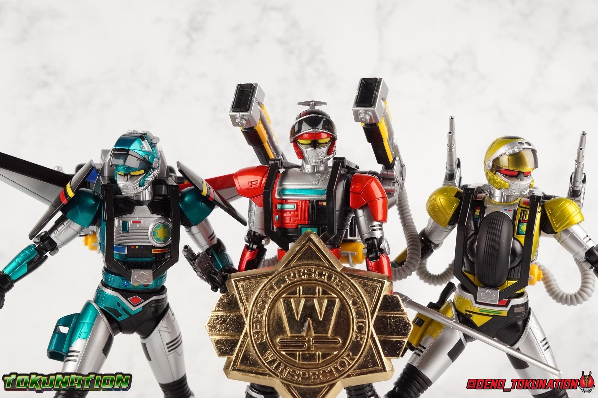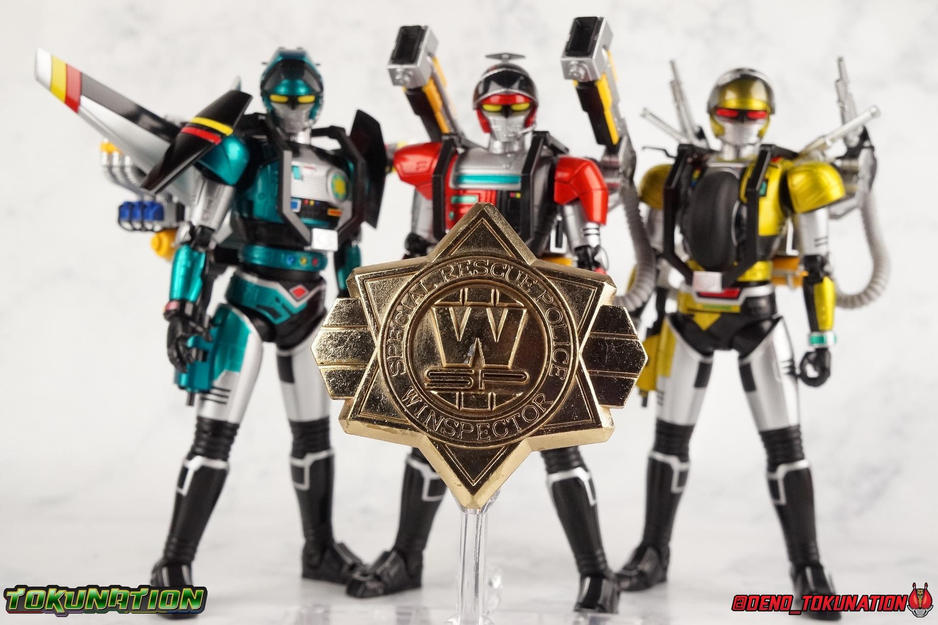 It's finally time for us to revisit a classic series and personal all-time favorite of mine, Tokkei Winspector! Previously you've seen us do galleries of the individual team members of Winspector: - Fire (Ryoma) - Bikel - Walter And while it's taken me some months to finally get around to it, it's time to look at a massive accessory pack designed just for the Winspectors. The incredible S.H. Figuarts Winspector Full Package Option Set! ** This is the single largest gallery I have ever shot for this site. At 140 images it's split across 4 different posts. Be sure to check them all out! Packaging The Full Pacakge set comes in a box that's not only massive, but perfectly fits in line with the 3 previous releases. Right down to the gorgeous spine art. Since there are quite a number of pieces included in this set, everything's actually broken down into two large parts trays. The bottom tray solely contains the pieces for Walter & Bikel's maintenance tables. Accessories Unlike most of my reviews, this one will consist entirely of a break down of the accessories represented in this massive pack. This set covers the totality of basically every major accessory or weapon ever used by the team, and addresses any lingering concerns that I ever had about the lack of accessories with the individual releases. 2 - Bays/Maintenance Tables for Walter & Bikel. Seen in the Winspector base, this is where the robotic brothers chill out when not on active duty. We see them activated for the first time in episode 1 while lying on these tables, and various other times through out the series. 2 - sets of bay arms for above mentioned tables. These snap onto either side of the bays themselves rather snugly. I'm disappointed that they don't ratchet though, it's difficult to move each arm into the same even position. They still balance alright, but it's an imperfect design. 1 -Winbadge. The standard folded up version of Fire's proof of membership & command of Winspector. 1 - Firebadge. An unfolded version of the Winbadge. Unlike most cases where I feel like the two accessories could have been one, I'm pretty okay with these two being separate. It allows for some multiple display options, and frankly on something this tiny I'd fear the hinge to open it being rather weak. The interior detailing isn't entirely present, as you can see compared to my Vintage DX Win/Firebadge, but it gets the job done at 1/12 scale. 1 - Set of Handcuffs. Kind of plain detail wise and in flat gray plastic, they're sturdy enough to get the job done at least. I don't understand why there wasn't more than one set of either size included. Oddly enough, the first time the cuffs were ever used in show wasn't actually to arrest anyone, but to stop an elevator from plunging into a building fire. You will need to remove a figures' hands first to put these on as they aren't hinged to open. A minor drawback. 1 - Set of Large Handcuffs. Slightly larger than the first set, these function the same but again I question why only one set was included. They are large enough that for many figures they should slide right over closed fists without having to remove them, but again an imperfect design. 2 - sets of additional Fire hands. They work for any of the three members of the team but are largely intended for Fire's use. Both sets are specifically meant for holding Fire's Win/Fire Badges. * To Equip any of the included back packs, you'll need to unplug a few components from each figures' back. Fire has plug on his back to remove, no additional parts necessary. Bikel has a new plug in this set that replaces the standard one on his back. Walter has one that replace the back of his Di-Slider, which is already attached to a hard point that was under another panel that had to removed from him in the first place! Walter's Di-Slider as seen previously. I've included images of what parts you need to detach as well. 1 - gold back plug. This component swaps out for Bikel's regular back plate and gives him a peg hole for the Multi Pack to attach to, making it a much sturdier connection. 1 - Dislider panel. A silver swap out piece to make Walter's jet pack compatible with the Multi Packs. Just pop it on and you're good to go. 3.5 - sets of Multi Pack Harness parts. The front end of the harness is repeated identically twice, and the third one is a bitter longer to accommodate Bikel's tire in the configuration. This goes around the neck & chest of each figure. The arms which run from it to the connectors on the pack come in 3 varieties as well. The short ones are intended for Ryoma & Bikel, the extra length arms for Walter to use the Air Pack. 2 - Multi Pack Fire Version. First seen in episode 1, this multi pack type is (as the name implies) intended to put out fires. Both Bikel & Walter use this pack in it's initial outing, so you can actually display both that way if preferred. Though often Ryoma uses one of the 2 fire packs in combination with some additional parts. Each of these packs has the fire extinguisher attachments on them standard, other components can slide over them for other modes. 1- Multi Pack Air Version. Primarily a life sustaining pack, as the name implies, this one provides a fresh supply of oxygen for civilians as first seen in episode 3. Though the air masks aren't removable on the figuart version of the pack. And although the Air pack is first used by Fire, it's more or less intended for Walter. Fire doesn't use it terribly often and is generally matched up with a variation of the Fire pack. 2- Liquid Nitrogren Blasters. These adapters fit over the Fire Version Multi Pack nozzles to instantly freeze targets. First used in episode 4 to stop an imminent explosion. When attached they have other uses as well, see episode 23 for their Caulkling Version use. But this was their first and primary ability. They really just look like awesome over the shoulder cannons for Fire. They also don't plug on very well, the part tolerances are kind of iffy. 1 - Clap