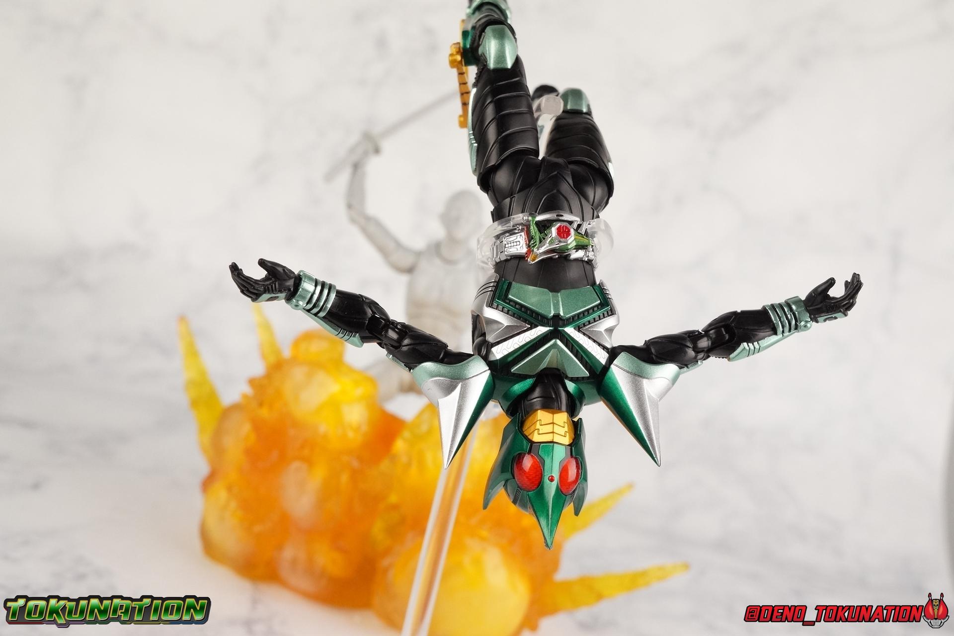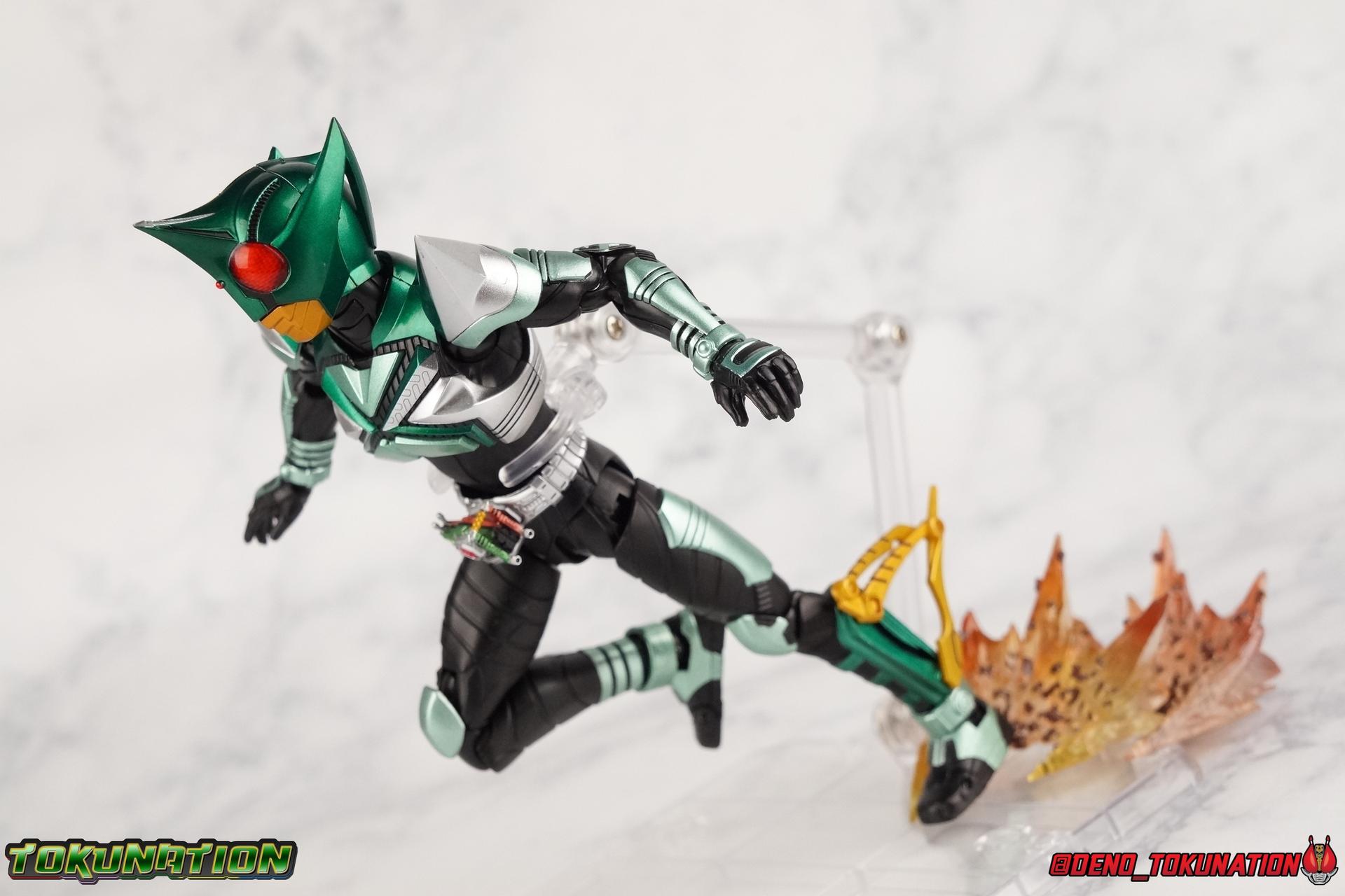 Sou Yaguruma was once the top dog of ZECT, commanding legions of ZECTroopers as Kamen Rider TheBee. The advocate of "perfect harmony" would soon be humbled however by Souji Tendou, and begin walking a darker path of self-loathing that eventually (and inexplicably) lead him to his new identity as Kamen Rider Kickhopper! Now Yaguruma is the latest addition to the Shinkocchou Seihou premium renewal line of S.H. Figuarts! So let's dive into our review of the figure. Packaging That standard slipcover packaging of Shinkocchou Seihou returns again. I promise I really appreciate the ease of access this kind of packaging provides. I really like this design more than a standard figuarts square box, but they've gotta start spicing things up. The one monotone image across the front of the box is getting rather boring. The presentation is nice but it's starting to fall flat in the face of more colorful and creative mainline releases like those from Ex-Aid is all. Main Figure Just as with Kabuto, Gattack, & Dark Kabuto before him, Kickhopper is an overwhelmingly needed update to an outdated and obsolete figure. The original release was plagued by the now standard QC issues of the original Kabuto line. Especially with those bowed legs. I'm happy to report that Seihou Kickhopper is the perfect successor to that original release. As with my last couple Seihou galleries form this series, you'll find a lot of similar passages in my review, it's just unavoidable when these figures share the same basic body and tooling aside from a few key areas. But I'll definitely zero in on the differences with this one. To start, the most iconic thing about Kickhopper is of course the Anchor Joint weapon attached to his left ankle. This unique item not only gives Kickhopper the 'jump' in his Rider Jump, but packs all the power behind his Rider Kick. It's also the most improved thing about this release. On the original figure it was a static accessory, permanently fixed in placed. This go around however the Anchor Joint is actually jointed and can be slid down the shin with the blade fully extendable to properly recreate a Rider Kick. The style of hips originally implemented in this mold provide a wide and balanced motion that allows you to replicate all of Kickhoppers most iconic poses & attacks. Though I do still think any standing kick looks pretty goofy in figure form. I would say the hips are limited only by their design as they do impact the waist assembly a little more prematurely than I'd like. But it's undeniable how versatile they are compared to many figures. The Hopper Zecter is really nicely detailed, especially when compared to the original. The details are sharp, the paint apps crisp, and it's even removeable. If you flip it around, the backside is also (properly) fully painted in Punch Hopper colors. It does pop off the buckle rather easily but it just looks so good. And while we don't have moving pectoral plates or flexible chest armor like with Kabuto & Dark Kabuto, Kickhopper's design is still pretty smooth, albeit a bit more limited in the upper body area. But you also don't have to worry about the torso impacting the Zecter. The new chest armor is really really nice though, it looks like a perfect replica of the show prop with really subtle paint details I had never really noticed before. The arms are free of nearly all obstruction thanks to wonderfully hinged shoulder pads. They do tend to look a little unnatural in some poses and expose the joints beneath however. But the elbows and wrist provide the same great range of motion we've come to expect from this mold, one that's still holding up very well 3 years on. Lastly we look at Kickhoppers head, which is just spot on. The original suffered from it's disproportionate size to the body as well as some issues with length and width. I'm happy to report that this go around the head is the correct size relative to the body and also the proper glossy green. The mouth plate is a brilliant gold and the compound eyes really sparkle in the right light. As with his 3 predecessors, Shinkocchou Seihou Kickhopper really is the ultimate apology for the original release. And being able to FINALLY recreate my favorite moment from Kabuto, the Triple Rider Kick in Seihou form, is the ultimate treat. Accessories Not much here, but just what you need: 1- Hopper Zecter (open). This is the flipped version of the Hopper Zecter from Kickhopper's Rider Jump/Kick combination. After the moving parts that were present on Seihou Kabuto's Zecter years ago I was surprised that Seihou Gattacks' was a swap out part instead, and I'm surprised again that the Hopper Zecter is the same. It just seems like something that could have been engineered to work instead. I mean just look at the W Driver & Gaia Memories. 2 - sets of hands. These hands are a bit odd if you ask me. The open hands are a very stiff variety of open palm. They aren't very expressive at all. The other pair are the standard type of "holding things" hands, and they look almost perfectly shaped for handlebars on a Rider Machine. But the Hopper Bros had no such bikes, nor any weapons they would have held. So these hands are a really pointless inclusion. The two glaring omissions that most collectors will notice are undoubtedly items included with the original figuart. The ramen bowl as well as a personalized Tamashii Stage. The ramen bowl was a pretty hilarious and iconic accessory, signifying one of the goofier plots of the show. And while the stage isn't nearly as important, it was nice that the original Hopper bros came with them. As is the original figuart is so dirt cheap now you could pretty much buy it just for those accessories. So while it's a bummer they weren't included here, it's no great loss either. Final Thoughts That's 4 down and well frankly quite a few to go. With Hyper Kabuto on the way finally, is it only a mater of time before TheBee, Sasword, Drake and others finally get this premium treatment as well