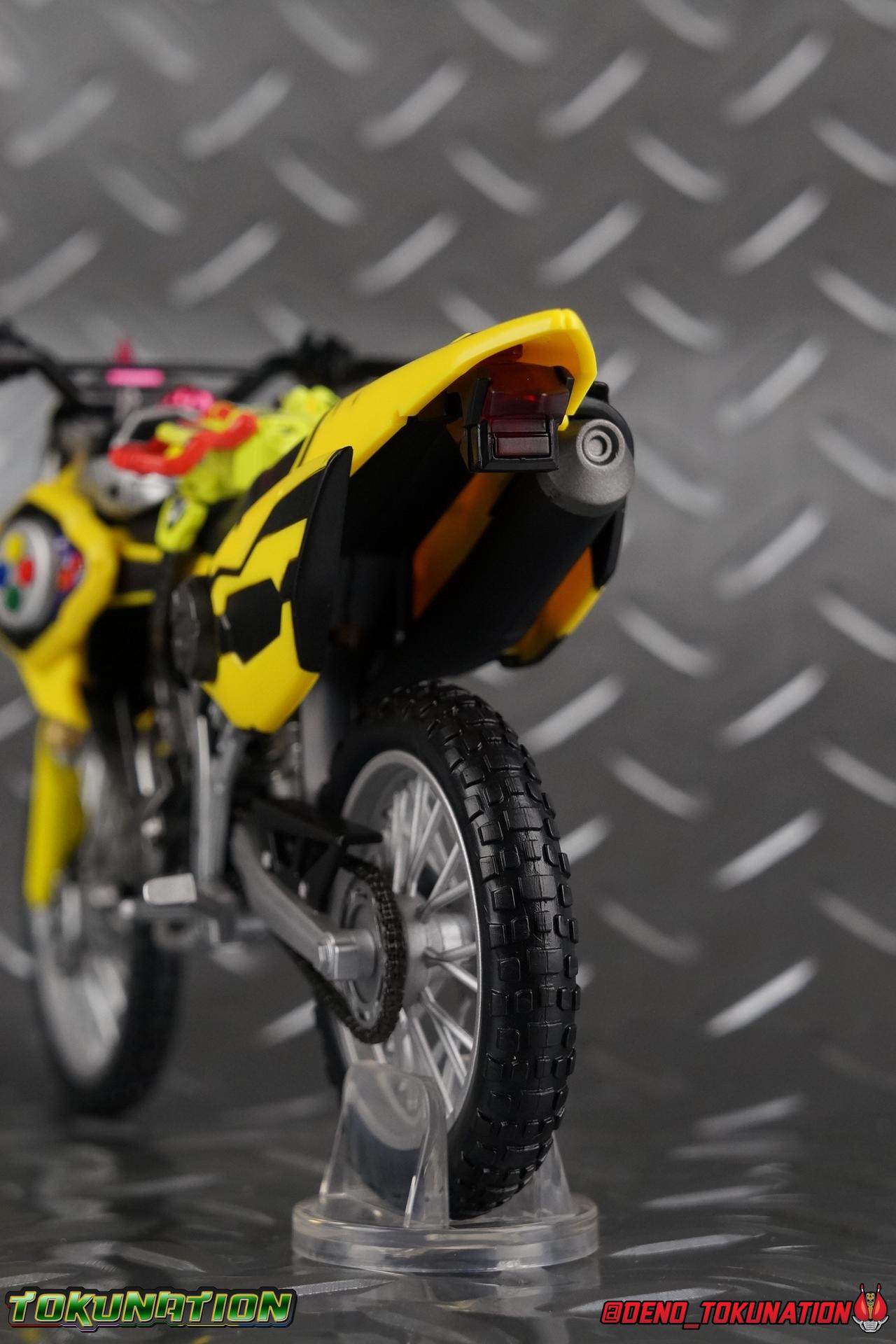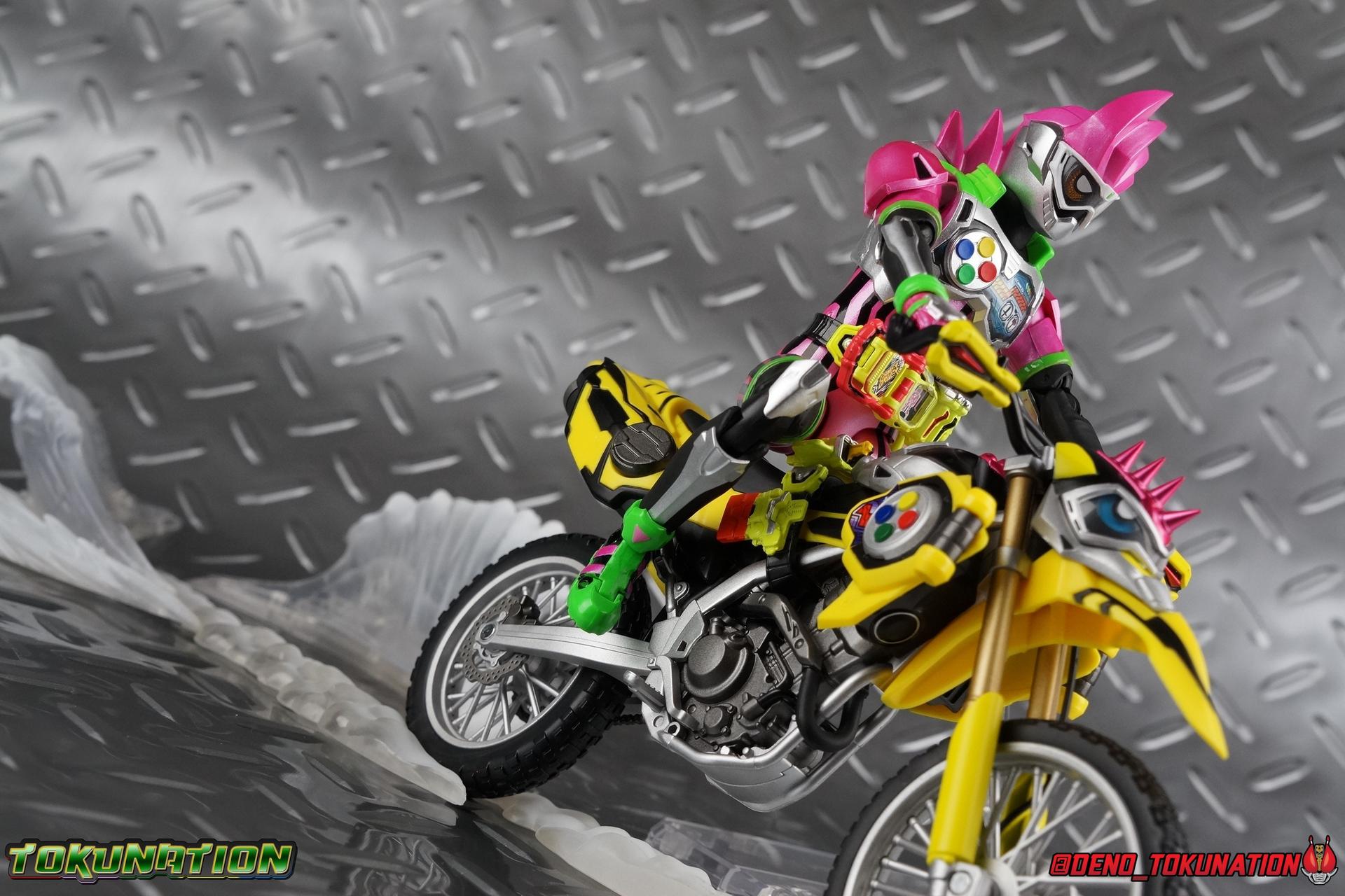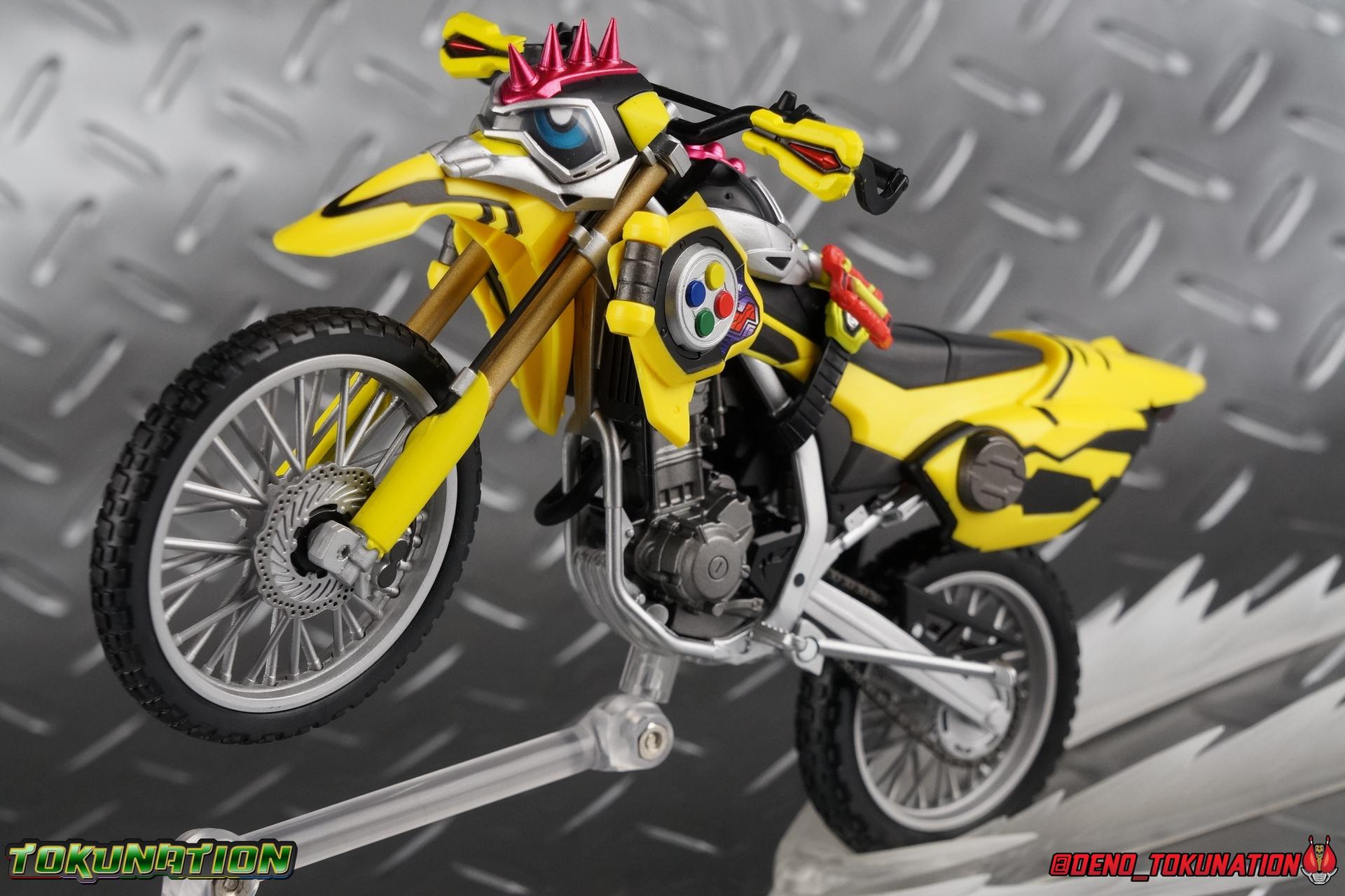 Kiriya Kujou. Liar, coroner, Bugster, Kamen Rider. Has there been a secondary character that's grown more memorable and beloved by fans of a rider show more quickly than him? I'm not so sure. Almost from the moment he stepped on screen, people fell in love with the two-faced hero. His death devastated some, his resurrection was similarly significant to others. All I know is that I personally grew to really love this character, and I've been patiently biding my time waiting for a nice collector oriented figure of his rider form to be released. While Lazer has an unconventional Level 2, it's finally been gorgeously executed. So let's dive in with a full review of S.H. Figuarts Kamen Rider Lazer Bike Gamer Level 2! Packaging Lazer Level 2 comes packaged in the same bright, colorful packaging that the rest of the line has. The vaguely game themed almost 8-bit blocky aesthetic just looks great. I know it's just a bx but I really really like the yellow they used. But yeah, I know, it's just a box. But I always love stylish packaging. Main Figure Unlike most Kamen Riders, this one IS a ride, literally. Rather than a traditional hero Lazer's Level 2 upgrade takes the form of a bike. An unusual turn for Kamen Riders. Where Accel had the ability to assume a bike form, Lazer is locked into this mode for his Level 2 form without a Level 3 Gashat. But what can a release like this bring to the table to really get us excited about something that can be as static as a bike? A decent amount actually. The main design of the bike is fairly standard, being based on a Honda CRF250L motorcycle. At a very basic level, you can clearly see the CRF components. The additional components that make Lazer who he is though are seamlessly integrated into this design. Take for instance the head & eyes added to the front of the bike, acting like a windshield almost. (This head of course is the basis for the later Level 0 Lazer Turbo form.) They just really convey Lazer's personality quite well. The only issue that bugs me is that the eyes are non-removable. Ex-Aid spoiler time, but at a certain point Kiriya is killed by Kuroto. In his dying moments he leaves his Gamer Driver and Gashat to Emu. From this point on until Kiriya's resurrection, any time Ex-Aid summons Lazer Level 2's bike form, the eyes are blacked out. Now the SO-DO candy toy release went so far as to include the blank eyes, I wish this one could have as well. Panels mimicking Lazer's Rider Gauge chest plates are positioned just above the engine block, each is painted rather nicely. And as is usual with Rider Machines the engine itself is very nicely detailed with a great metallic paint finish as well. Additionally you can see between the seat and handlebars of the bike is a vestigial Lazer Level 1 face. Much like the Mighty Action X Beginning Set, this is a shrunken down and stylized version of the rider's Level 1 faceplate, though in Lazer's case it's a bit more shrunken down to fit on a bike chassis. On either side just below this are halves of a Rider Belt, and in the center at the tip of the seat is a slot for one of two included Gamer Drivers! The fit for the Drivers is rather snug, you'll need to press firmly to lock it in. I'll get into the difference between the two Drivers below in the accessories section. Needless to say though this feature already puts this bike a step above previous similar releases. As far as the last few standard Rider Machines go, not counting Tridoron, Lazer Level 2 is a really lavishly executed bike. More so than the Sakura Hurricane for Gaim, and far far more so than the Ghostriker. I will say that I find it difficult to get a natural pose with a rider on Lazer though. No matter which of the two Gamer Drivers you choose to use, they both keep the rider from sitting too close to the handlebars and can impact the inner thighs enough to make posing difficult. That being said, when you throw him in with Ex-Aid and the gang the effect is in fantastic. Accessories Believe it or not, Lazer Level 2 actually comes with more & better accessories than most humanoid web exclusives: 1 - Clear Wheel Base. The standard kind included with nearly all Rider Machines. Just a nice solid base to hold the bike in a static position. 1 - Tamashii Stage Adapter. A neat curved piece that can lock over the bottom of the engine and allows you to recreate action shots. I like this one a bit better than most I've seen before. At the end of the curve is a tab you can pull back on like a release lever, rather than just trying to pry it off and possibly break it. 1 - Gamer Driver (normal). This Driver is the standard bulky Gamer Driver each of the Ex-Aid Figuarts has featured so far. Albeit with a new Bakusou Bike Gashat and readout on the front of the driver. As with the other Drivers, the dummy Gashat is removable, so you can give it to other figures as I have with Ex-Aid in the shots below. This normal version of the driver is what should be attached to accurately replicate the bikes on-screen appearance most of the time. 1 - Gamer Driver (stunt). This slimmed down version of the Driver is based more on the "stunt" version of the prop used for filming. A slimmed down non-functional version of the driver, both in show and toy form. It gives the bike a little sleeker look and allows a rider to sit more comfortably. Though either driver makes a natural sitting pose difficult in my opinion. The Gashast isn't removable on this on and it's really just for show, but the mere inclusion of it is a step above where accessories usually stand for web exclusives. 2 - Ex-Aid hands. These hands are design just for use with Lazer Level 2, specifically to hold the handlebar and extend 1 finger forward towards the brake lever on either handle. I find it difficult to get them on the handles without popping off the hand guard bar along the side first. That's a pretty fantastic set of accessories for a bike. Bravo. Final Thoughts Bucking the trend of Rider Machines being 