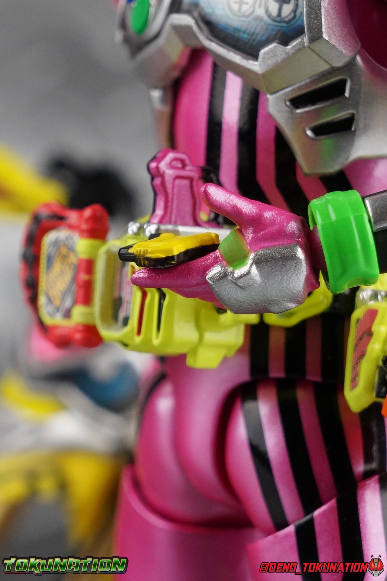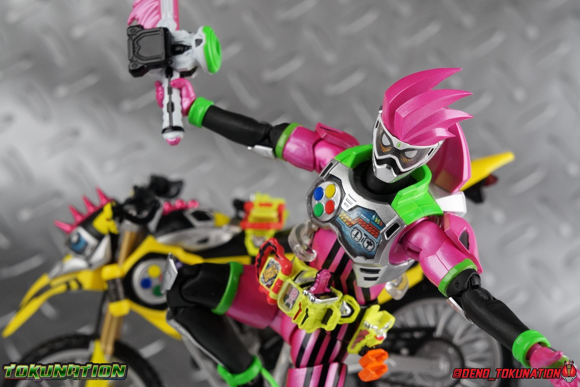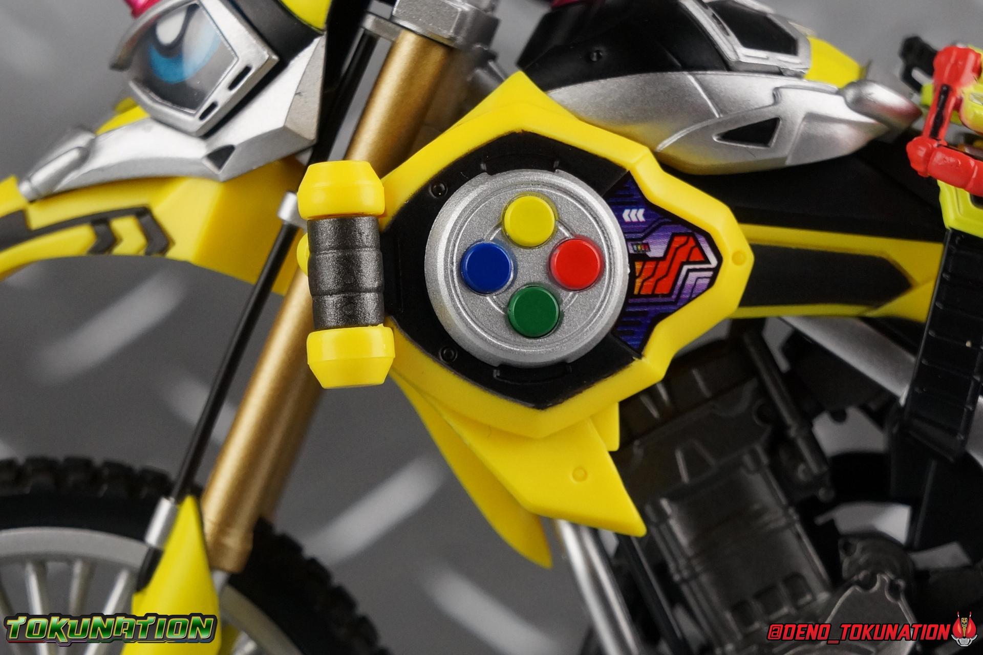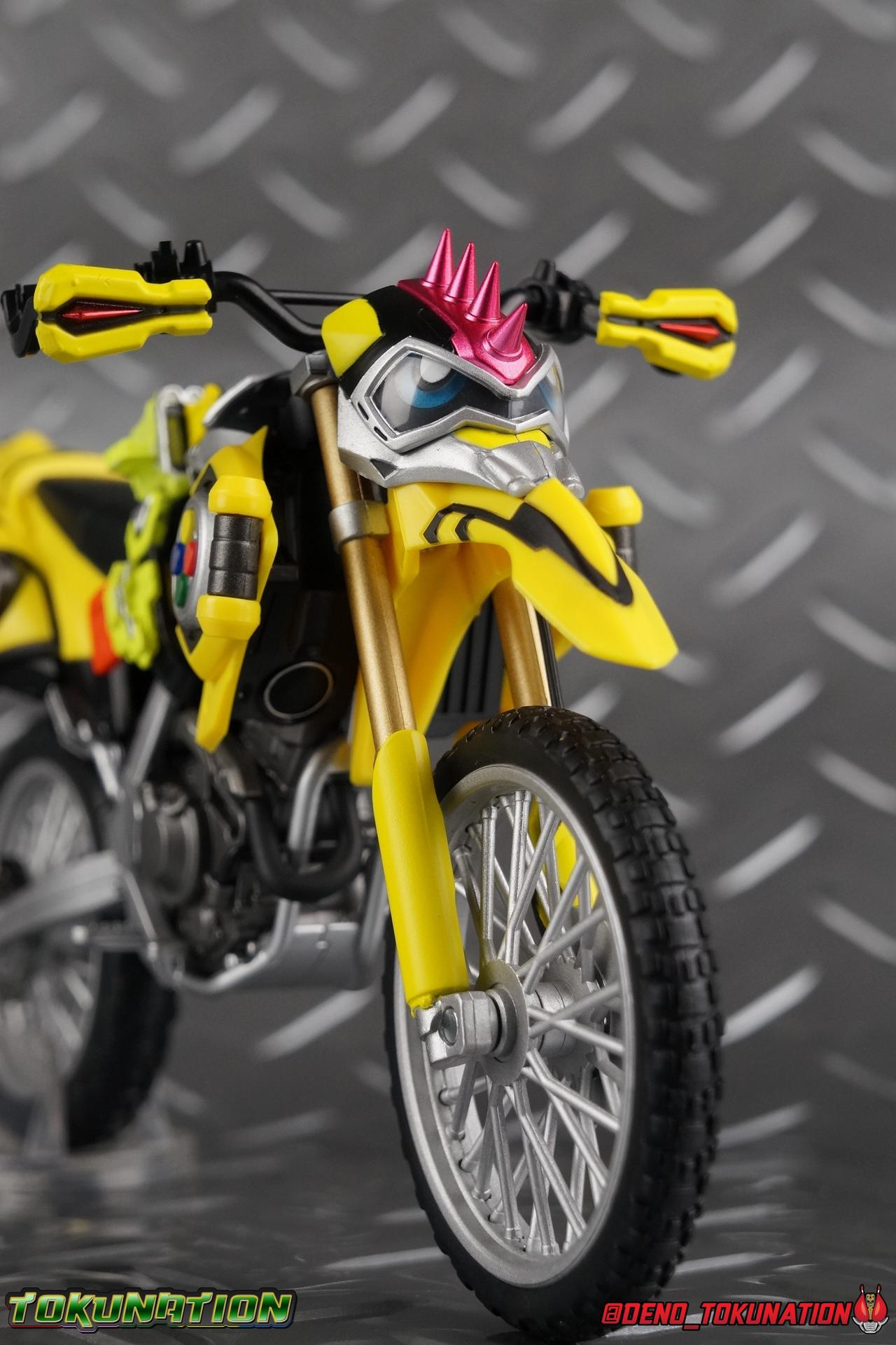 Kiriya Kujou. Liar, coroner, Bugster, Kamen Rider. Has there been a secondary character that's grown more memorable and beloved by fans of a rider show more quickly than him? I'm not so sure. Almost from the moment he stepped on screen, people fell in love with the two-faced hero. His death devastated some, his resurrection was similarly significant to others. All I know is that I personally grew to really love this character, and I've been patiently biding my time waiting for a nice collector oriented figure of his rider form to be released. While Lazer has an unconventional Level 2, it's finally been gorgeously executed. So let's dive in with a full review of S.H. Figuarts Kamen Rider Lazer Bike Gamer Level 2! Packaging Lazer Level 2 comes packaged in the same bright, colorful packaging that the rest of the line has. The vaguely game themed almost 8-bit blocky aesthetic just looks great. I know it's just a bx but I really really like the yellow they used. But yeah, I know, it's just a box. But I always love stylish packaging. Main Figure Unlike most Kamen Riders, this one IS a ride, literally. Rather than a traditional hero Lazer's Level 2 upgrade takes the form of a bike. An unusual turn for Kamen Riders. Where Accel had the ability to assume a bike form, Lazer is locked into this mode for his Level 2 form without a Level 3 Gashat. But what can a release like this bring to the table to really get us excited about something that can be as static as a bike? A decent amount actually. The main design of the bike is fairly standard, being based on a Honda CRF250L motorcycle. At a very basic level, you can clearly see the CRF components. The additional components that make Lazer who he is though are seamlessly integrated into this design. Take for instance the head & eyes added to the front of the bike, acting like a windshield almost. (This head of course is the basis for the later Level 0 Lazer Turbo form.) They just really convey Lazer's personality quite well. The only issue that bugs me is that the eyes are non-removable. Ex-Aid spoiler time, but at a certain point Kiriya is killed by Kuroto. In his dying moments he leaves his Gamer Driver and Gashat to Emu. From this point on until Kiriya's resurrection, any time Ex-Aid summons Lazer Level 2's bike form, the eyes are blacked out. Now the SO-DO candy toy release went so far as to include the blank eyes, I wish this one could have as well. Panels mimicking Lazer's Rider Gauge chest plates are positioned just above the engine block, each is painted rather nicely. And as is usual with Rider Machines the engine itself is very nicely detailed with a great metallic paint finish as well. Additionally you can see between the seat and handlebars of the bike is a vestigial Lazer Level 1 face. Much like the Mighty Action X Beginning Set, this is a shrunken down and stylized version of the rider's Level 1 faceplate, though in Lazer's case it's a bit more shrunken down to fit on a bike chassis. On either side just below this are halves of a Rider Belt, and in the center at the tip of the seat is a slot for one of two included Gamer Drivers! The fit for the Drivers is rather snug, you'll need to press firmly to lock it in. I'll get into the difference between the two Drivers below in the accessories section. Needless to say though this feature already puts this bike a step above previous similar releases. As far as the last few standard Rider Machines go, not counting Tridoron, Lazer Level 2 is a really lavishly executed bike. More so than the Sakura Hurricane for Gaim, and far far more so than the Ghostriker. I will say that I find it difficult to get a natural pose with a rider on Lazer though. No matter which of the two Gamer Drivers you choose to use, they both keep the rider from sitting too close to the handlebars and can impact the inner thighs enough to make posing difficult. That being said, when you throw him in with Ex-Aid and the gang the effect is in fantastic. Accessories Believe it or not, Lazer Level 2 actually comes with more & better accessories than most humanoid web exclusives: 1 - Clear Wheel Base. The standard kind included with nearly all Rider Machines. Just a nice solid base to hold the bike in a static position. 1 - Tamashii Stage Adapter. A neat curved piece that can lock over the bottom of the engine and allows you to recreate action shots. I like this one a bit better than most I've seen before. At the end of the curve is a tab you can pull back on like a release lever, rather than just trying to pry it off and possibly break it. 1 - Gamer Driver (normal). This Driver is the standard bulky Gamer Driver each of the Ex-Aid Figuarts has featured so far. Albeit with a new Bakusou Bike Gashat and readout on the front of the driver. As with the other Drivers, the dummy Gashat is removable, so you can give it to other figures as I have with Ex-Aid in the shots below. This normal version of the driver is what should be attached to accurately replicate the bikes on-screen appearance most of the time. 1 - Gamer Driver (stunt). This slimmed down version of the Driver is based more on the "stunt" version of the prop used for filming. A slimmed down non-functional version of the driver, both in show and toy form. It gives the bike a little sleeker look and allows a rider to sit more comfortably. Though either driver makes a natural sitting pose difficult in my opinion. The Gashast isn't removable on this on and it's really just for show, but the mere inclusion of it is a step above where accessories usually stand for web exclusives. 2 - Ex-Aid hands. These hands are design just for use with Lazer Level 2, specifically to hold the handlebar and extend 1 finger forward towards the brake lever on either handle. I find it difficult to get them on the handles without popping off the hand guard bar along the side first. That's a pretty fantastic set of accessories for a bike. Bravo. Final Thoughts Bucking the trend of Rider Machines being 