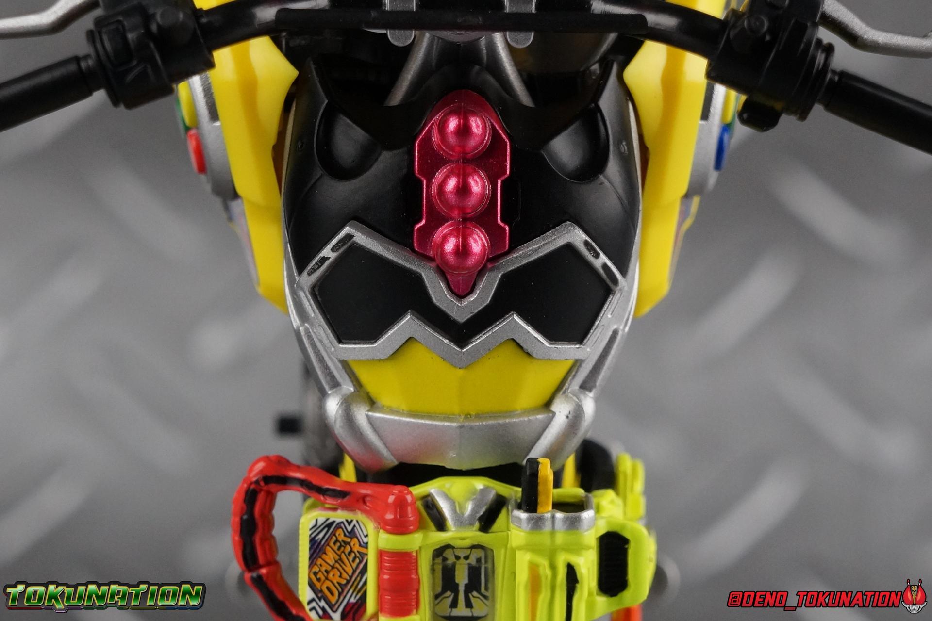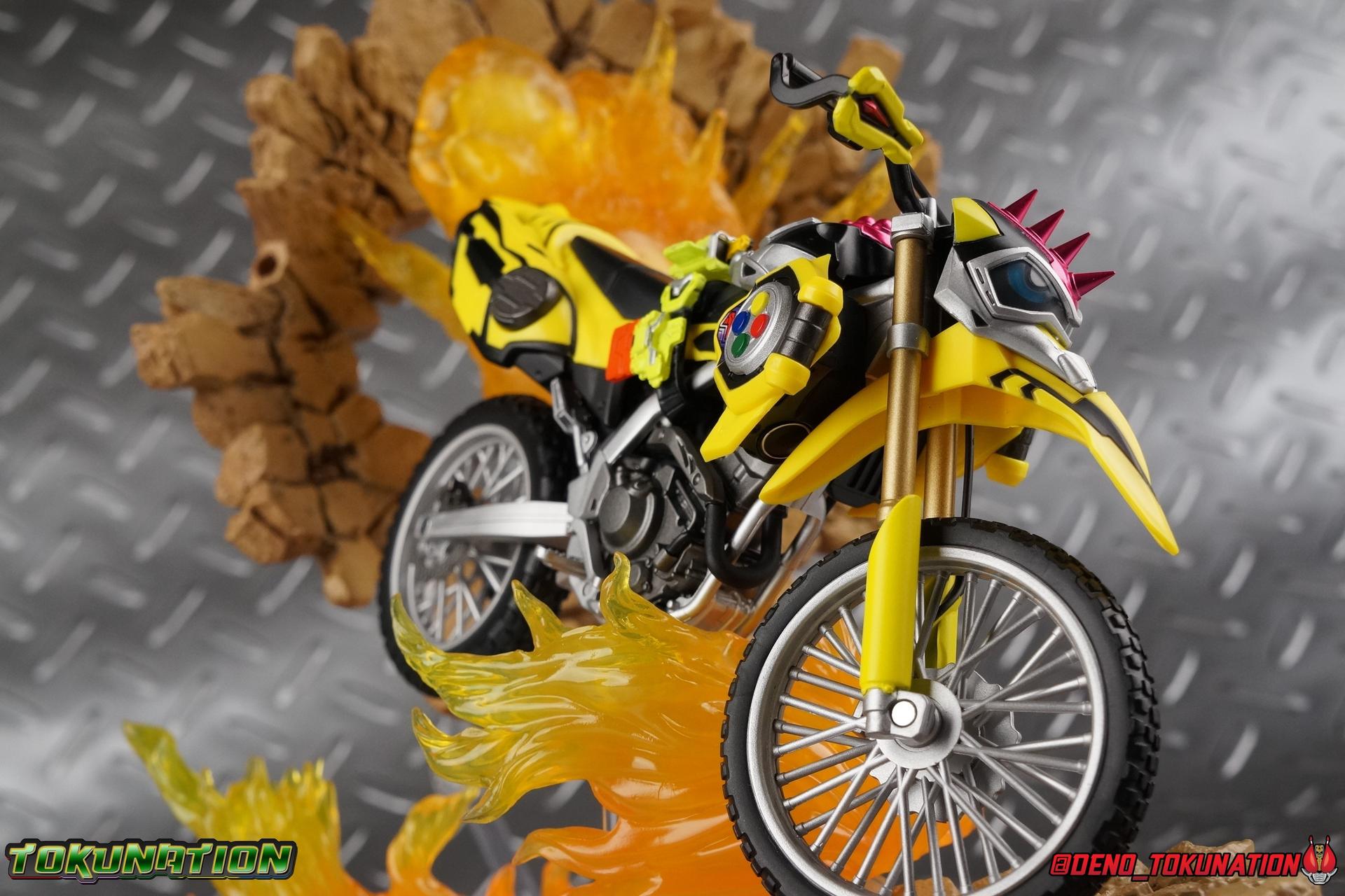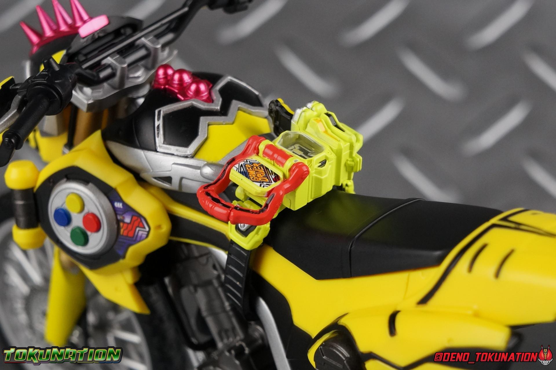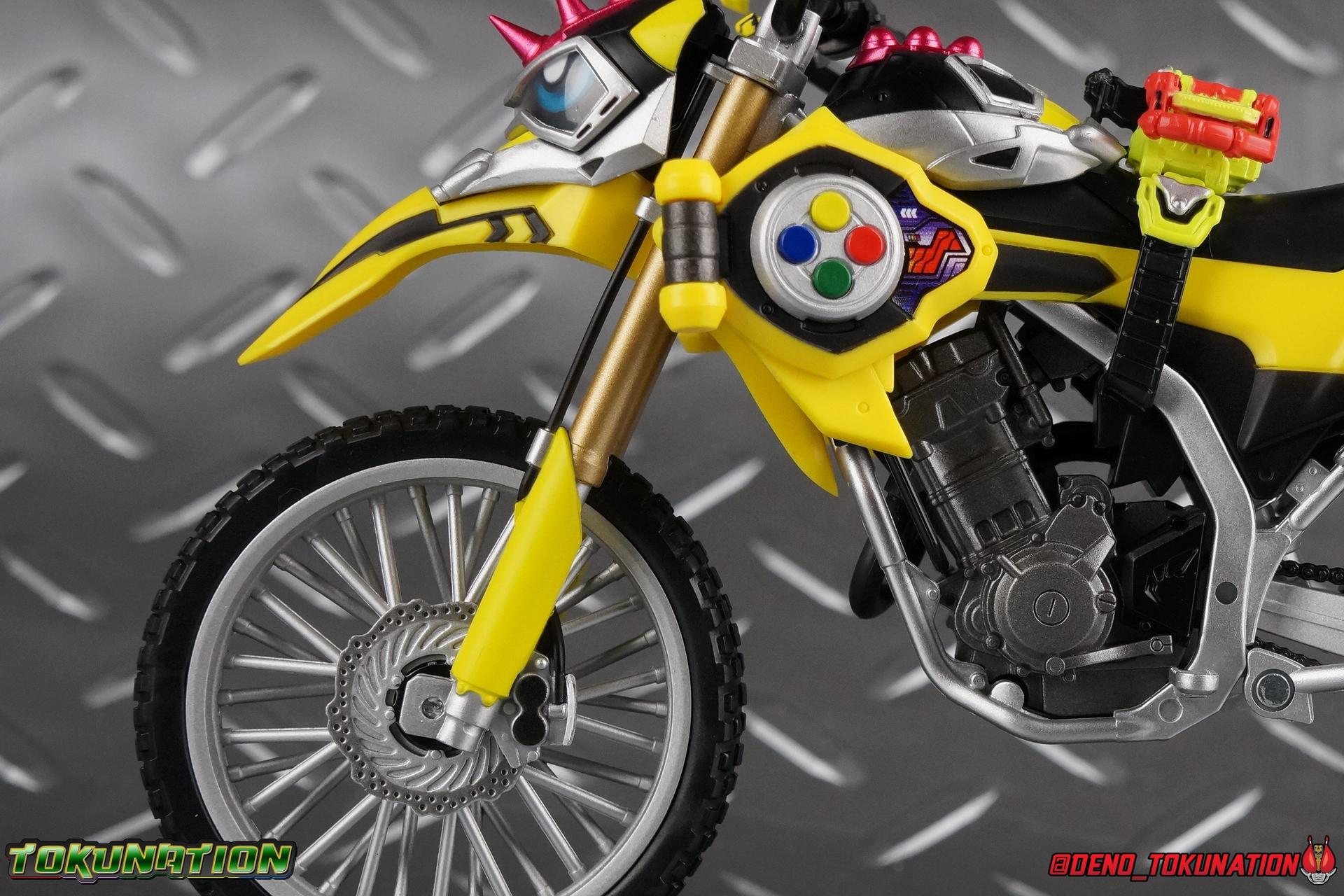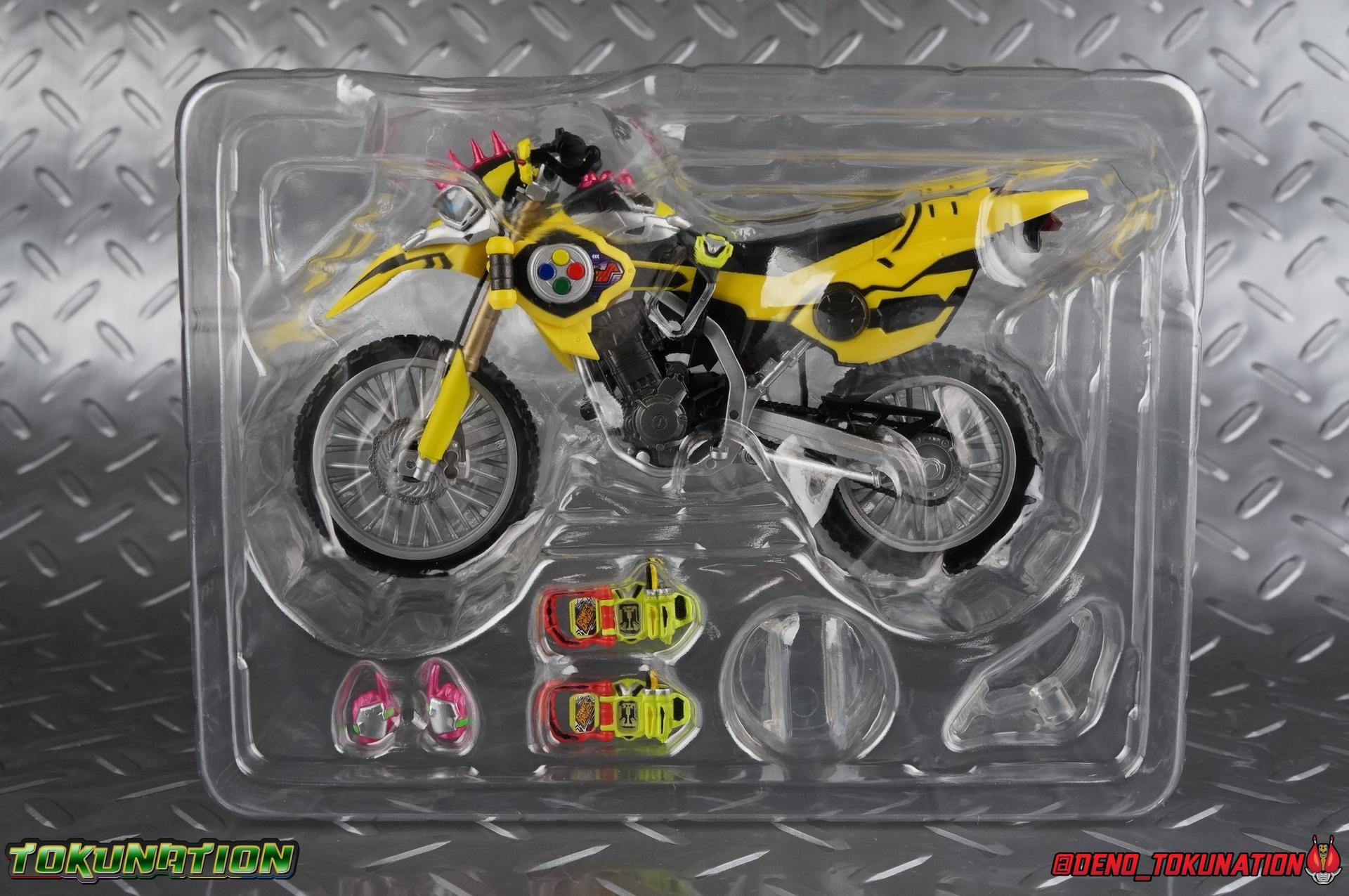 Kiriya Kujou. Liar, coroner, Bugster, Kamen Rider. Has there been a secondary character that's grown more memorable and beloved by fans of a rider show more quickly than him? I'm not so sure. Almost from the moment he stepped on screen, people fell in love with the two-faced hero. His death devastated some, his resurrection was similarly significant to others. All I know is that I personally grew to really love this character, and I've been patiently biding my time waiting for a nice collector oriented figure of his rider form to be released. While Lazer has an unconventional Level 2, it's finally been gorgeously executed. So let's dive in with a full review of S.H. Figuarts Kamen Rider Lazer Bike Gamer Level 2! Packaging Lazer Level 2 comes packaged in the same bright, colorful packaging that the rest of the line has. The vaguely game themed almost 8-bit blocky aesthetic just looks great. I know it's just a bx but I really really like the yellow they used. But yeah, I know, it's just a box. But I always love stylish packaging. Main Figure Unlike most Kamen Riders, this one IS a ride, literally. Rather than a traditional hero Lazer's Level 2 upgrade takes the form of a bike. An unusual turn for Kamen Riders. Where Accel had the ability to assume a bike form, Lazer is locked into this mode for his Level 2 form without a Level 3 Gashat. But what can a release like this bring to the table to really get us excited about something that can be as static as a bike? A decent amount actually. The main design of the bike is fairly standard, being based on a Honda CRF250L motorcycle. At a very basic level, you can clearly see the CRF components. The additional components that make Lazer who he is though are seamlessly integrated into this design. Take for instance the head & eyes added to the front of the bike, acting like a windshield almost. (This head of course is the basis for the later Level 0 Lazer Turbo form.) They just really convey Lazer's personality quite well. The only issue that bugs me is that the eyes are non-removable. Ex-Aid spoiler time, but at a certain point Kiriya is killed by Kuroto. In his dying moments he leaves his Gamer Driver and Gashat to Emu. From this point on until Kiriya's resurrection, any time Ex-Aid summons Lazer Level 2's bike form, the eyes are blacked out. Now the SO-DO candy toy release went so far as to include the blank eyes, I wish this one could have as well. Panels mimicking Lazer's Rider Gauge chest plates are positioned just above the engine block, each is painted rather nicely. And as is usual with Rider Machines the engine itself is very nicely detailed with a great metallic paint finish as well. Additionally you can see between the seat and handlebars of the bike is a vestigial Lazer Level 1 face. Much like the Mighty Action X Beginning Set, this is a shrunken down and stylized version of the rider's Level 1 faceplate, though in Lazer's case it's a bit more shrunken down to fit on a bike chassis. On either side just below this are halves of a Rider Belt, and in the center at the tip of the seat is a slot for one of two included Gamer Drivers! The fit for the Drivers is rather snug, you'll need to press firmly to lock it in. I'll get into the difference between the two Drivers below in the accessories section. Needless to say though this feature already puts this bike a step above previous similar releases. As far as the last few standard Rider Machines go, not counting Tridoron, Lazer Level 2 is a really lavishly executed bike. More so than the Sakura Hurricane for Gaim, and far far more so than the Ghostriker. I will say that I find it difficult to get a natural pose with a rider on Lazer though. No matter which of the two Gamer Drivers you choose to use, they both keep the rider from sitting too close to the handlebars and can impact the inner thighs enough to make posing difficult. That being said, when you throw him in with Ex-Aid and the gang the effect is in fantastic. Accessories Believe it or not, Lazer Level 2 actually comes with more & better accessories than most humanoid web exclusives: 1 - Clear Wheel Base. The standard kind included with nearly all Rider Machines. Just a nice solid base to hold the bike in a static position. 1 - Tamashii Stage Adapter. A neat curved piece that can lock over the bottom of the engine and allows you to recreate action shots. I like this one a bit better than most I've seen before. At the end of the curve is a tab you can pull back on like a release lever, rather than just trying to pry it off and possibly break it. 1 - Gamer Driver (normal). This Driver is the standard bulky Gamer Driver each of the Ex-Aid Figuarts has featured so far. Albeit with a new Bakusou Bike Gashat and readout on the front of the driver. As with the other Drivers, the dummy Gashat is removable, so you can give it to other figures as I have with Ex-Aid in the shots below. This normal version of the driver is what should be attached to accurately replicate the bikes on-screen appearance most of the time. 1 - Gamer Driver (stunt). This slimmed down version of the Driver is based more on the "stunt" version of the prop used for filming. A slimmed down non-functional version of the driver, both in show and toy form. It gives the bike a little sleeker look and allows a rider to sit more comfortably. Though either driver makes a natural sitting pose difficult in my opinion. The Gashast isn't removable on this on and it's really just for show, but the mere inclusion of it is a step above where accessories usually stand for web exclusives. 2 - Ex-Aid hands. These hands are design just for use with Lazer Level 2, specifically to hold the handlebar and extend 1 finger forward towards the brake lever on either handle. I find it difficult to get them on the handles without popping off the hand guard bar along the side first. That's a pretty fantastic set of accessories for a bike. Bravo. Final Thoughts Bucking the trend of Rider Machines being 