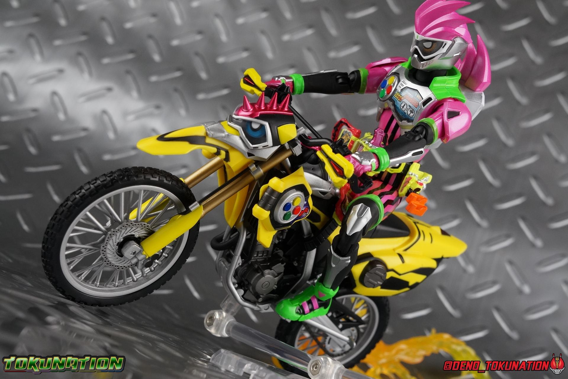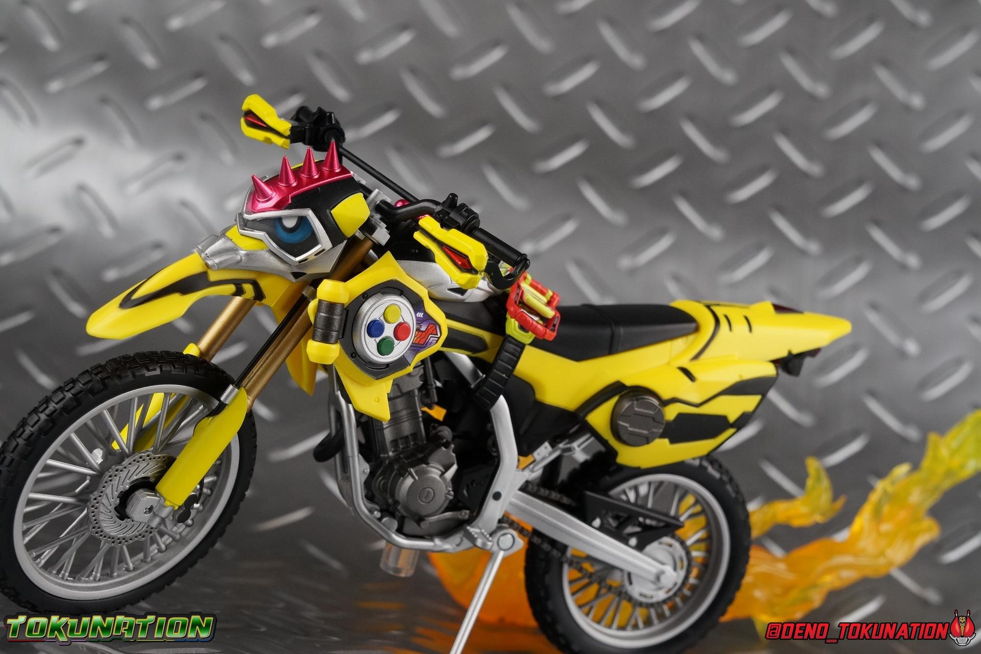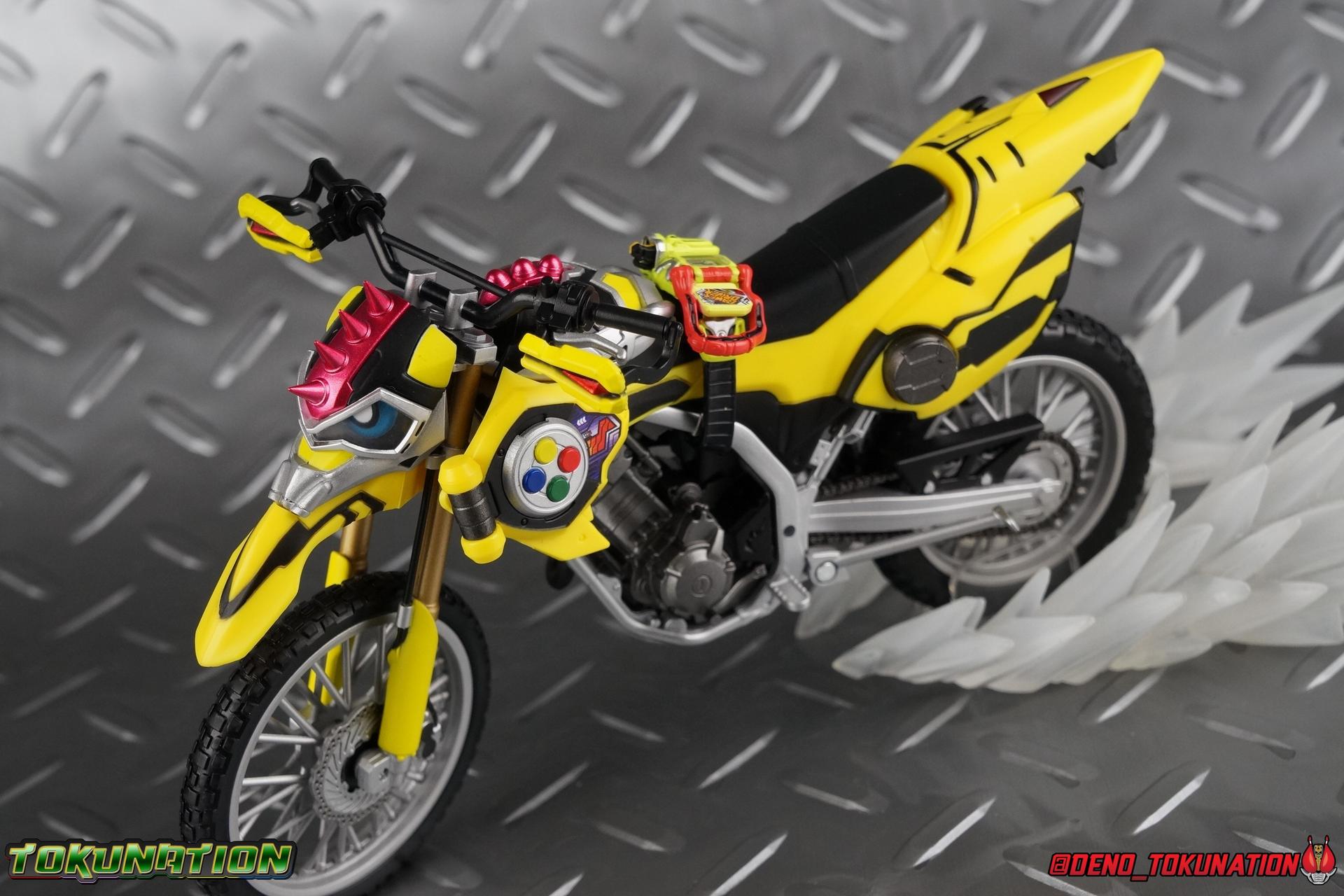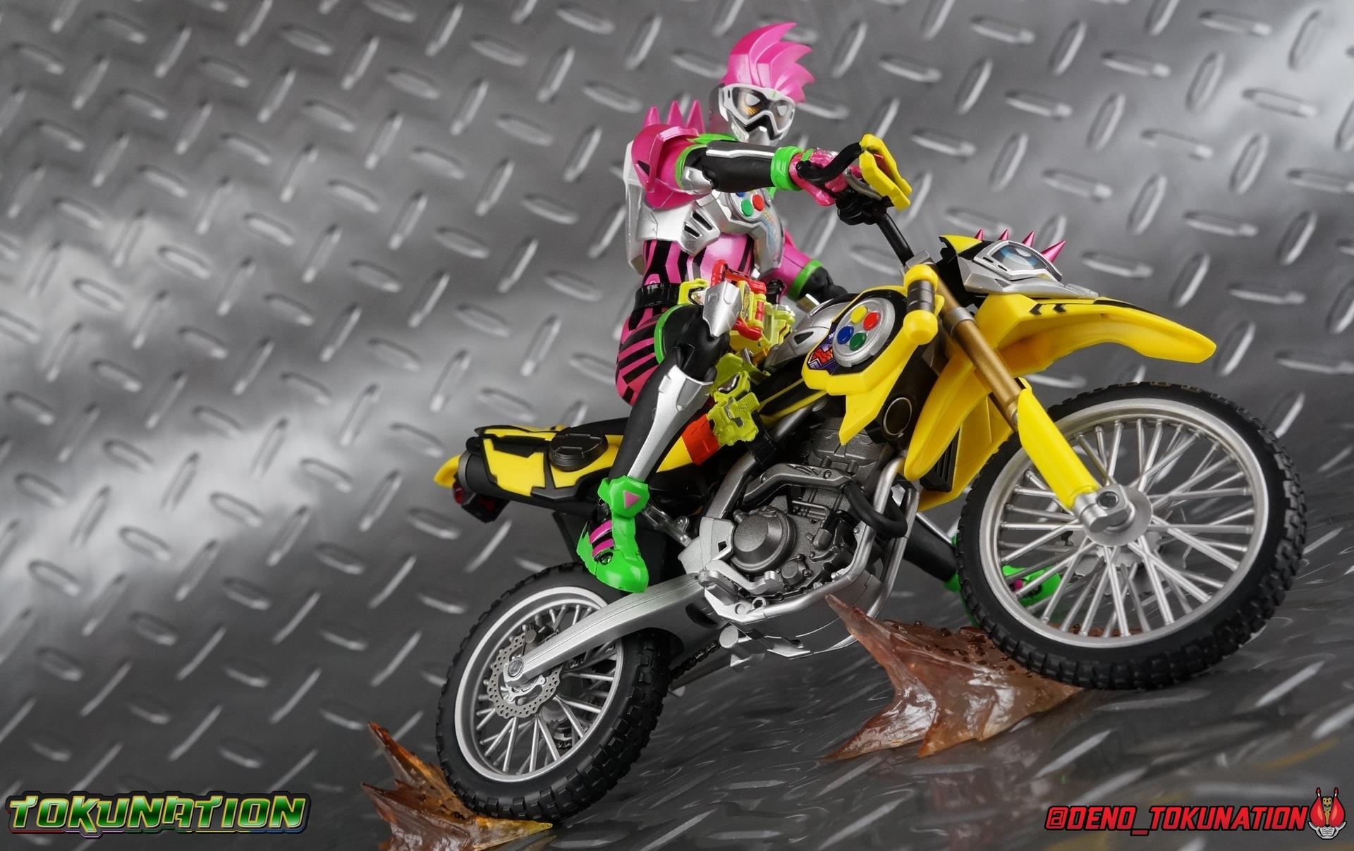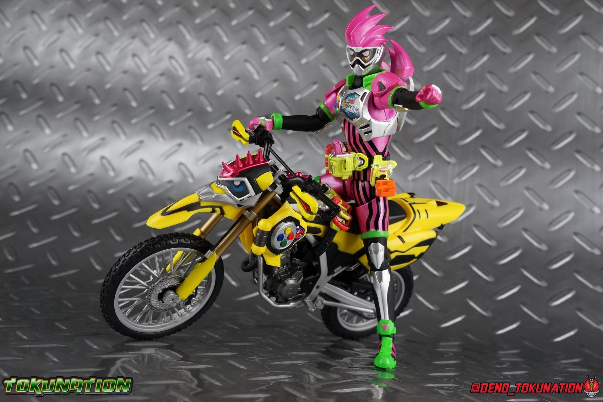 Kiriya Kujou. Liar, coroner, Bugster, Kamen Rider. Has there been a secondary character that's grown more memorable and beloved by fans of a rider show more quickly than him? I'm not so sure. Almost from the moment he stepped on screen, people fell in love with the two-faced hero. His death devastated some, his resurrection was similarly significant to others. All I know is that I personally grew to really love this character, and I've been patiently biding my time waiting for a nice collector oriented figure of his rider form to be released. While Lazer has an unconventional Level 2, it's finally been gorgeously executed. So let's dive in with a full review of S.H. Figuarts Kamen Rider Lazer Bike Gamer Level 2! Packaging Lazer Level 2 comes packaged in the same bright, colorful packaging that the rest of the line has. The vaguely game themed almost 8-bit blocky aesthetic just looks great. I know it's just a bx but I really really like the yellow they used. But yeah, I know, it's just a box. But I always love stylish packaging. Main Figure Unlike most Kamen Riders, this one IS a ride, literally. Rather than a traditional hero Lazer's Level 2 upgrade takes the form of a bike. An unusual turn for Kamen Riders. Where Accel had the ability to assume a bike form, Lazer is locked into this mode for his Level 2 form without a Level 3 Gashat. But what can a release like this bring to the table to really get us excited about something that can be as static as a bike? A decent amount actually. The main design of the bike is fairly standard, being based on a Honda CRF250L motorcycle. At a very basic level, you can clearly see the CRF components. The additional components that make Lazer who he is though are seamlessly integrated into this design. Take for instance the head & eyes added to the front of the bike, acting like a windshield almost. (This head of course is the basis for the later Level 0 Lazer Turbo form.) They just really convey Lazer's personality quite well. The only issue that bugs me is that the eyes are non-removable. Ex-Aid spoiler time, but at a certain point Kiriya is killed by Kuroto. In his dying moments he leaves his Gamer Driver and Gashat to Emu. From this point on until Kiriya's resurrection, any time Ex-Aid summons Lazer Level 2's bike form, the eyes are blacked out. Now the SO-DO candy toy release went so far as to include the blank eyes, I wish this one could have as well. Panels mimicking Lazer's Rider Gauge chest plates are positioned just above the engine block, each is painted rather nicely. And as is usual with Rider Machines the engine itself is very nicely detailed with a great metallic paint finish as well. Additionally you can see between the seat and handlebars of the bike is a vestigial Lazer Level 1 face. Much like the Mighty Action X Beginning Set, this is a shrunken down and stylized version of the rider's Level 1 faceplate, though in Lazer's case it's a bit more shrunken down to fit on a bike chassis. On either side just below this are halves of a Rider Belt, and in the center at the tip of the seat is a slot for one of two included Gamer Drivers! The fit for the Drivers is rather snug, you'll need to press firmly to lock it in. I'll get into the difference between the two Drivers below in the accessories section. Needless to say though this feature already puts this bike a step above previous similar releases. As far as the last few standard Rider Machines go, not counting Tridoron, Lazer Level 2 is a really lavishly executed bike. More so than the Sakura Hurricane for Gaim, and far far more so than the Ghostriker. I will say that I find it difficult to get a natural pose with a rider on Lazer though. No matter which of the two Gamer Drivers you choose to use, they both keep the rider from sitting too close to the handlebars and can impact the inner thighs enough to make posing difficult. That being said, when you throw him in with Ex-Aid and the gang the effect is in fantastic. Accessories Believe it or not, Lazer Level 2 actually comes with more & better accessories than most humanoid web exclusives: 1 - Clear Wheel Base. The standard kind included with nearly all Rider Machines. Just a nice solid base to hold the bike in a static position. 1 - Tamashii Stage Adapter. A neat curved piece that can lock over the bottom of the engine and allows you to recreate action shots. I like this one a bit better than most I've seen before. At the end of the curve is a tab you can pull back on like a release lever, rather than just trying to pry it off and possibly break it. 1 - Gamer Driver (normal). This Driver is the standard bulky Gamer Driver each of the Ex-Aid Figuarts has featured so far. Albeit with a new Bakusou Bike Gashat and readout on the front of the driver. As with the other Drivers, the dummy Gashat is removable, so you can give it to other figures as I have with Ex-Aid in the shots below. This normal version of the driver is what should be attached to accurately replicate the bikes on-screen appearance most of the time. 1 - Gamer Driver (stunt). This slimmed down version of the Driver is based more on the "stunt" version of the prop used for filming. A slimmed down non-functional version of the driver, both in show and toy form. It gives the bike a little sleeker look and allows a rider to sit more comfortably. Though either driver makes a natural sitting pose difficult in my opinion. The Gashast isn't removable on this on and it's really just for show, but the mere inclusion of it is a step above where accessories usually stand for web exclusives. 2 - Ex-Aid hands. These hands are design just for use with Lazer Level 2, specifically to hold the handlebar and extend 1 finger forward towards the brake lever on either handle. I find it difficult to get them on the handles without popping off the hand guard bar along the side first. That's a pretty fantastic set of accessories for a bike. Bravo. Final Thoughts Bucking the trend of Rider Machines being 