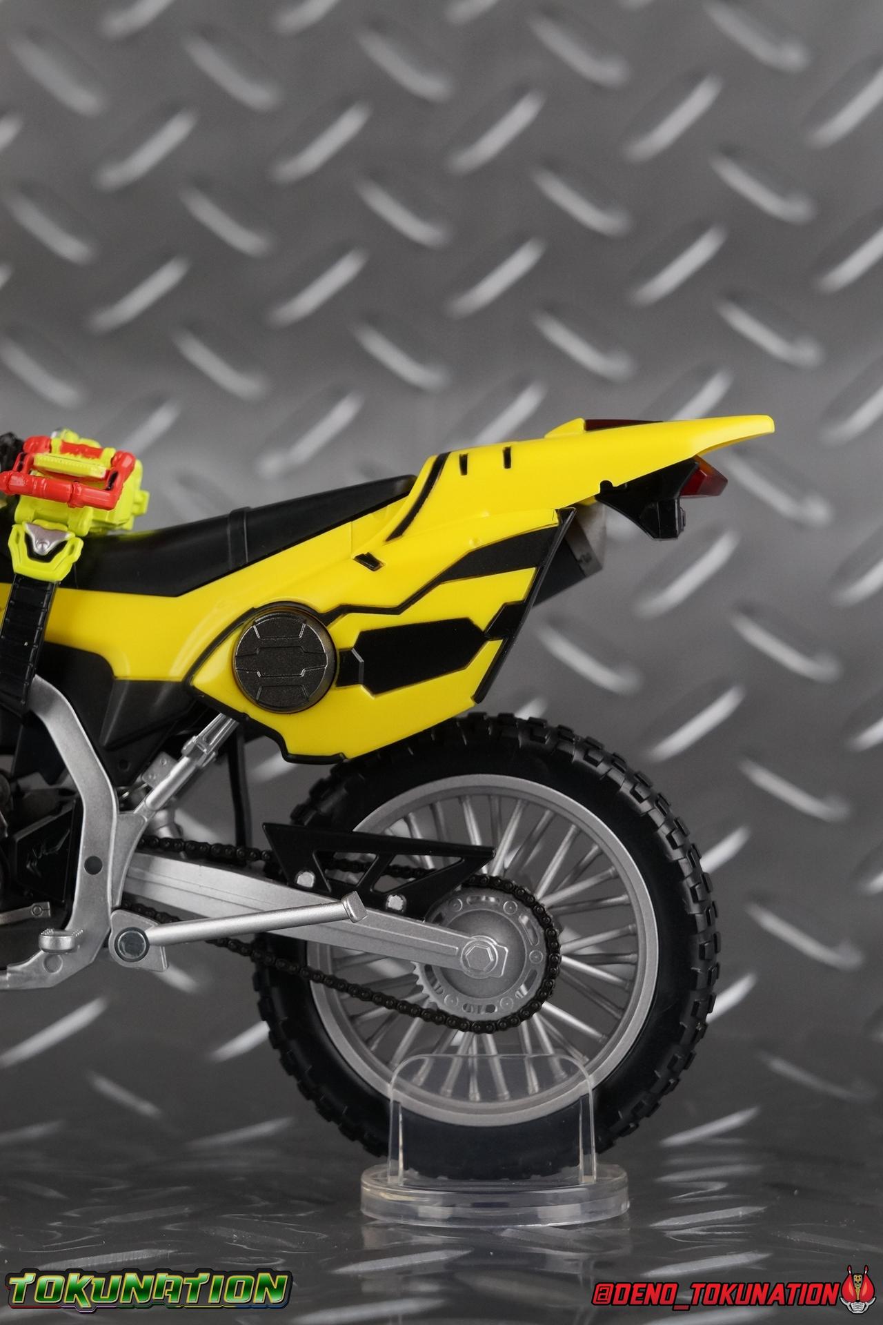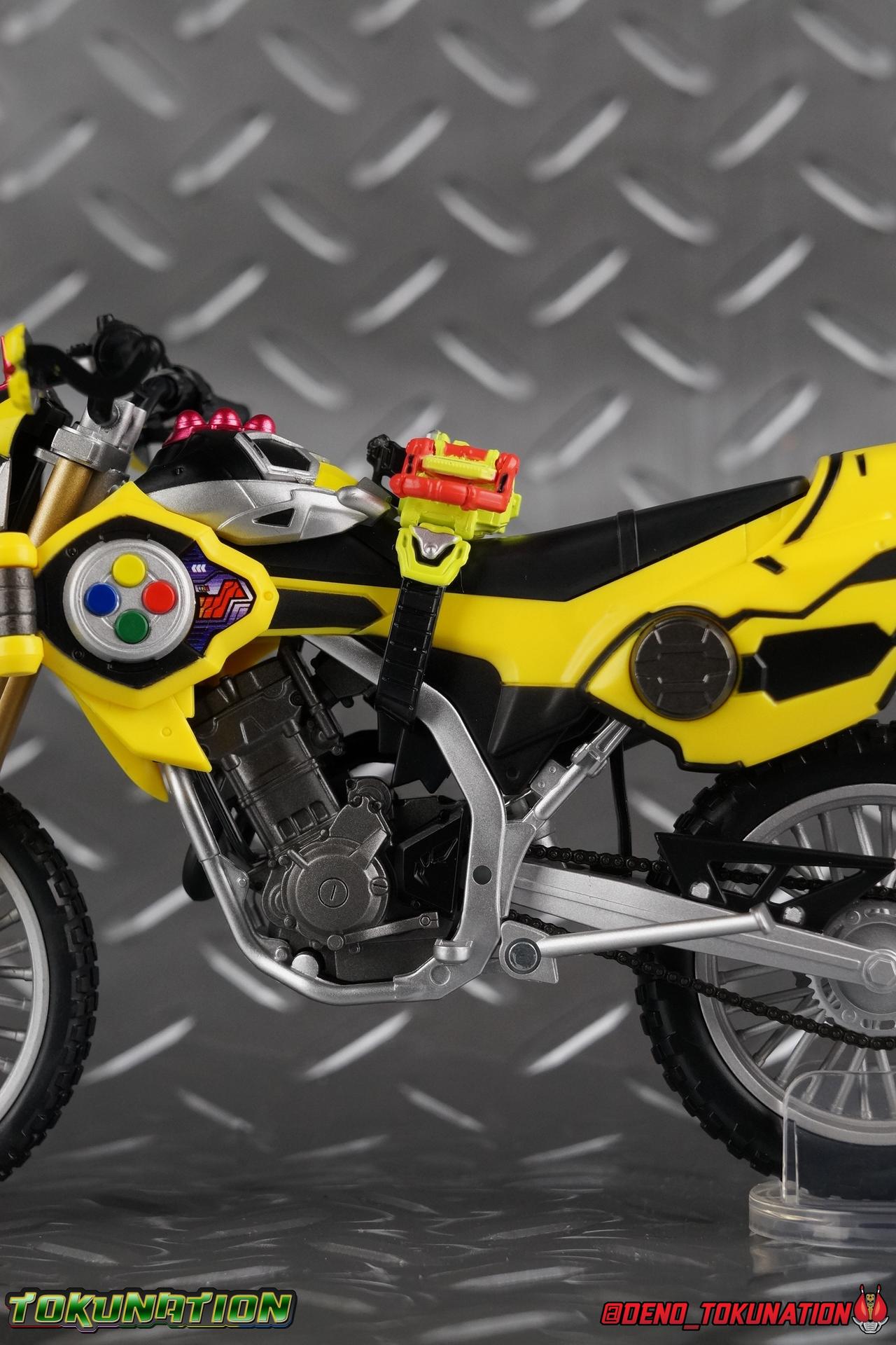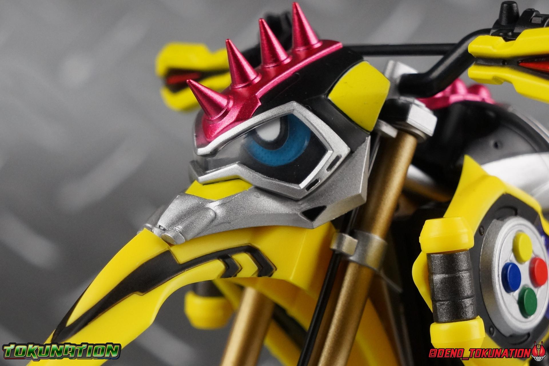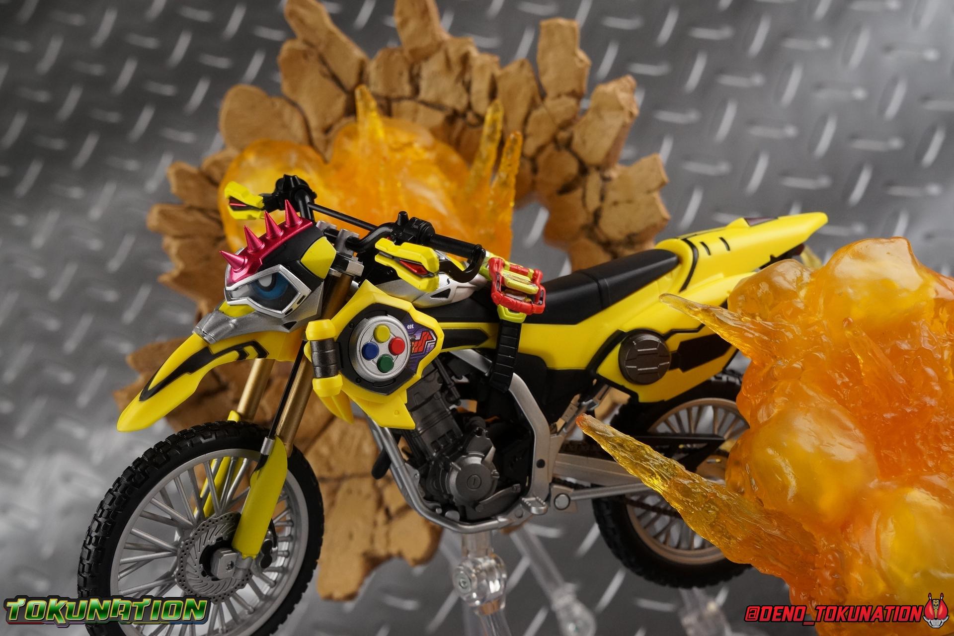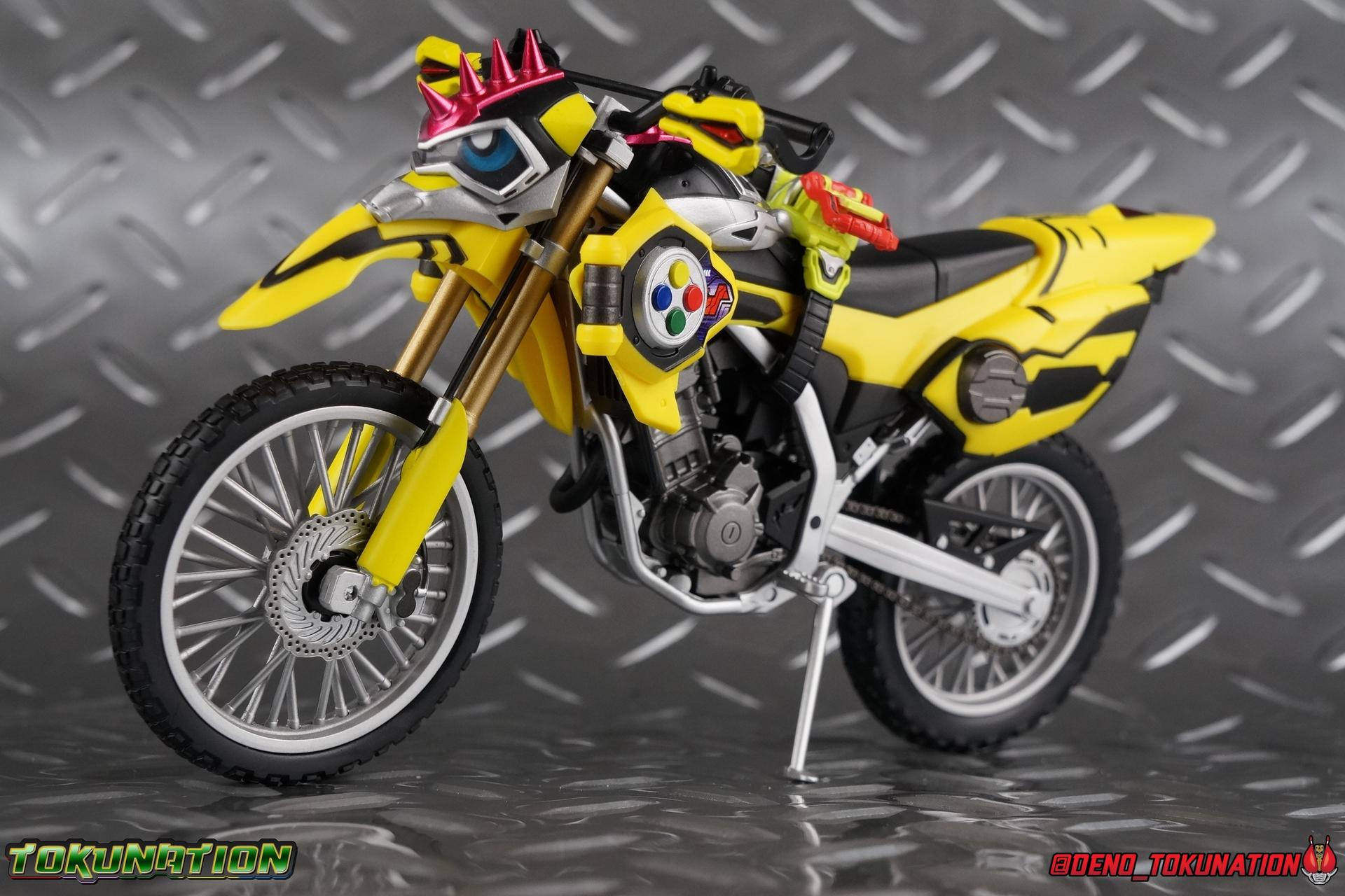 Kiriya Kujou. Liar, coroner, Bugster, Kamen Rider. Has there been a secondary character that's grown more memorable and beloved by fans of a rider show more quickly than him? I'm not so sure. Almost from the moment he stepped on screen, people fell in love with the two-faced hero. His death devastated some, his resurrection was similarly significant to others. All I know is that I personally grew to really love this character, and I've been patiently biding my time waiting for a nice collector oriented figure of his rider form to be released. While Lazer has an unconventional Level 2, it's finally been gorgeously executed. So let's dive in with a full review of S.H. Figuarts Kamen Rider Lazer Bike Gamer Level 2! Packaging Lazer Level 2 comes packaged in the same bright, colorful packaging that the rest of the line has. The vaguely game themed almost 8-bit blocky aesthetic just looks great. I know it's just a bx but I really really like the yellow they used. But yeah, I know, it's just a box. But I always love stylish packaging. Main Figure Unlike most Kamen Riders, this one IS a ride, literally. Rather than a traditional hero Lazer's Level 2 upgrade takes the form of a bike. An unusual turn for Kamen Riders. Where Accel had the ability to assume a bike form, Lazer is locked into this mode for his Level 2 form without a Level 3 Gashat. But what can a release like this bring to the table to really get us excited about something that can be as static as a bike? A decent amount actually. The main design of the bike is fairly standard, being based on a Honda CRF250L motorcycle. At a very basic level, you can clearly see the CRF components. The additional components that make Lazer who he is though are seamlessly integrated into this design. Take for instance the head & eyes added to the front of the bike, acting like a windshield almost. (This head of course is the basis for the later Level 0 Lazer Turbo form.) They just really convey Lazer's personality quite well. The only issue that bugs me is that the eyes are non-removable. Ex-Aid spoiler time, but at a certain point Kiriya is killed by Kuroto. In his dying moments he leaves his Gamer Driver and Gashat to Emu. From this point on until Kiriya's resurrection, any time Ex-Aid summons Lazer Level 2's bike form, the eyes are blacked out. Now the SO-DO candy toy release went so far as to include the blank eyes, I wish this one could have as well. Panels mimicking Lazer's Rider Gauge chest plates are positioned just above the engine block, each is painted rather nicely. And as is usual with Rider Machines the engine itself is very nicely detailed with a great metallic paint finish as well. Additionally you can see between the seat and handlebars of the bike is a vestigial Lazer Level 1 face. Much like the Mighty Action X Beginning Set, this is a shrunken down and stylized version of the rider's Level 1 faceplate, though in Lazer's case it's a bit more shrunken down to fit on a bike chassis. On either side just below this are halves of a Rider Belt, and in the center at the tip of the seat is a slot for one of two included Gamer Drivers! The fit for the Drivers is rather snug, you'll need to press firmly to lock it in. I'll get into the difference between the two Drivers below in the accessories section. Needless to say though this feature already puts this bike a step above previous similar releases. As far as the last few standard Rider Machines go, not counting Tridoron, Lazer Level 2 is a really lavishly executed bike. More so than the Sakura Hurricane for Gaim, and far far more so than the Ghostriker. I will say that I find it difficult to get a natural pose with a rider on Lazer though. No matter which of the two Gamer Drivers you choose to use, they both keep the rider from sitting too close to the handlebars and can impact the inner thighs enough to make posing difficult. That being said, when you throw him in with Ex-Aid and the gang the effect is in fantastic. Accessories Believe it or not, Lazer Level 2 actually comes with more & better accessories than most humanoid web exclusives: 1 - Clear Wheel Base. The standard kind included with nearly all Rider Machines. Just a nice solid base to hold the bike in a static position. 1 - Tamashii Stage Adapter. A neat curved piece that can lock over the bottom of the engine and allows you to recreate action shots. I like this one a bit better than most I've seen before. At the end of the curve is a tab you can pull back on like a release lever, rather than just trying to pry it off and possibly break it. 1 - Gamer Driver (normal). This Driver is the standard bulky Gamer Driver each of the Ex-Aid Figuarts has featured so far. Albeit with a new Bakusou Bike Gashat and readout on the front of the driver. As with the other Drivers, the dummy Gashat is removable, so you can give it to other figures as I have with Ex-Aid in the shots below. This normal version of the driver is what should be attached to accurately replicate the bikes on-screen appearance most of the time. 1 - Gamer Driver (stunt). This slimmed down version of the Driver is based more on the "stunt" version of the prop used for filming. A slimmed down non-functional version of the driver, both in show and toy form. It gives the bike a little sleeker look and allows a rider to sit more comfortably. Though either driver makes a natural sitting pose difficult in my opinion. The Gashast isn't removable on this on and it's really just for show, but the mere inclusion of it is a step above where accessories usually stand for web exclusives. 2 - Ex-Aid hands. These hands are design just for use with Lazer Level 2, specifically to hold the handlebar and extend 1 finger forward towards the brake lever on either handle. I find it difficult to get them on the handles without popping off the hand guard bar along the side first. That's a pretty fantastic set of accessories for a bike. Bravo. Final Thoughts Bucking the trend of Rider Machines being 